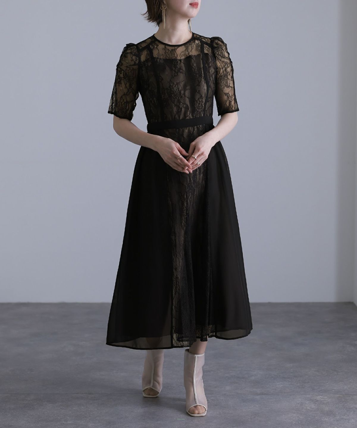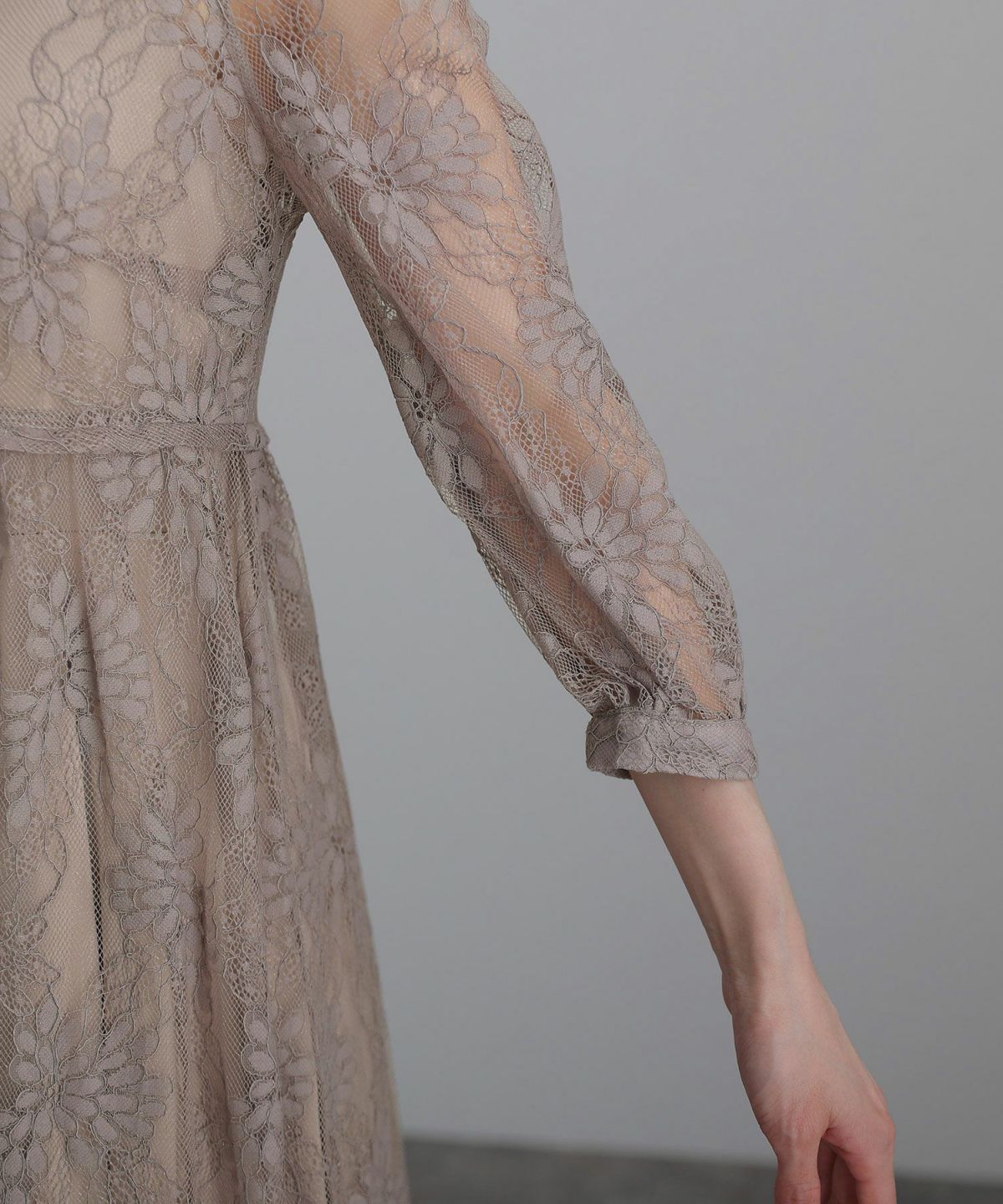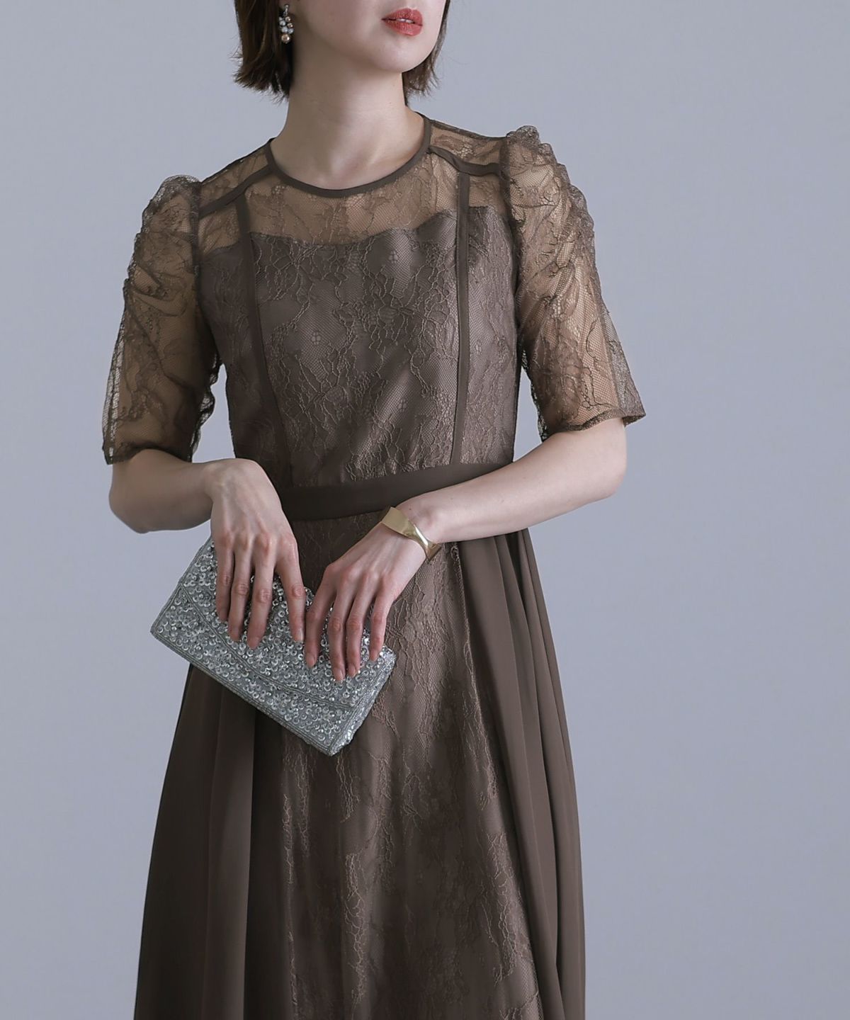 刺繍レースと深みカラーが大人の品格を演出 配色刺繍レースパフスリーブドレス