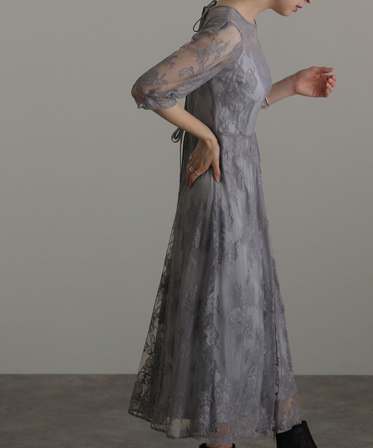 袖の光沢感ある刺繍が上品さを引き立てる スリーブエンブロイダリードレス