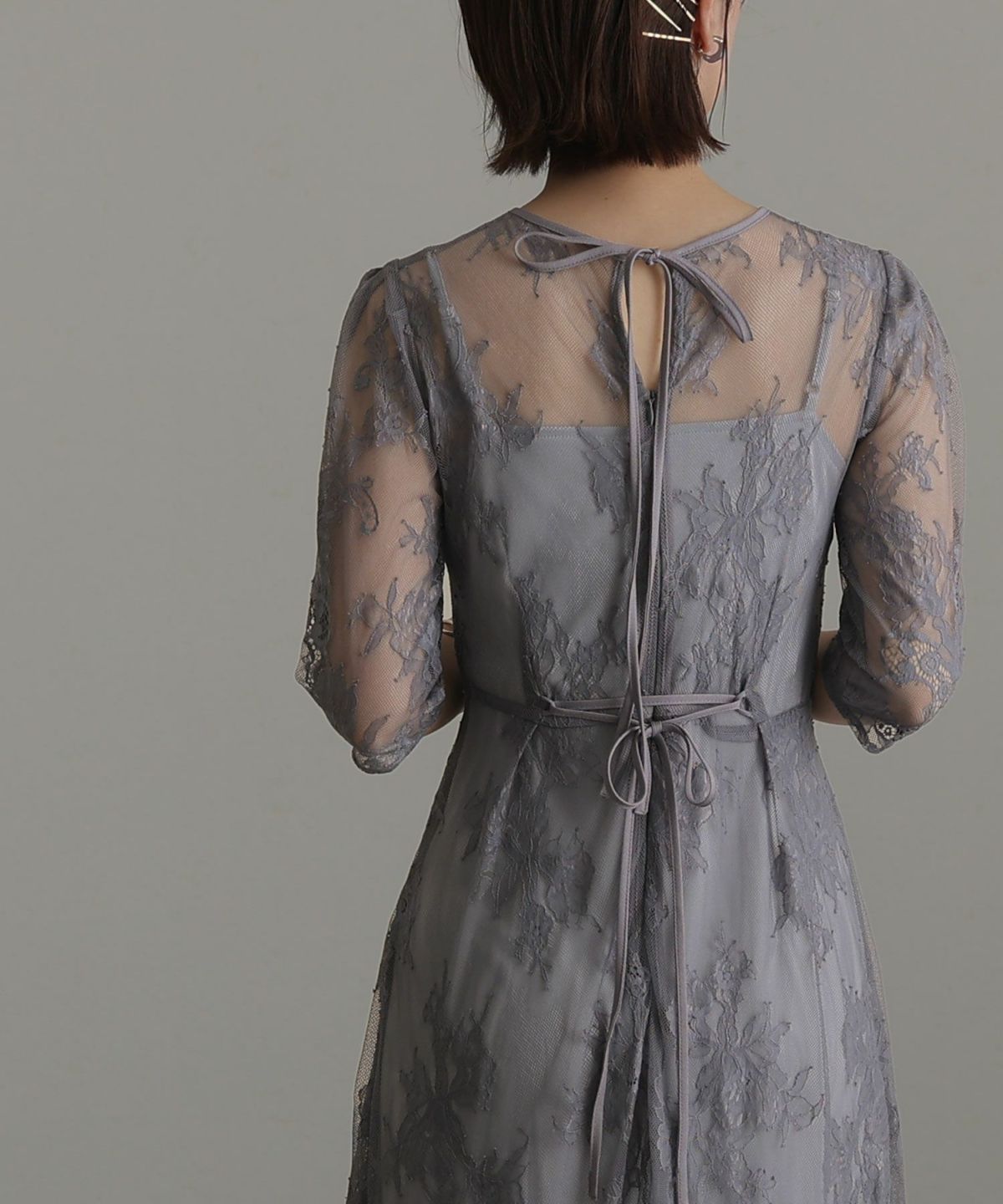 デコルテから腕にかけてのシースルーが大人っぽい メロンレースネックリボンワンピース
