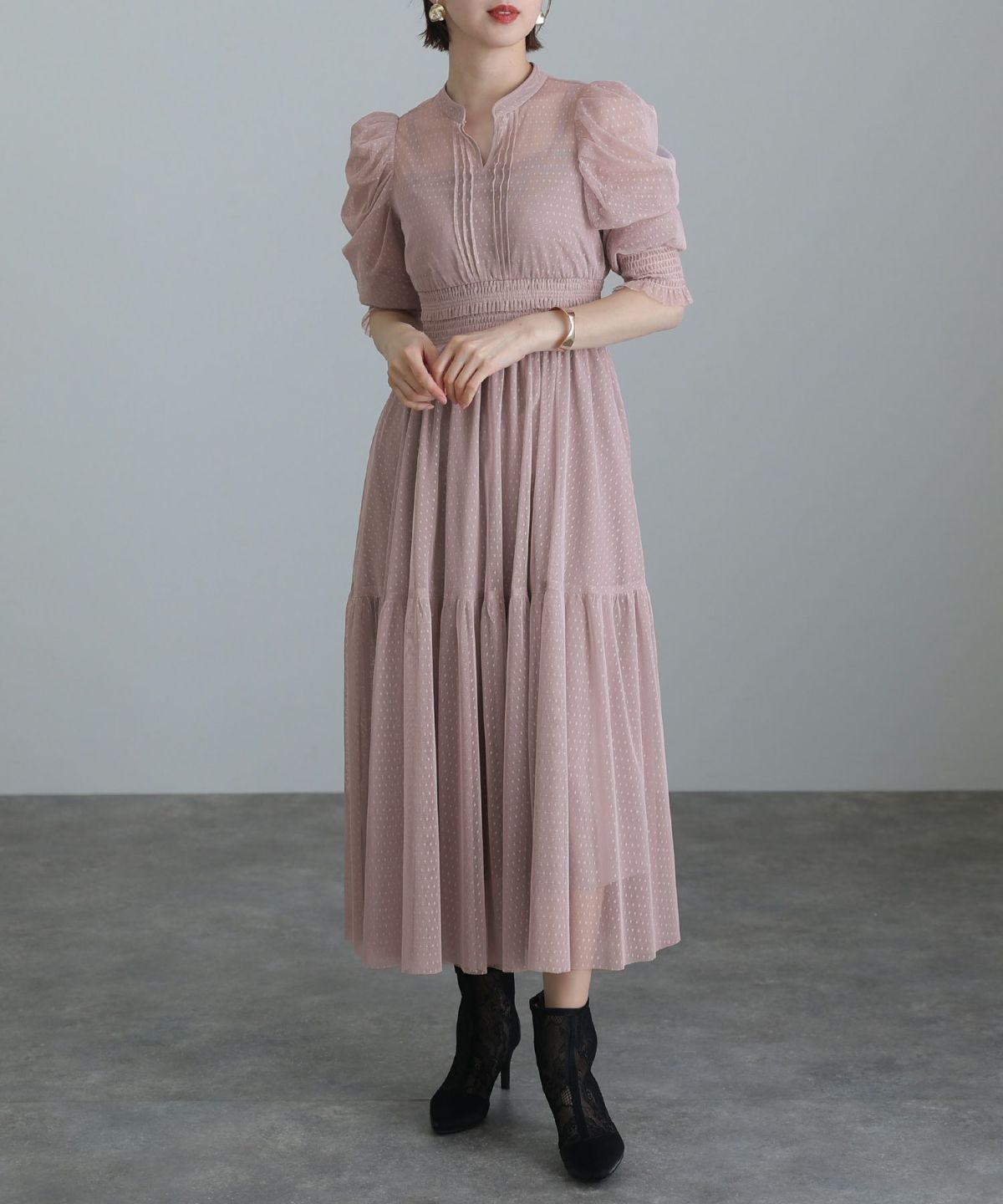適度な透け感が大人の上品な雰囲気 チュールギャザーワンピース