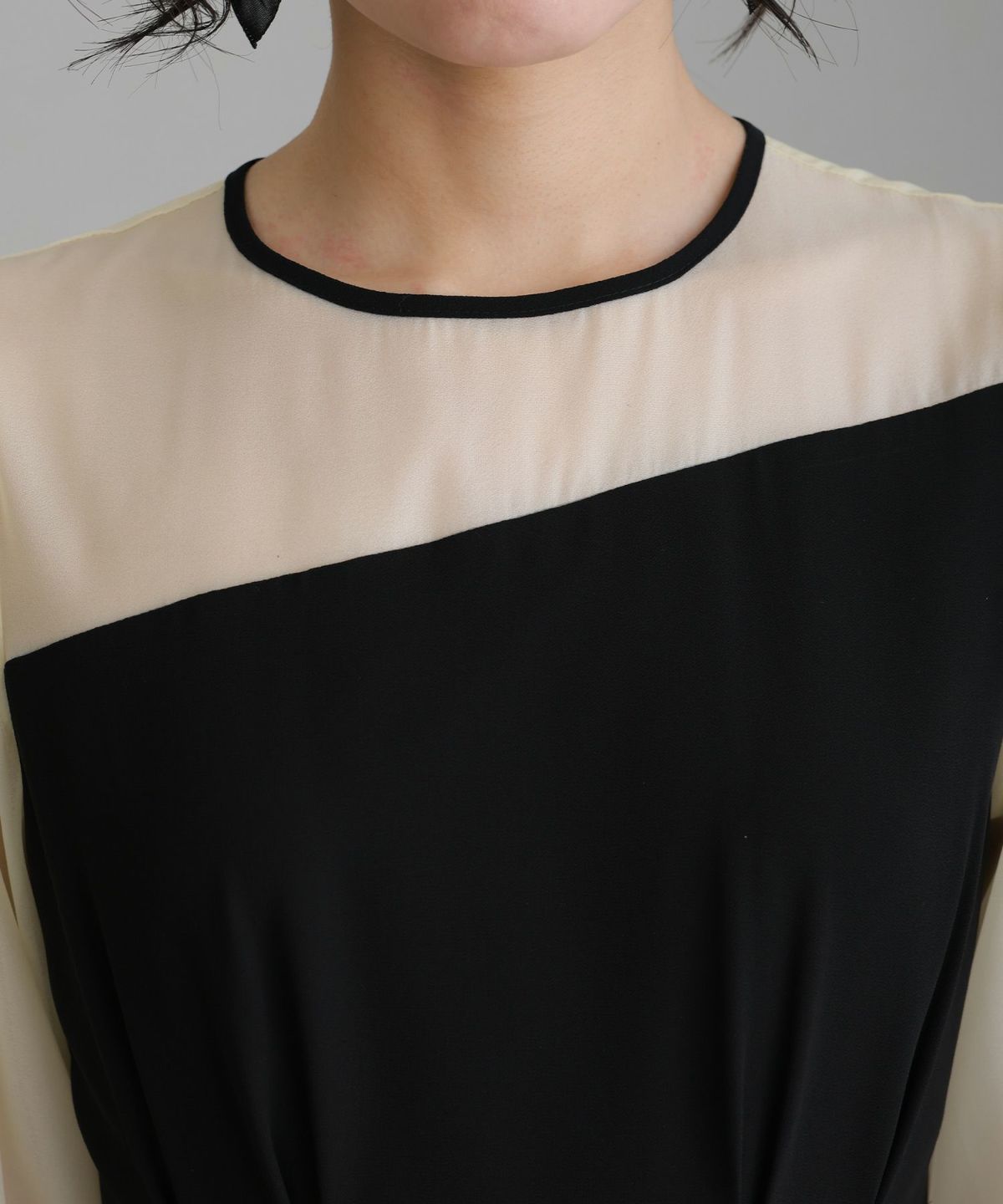胸元のアシンメトリーな切り替えが特徴的なフレアドレス。