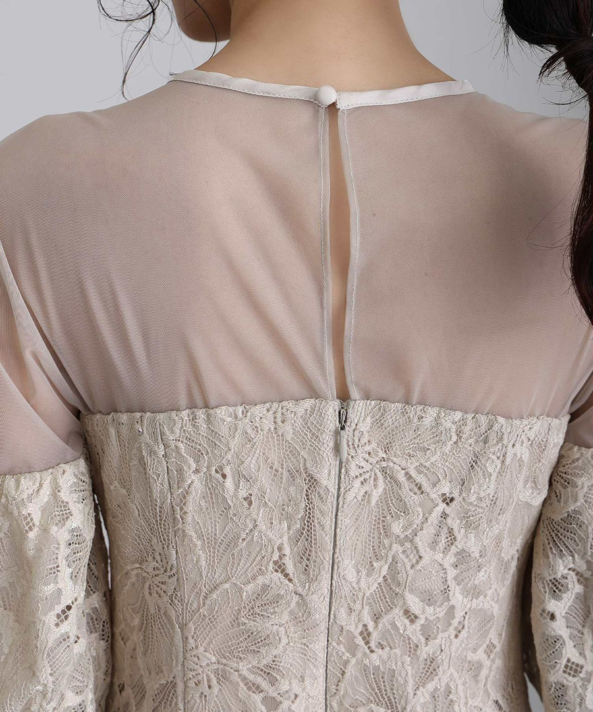 繊細なレース素材とローウエスト切替が魅力の一着。