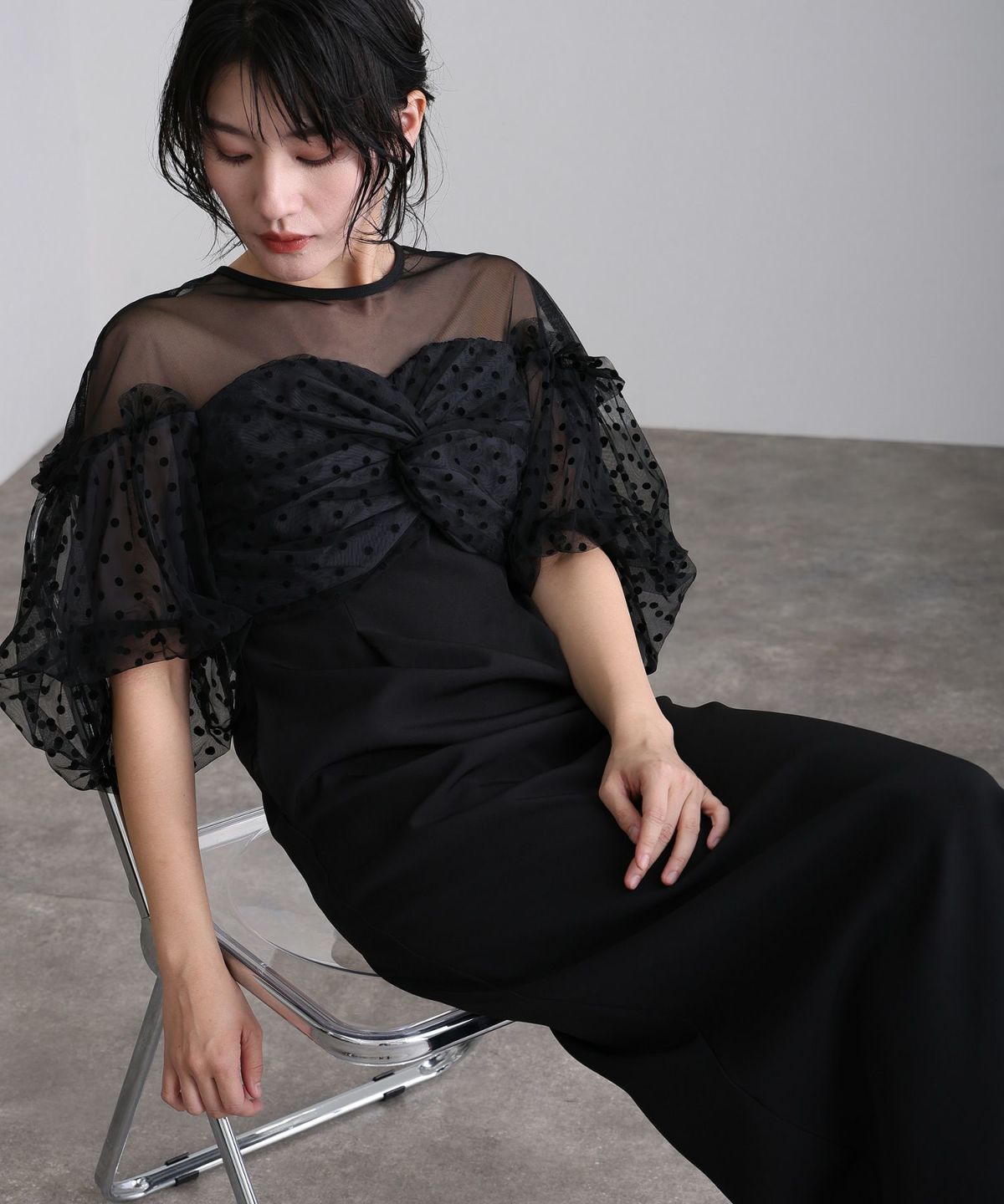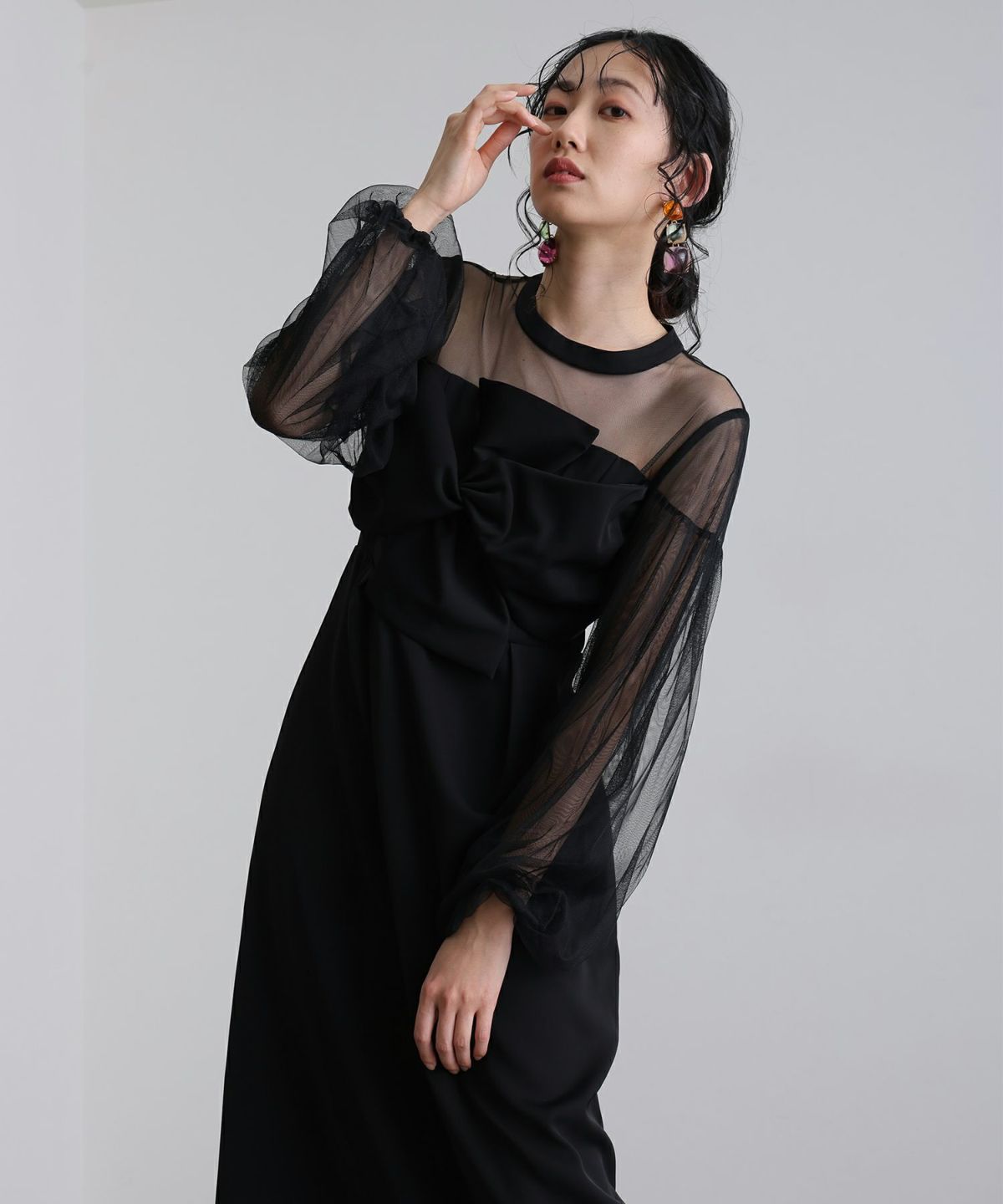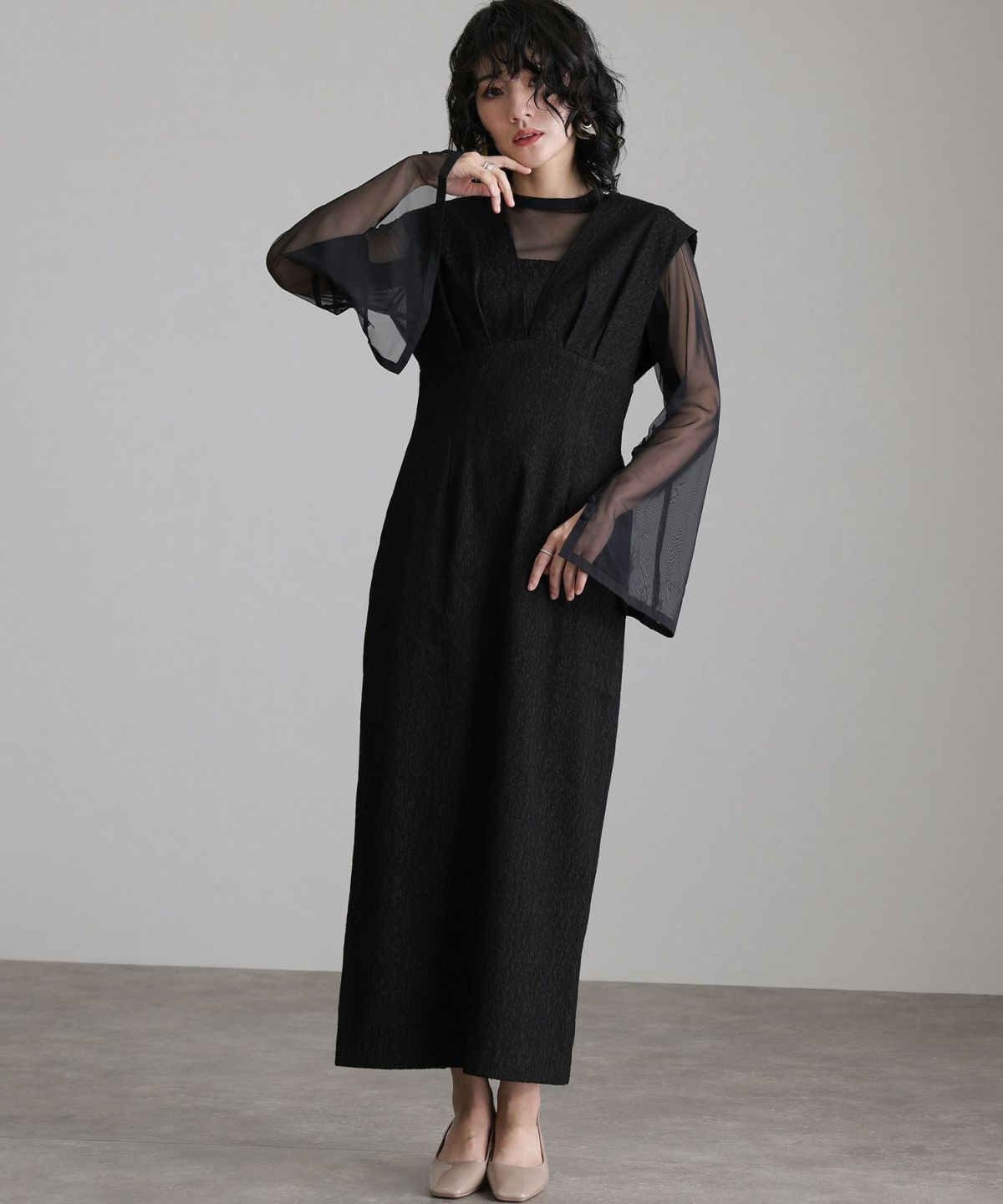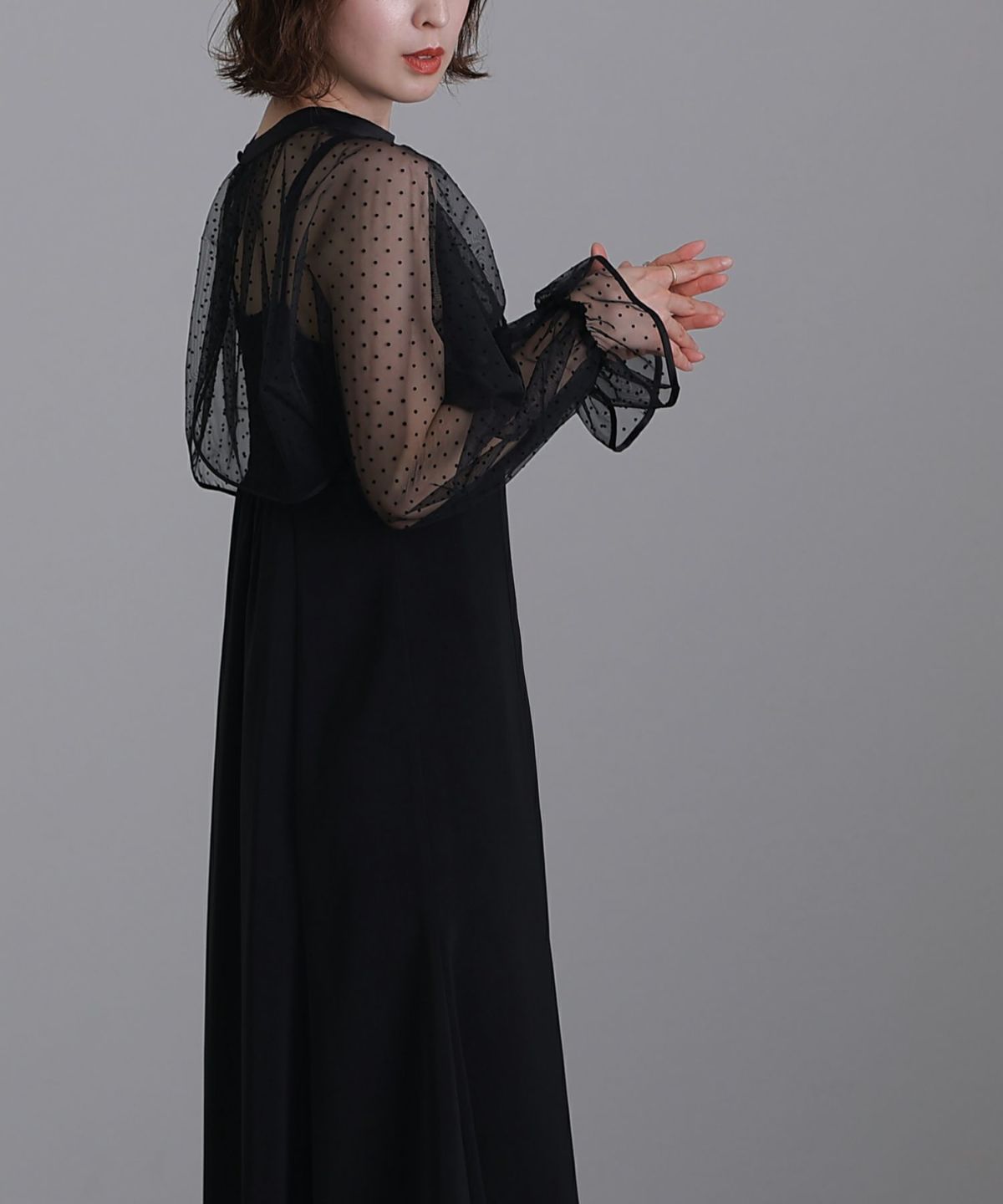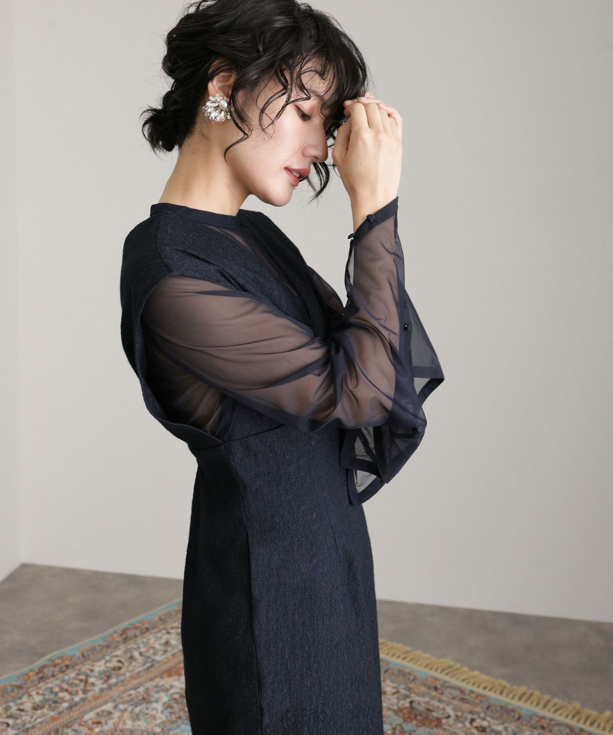 【二の腕】【脚】【ウエスト】【ヒップ】ほどよい透け感で気になる二の腕をカバーしたりロング丈で脚元もカバーできる体型カバーに優れたドレスもございます。