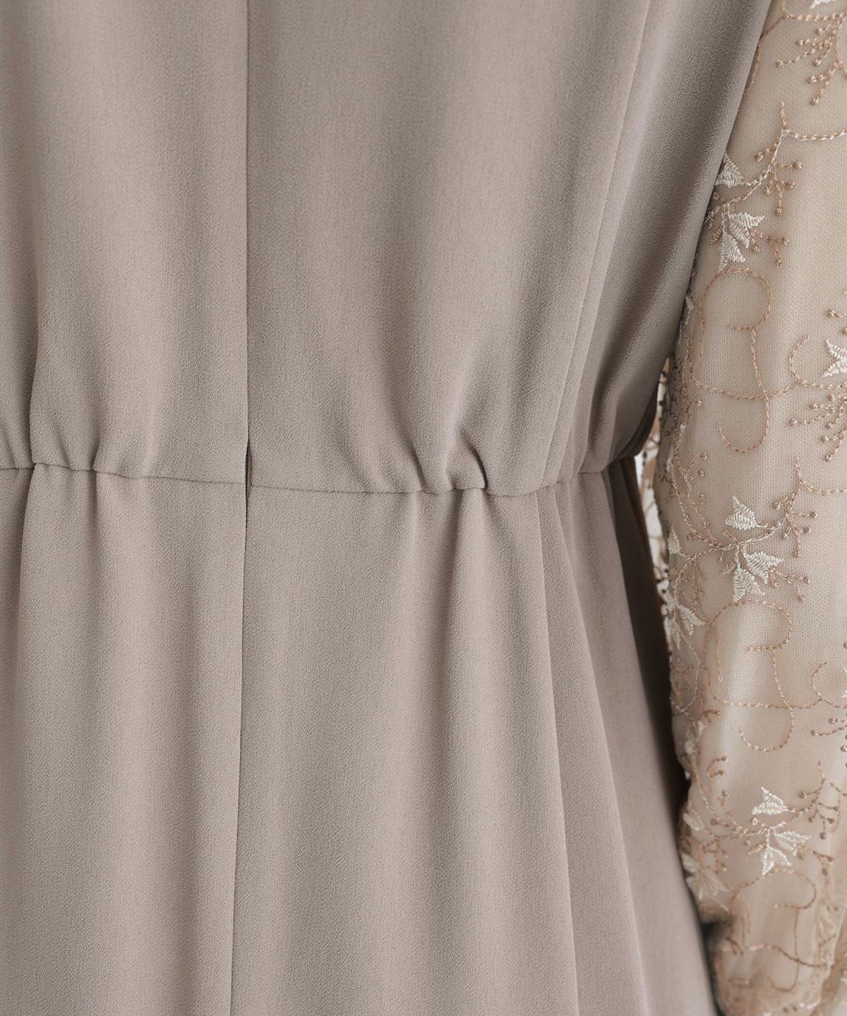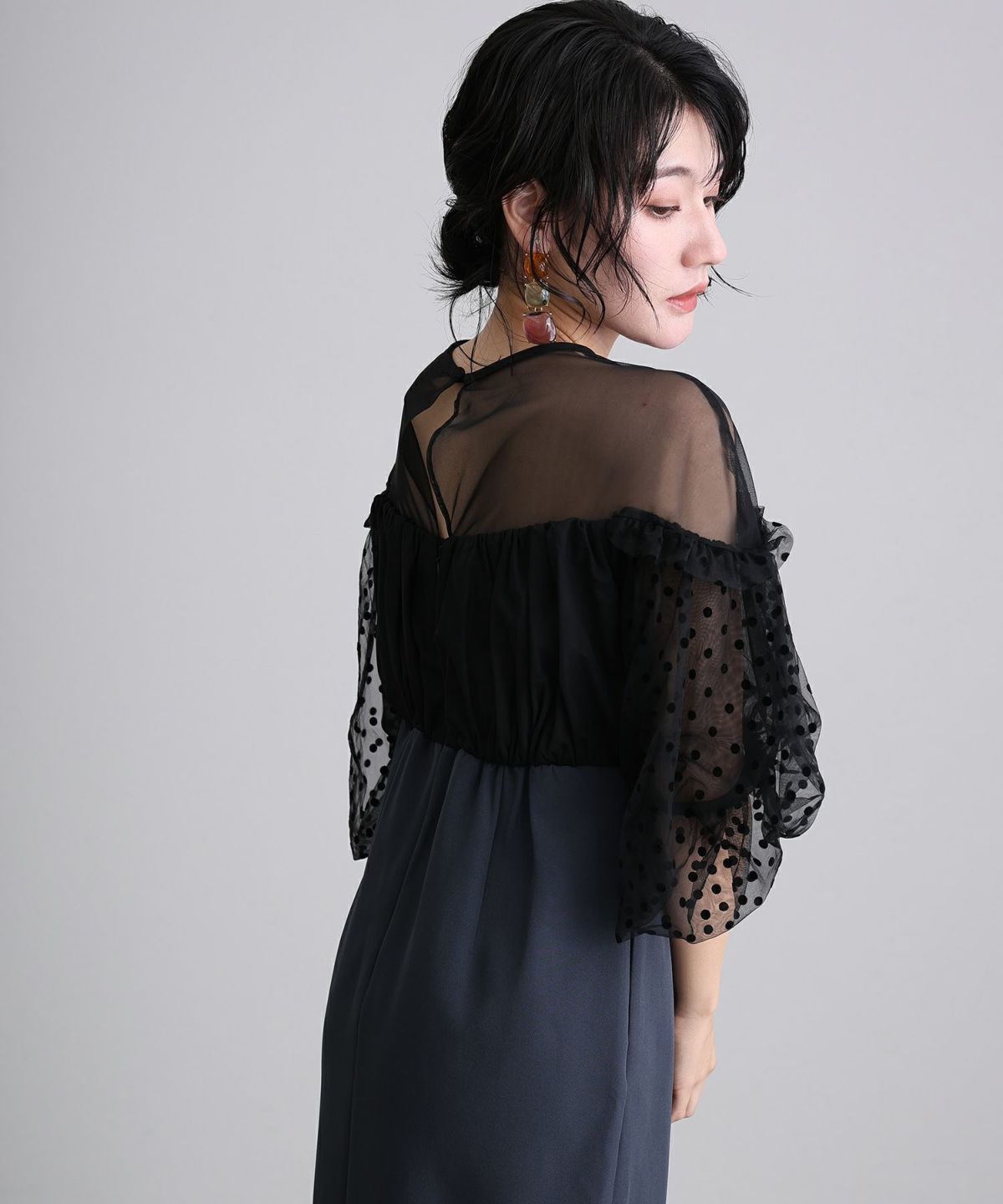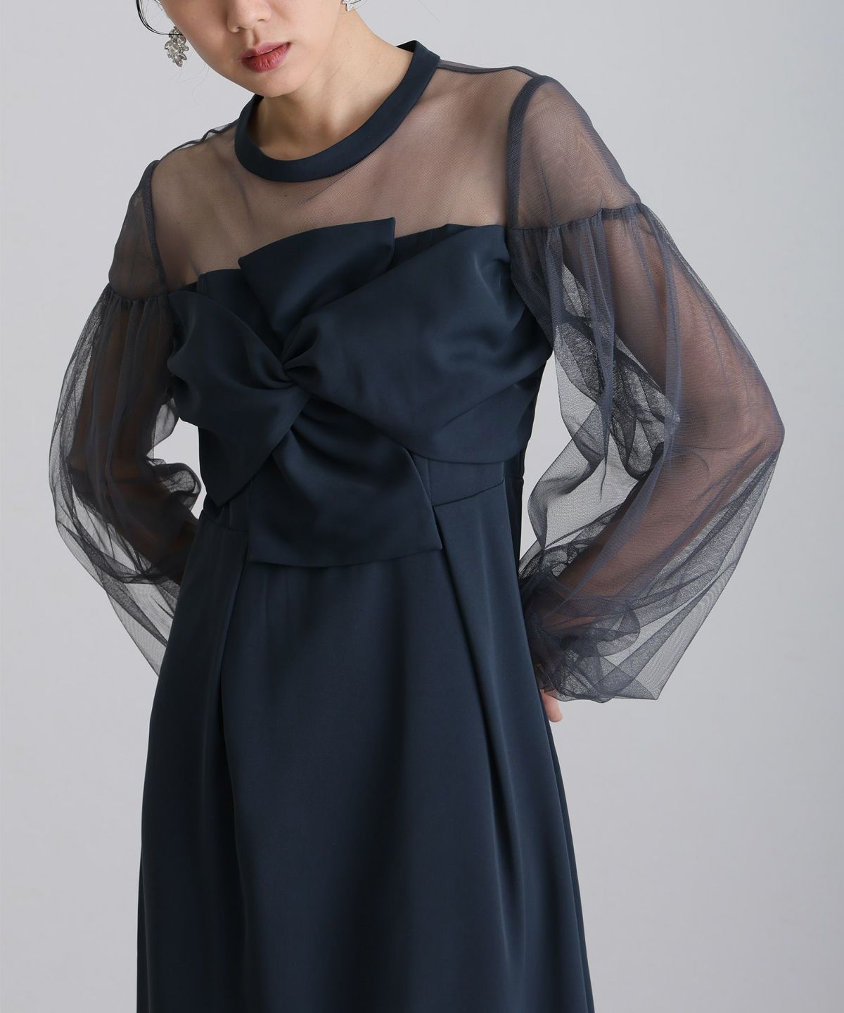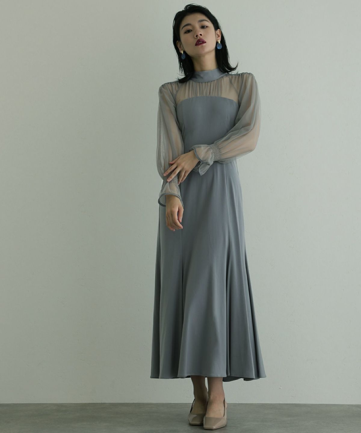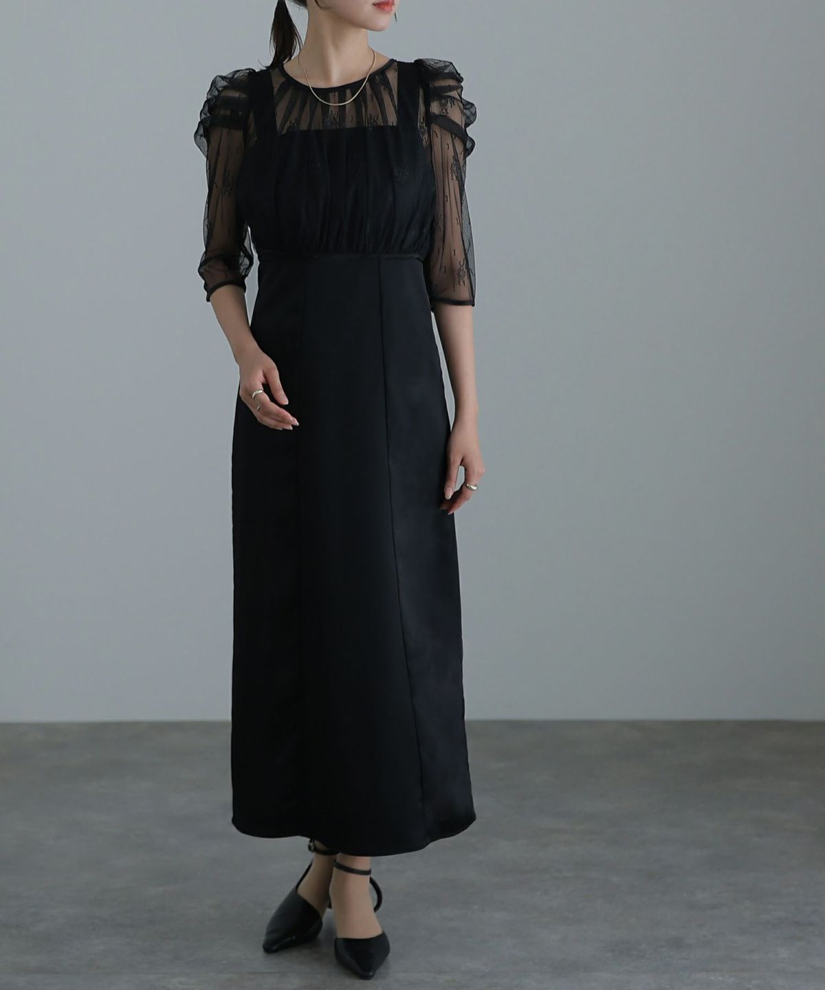 【二の腕】【脚】【ウエスト】【ヒップ】ほどよい透け感で気になる二の腕をカバーしたりロング丈で脚元もカバーできる体型カバーに優れたドレスもございます。