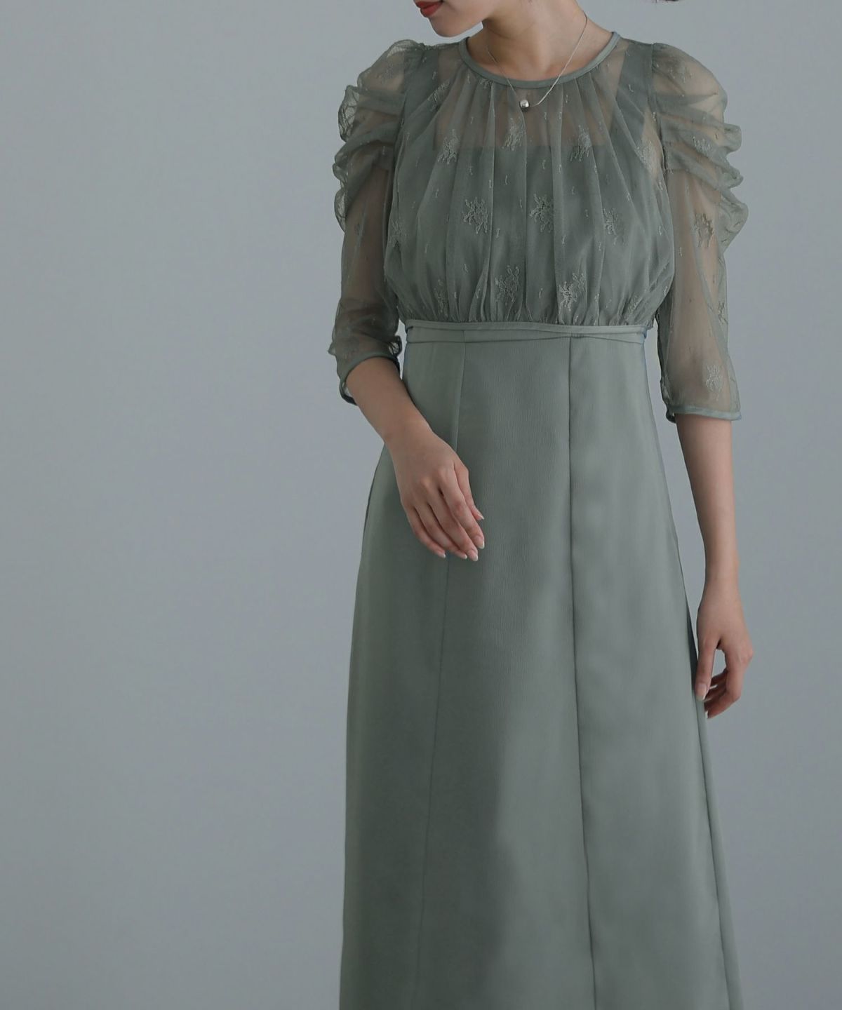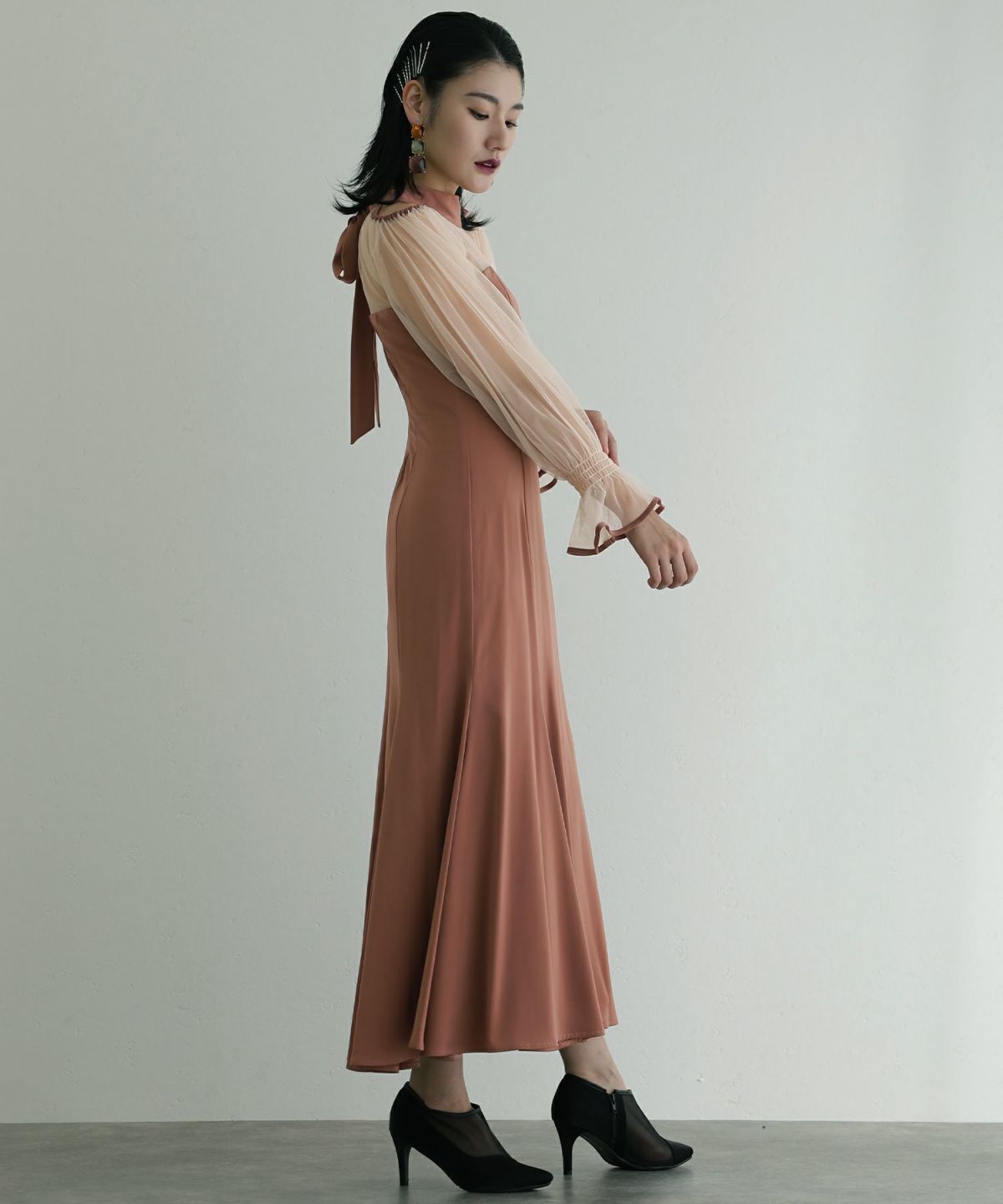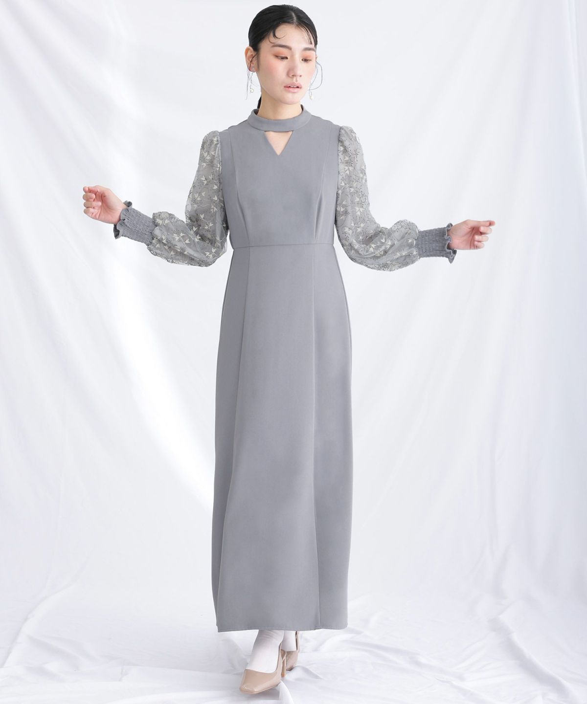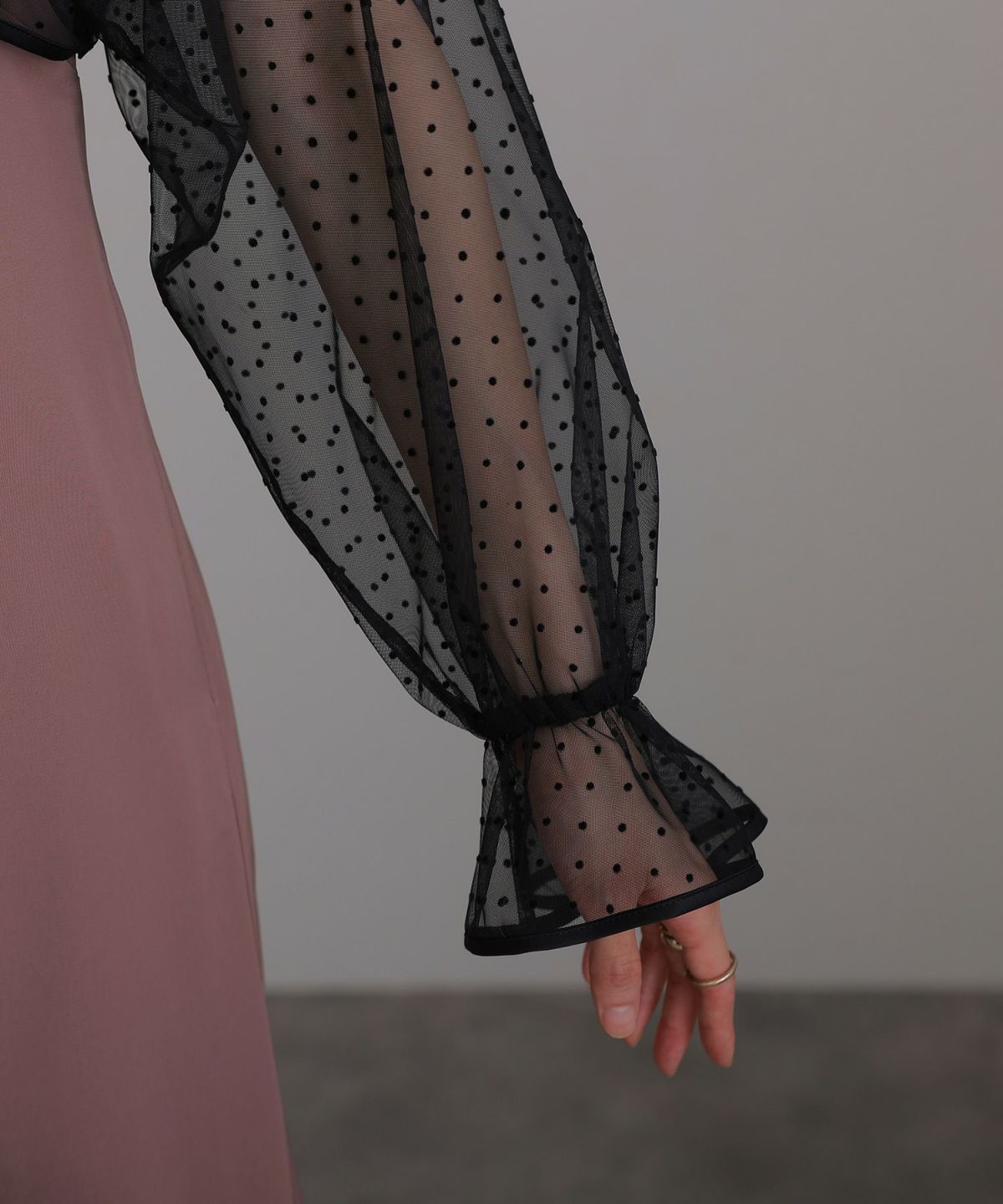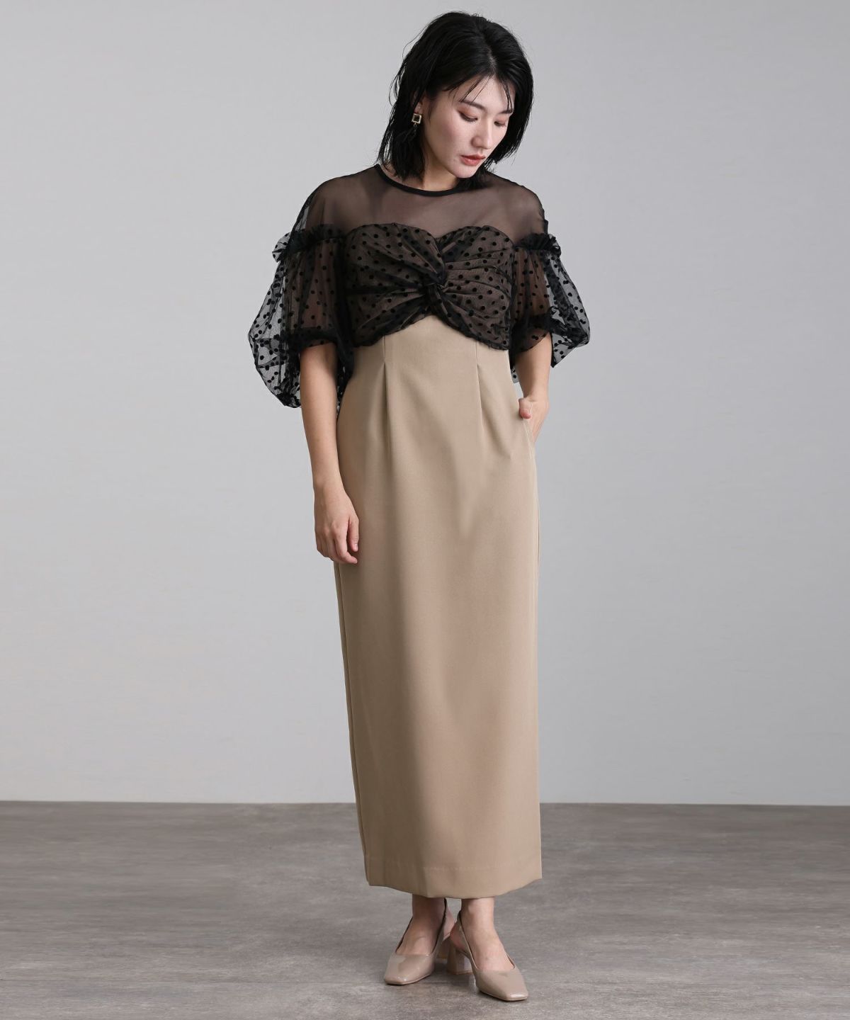 【二の腕】【脚】【ウエスト】【ヒップ】ほどよい透け感で気になる二の腕をカバーしたりロング丈で脚元もカバーできる体型カバーに優れたドレスもございます。