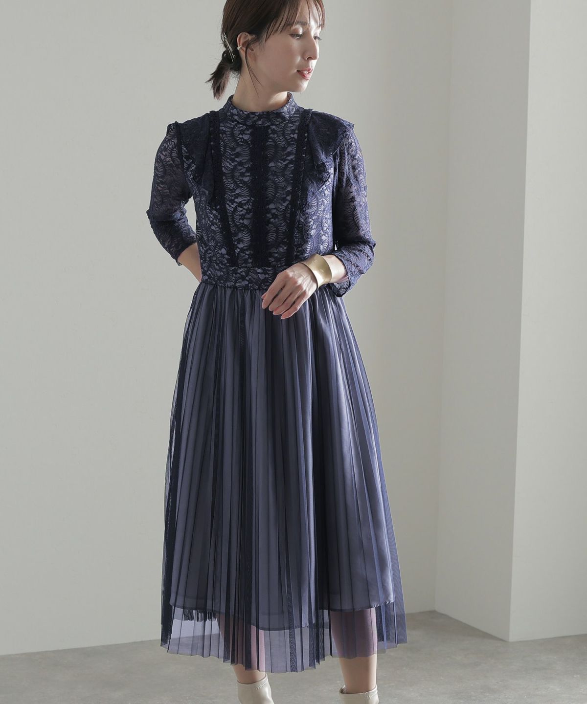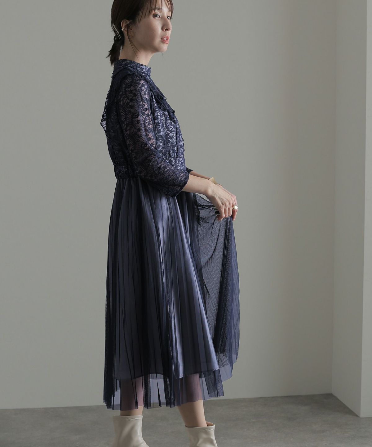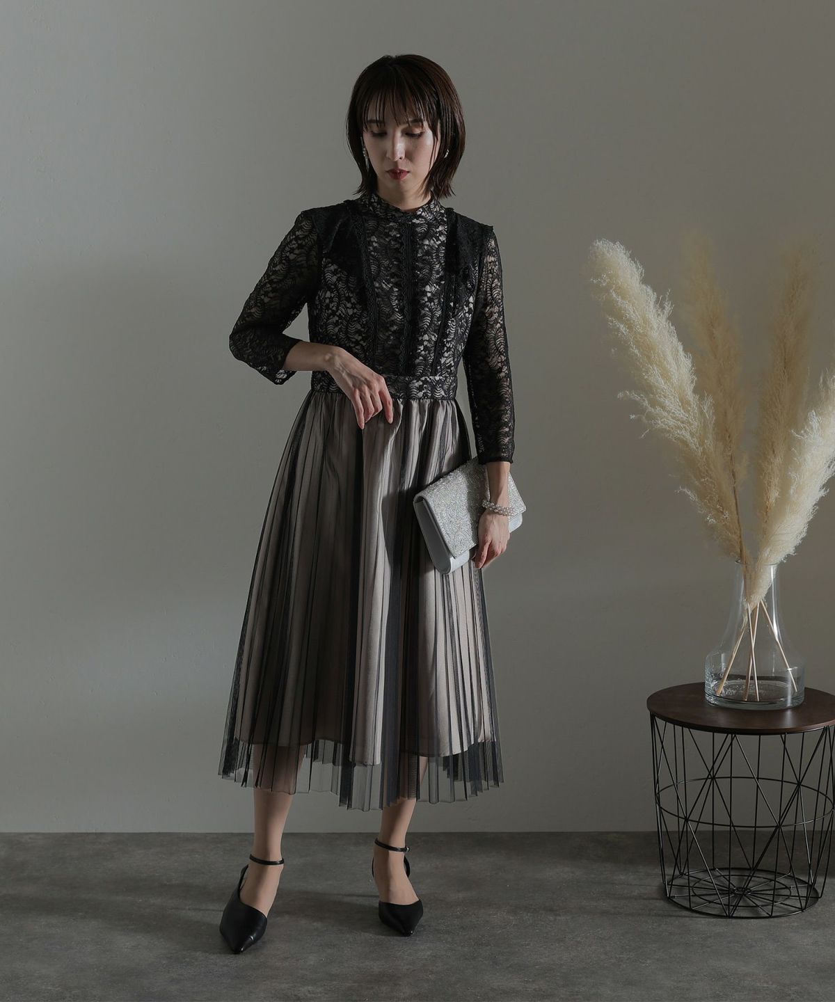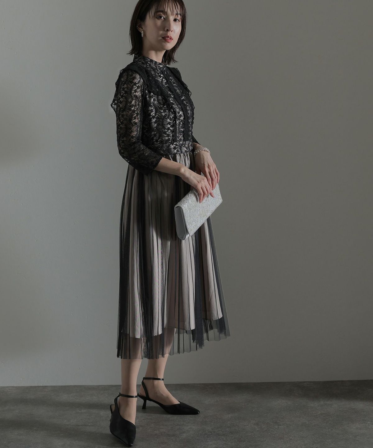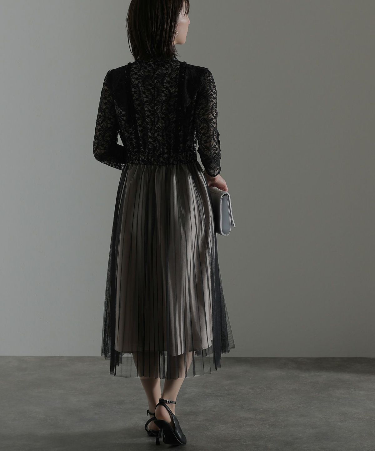 レースの透け感とチュールが大人カワイイワンピース レーストップスチュールプリーツスカートドレス