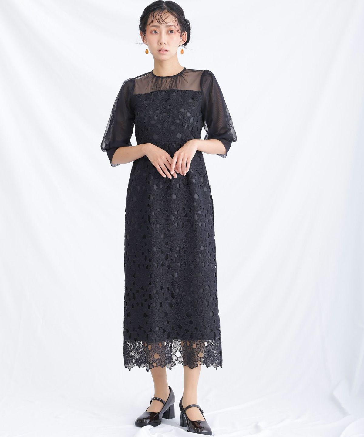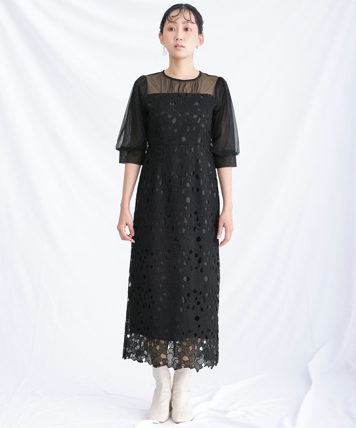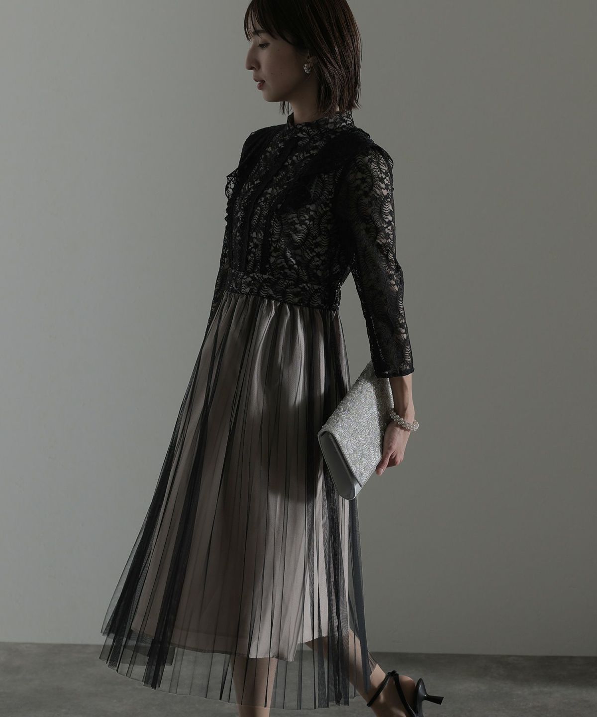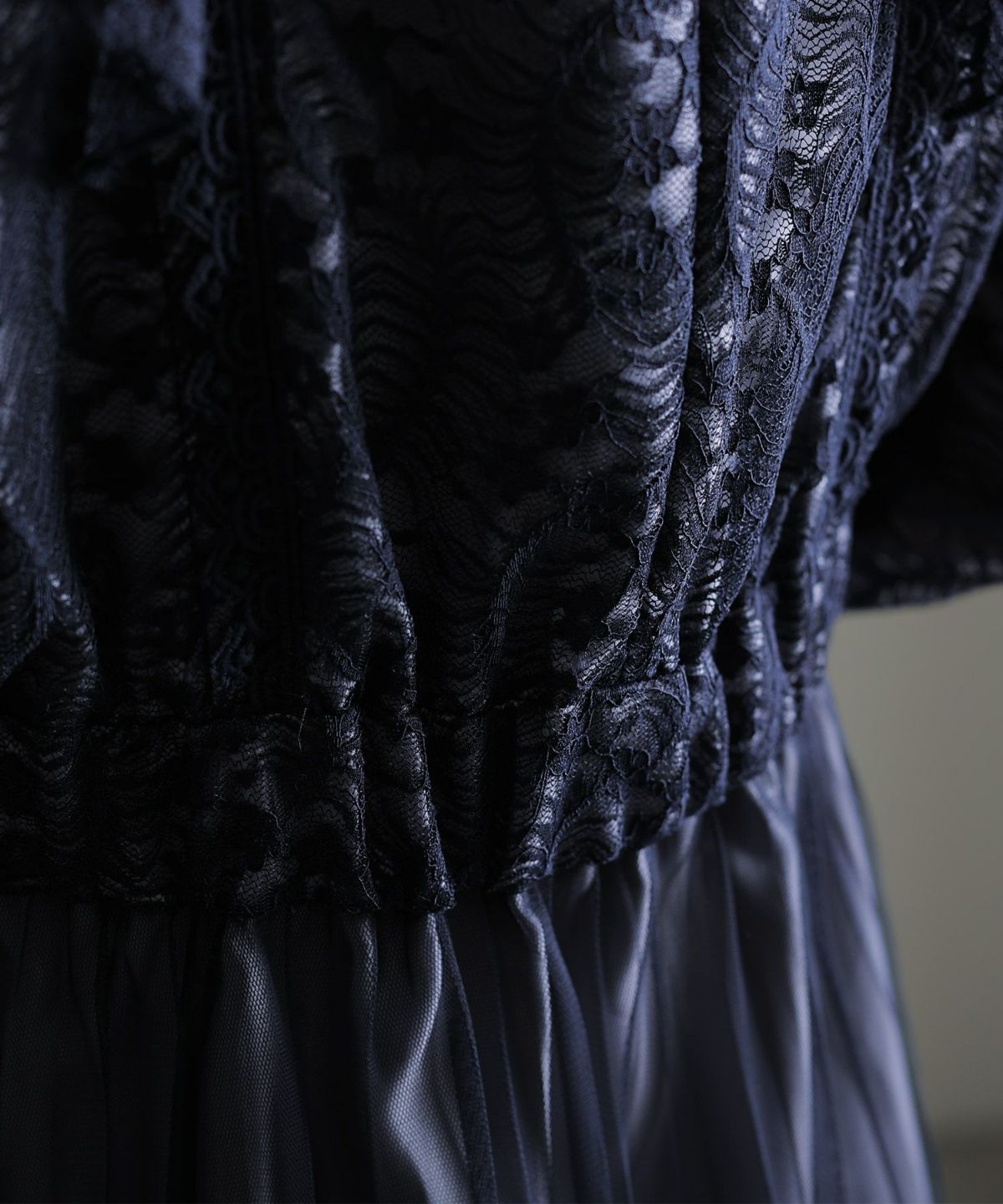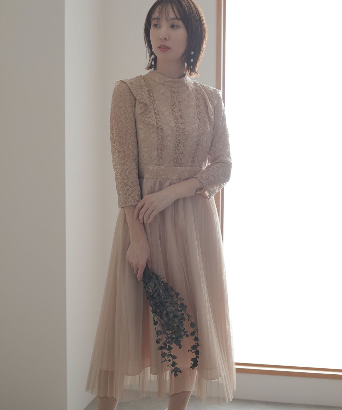 立体感があるケミカルレースとチュールの切り替えがお洒落 チュール切替ケミカルレースワンピース