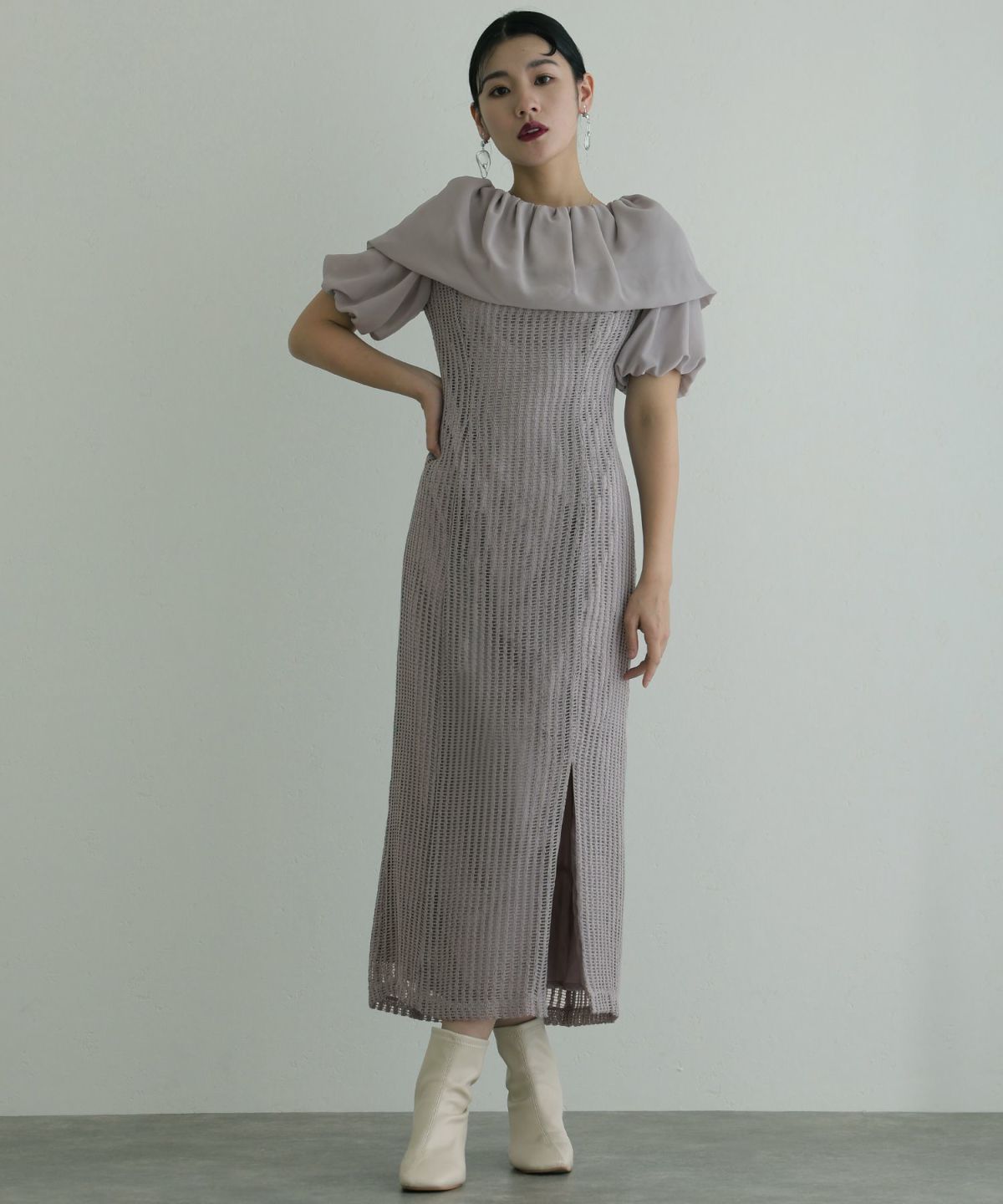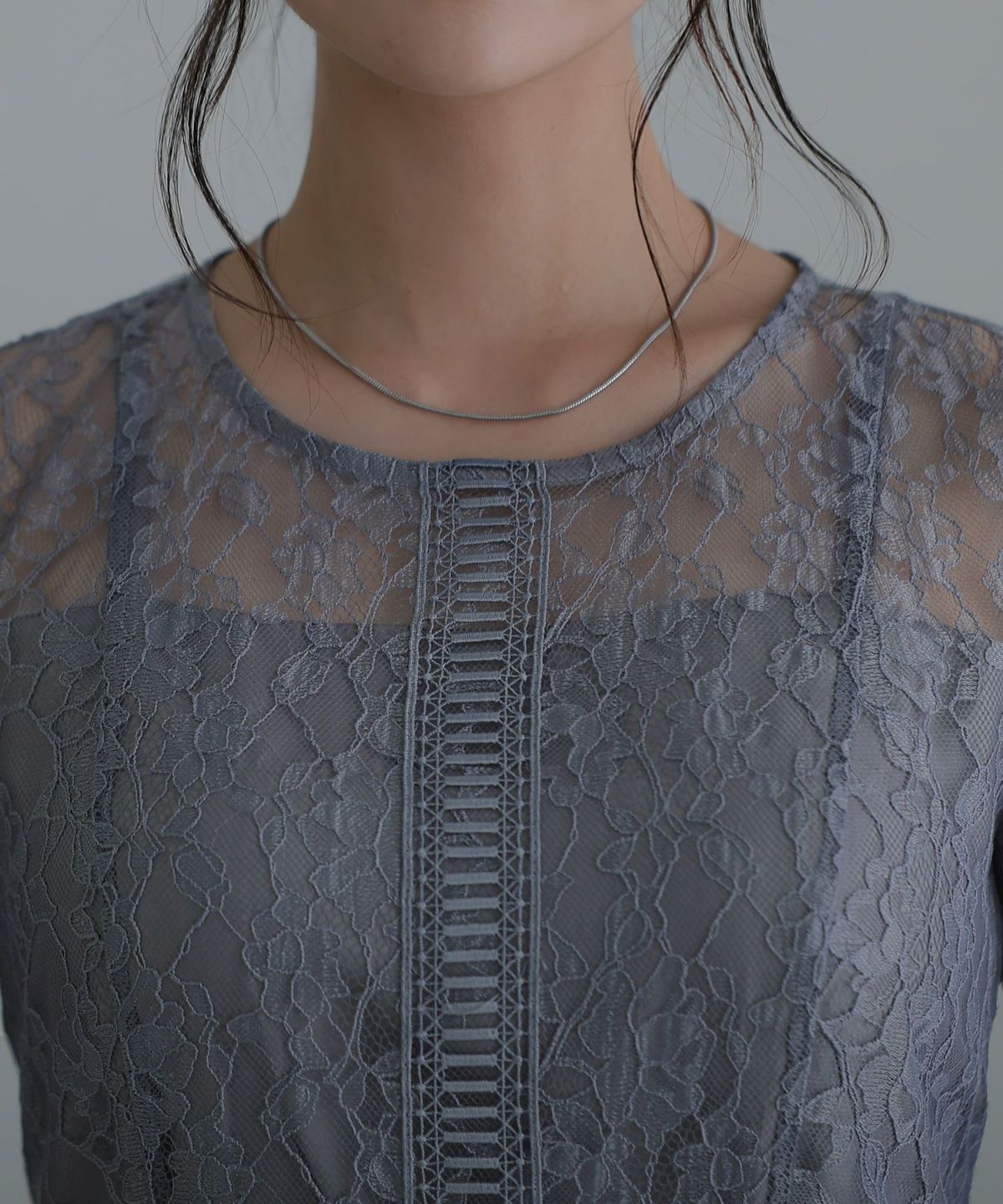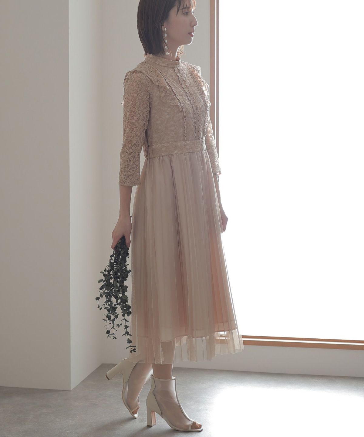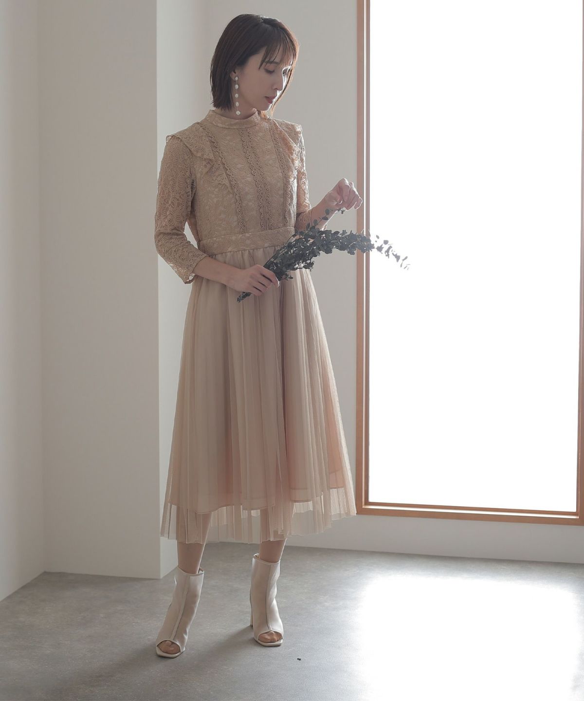 立体感があるケミカルレースとチュールの切り替えがお洒落 チュール切替ケミカルレースワンピース
