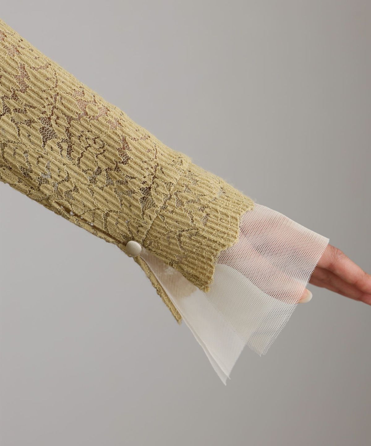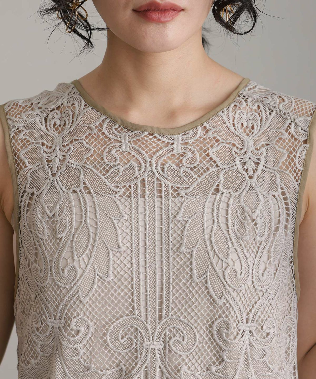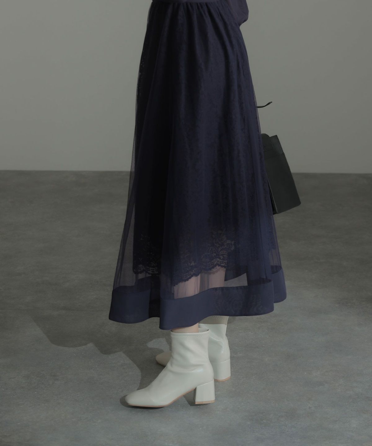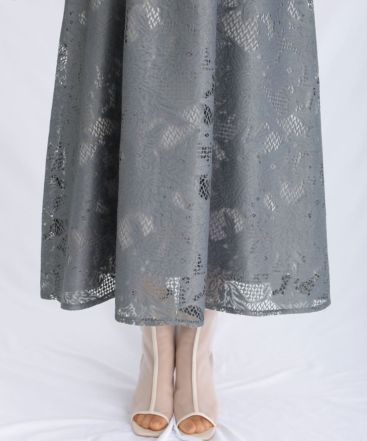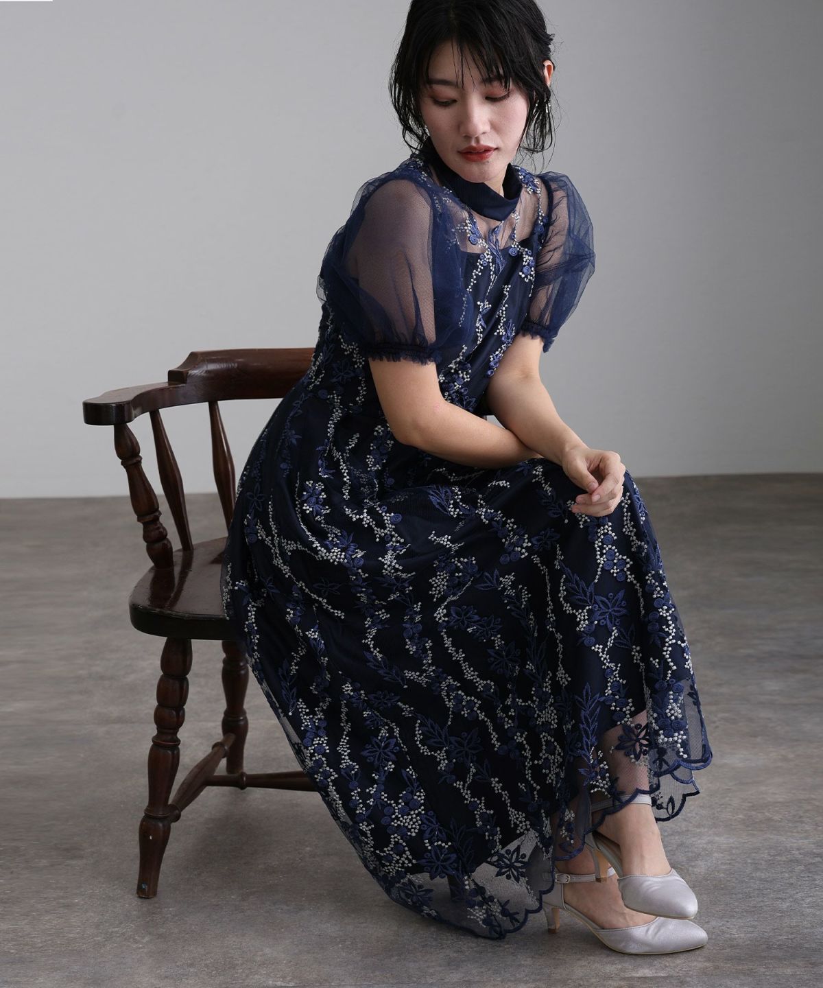 立体感があるケミカルレースとチュールの切り替えがお洒落 チュール切替ケミカルレースワンピース