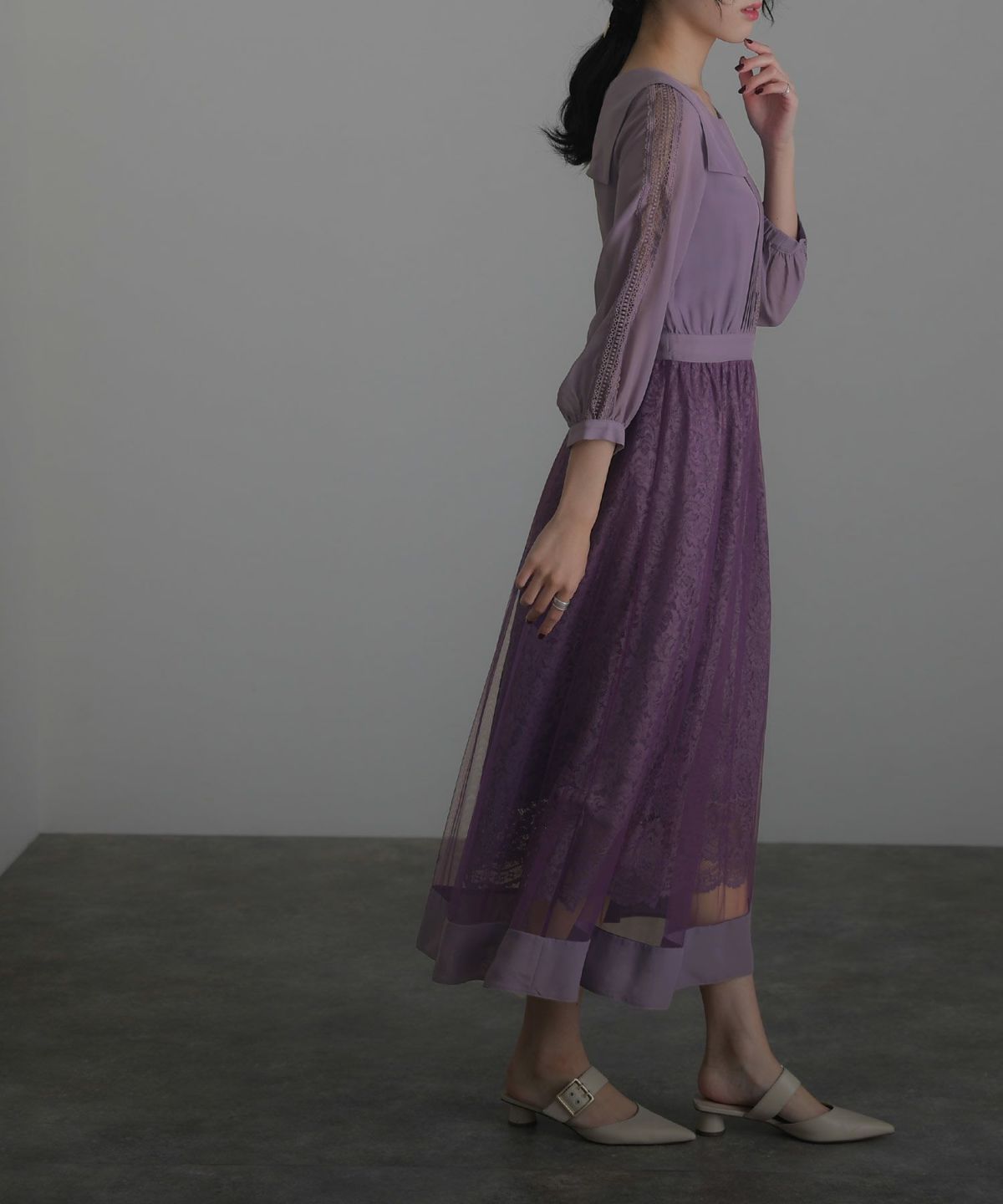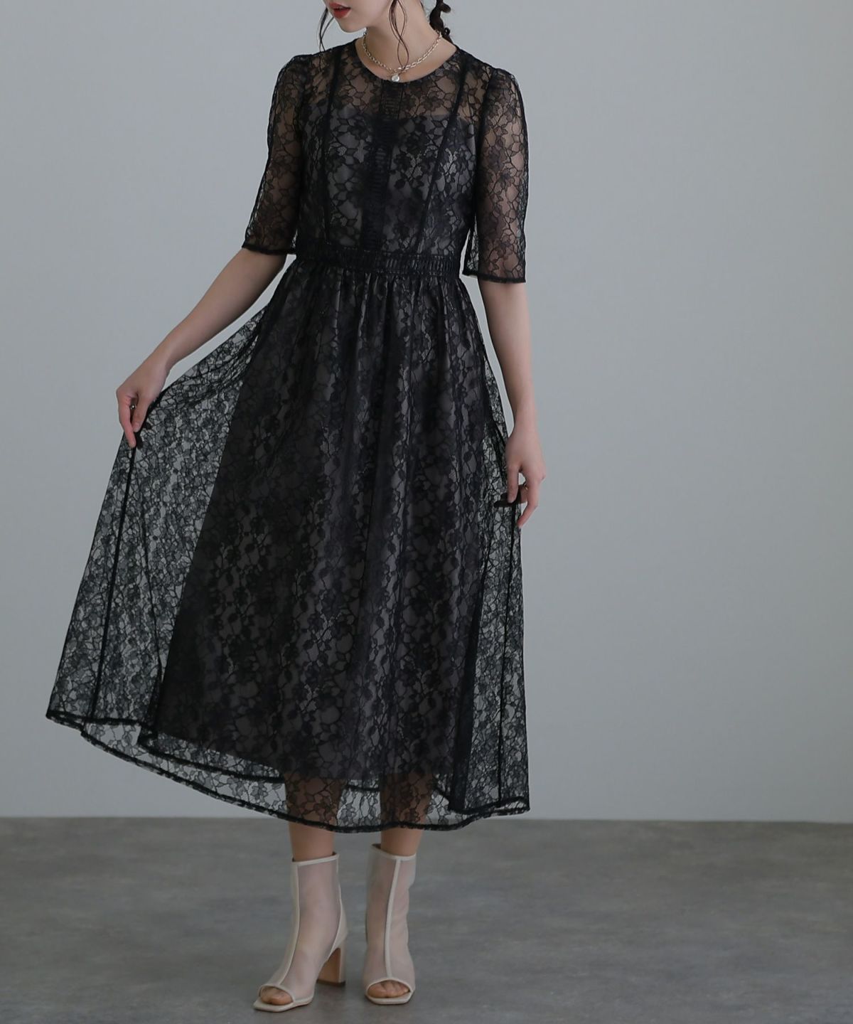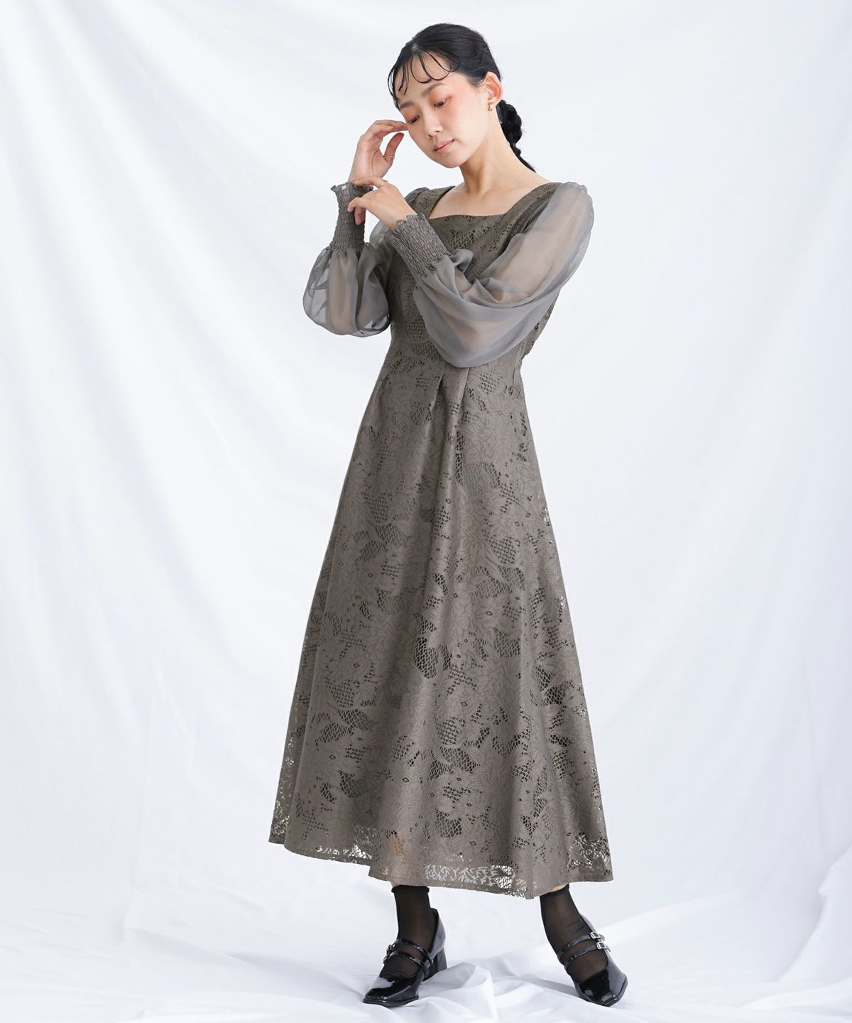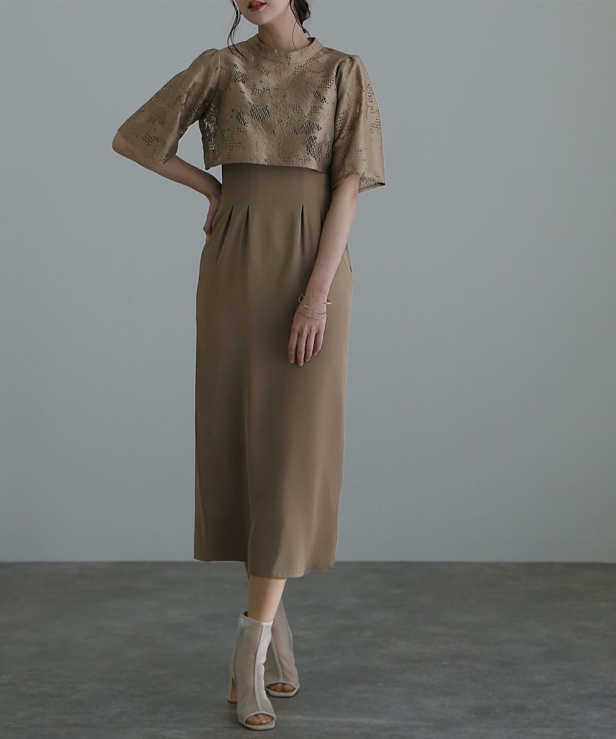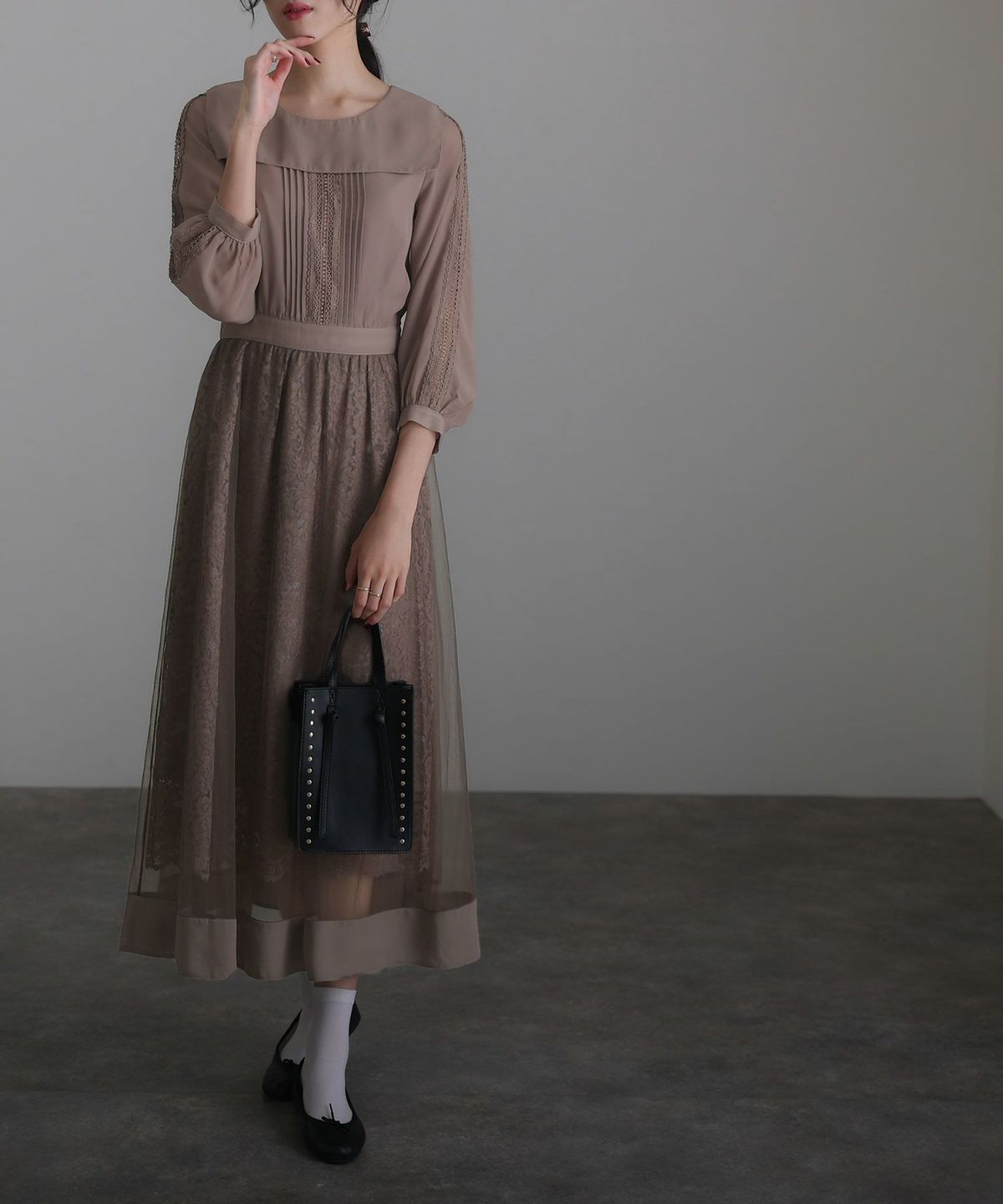 レースとオーガンジー素材の組み合わせが華やか レースレイヤードワンピ―ス