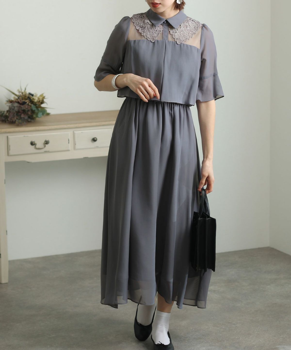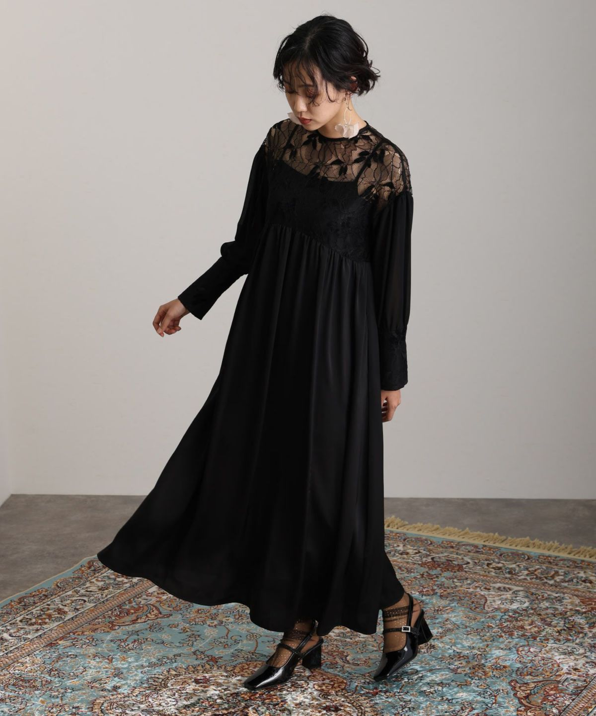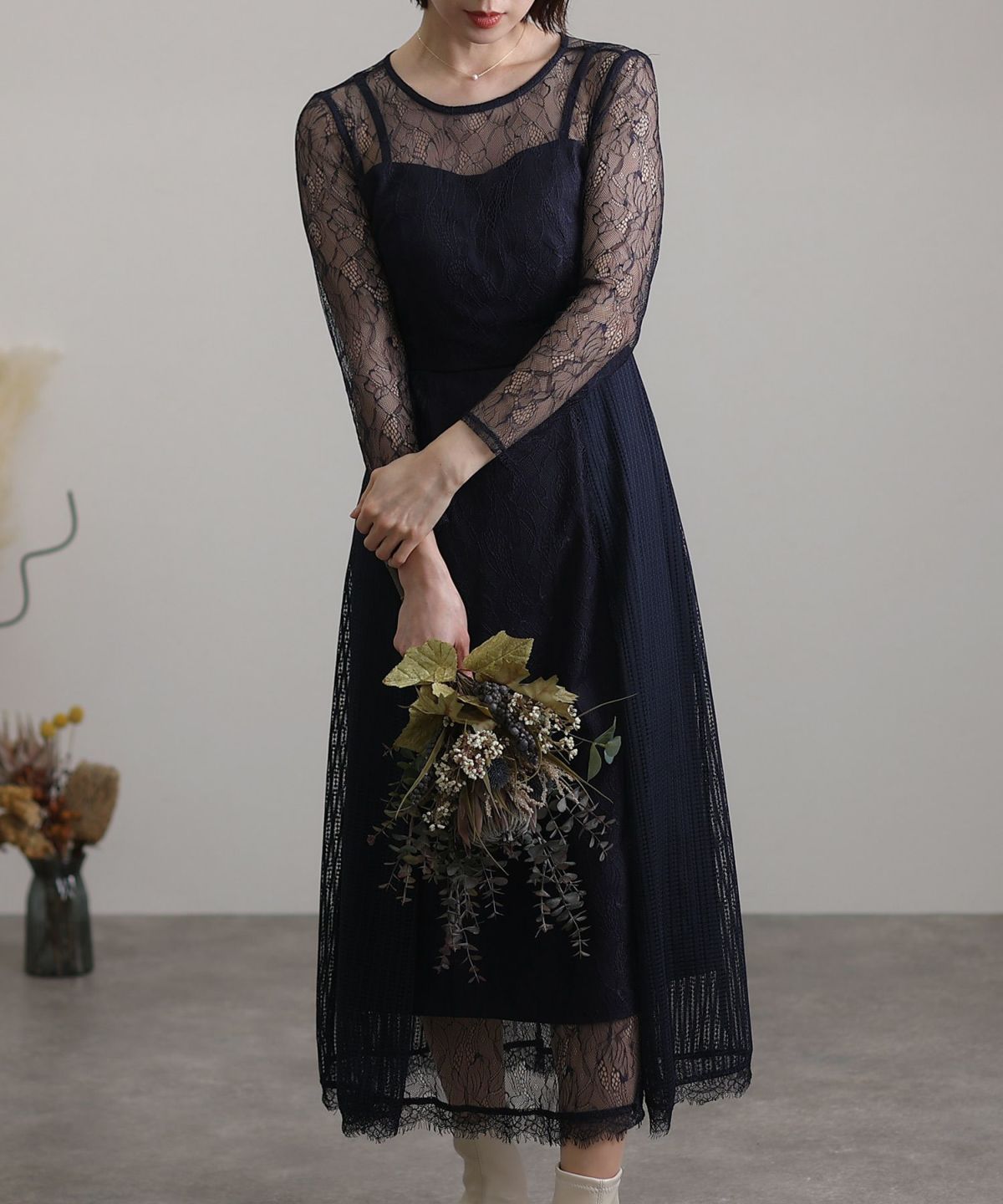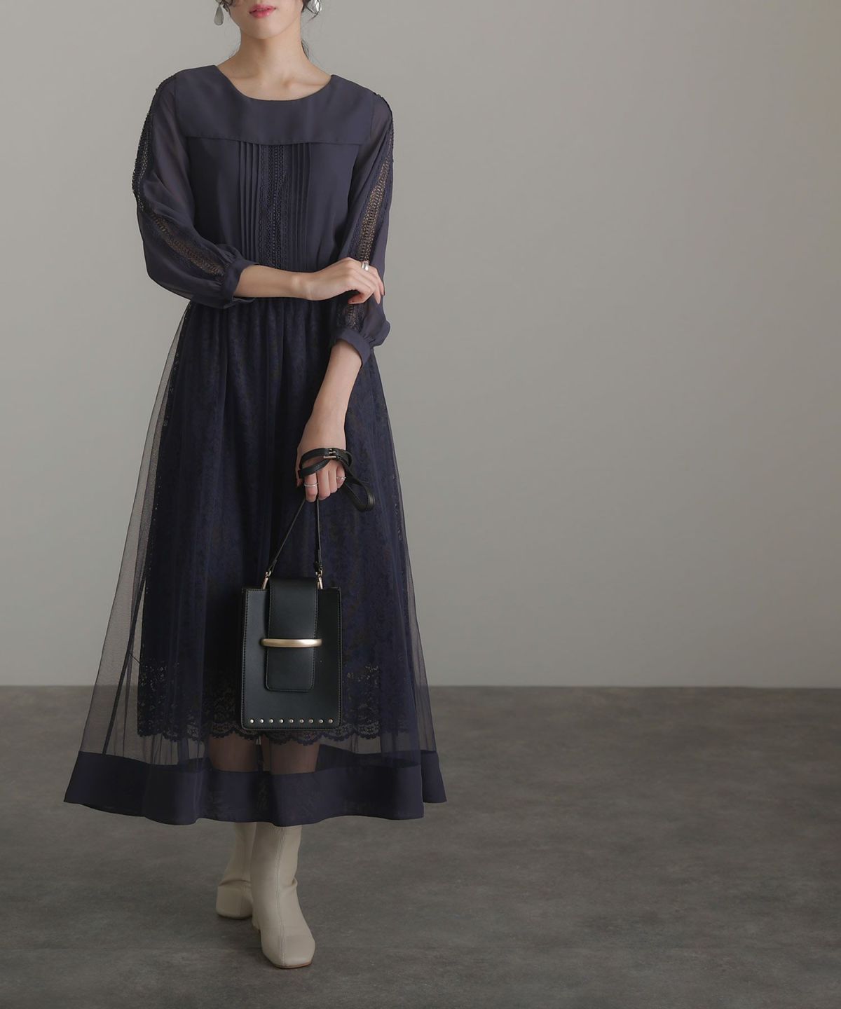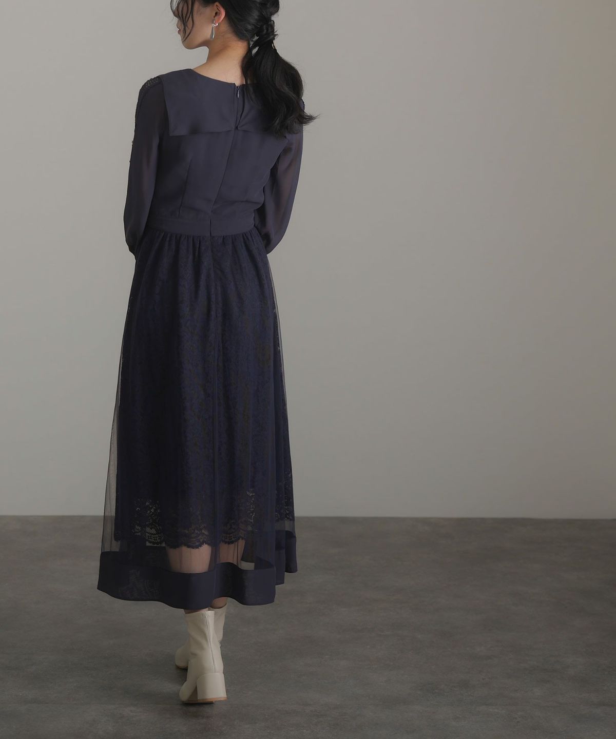 レースとオーガンジー素材の組み合わせが華やか レースレイヤードワンピ―ス