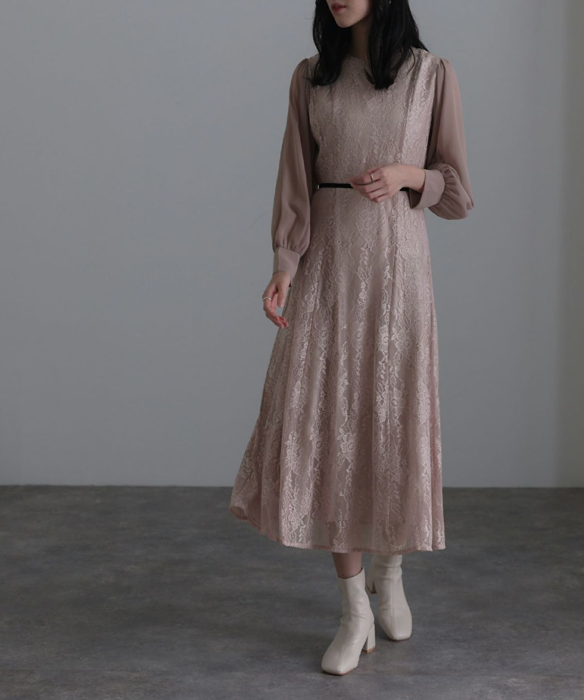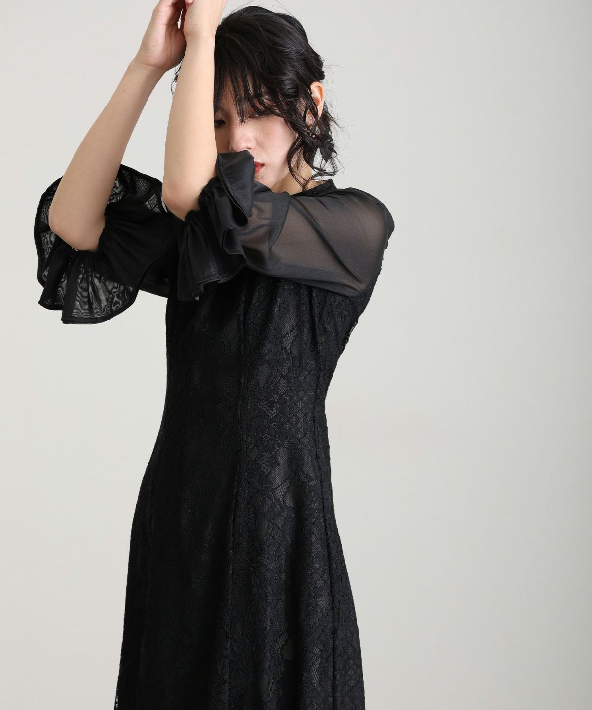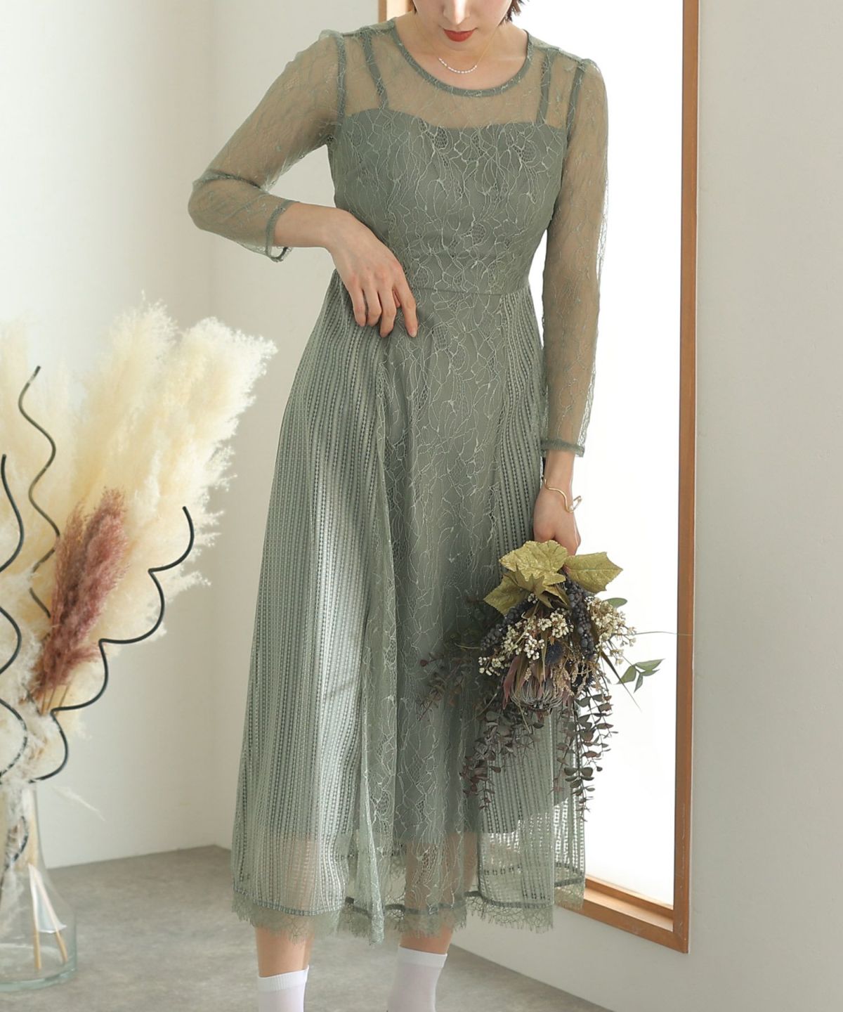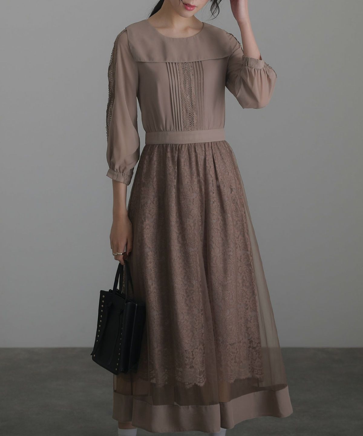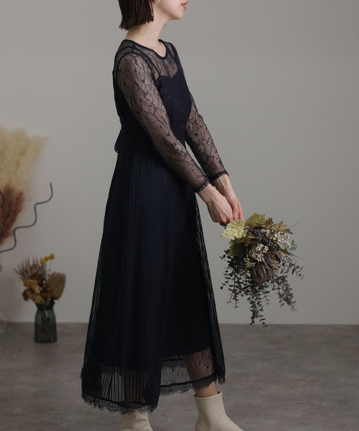 レースとオーガンジー素材の組み合わせが華やか レースレイヤードワンピ―ス