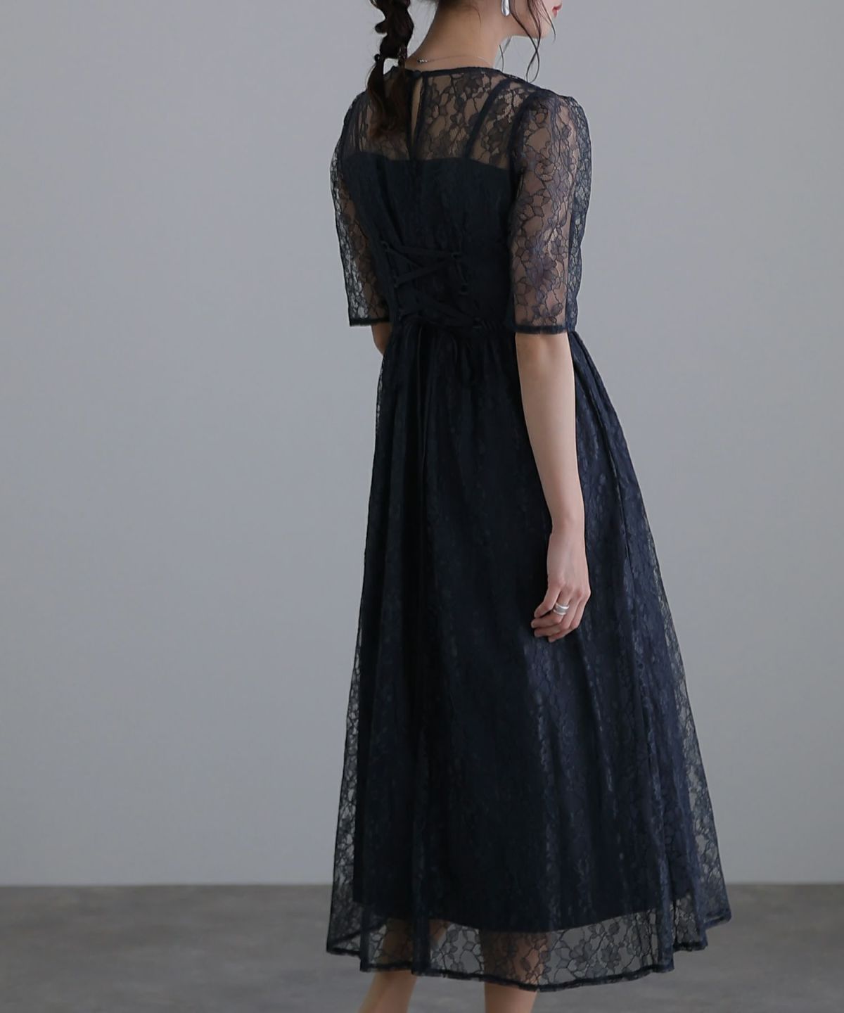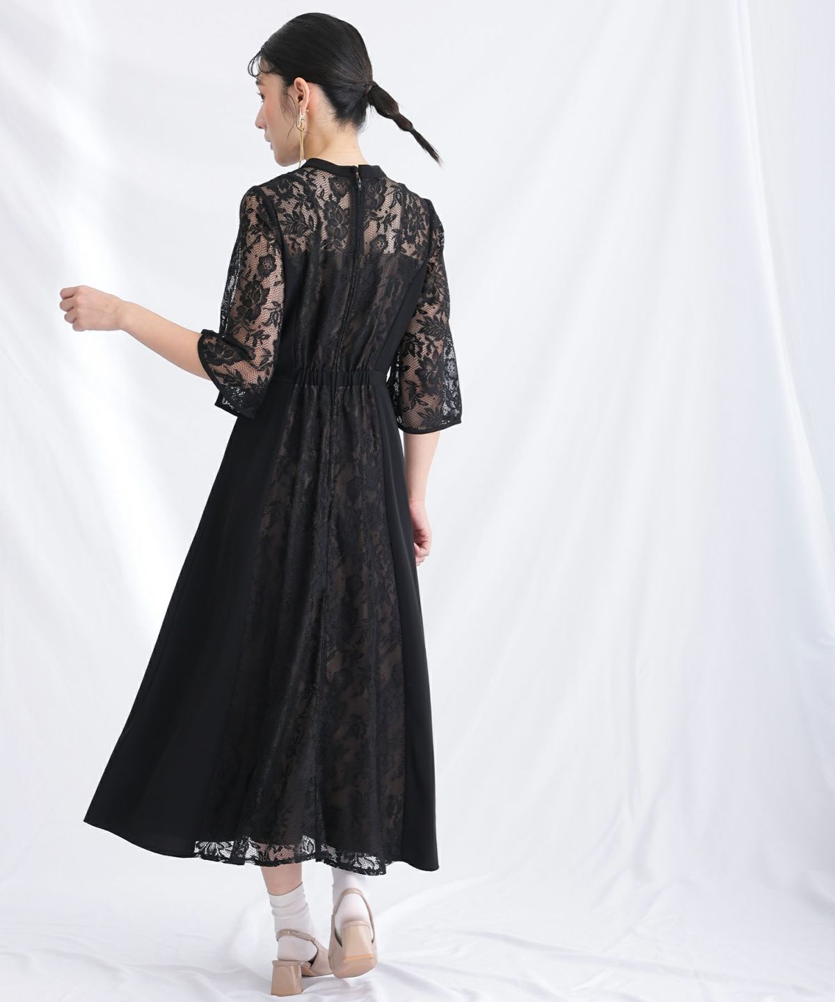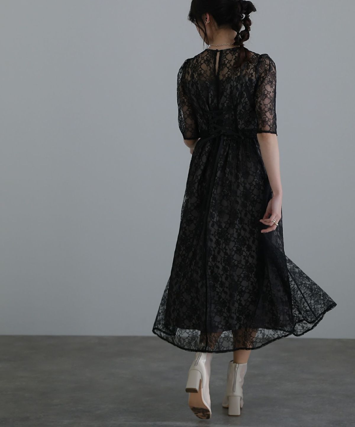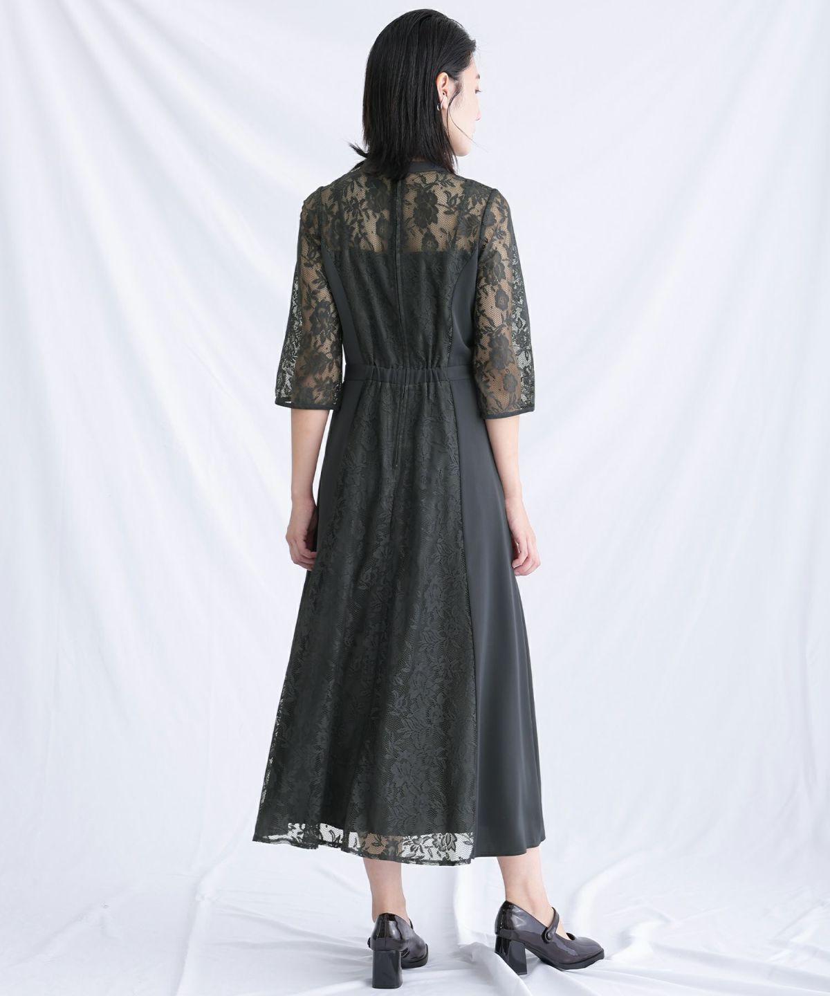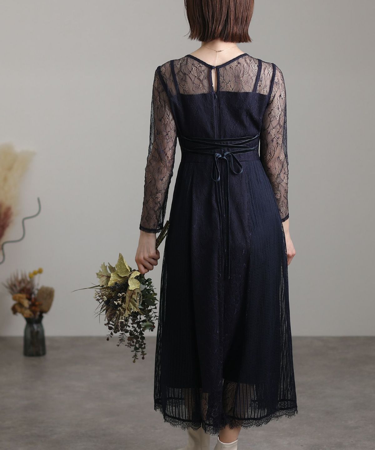 2種類のレースを贅沢に使用したエレガントなドレス 異素材レース切り替えバックレースアップワンピース