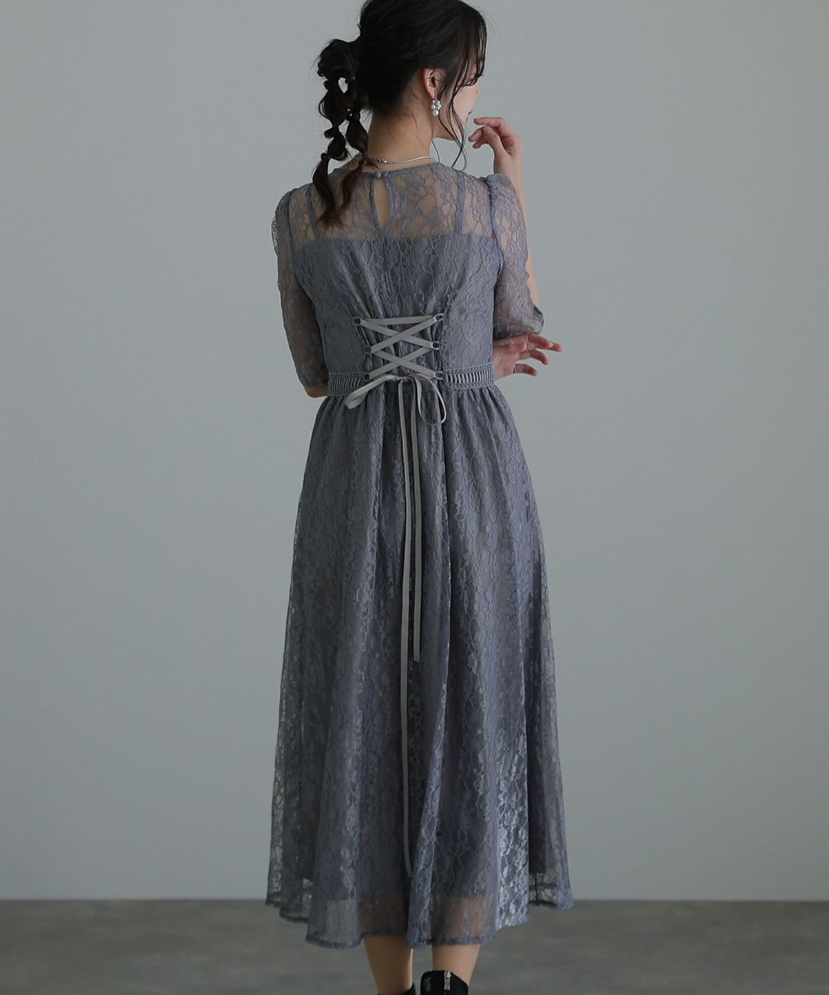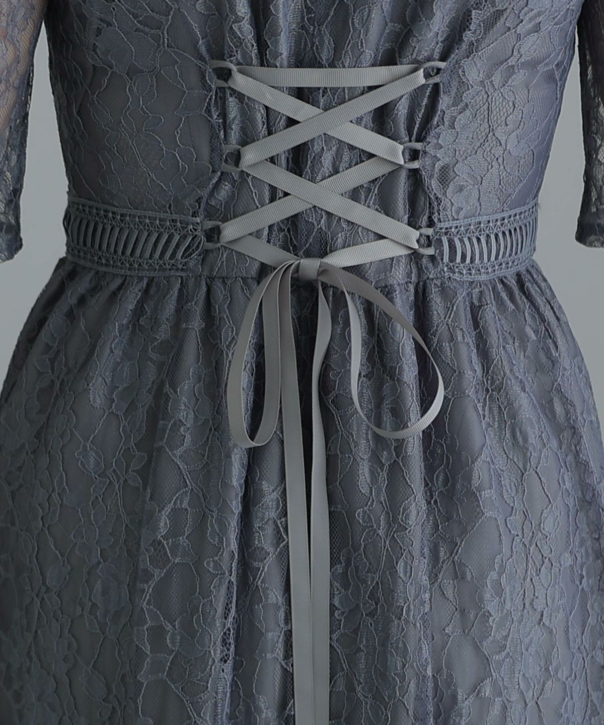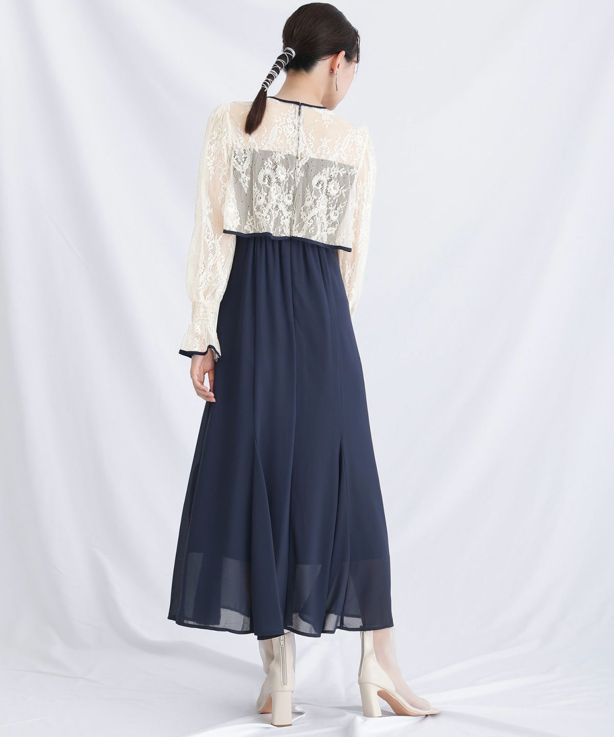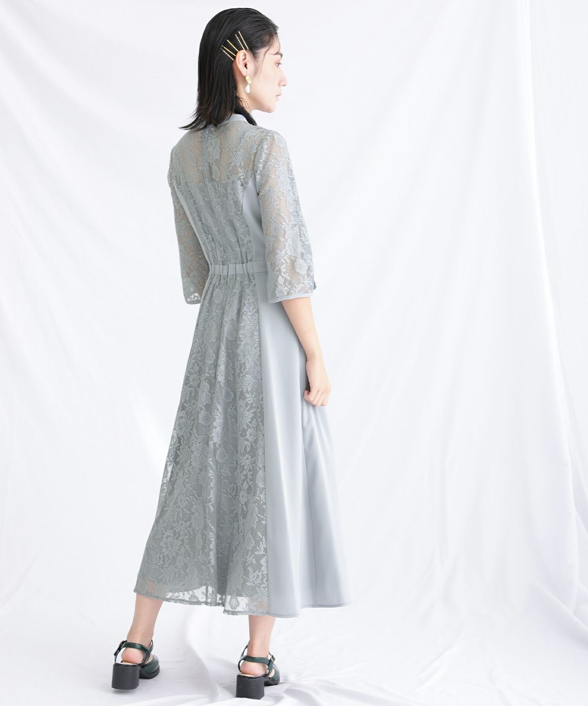 2種類のレースを贅沢に使用したエレガントなドレス 異素材レース切り替えバックレースアップワンピース