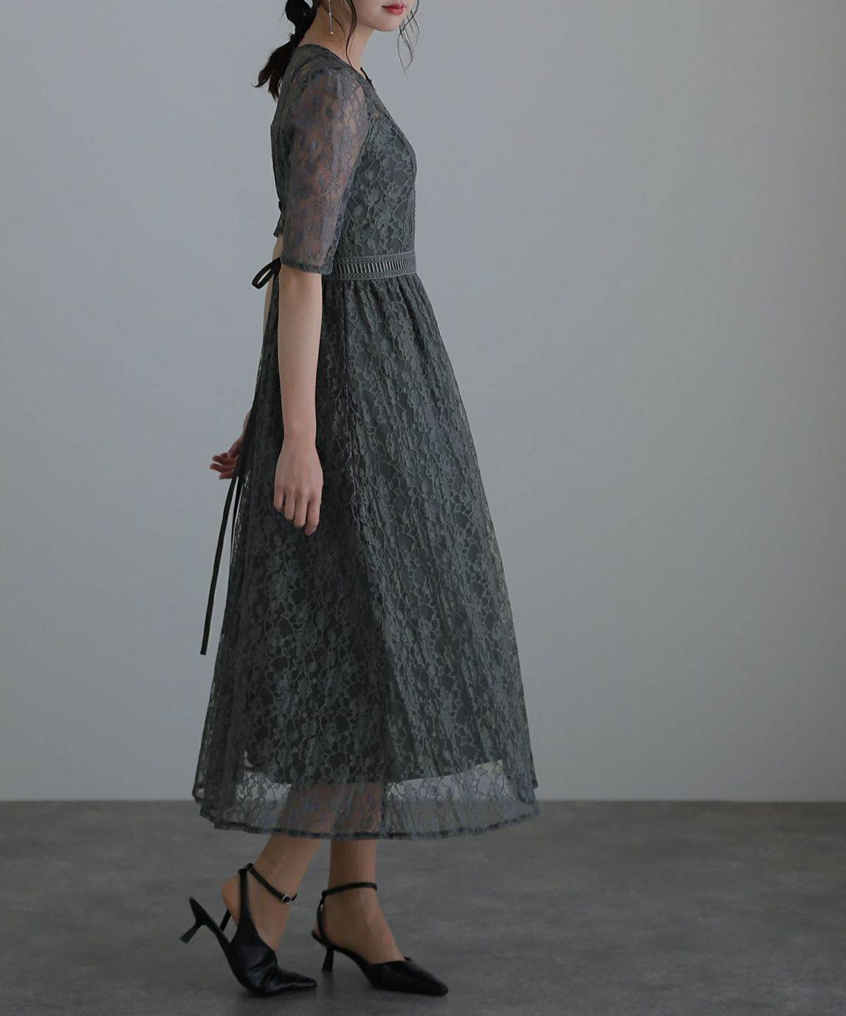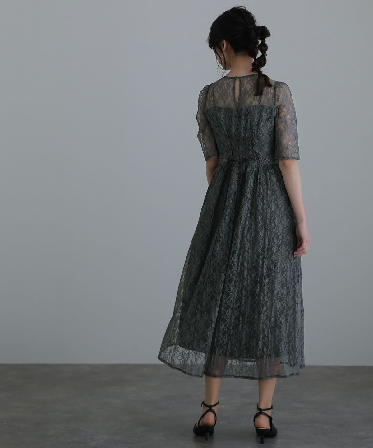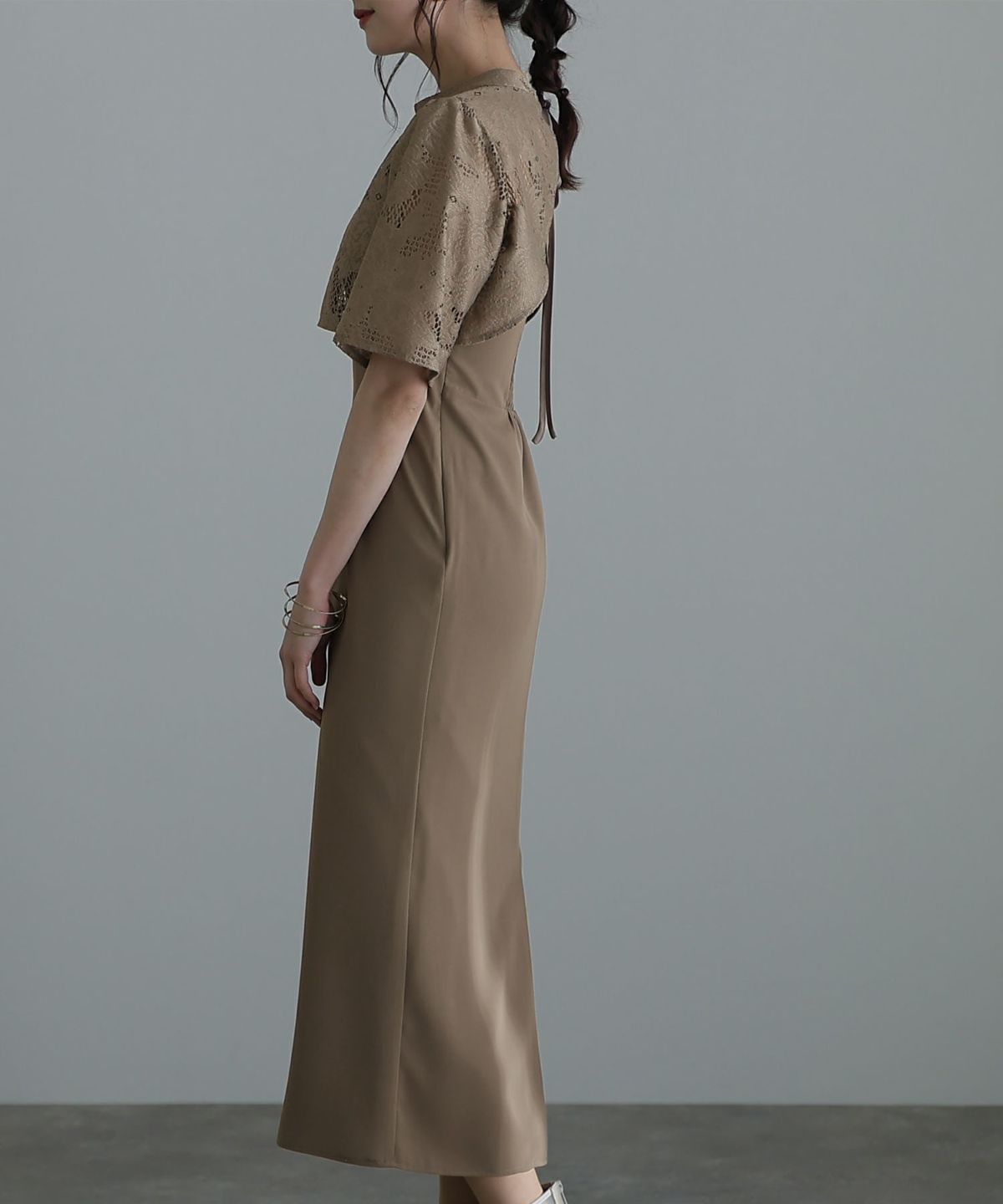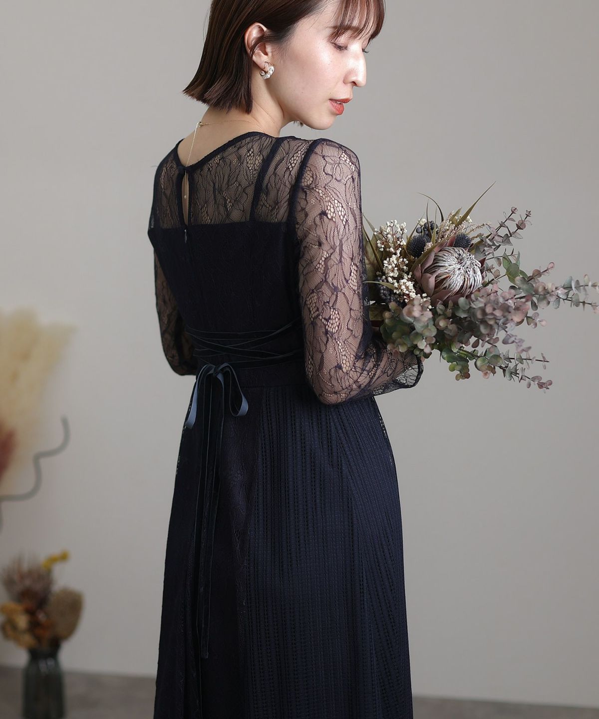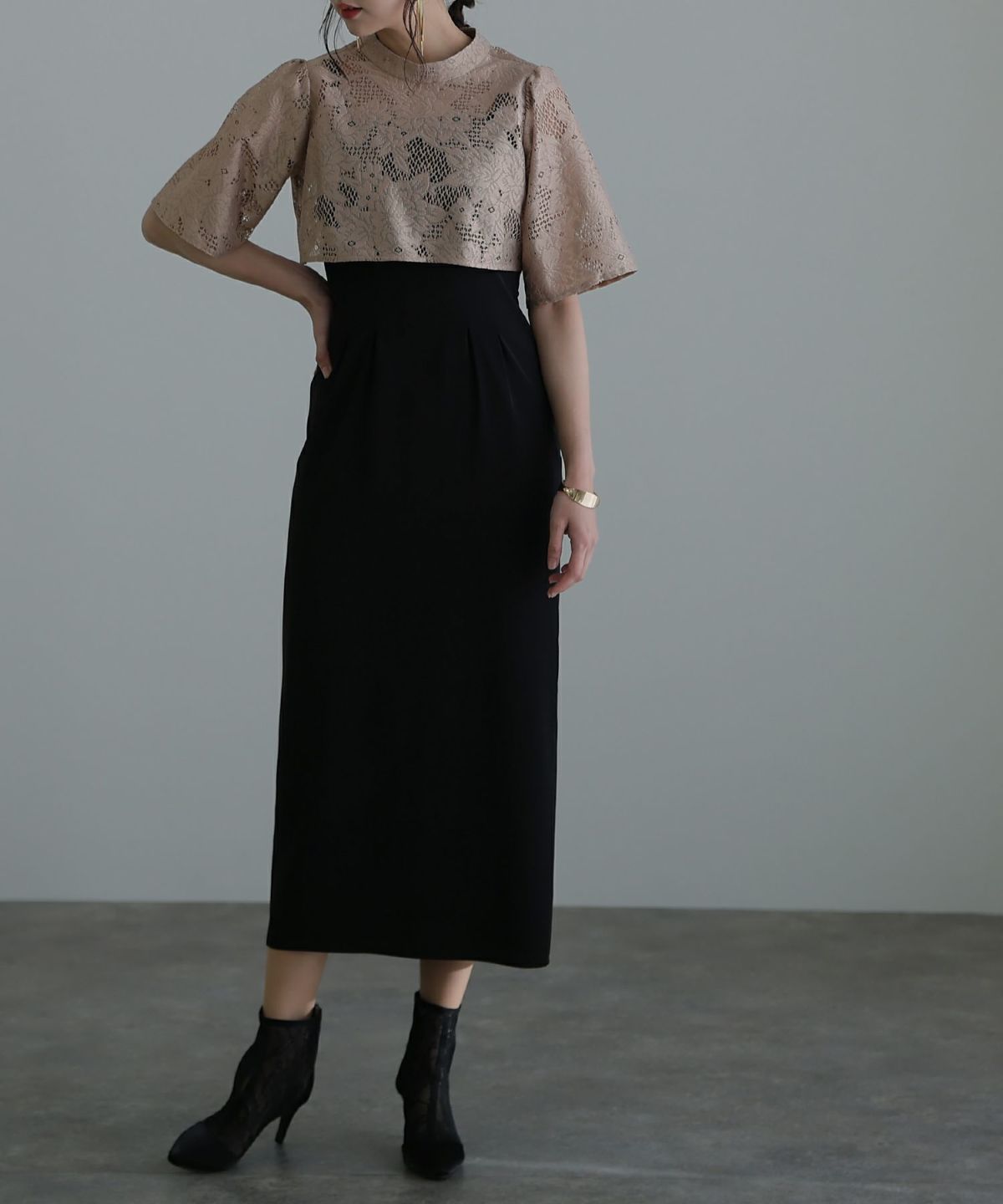 2種類のレースを贅沢に使用したエレガントなドレス 異素材レース切り替えバックレースアップワンピース