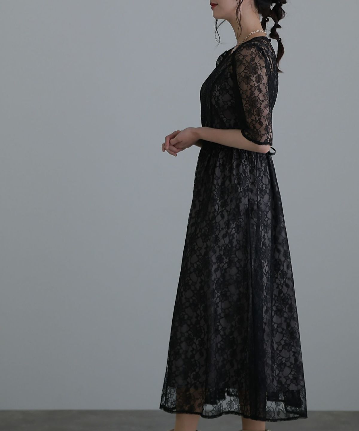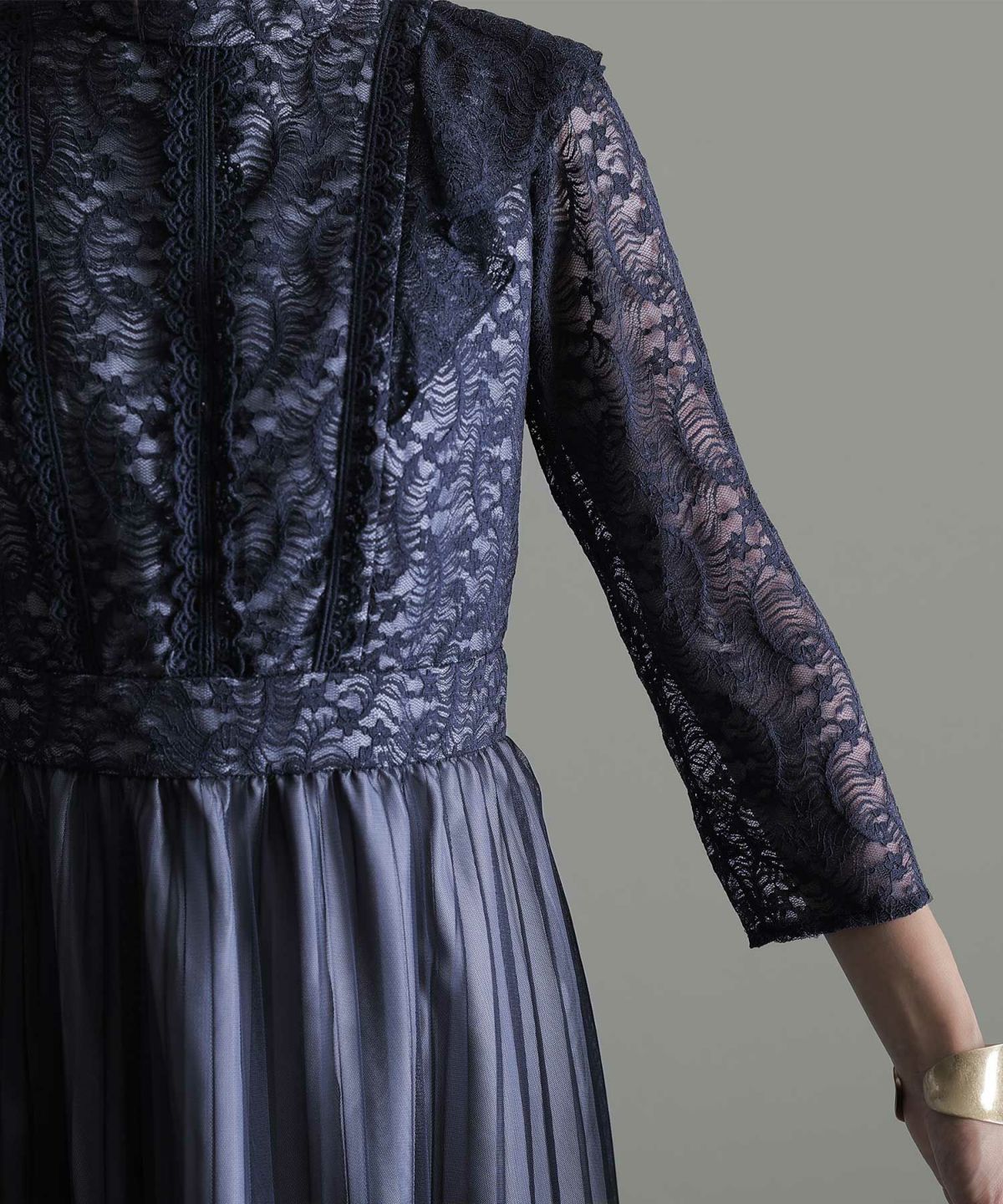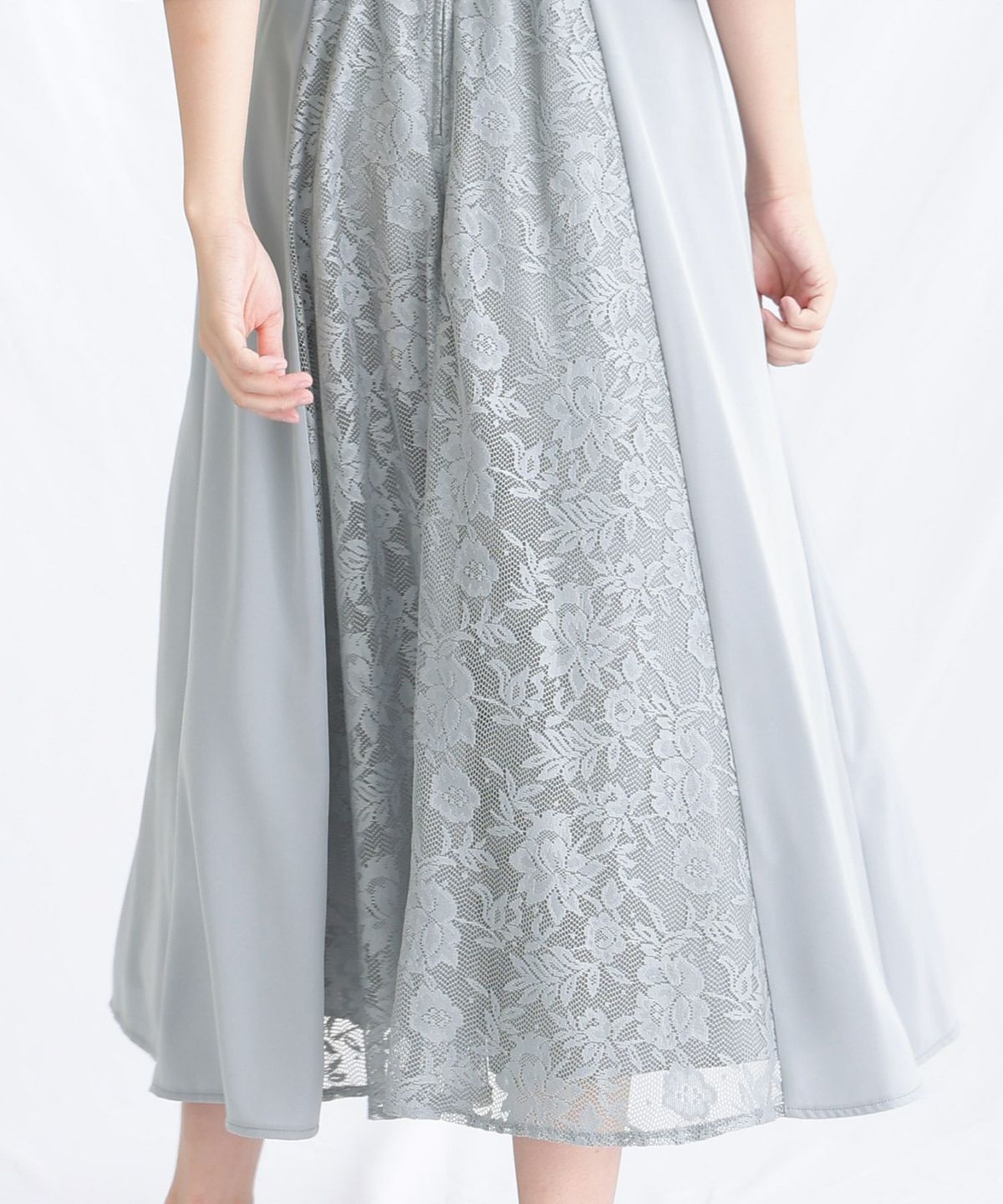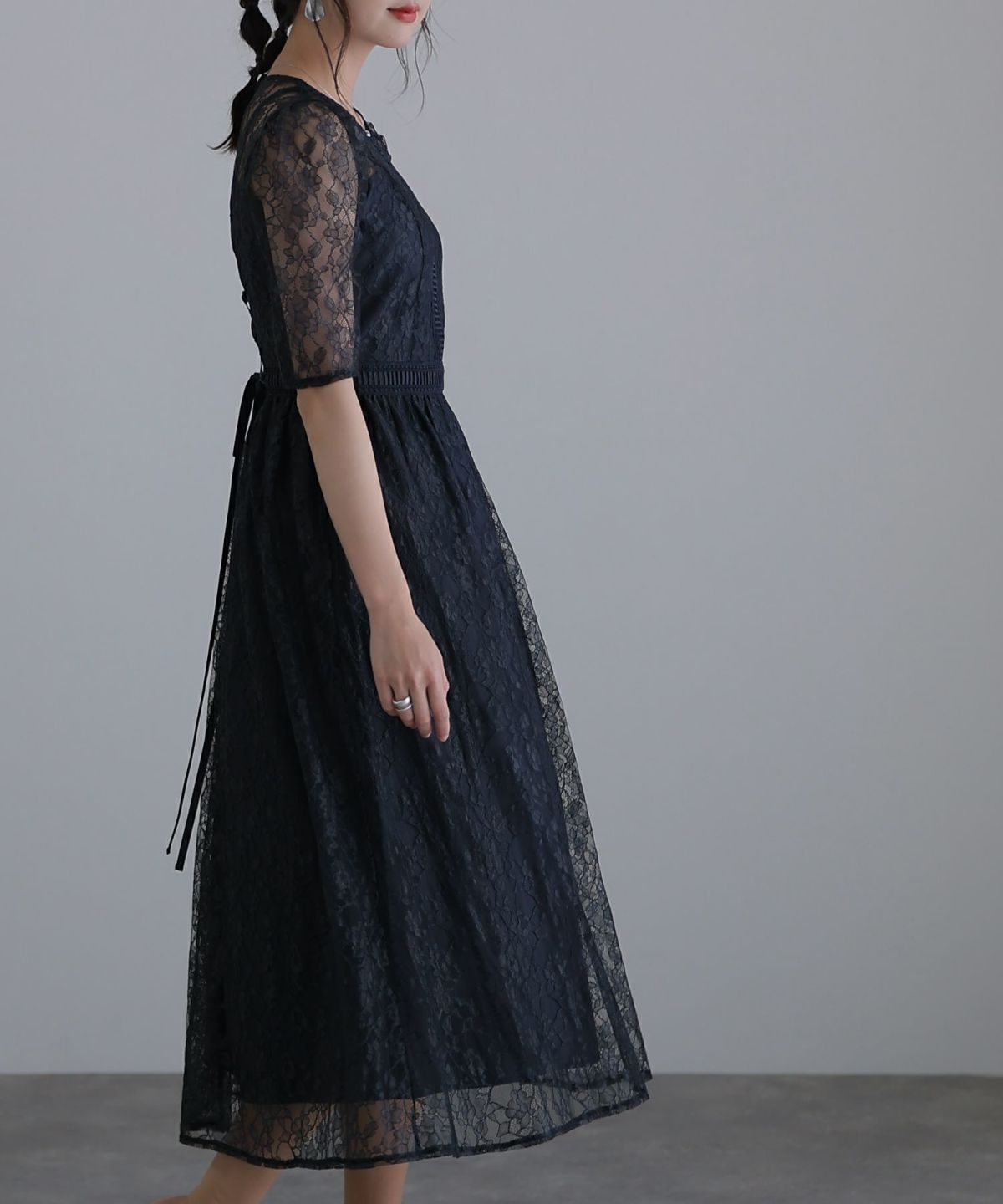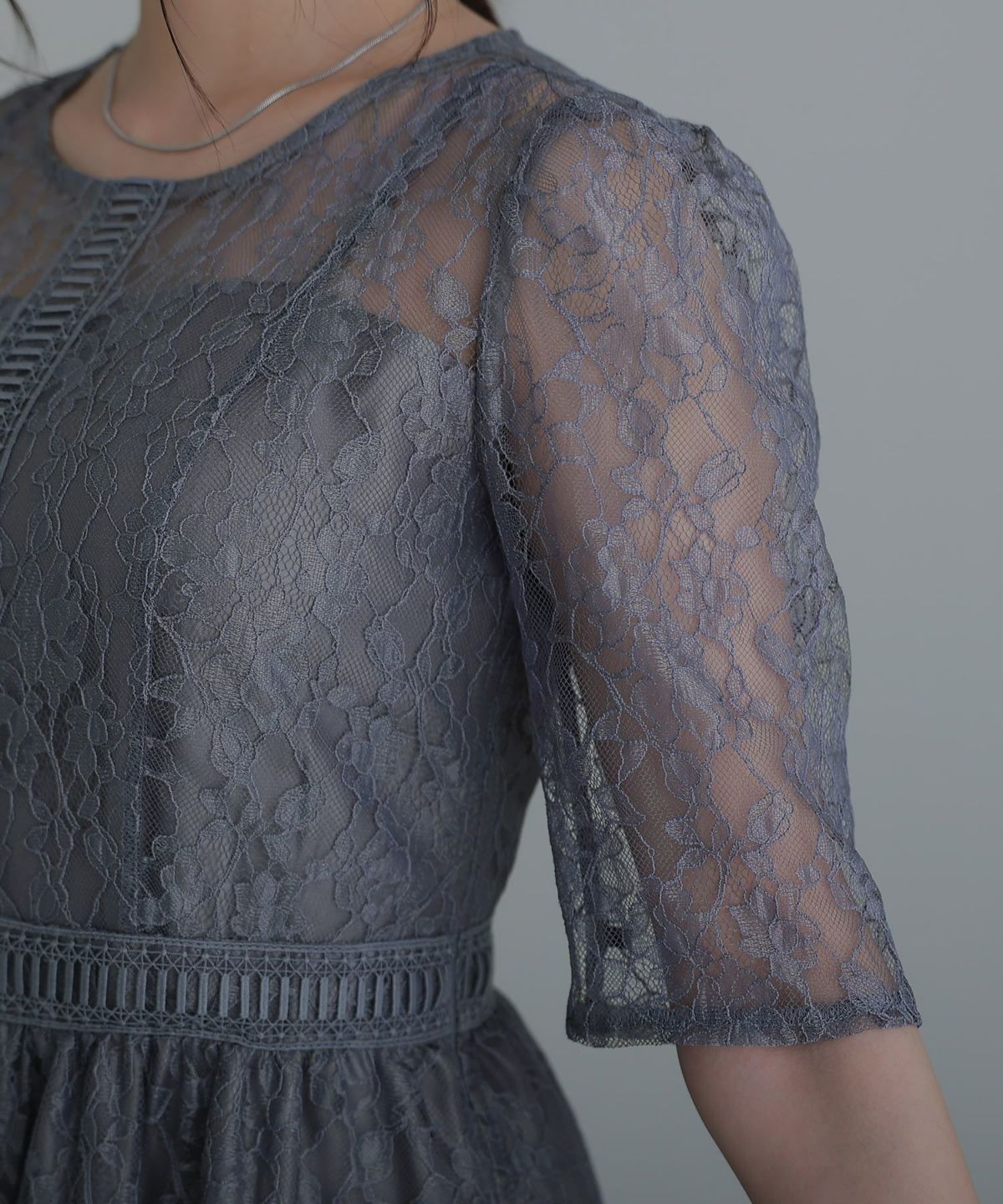 2種類のレースを贅沢に使用したエレガントなドレス 異素材レース切り替えバックレースアップワンピース