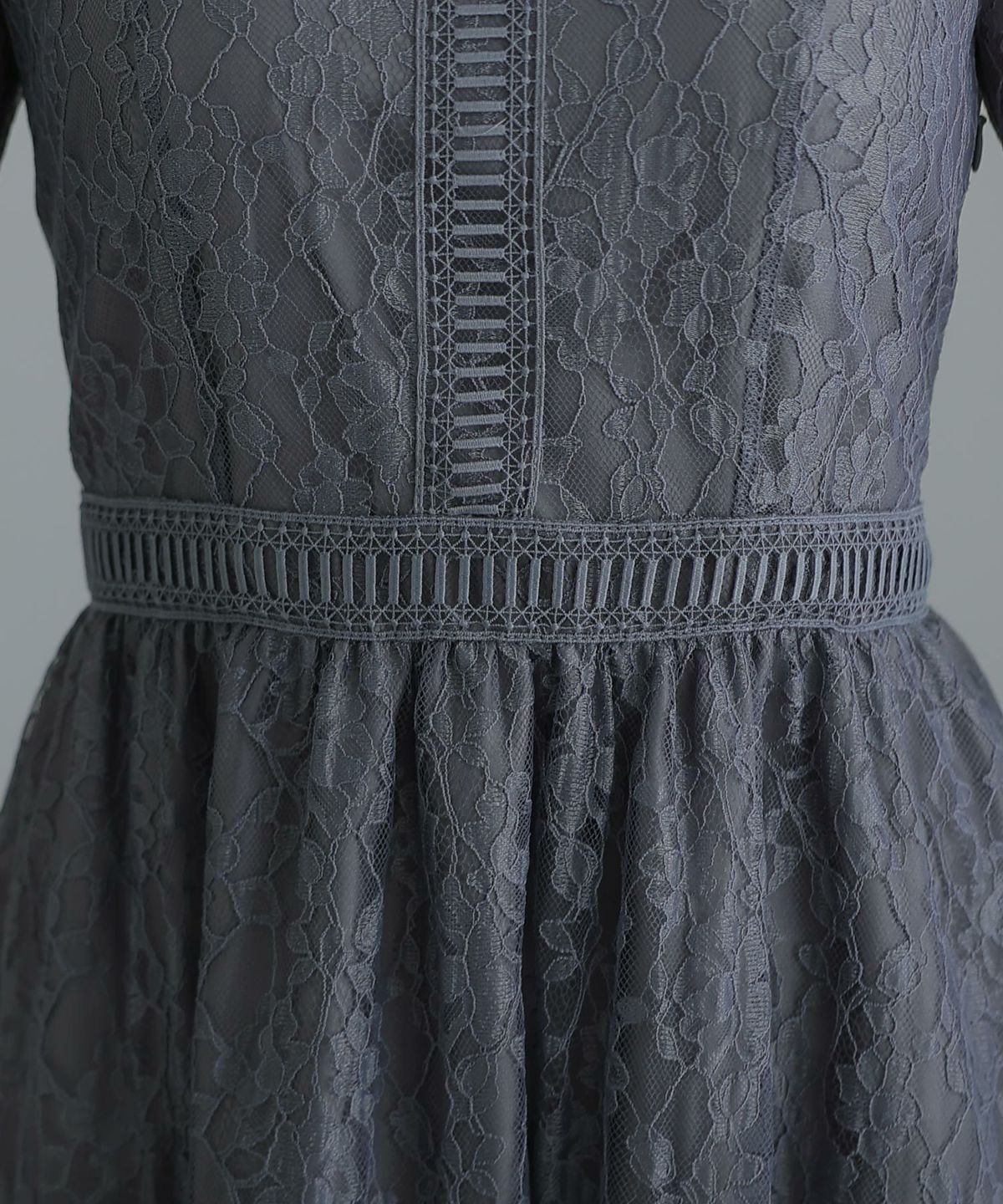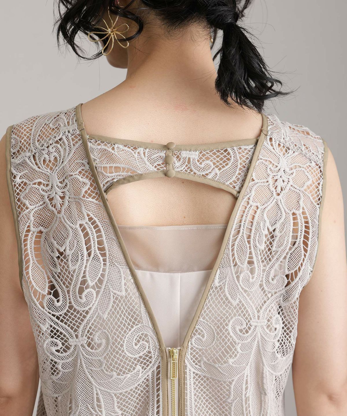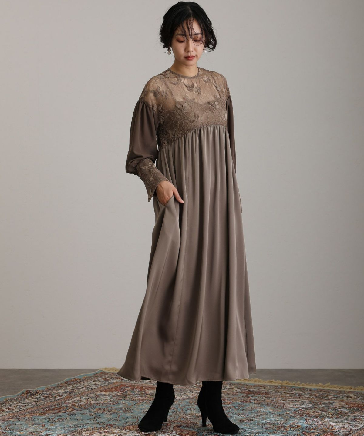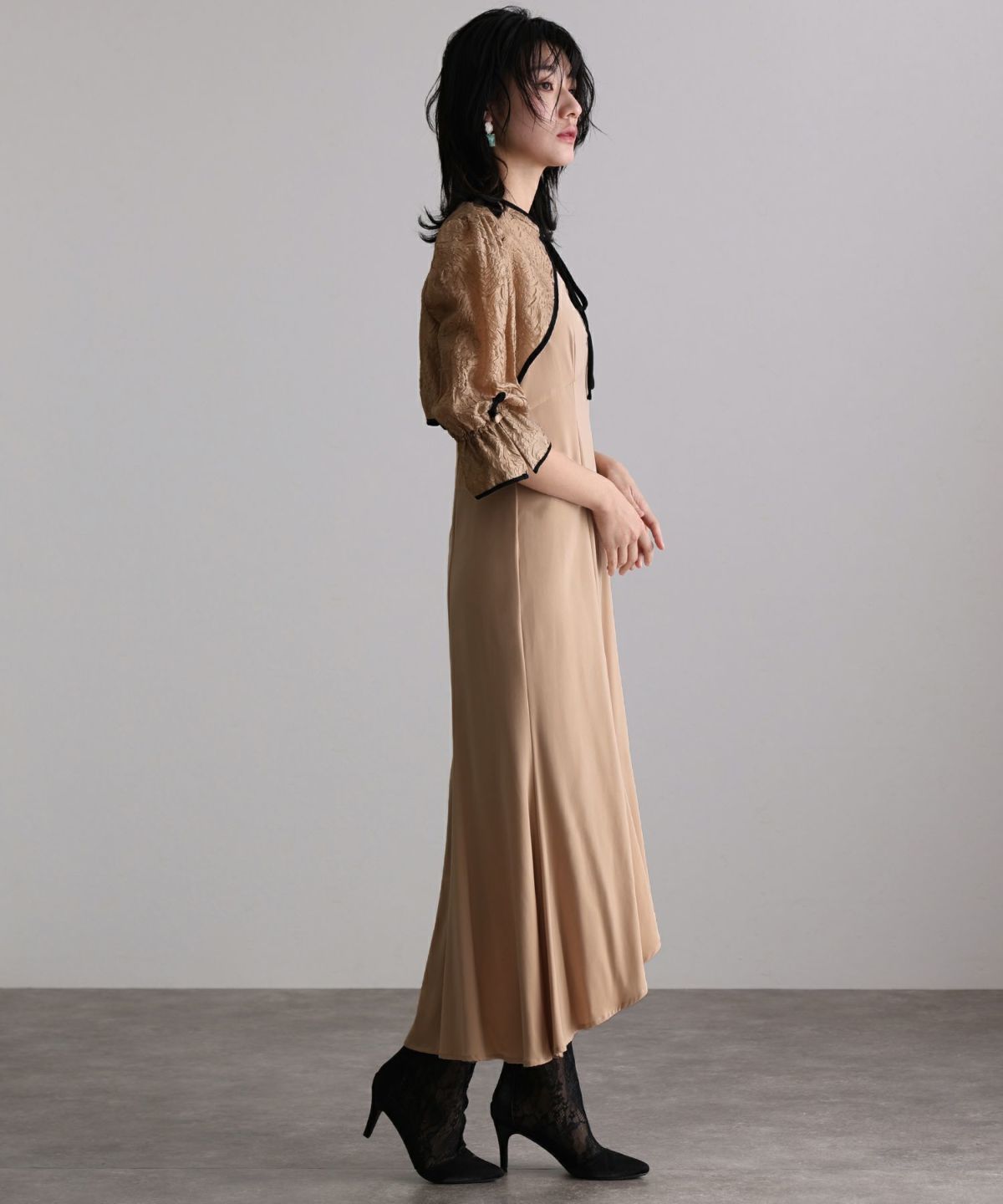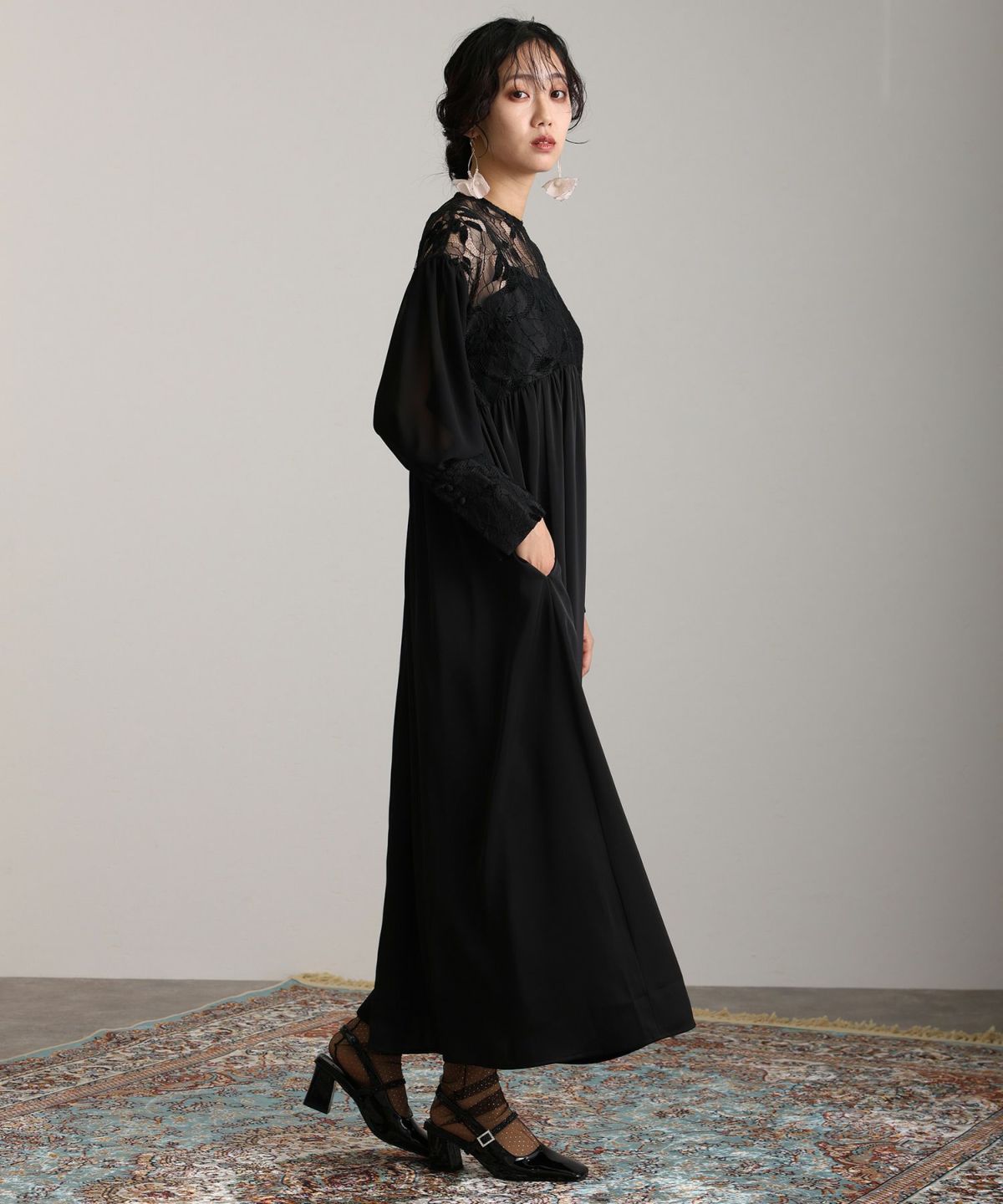 2種類のレースを贅沢に使用したエレガントなドレス 異素材レース切り替えバックレースアップワンピース