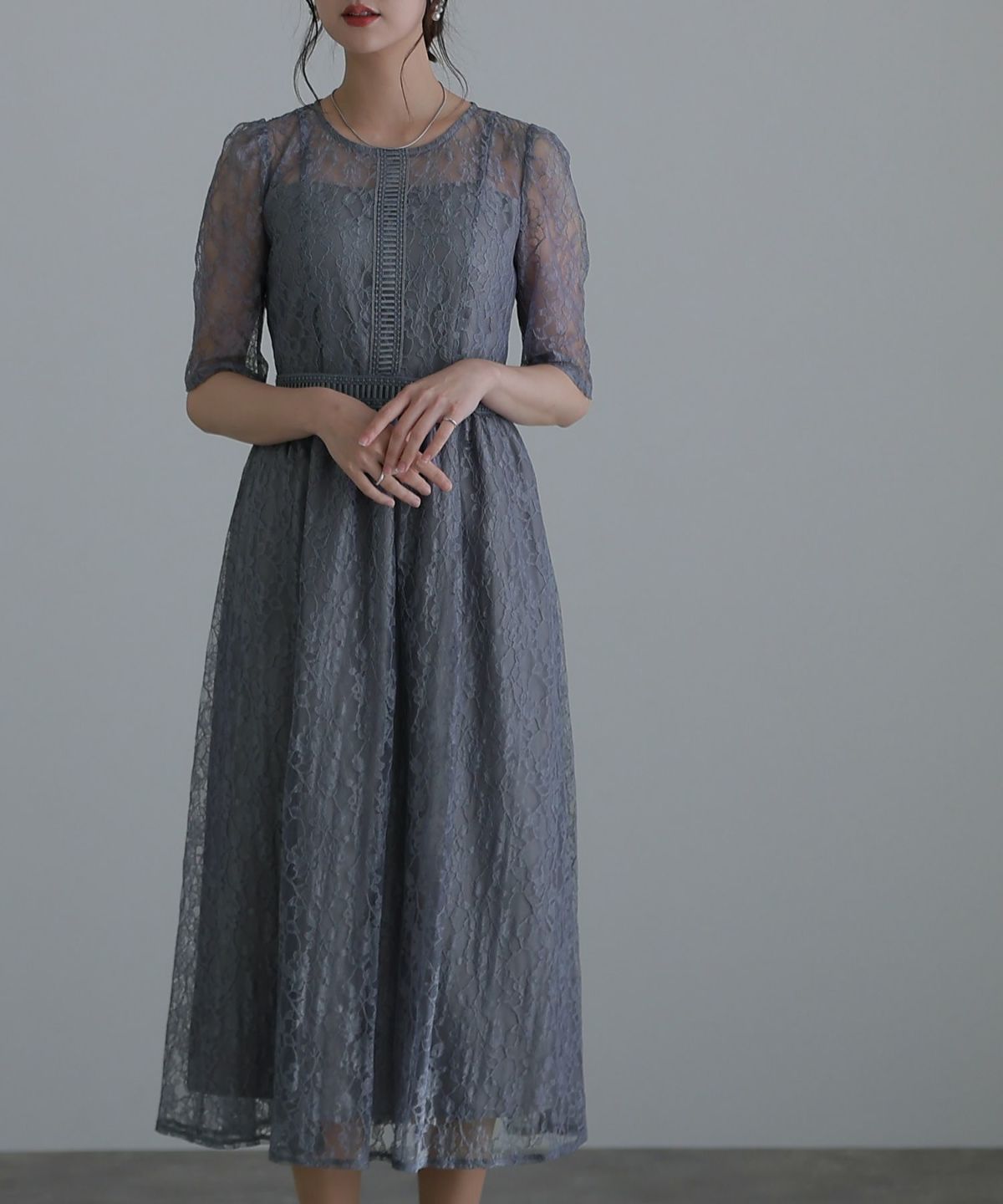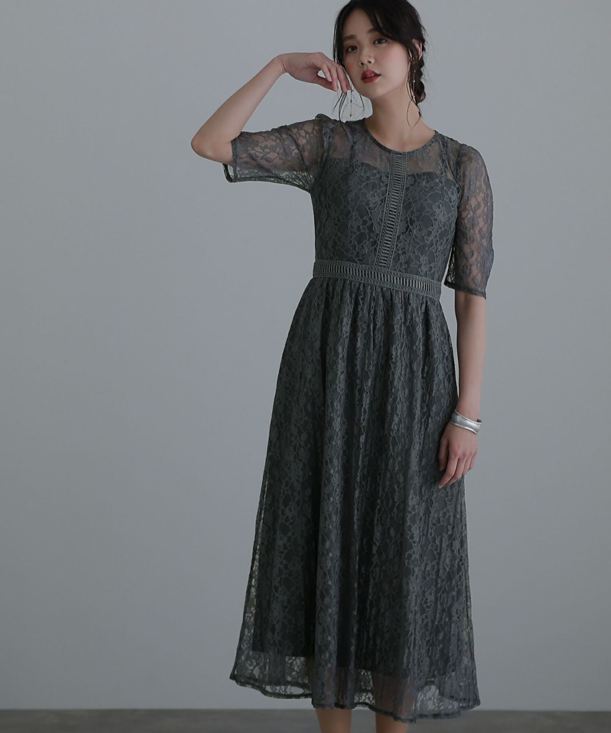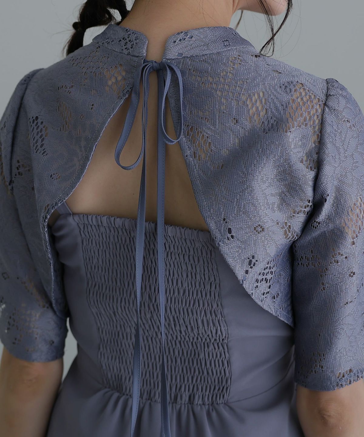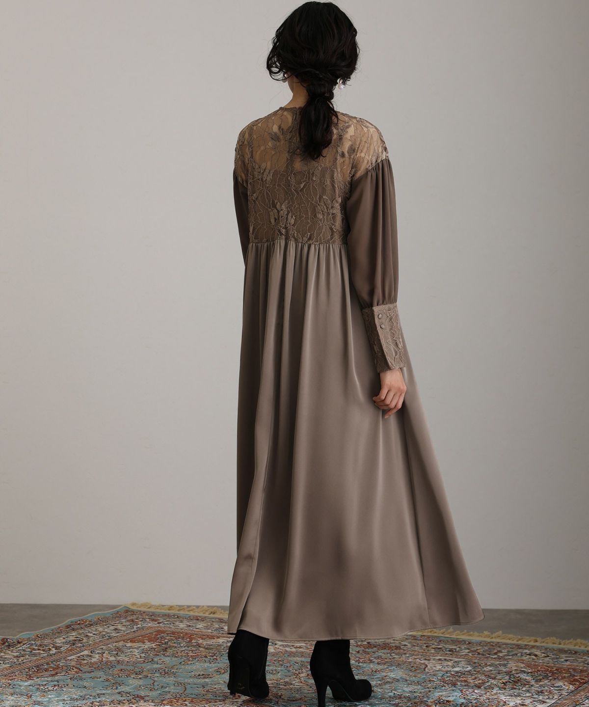 2種類のレースを贅沢に使用したエレガントなドレス 異素材レース切り替えバックレースアップワンピース
