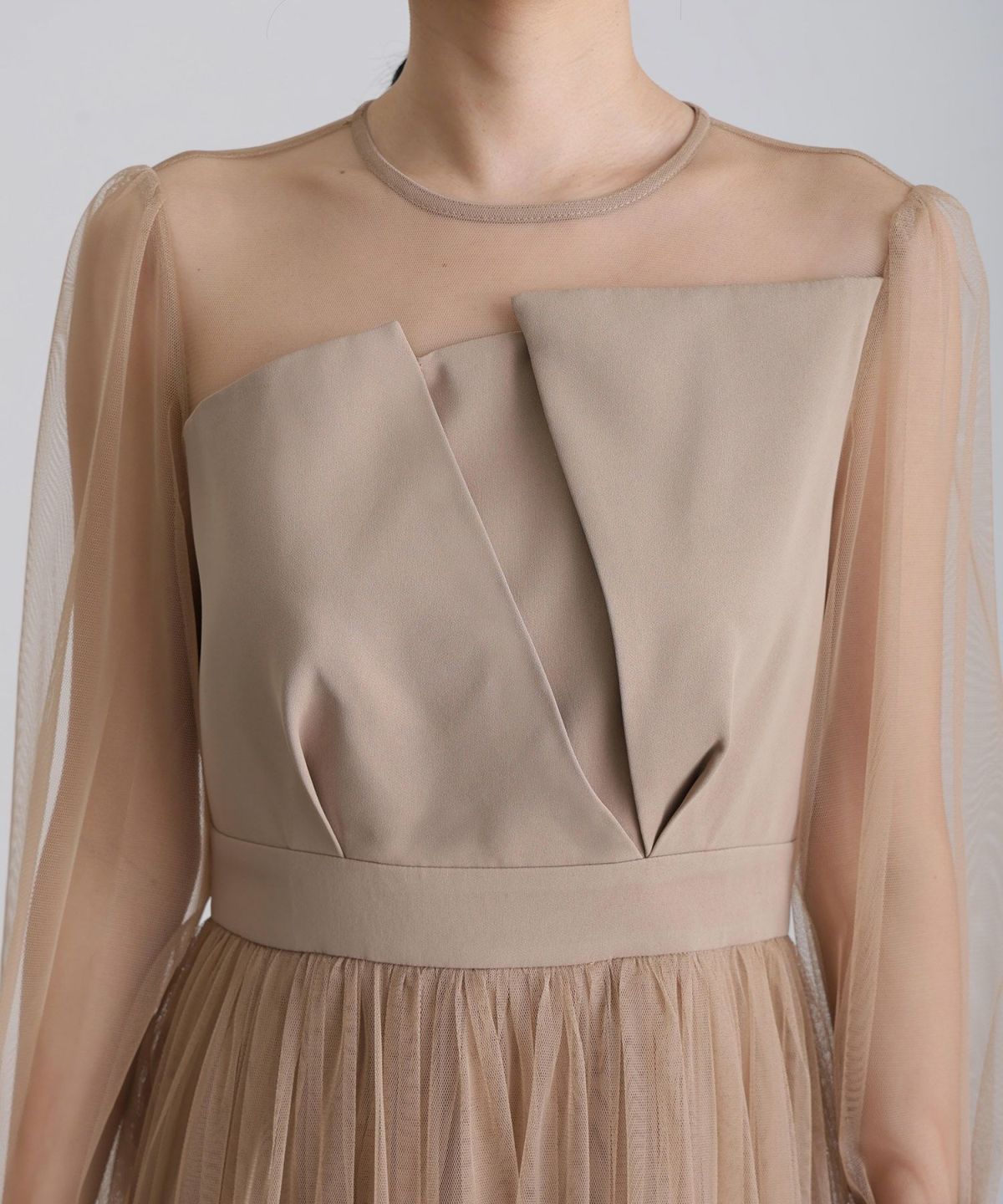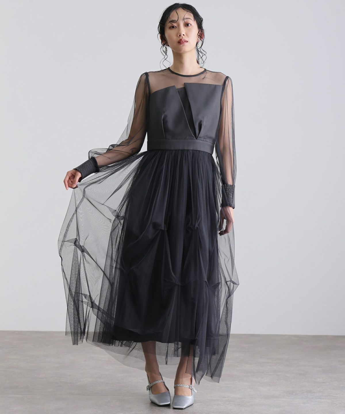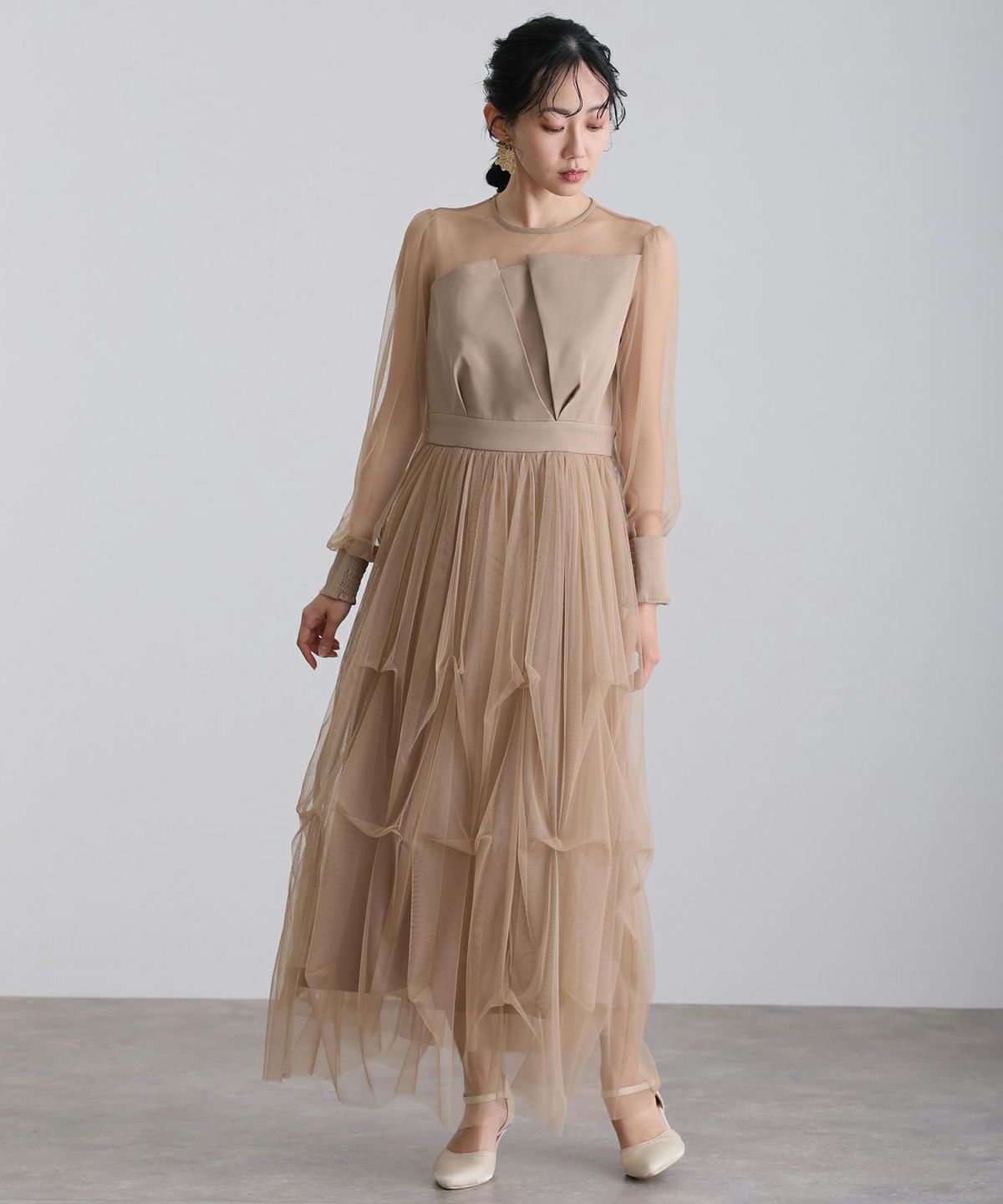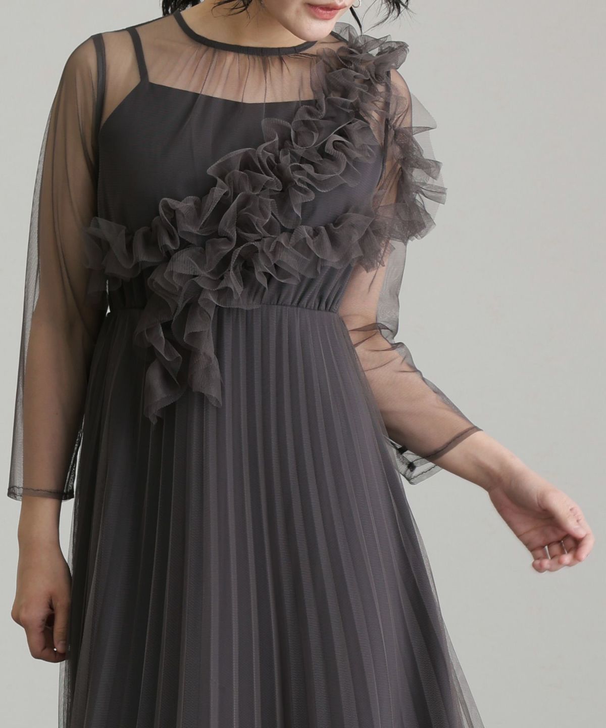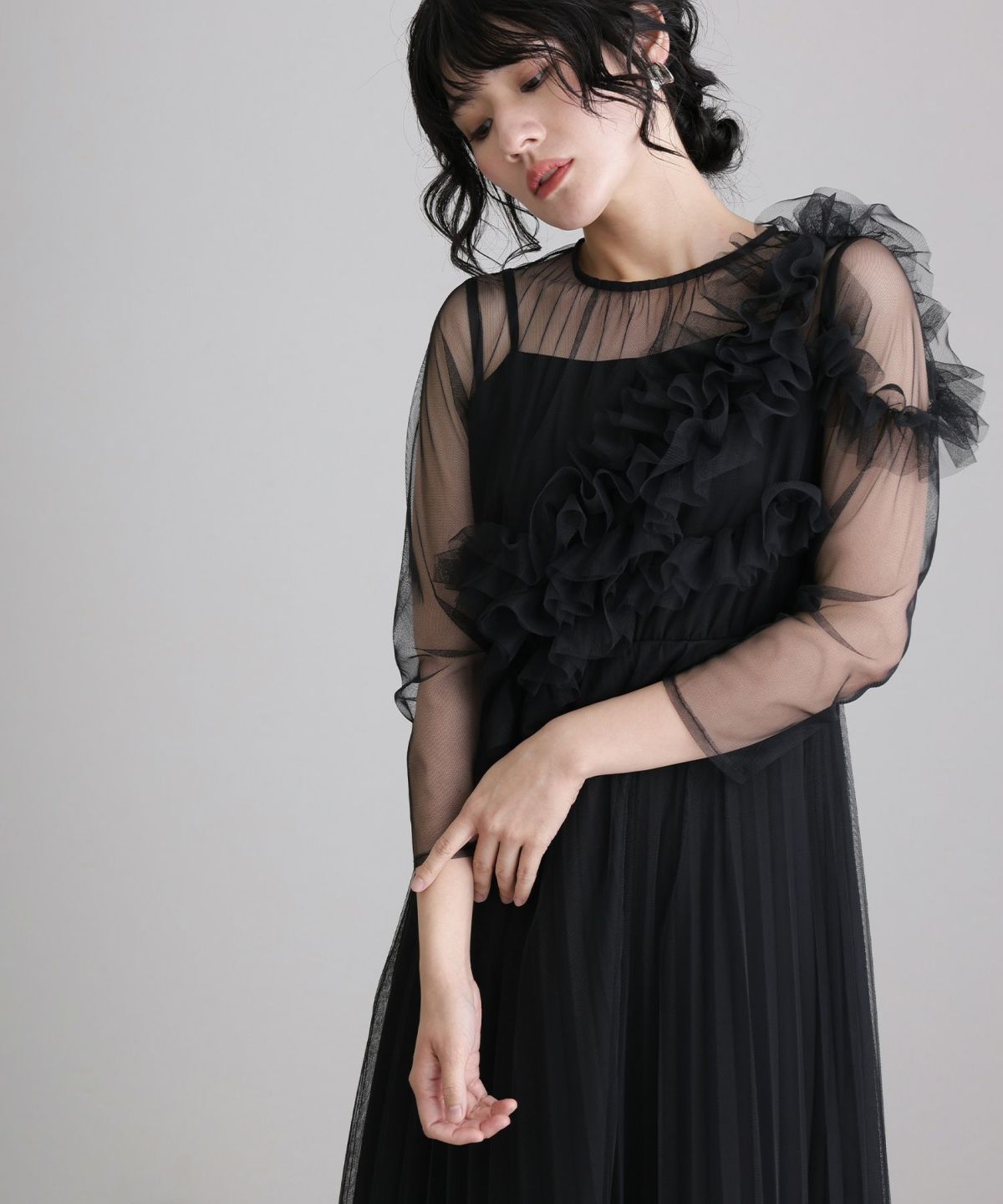 ギャザーチュールの透け感が可愛らしい ギャザーチュール&プリーツドレス