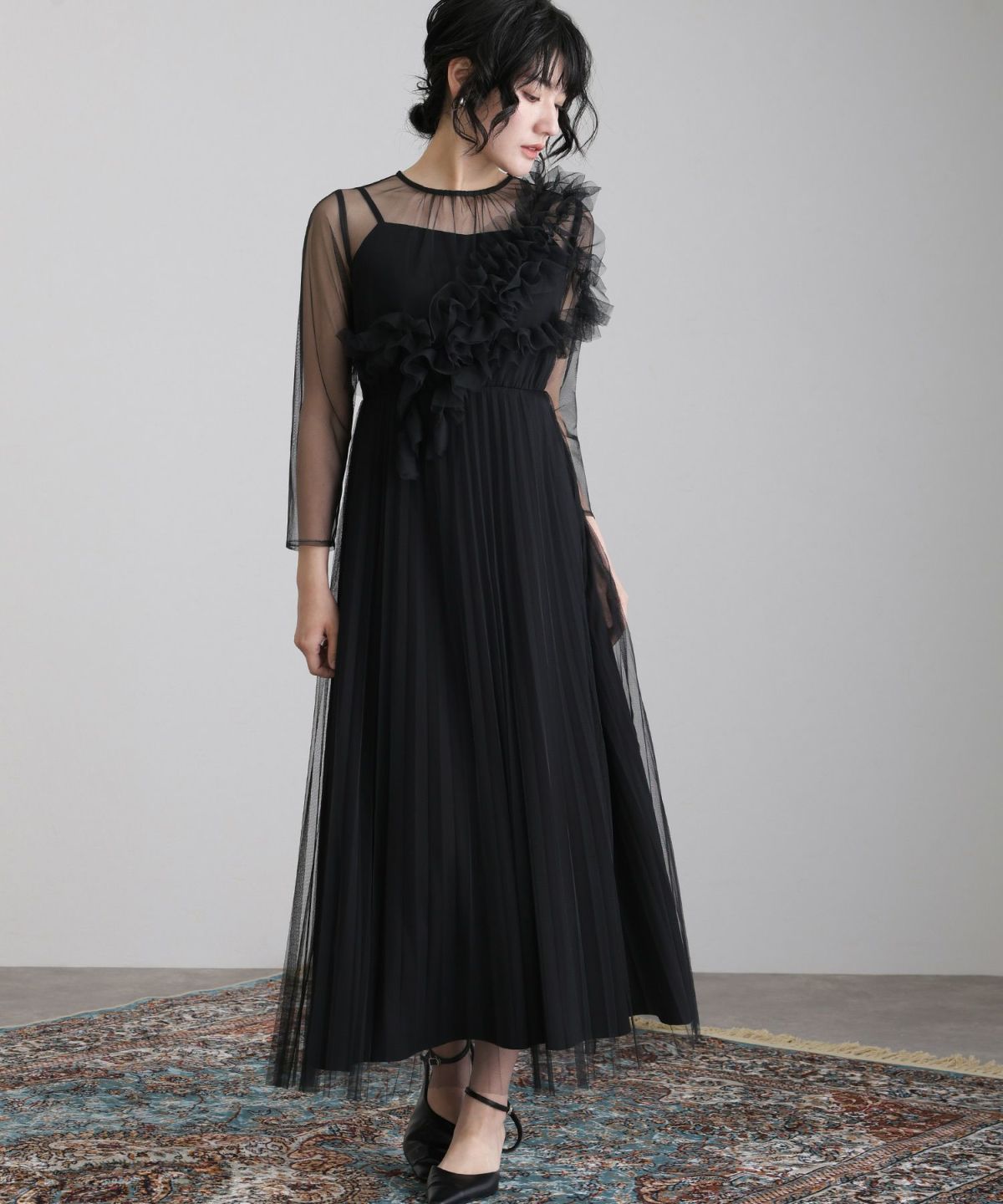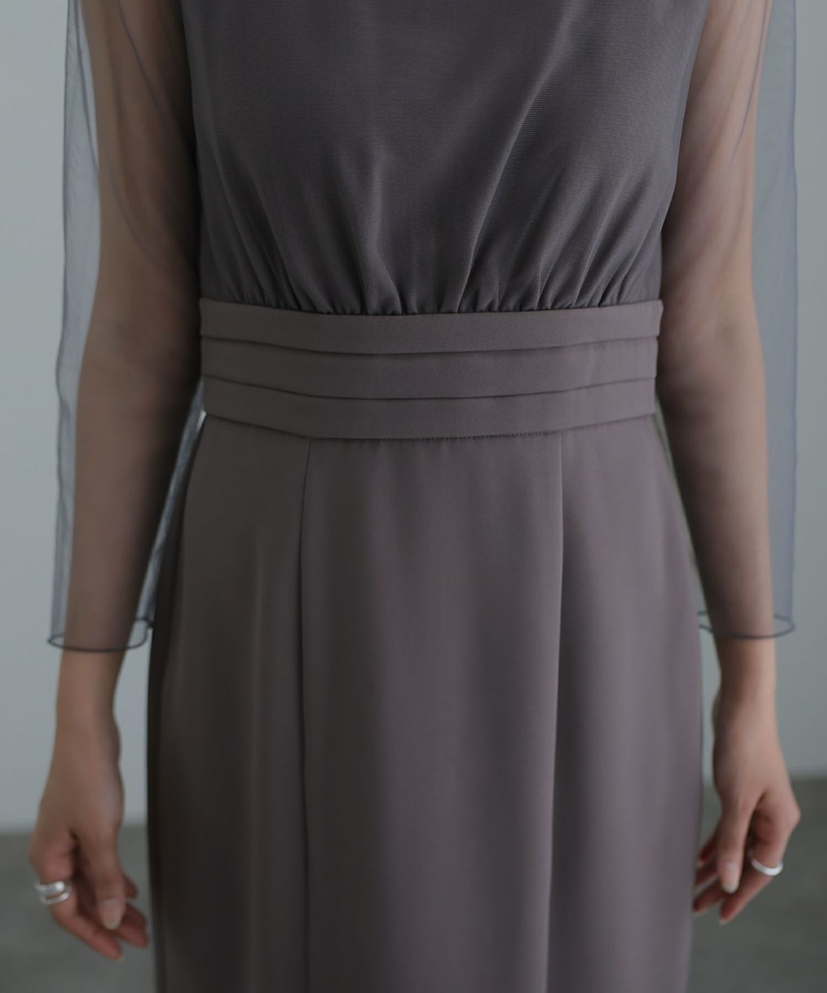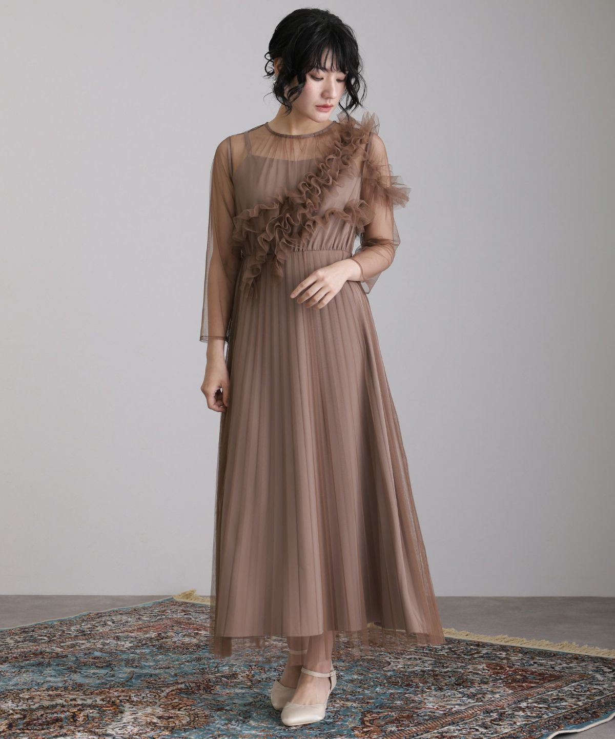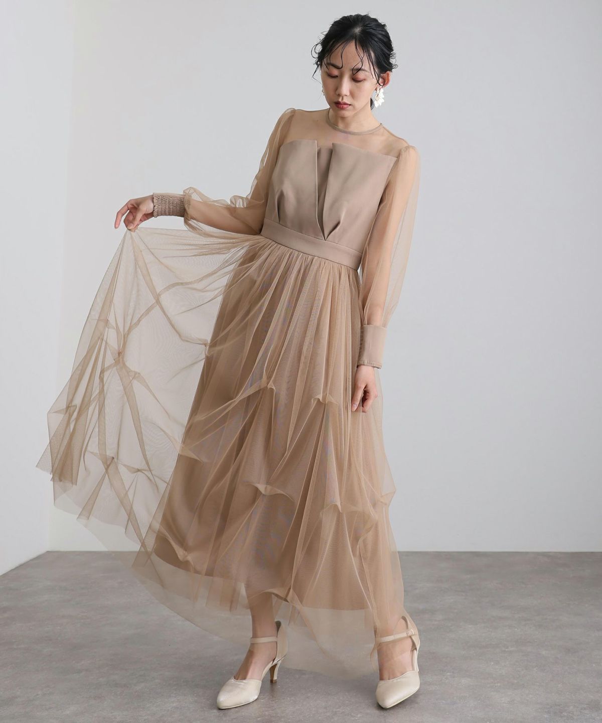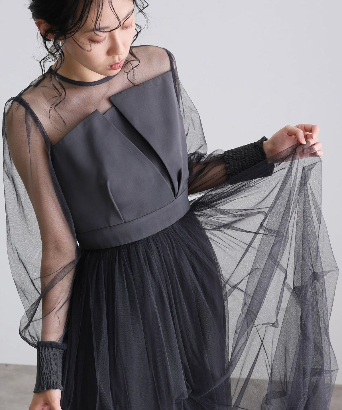 ギャザーチュールの透け感が可愛らしい ギャザーチュール&プリーツドレス