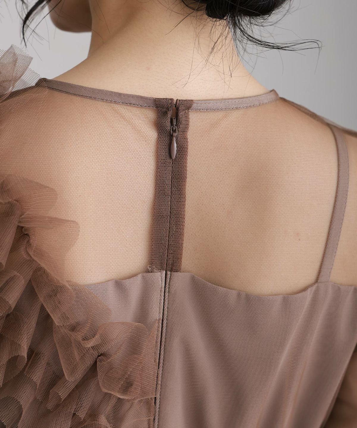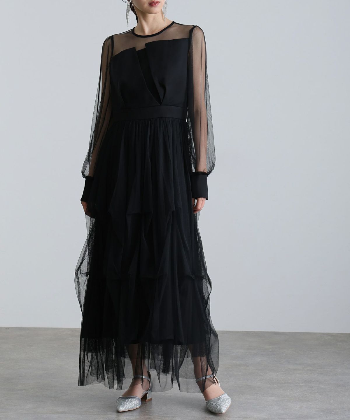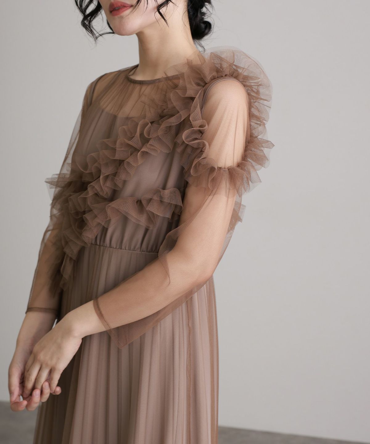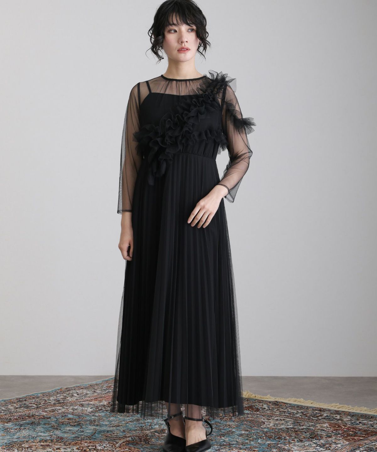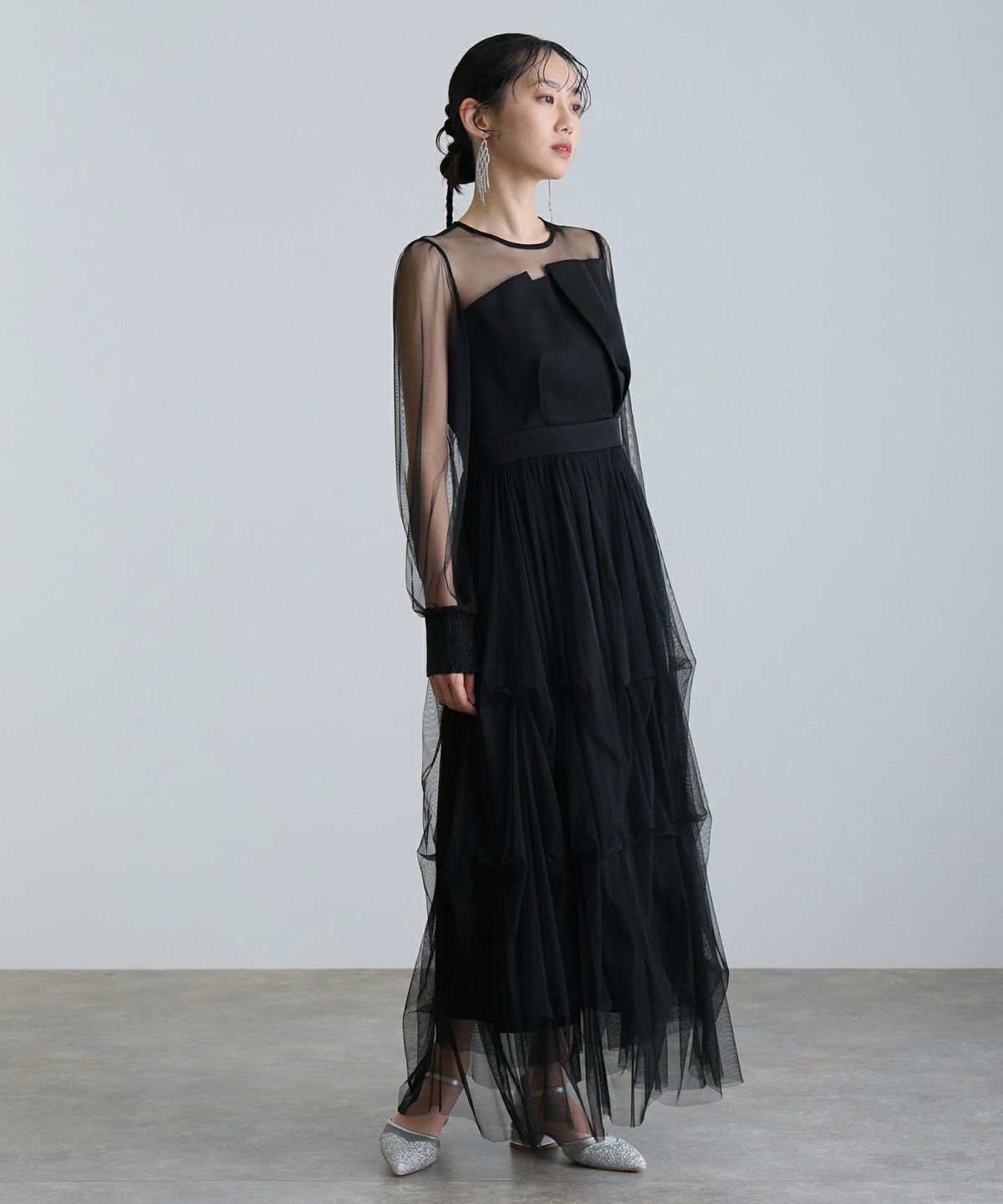 ギャザーチュールの透け感が可愛らしい ギャザーチュール&プリーツドレス