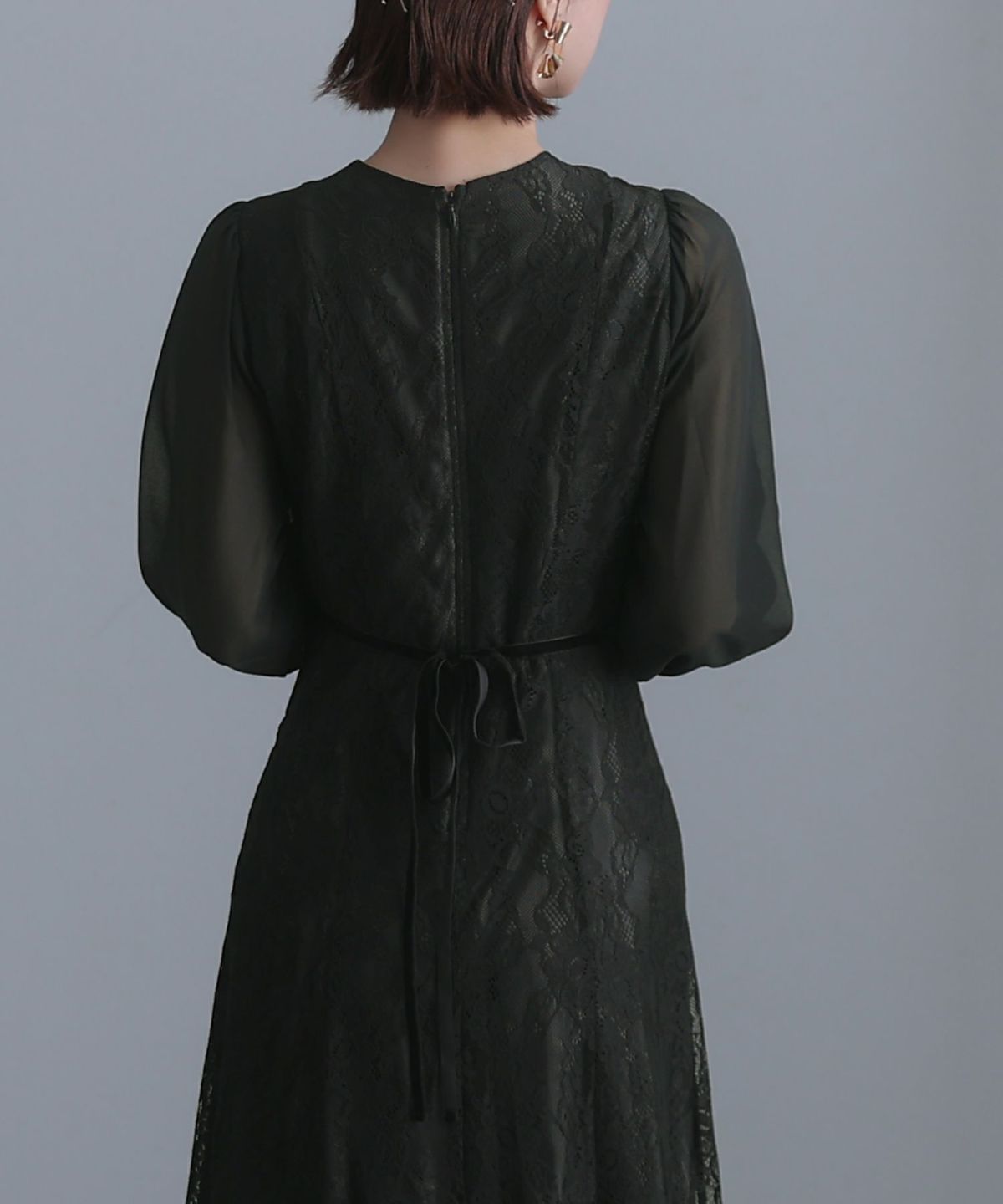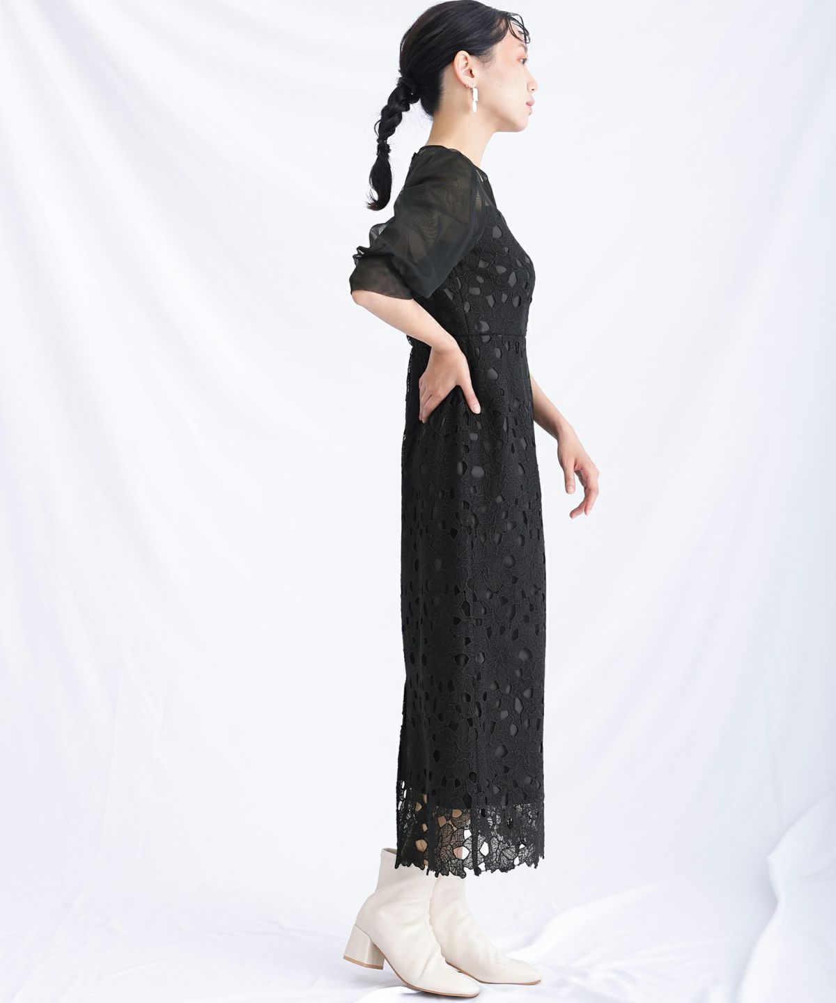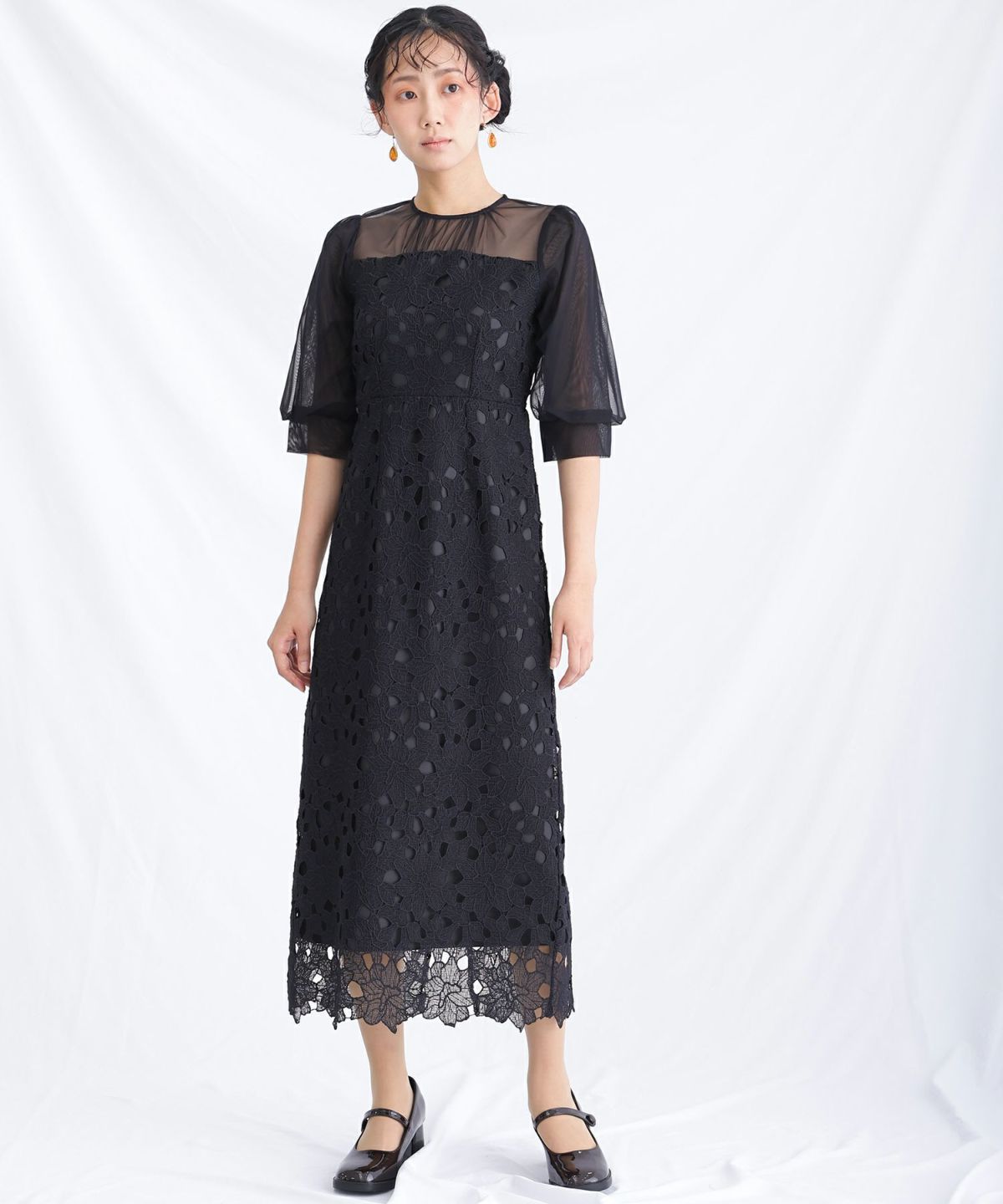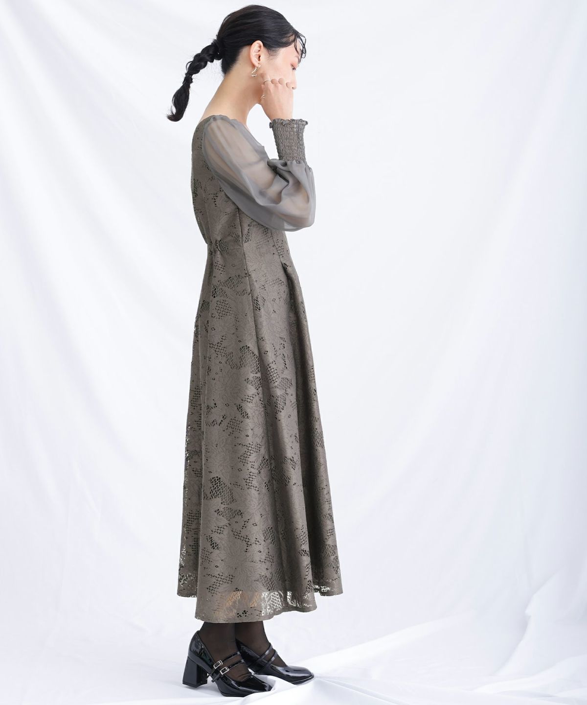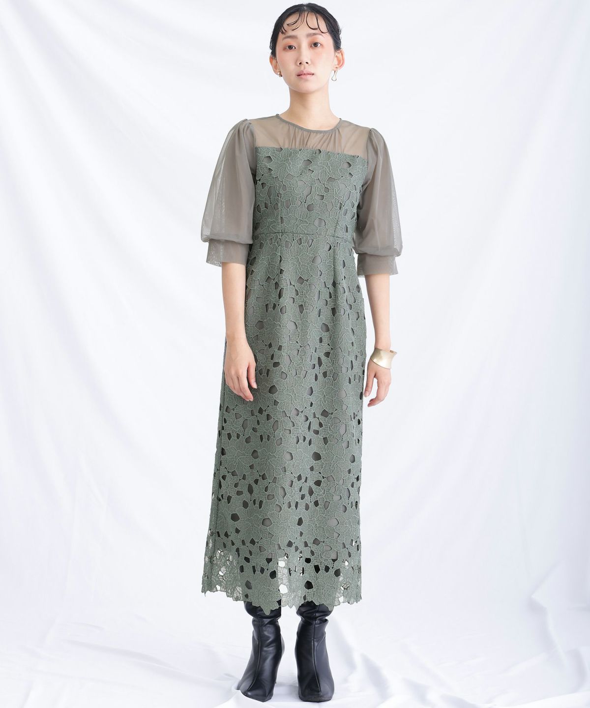 ボリューム感のあるカフス付き袖がデザインポイント フロッキーレースワンピース