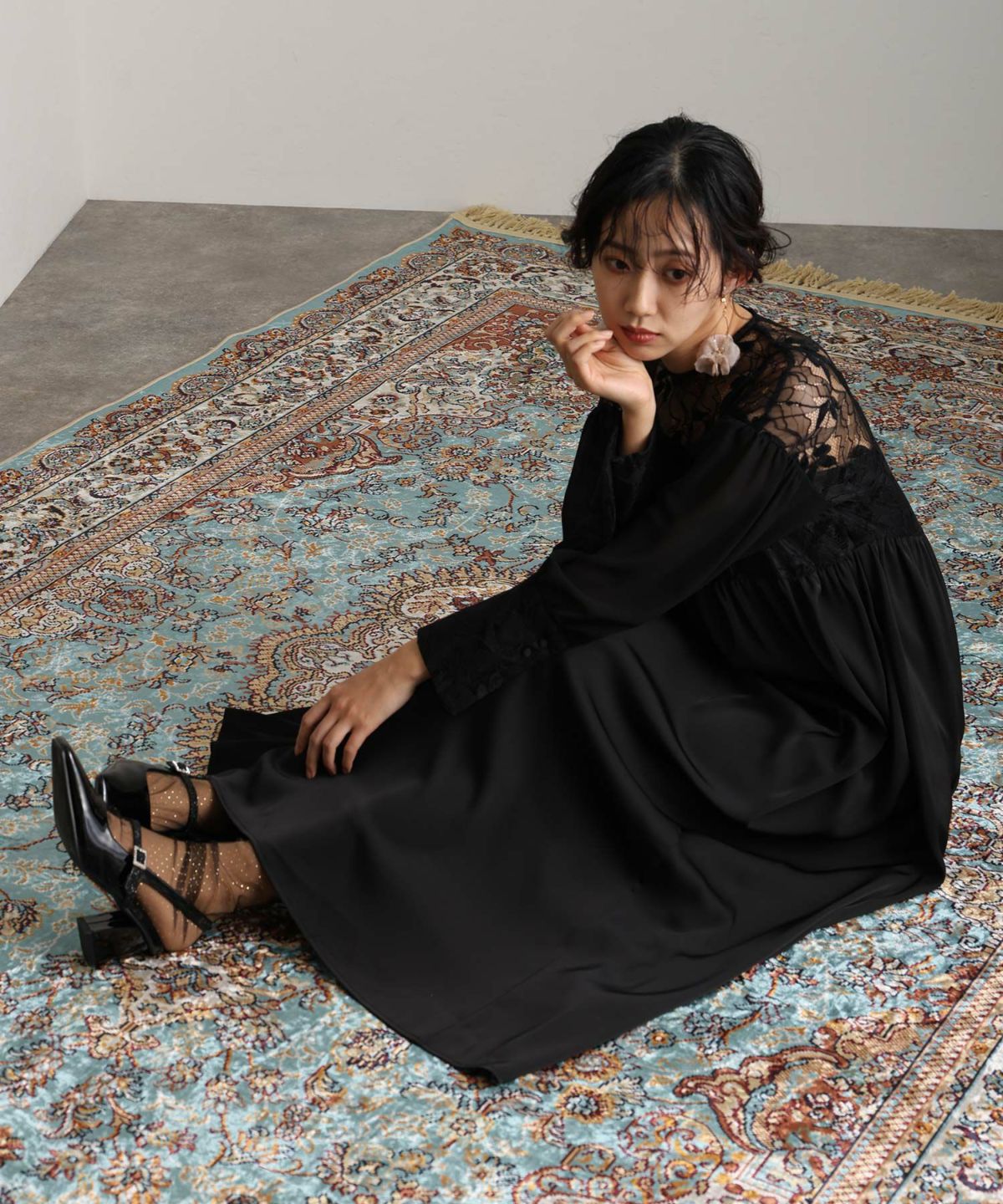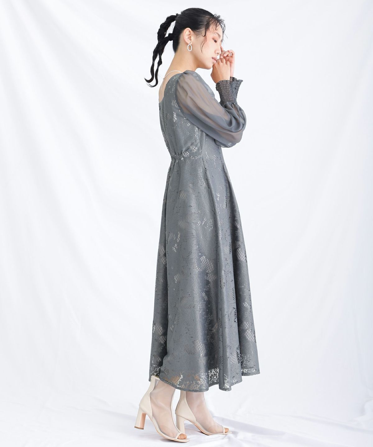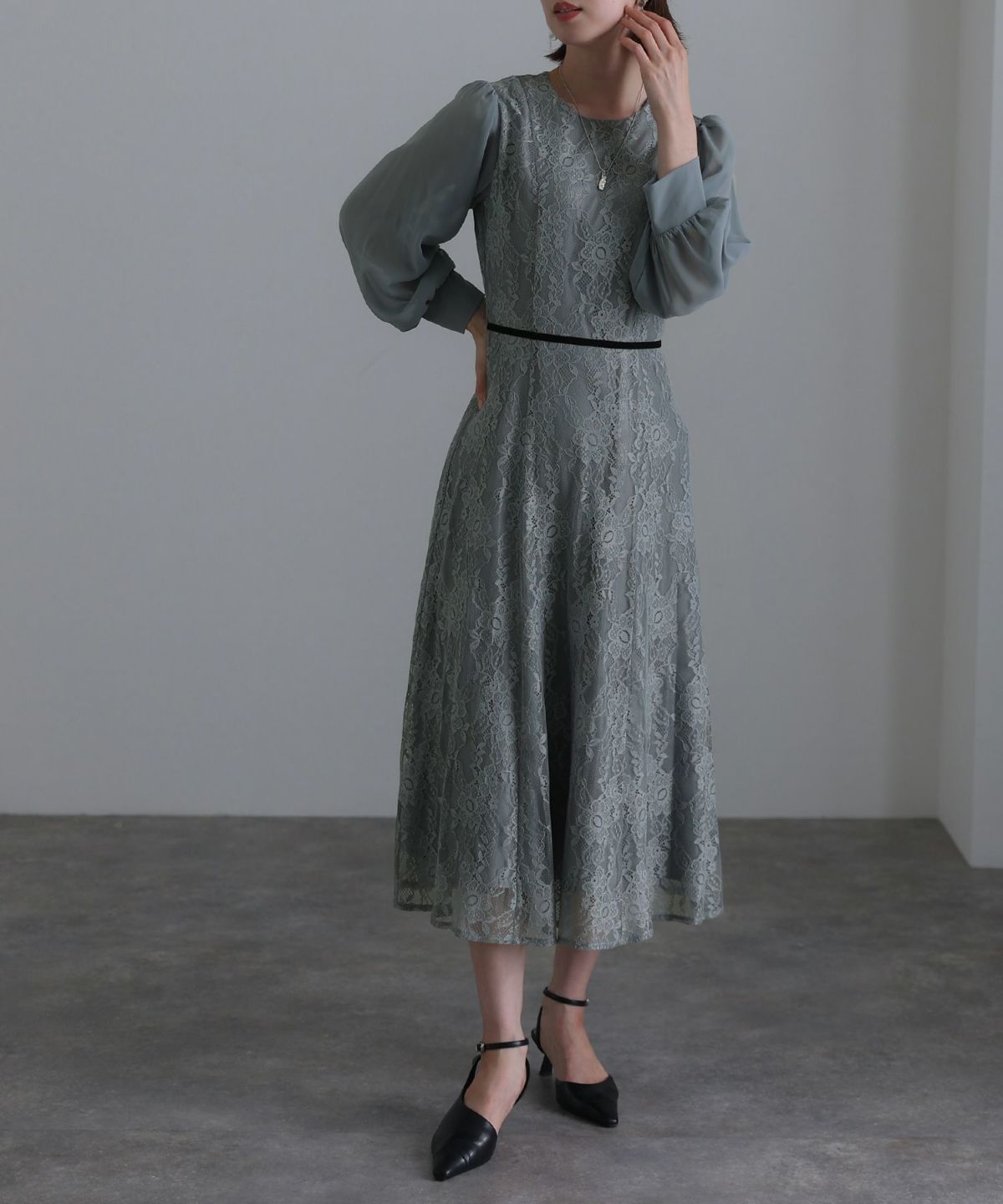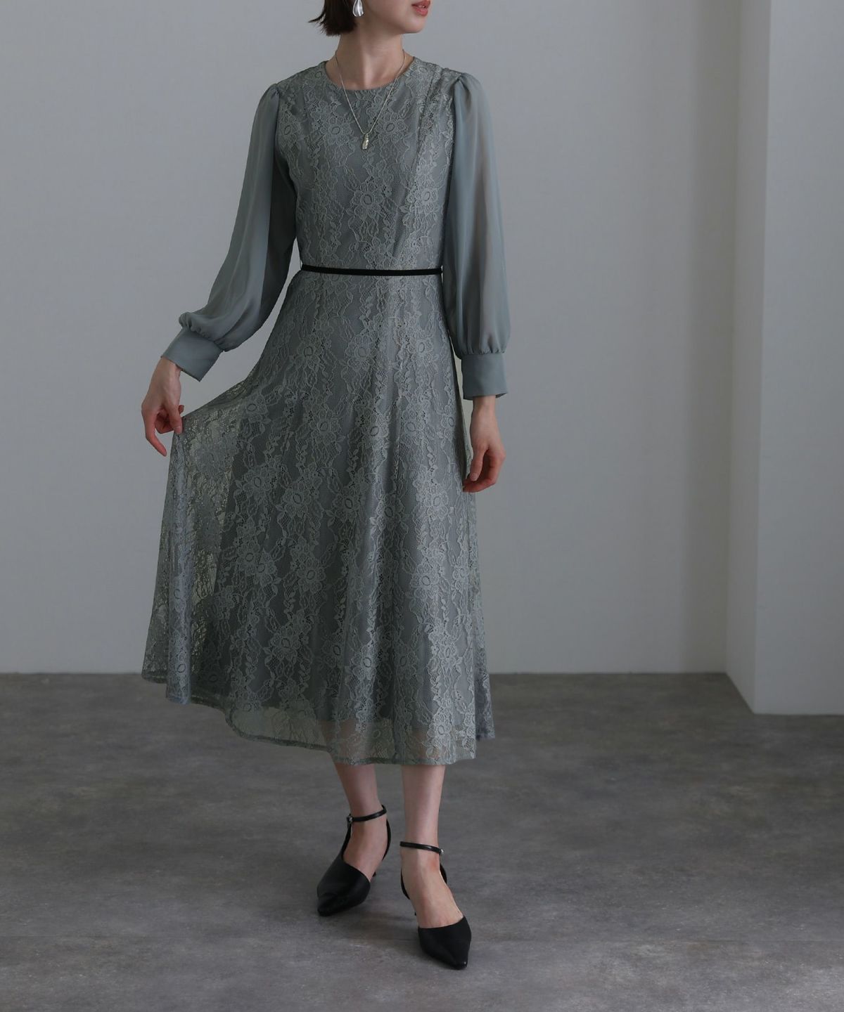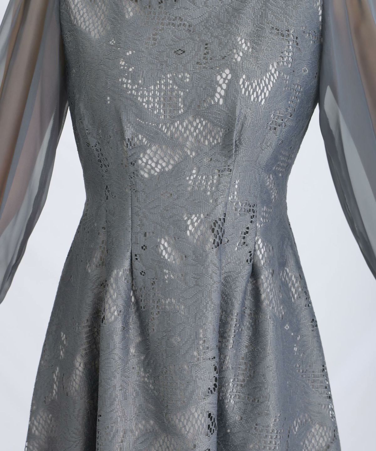ボリューム感のあるカフス付き袖がデザインポイント フロッキーレースワンピース