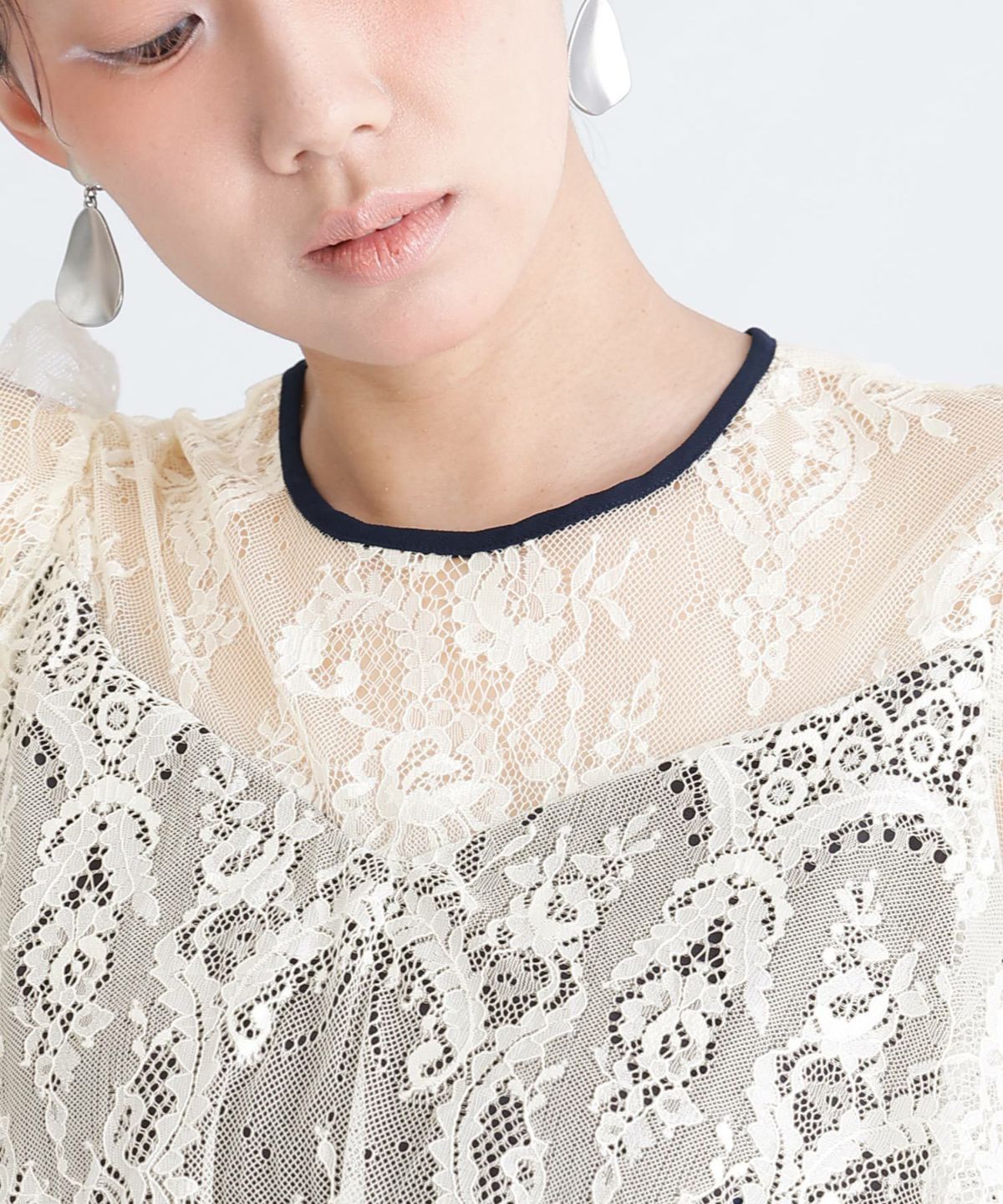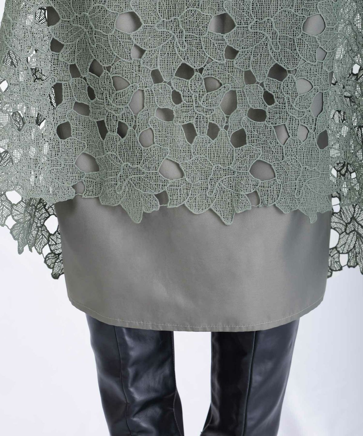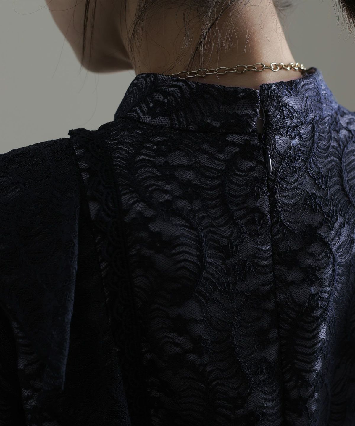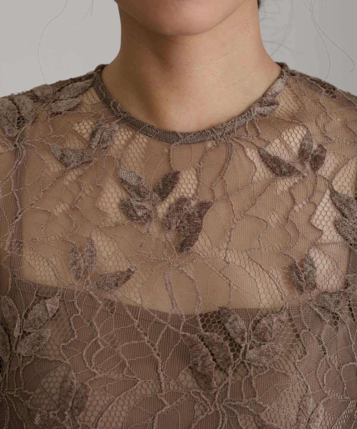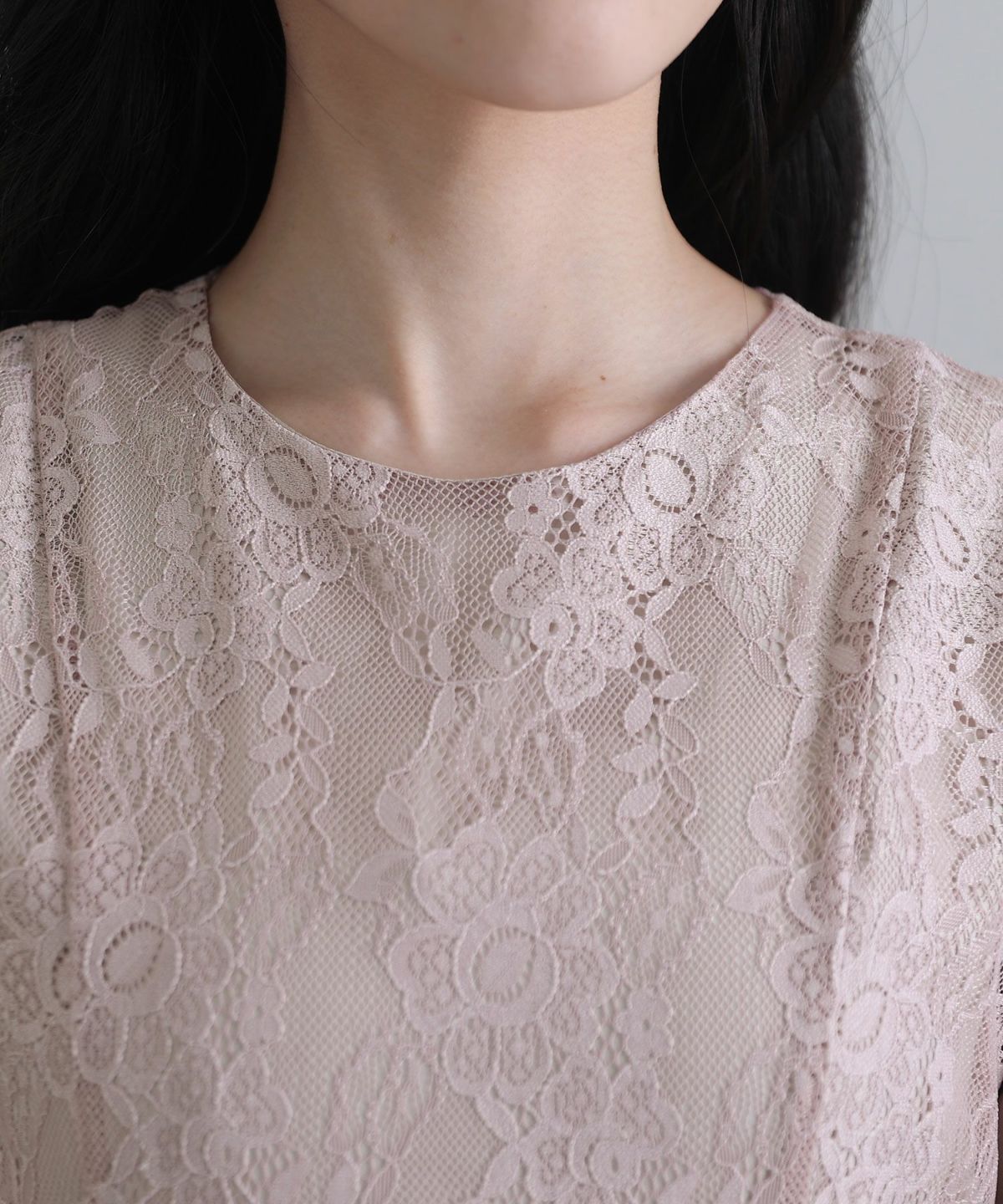 ボリューム感のあるカフス付き袖がデザインポイント フロッキーレースワンピース