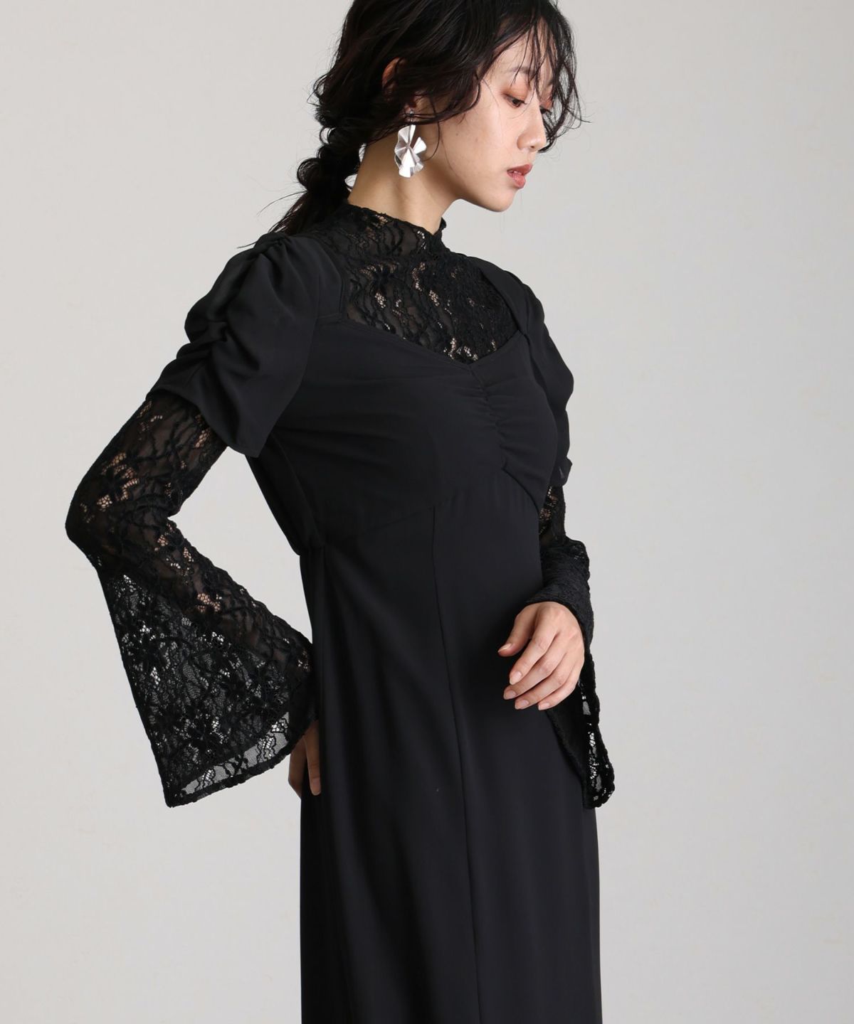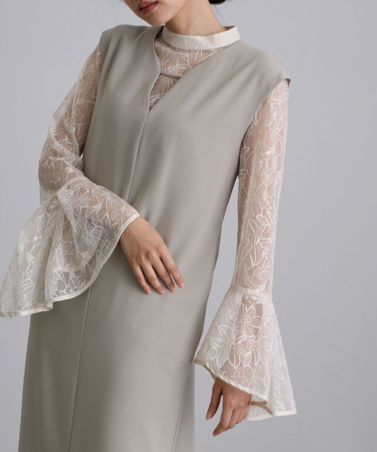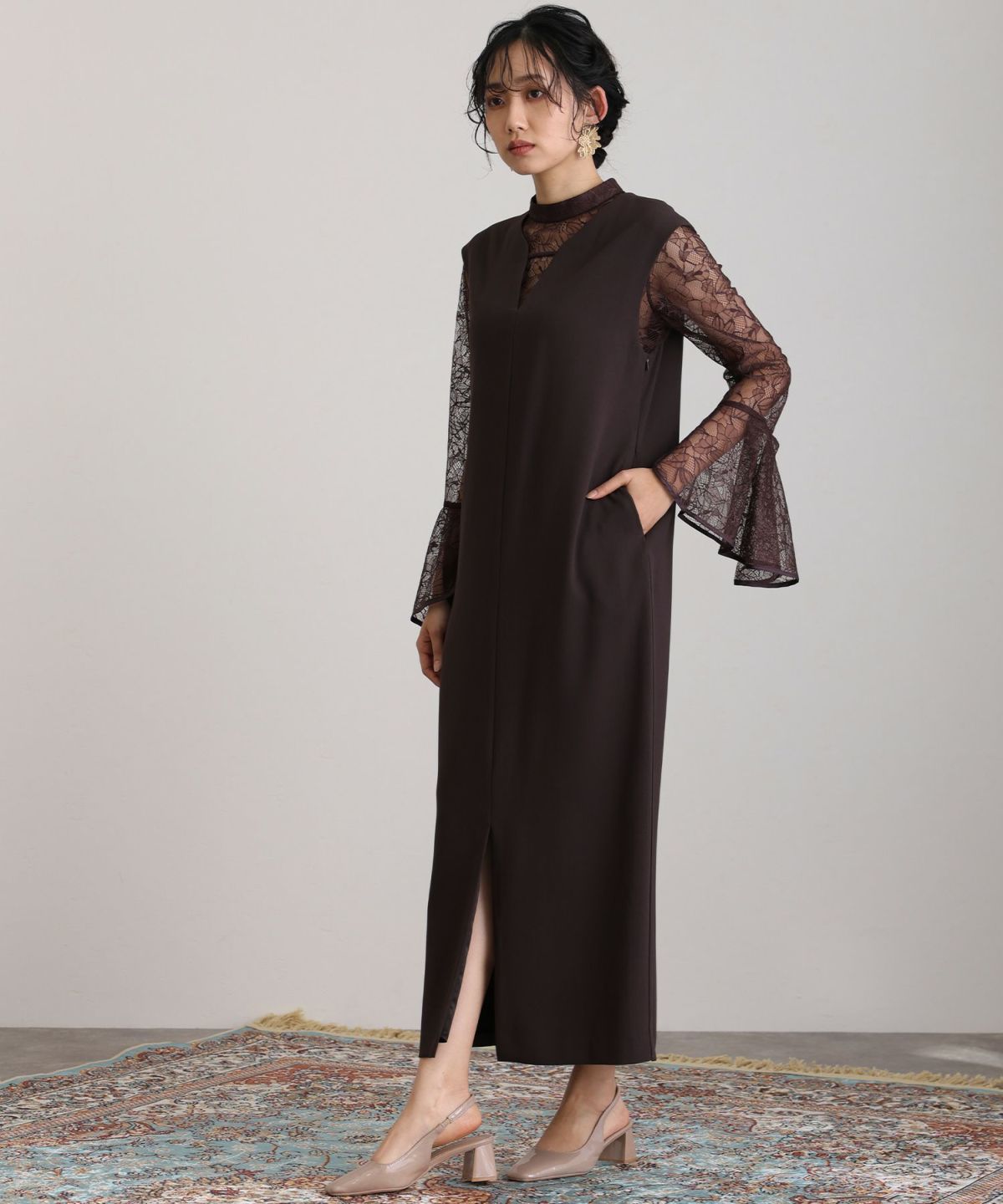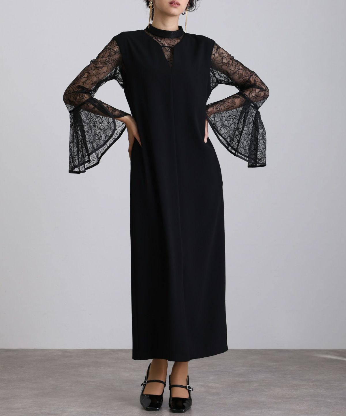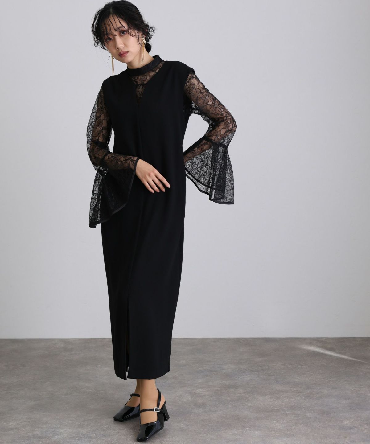 レースの程よい透け感が女性らしさを演出 ベルスリーブスリットドレス