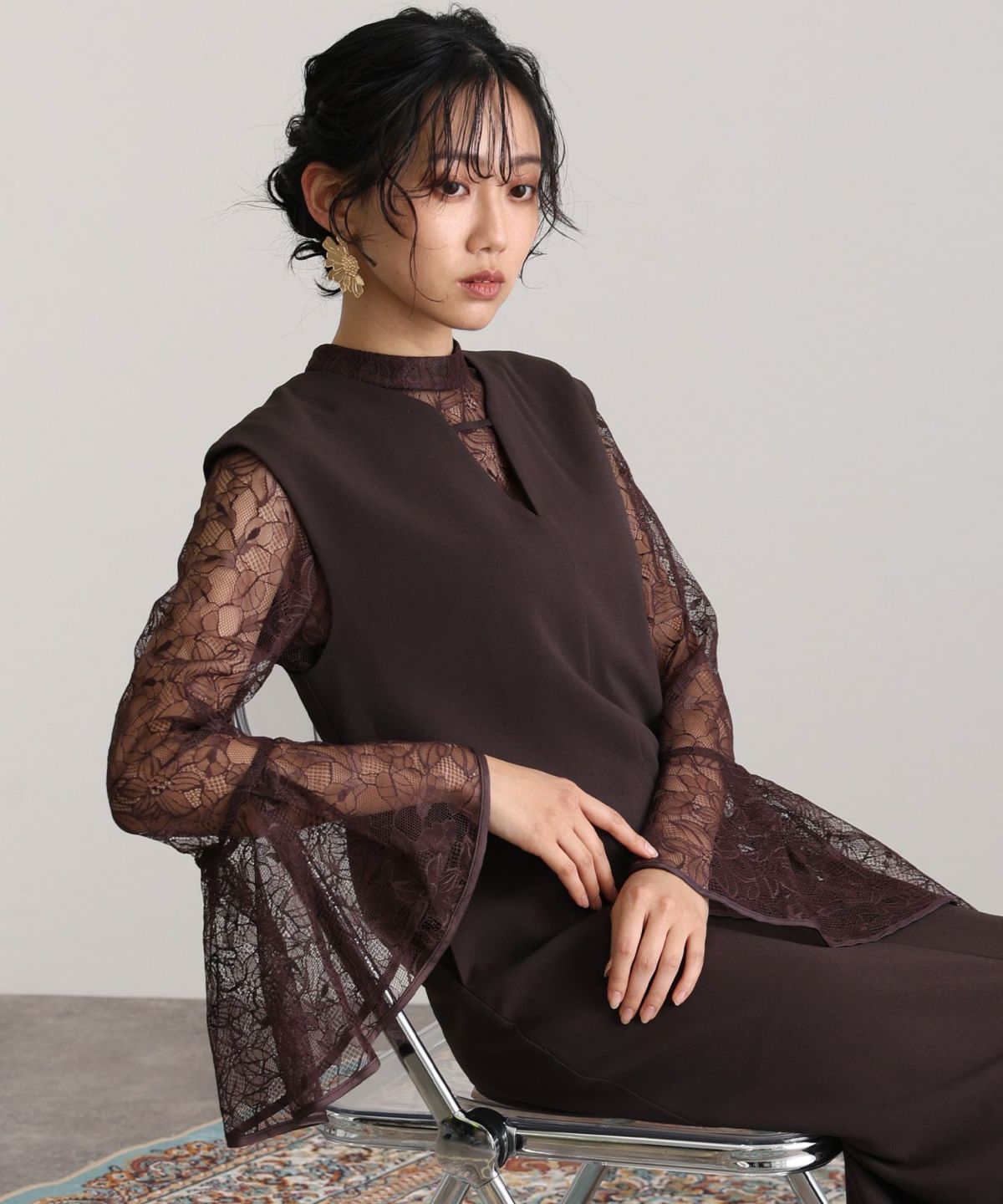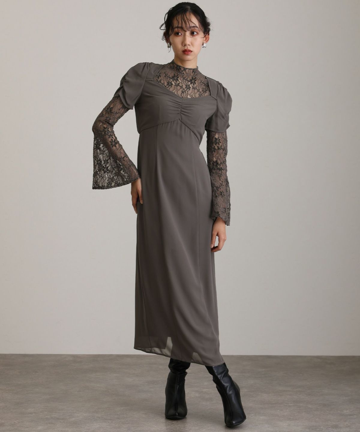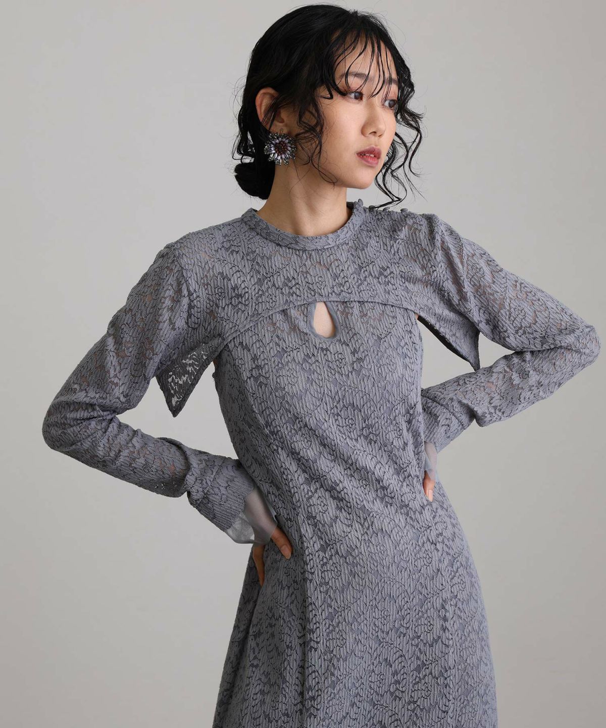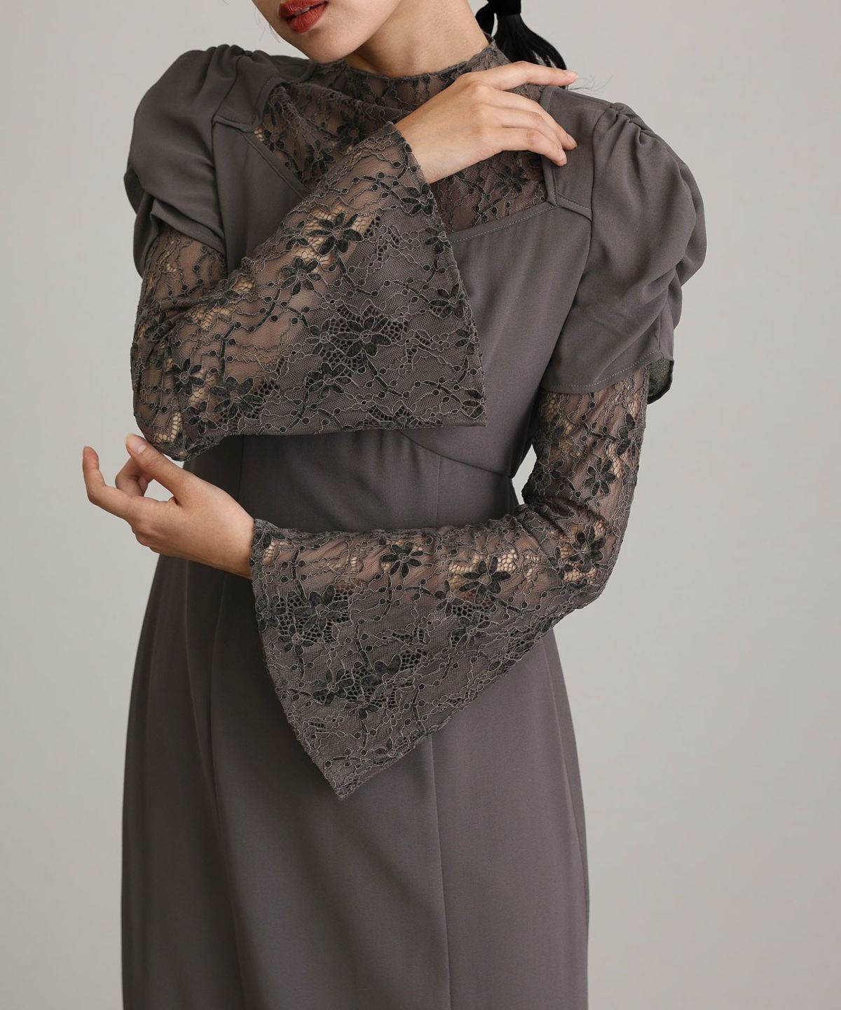 レースの程よい透け感が女性らしさを演出 ベルスリーブスリットドレス