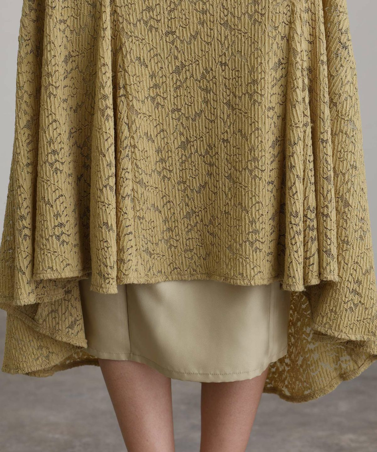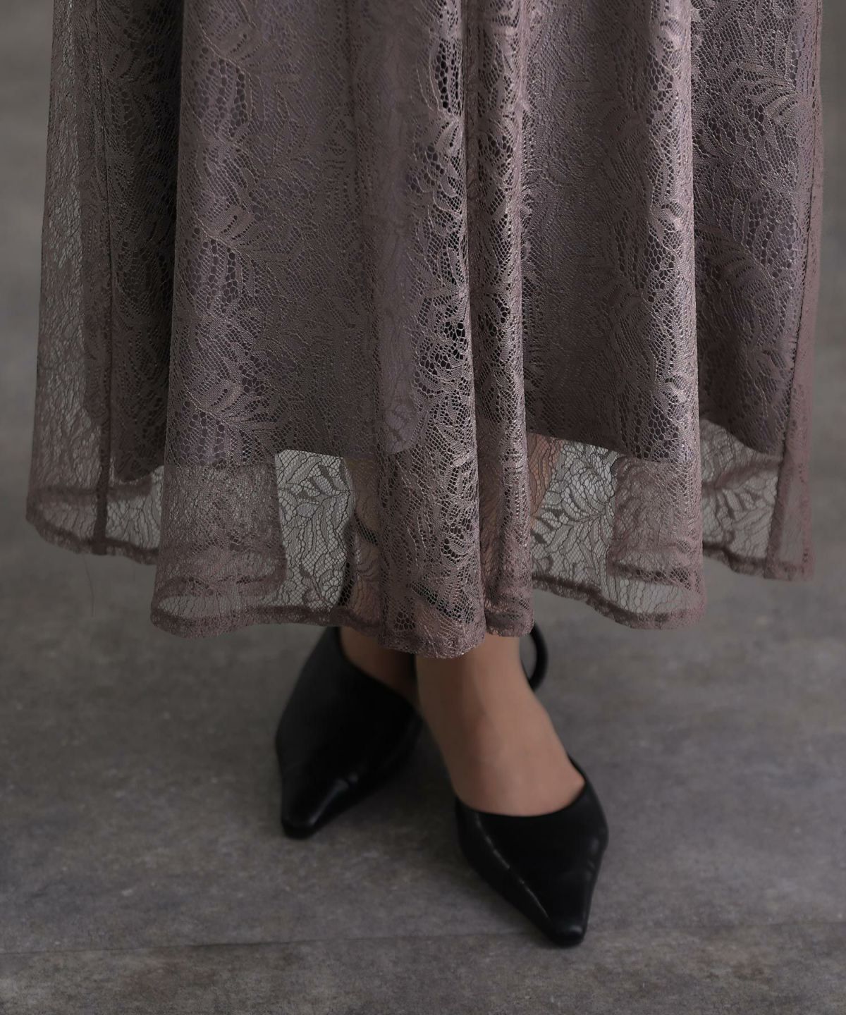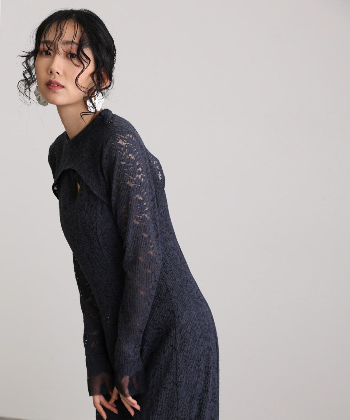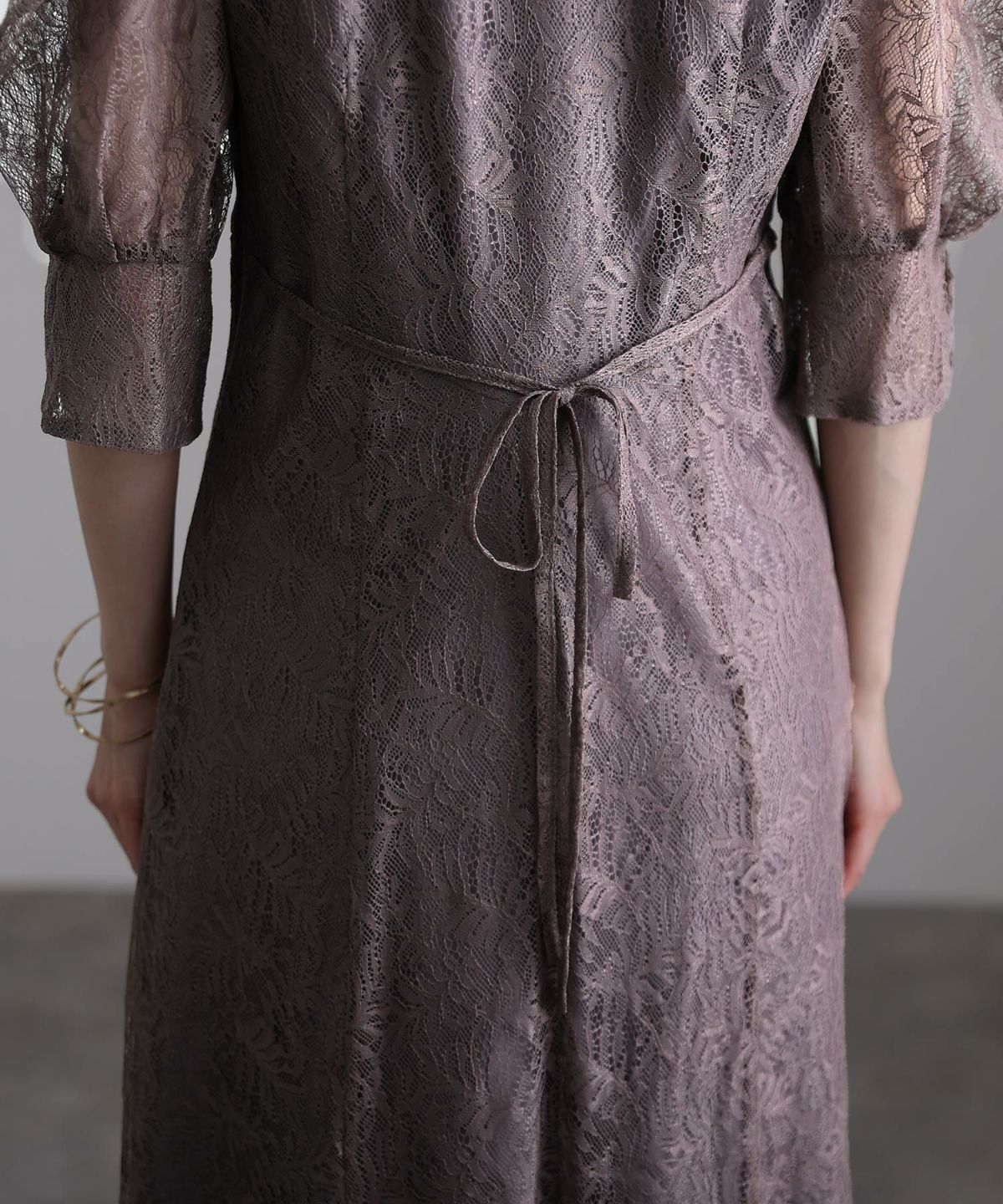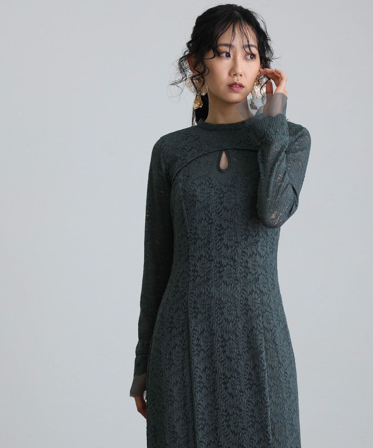 レースの程よい透け感が女性らしさを演出 ベルスリーブスリットドレス