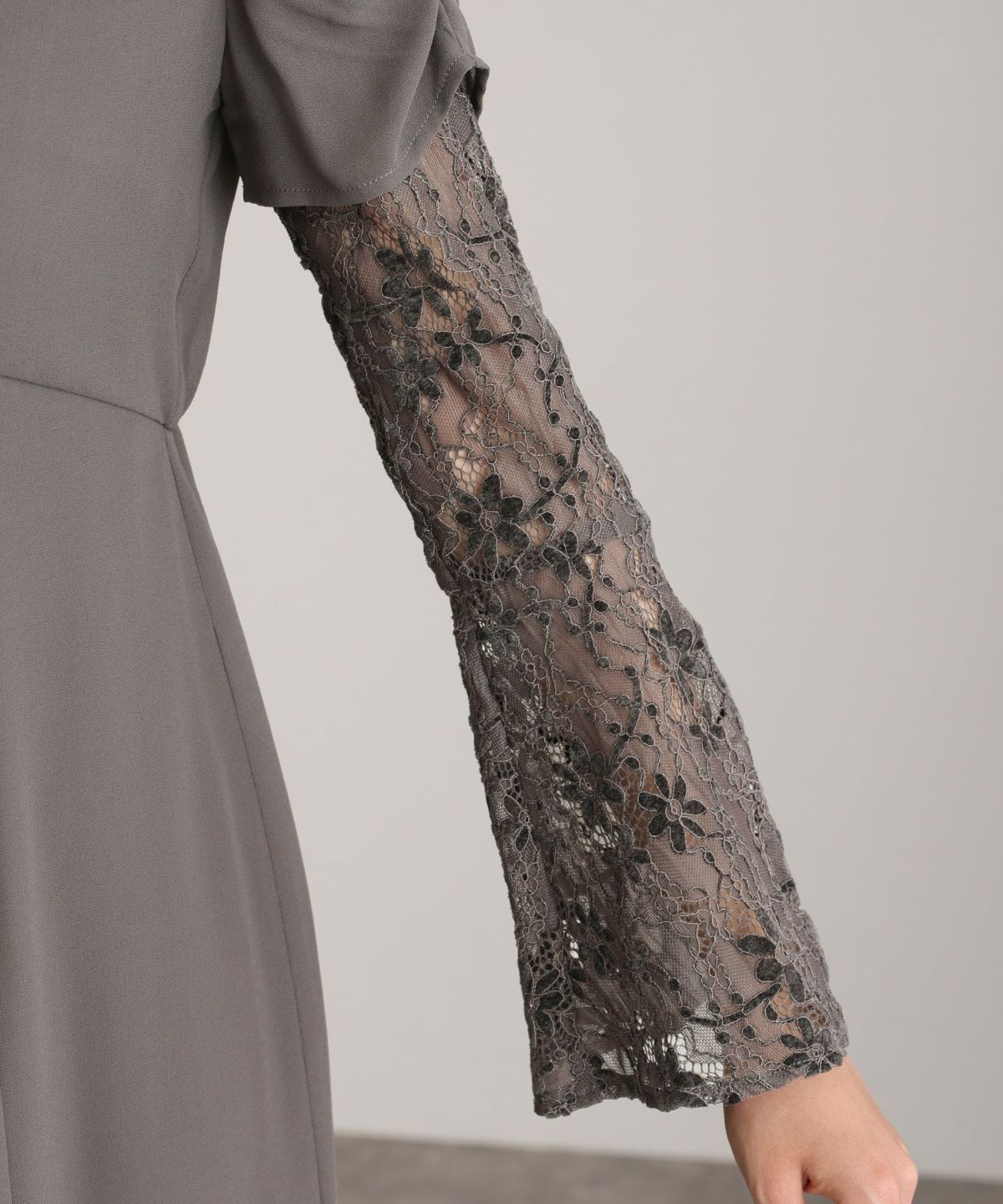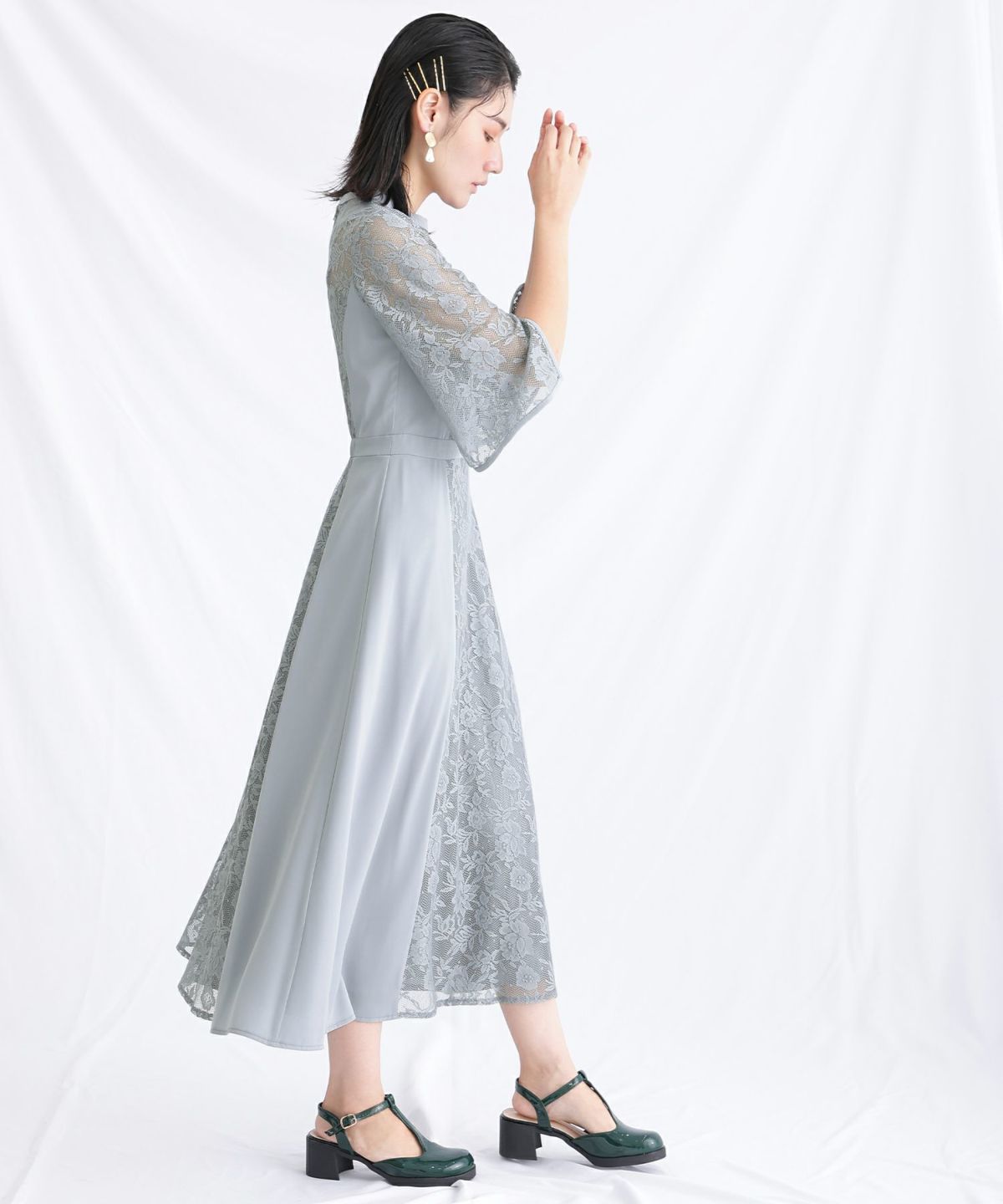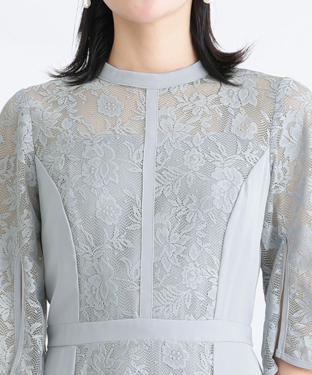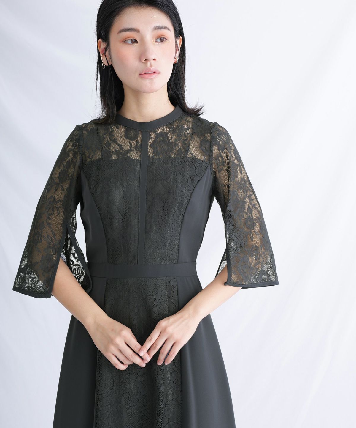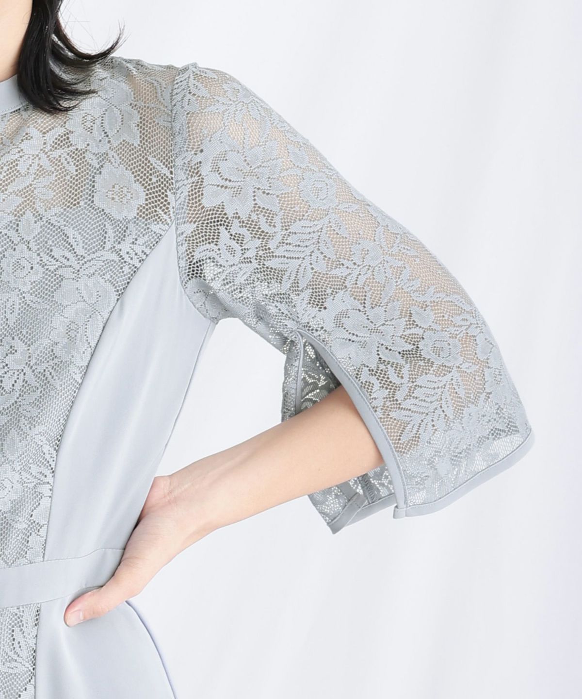 花柄レースが上品で大人な雰囲気に 袖スリット異素材切替レースドレス