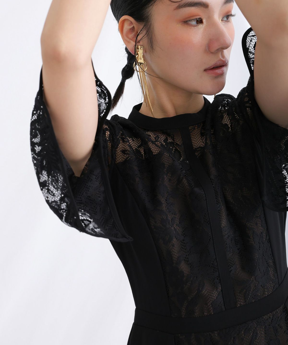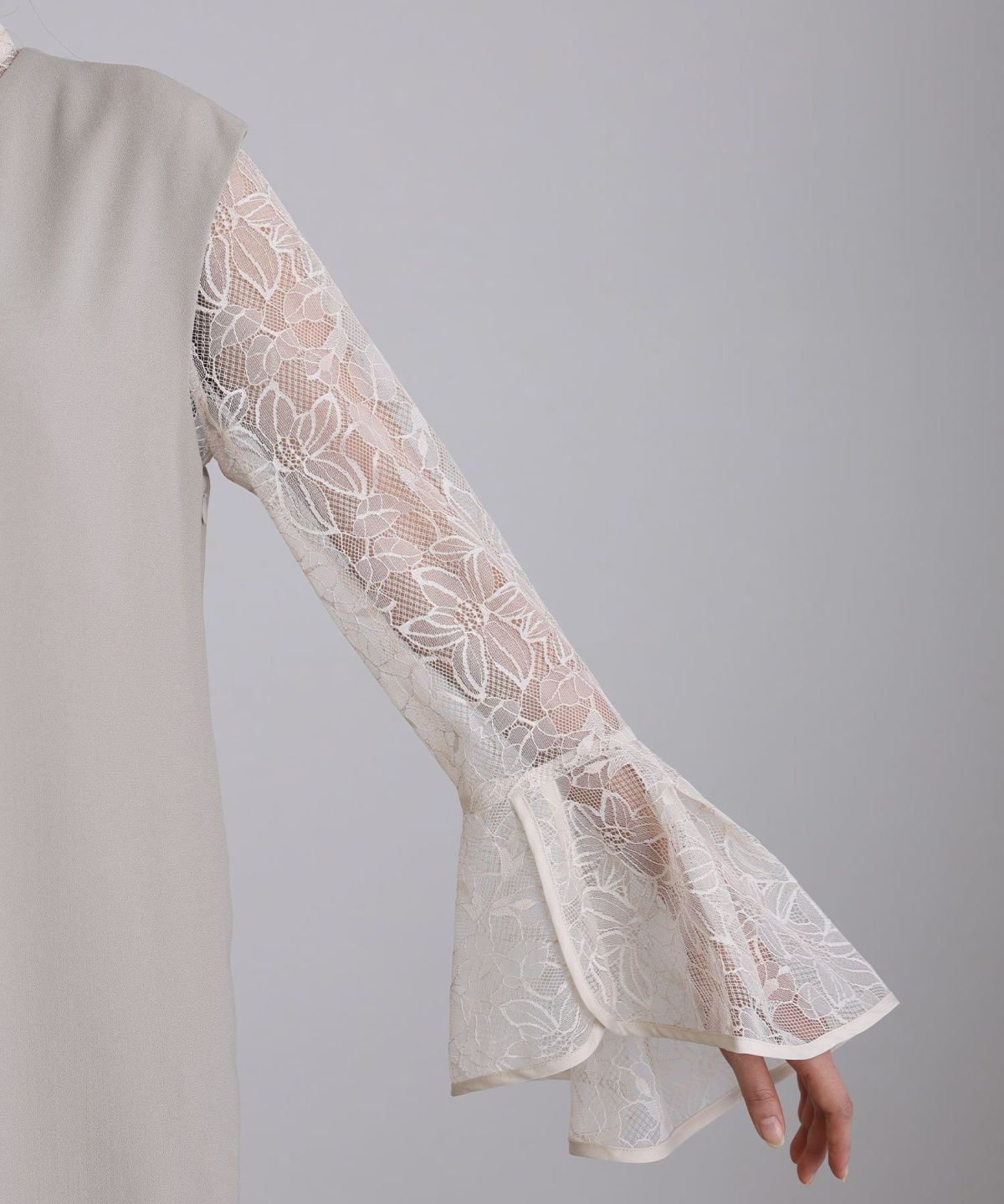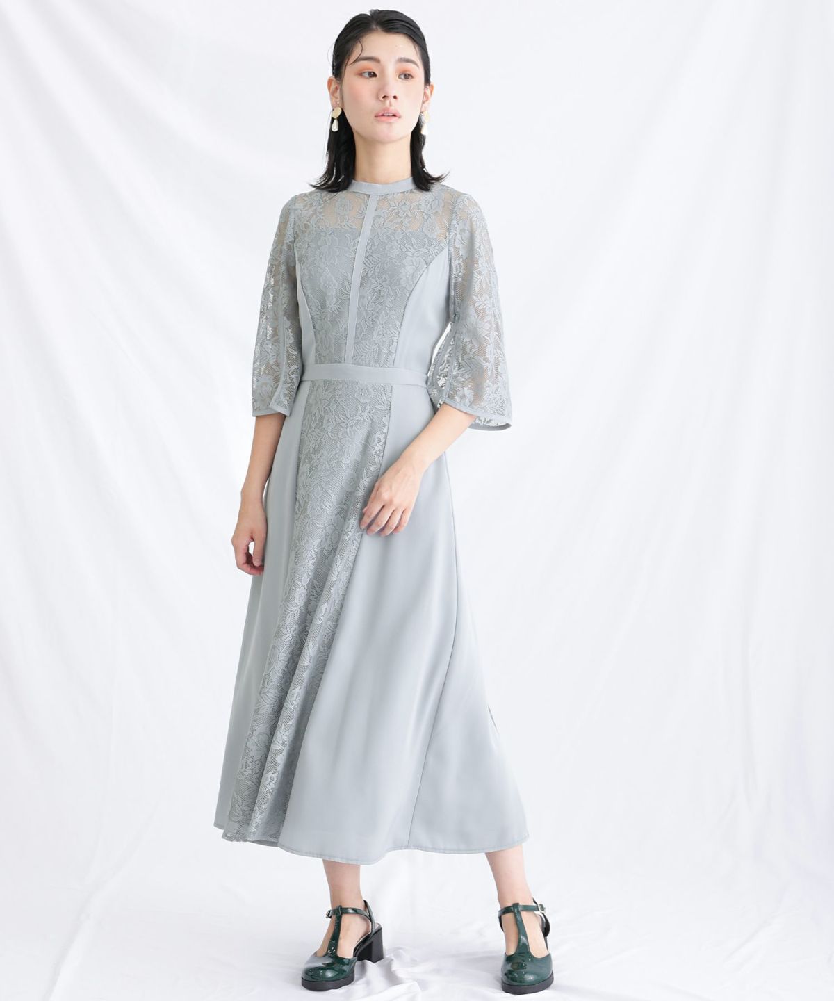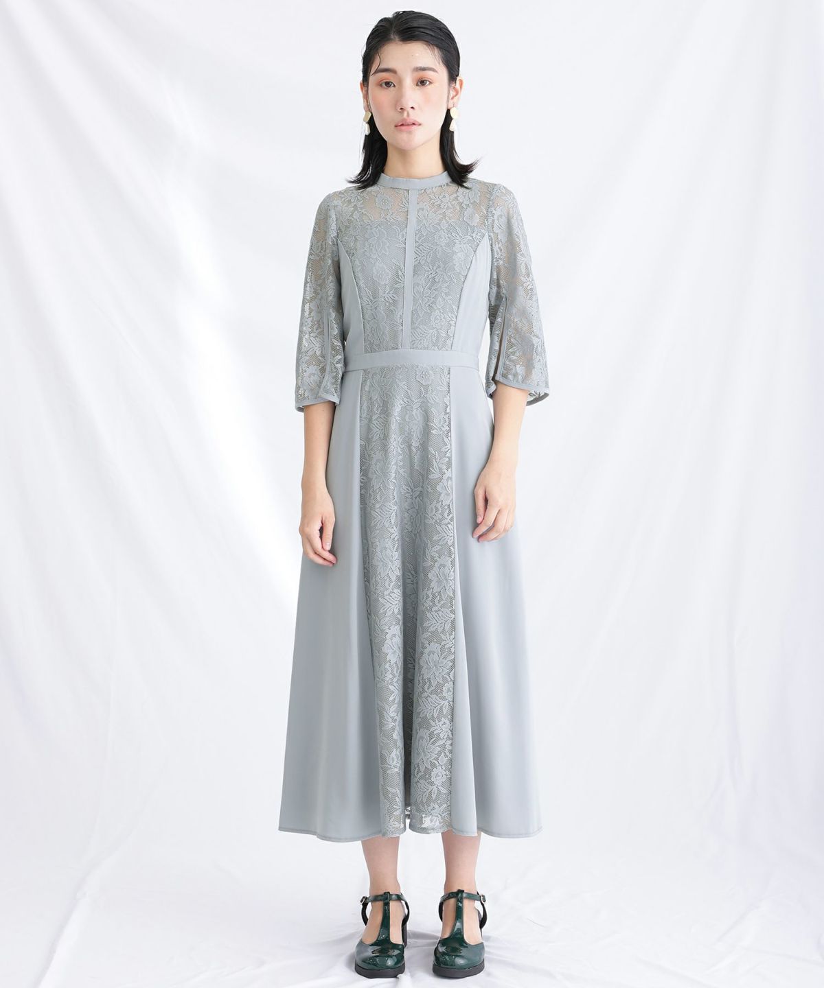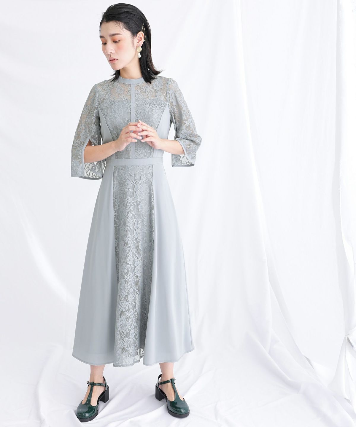花柄レースが上品で大人な雰囲気に 袖スリット異素材切替レースドレス
