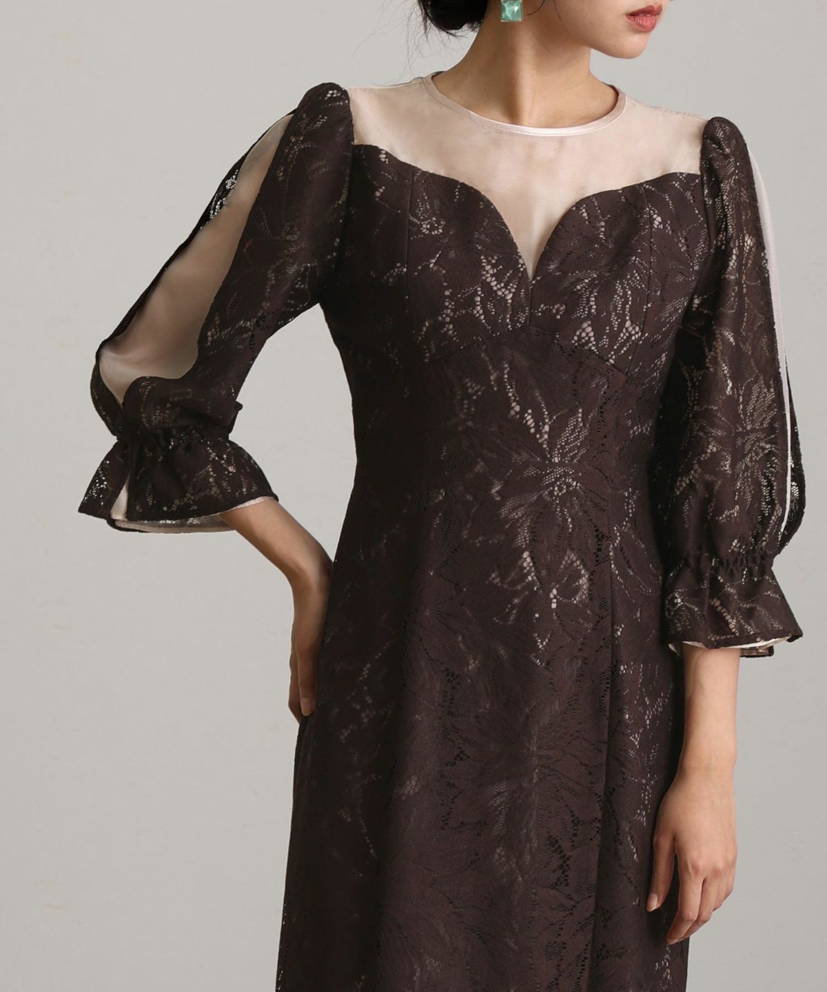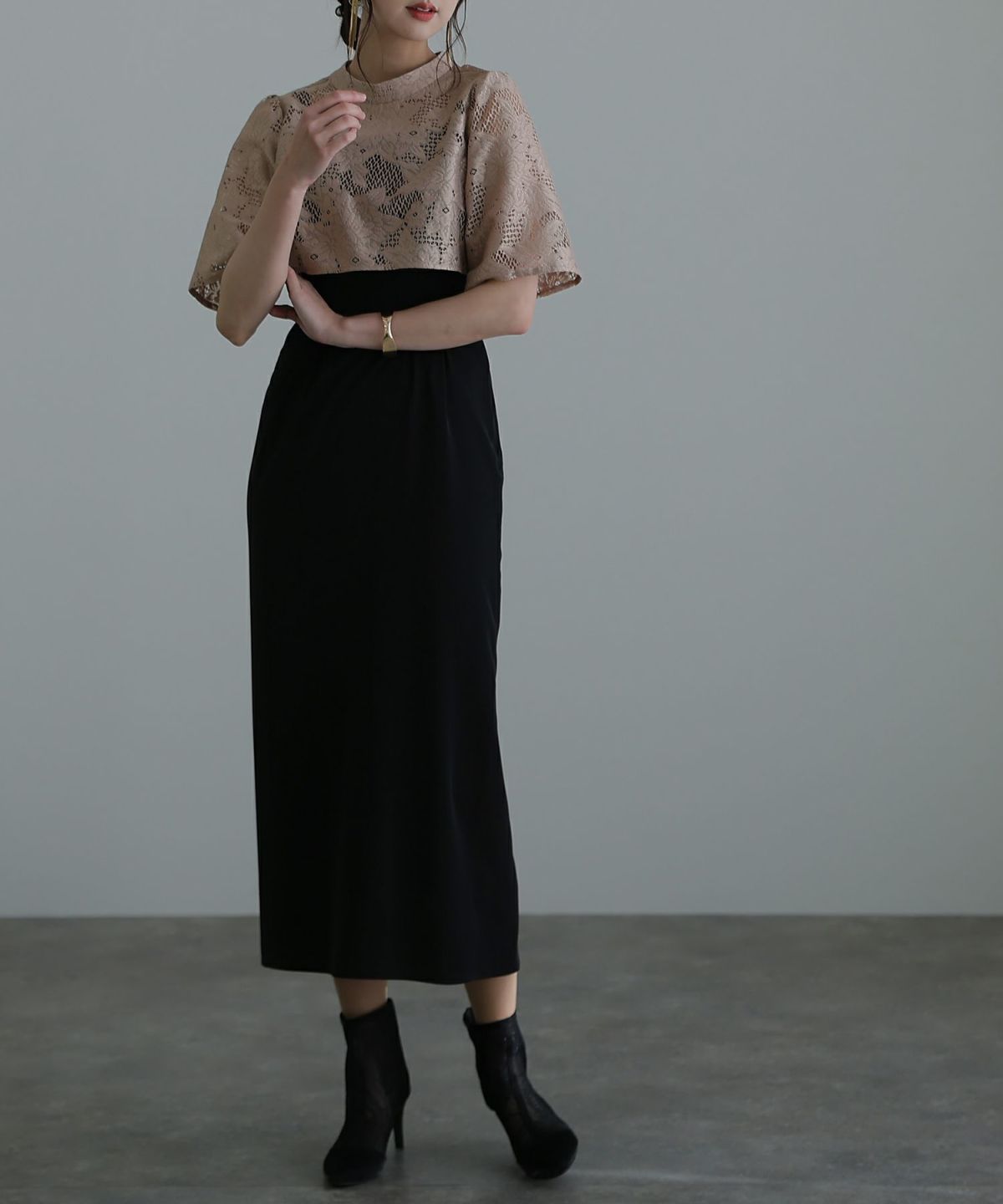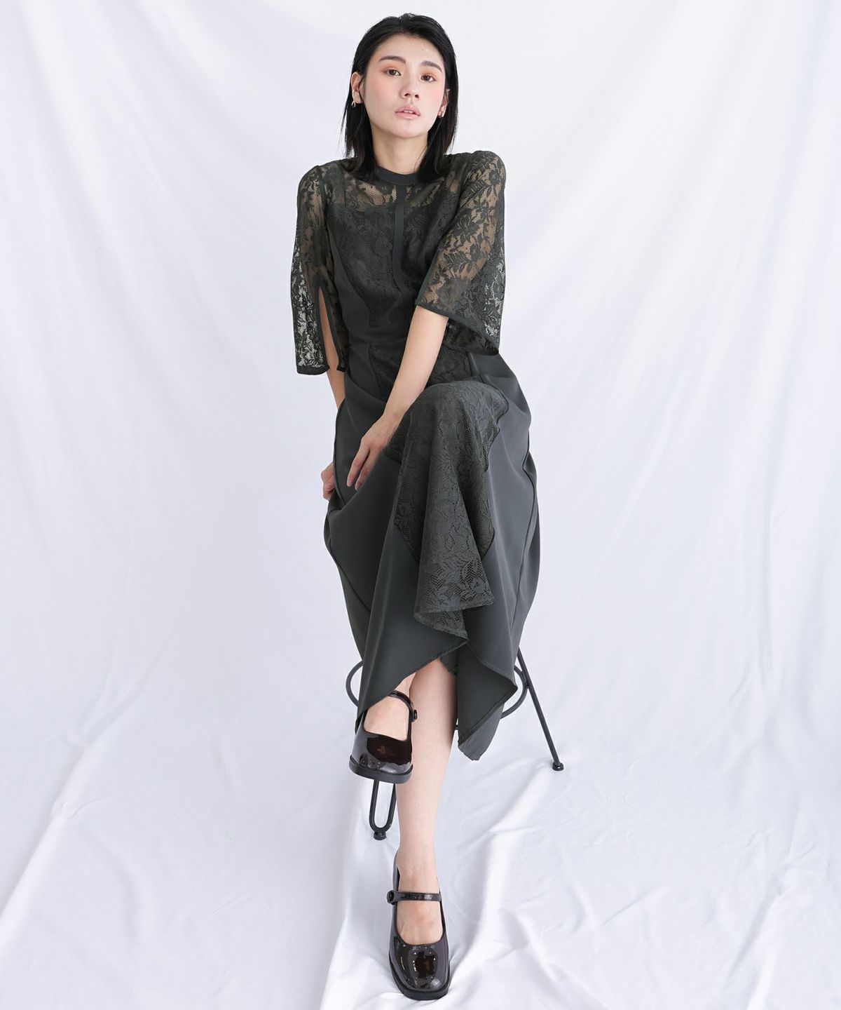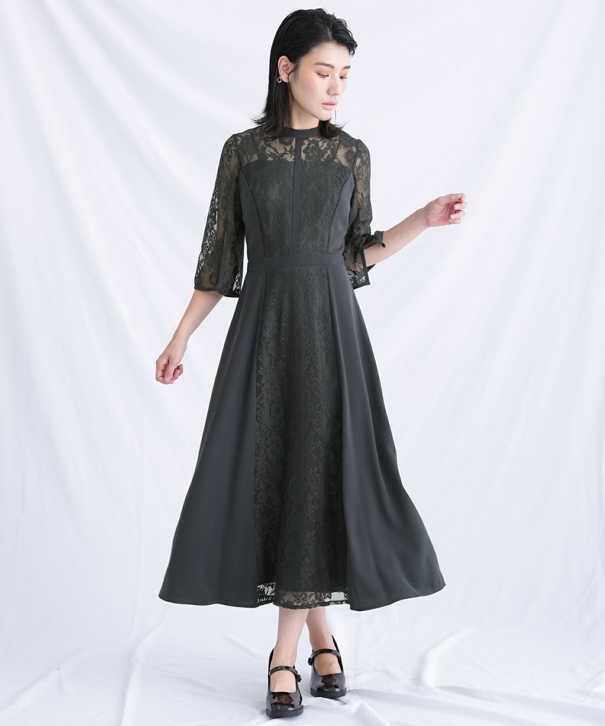 花柄レースが上品で大人な雰囲気に 袖スリット異素材切替レースドレス