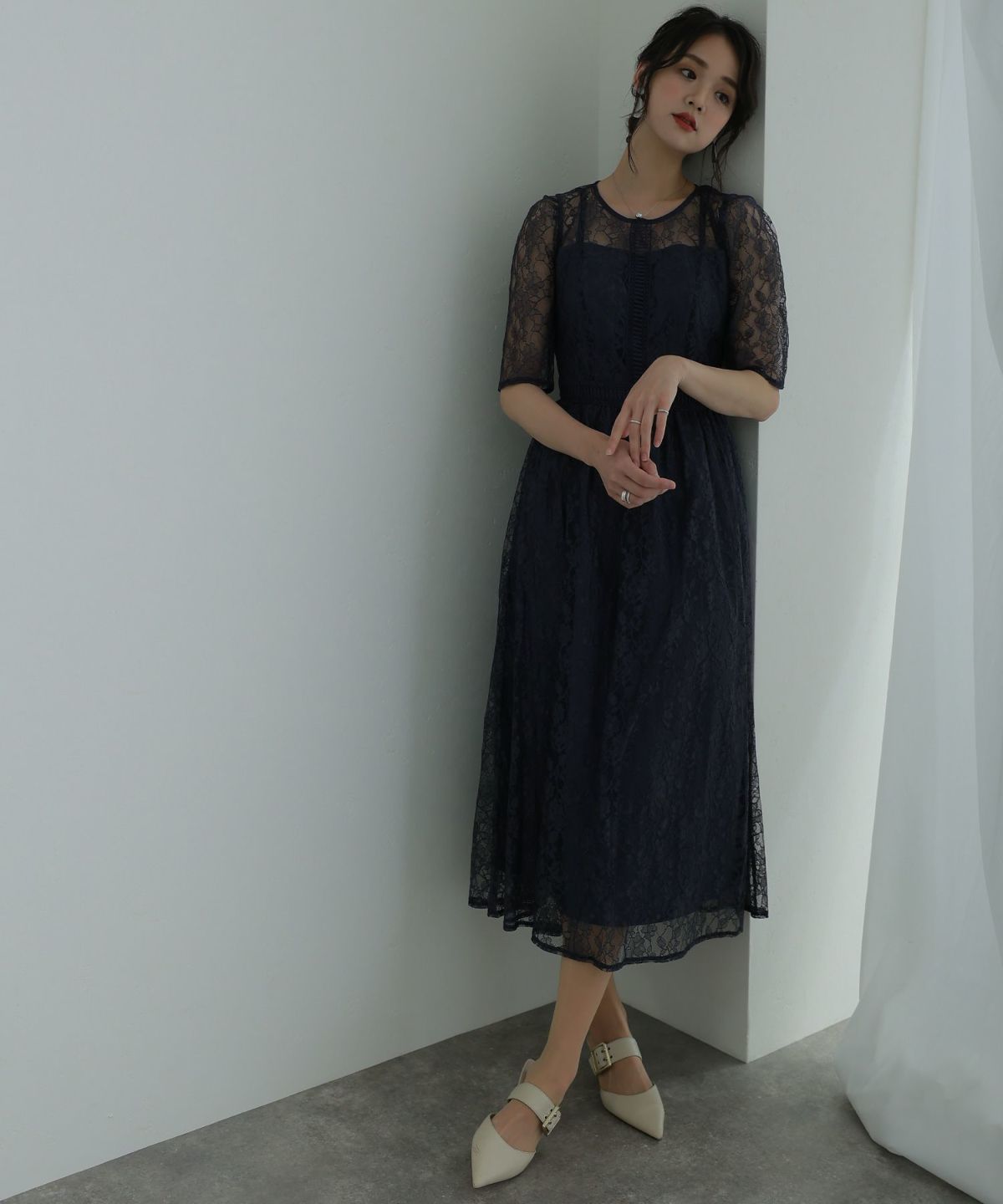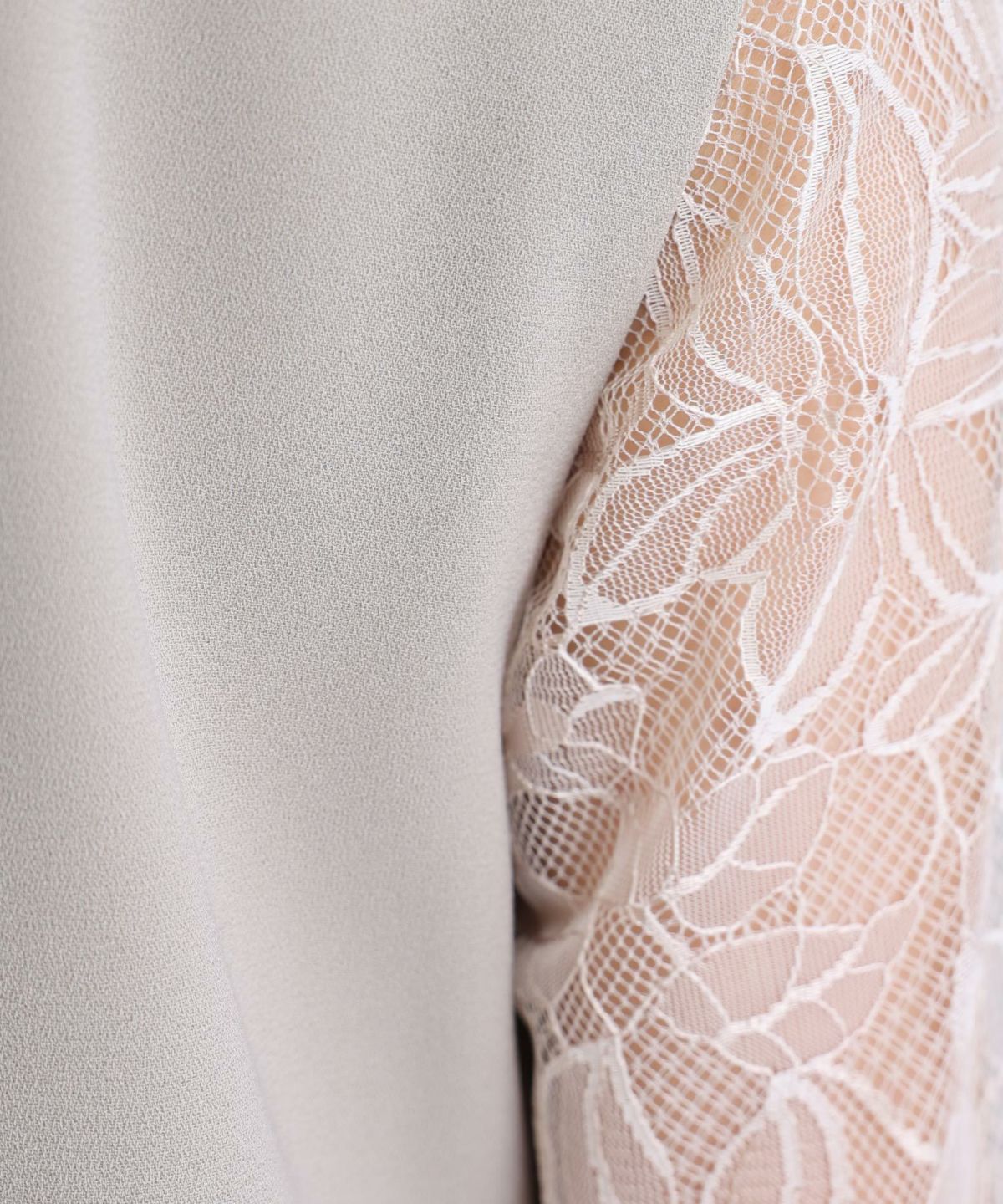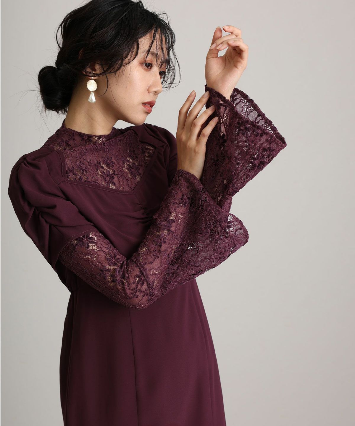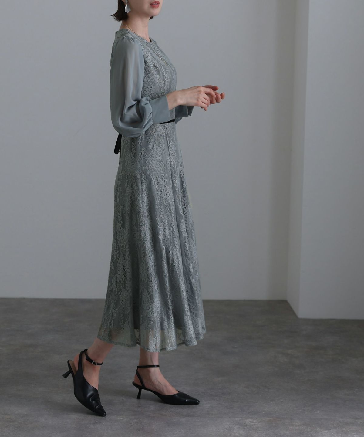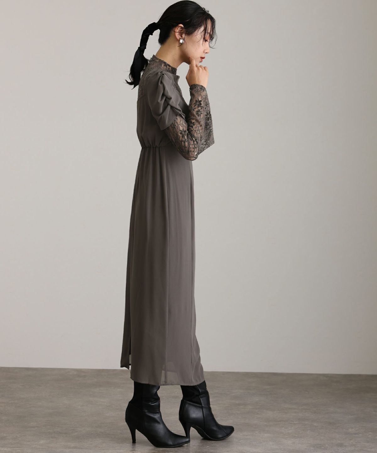 花柄レースが上品で大人な雰囲気に 袖スリット異素材切替レースドレス