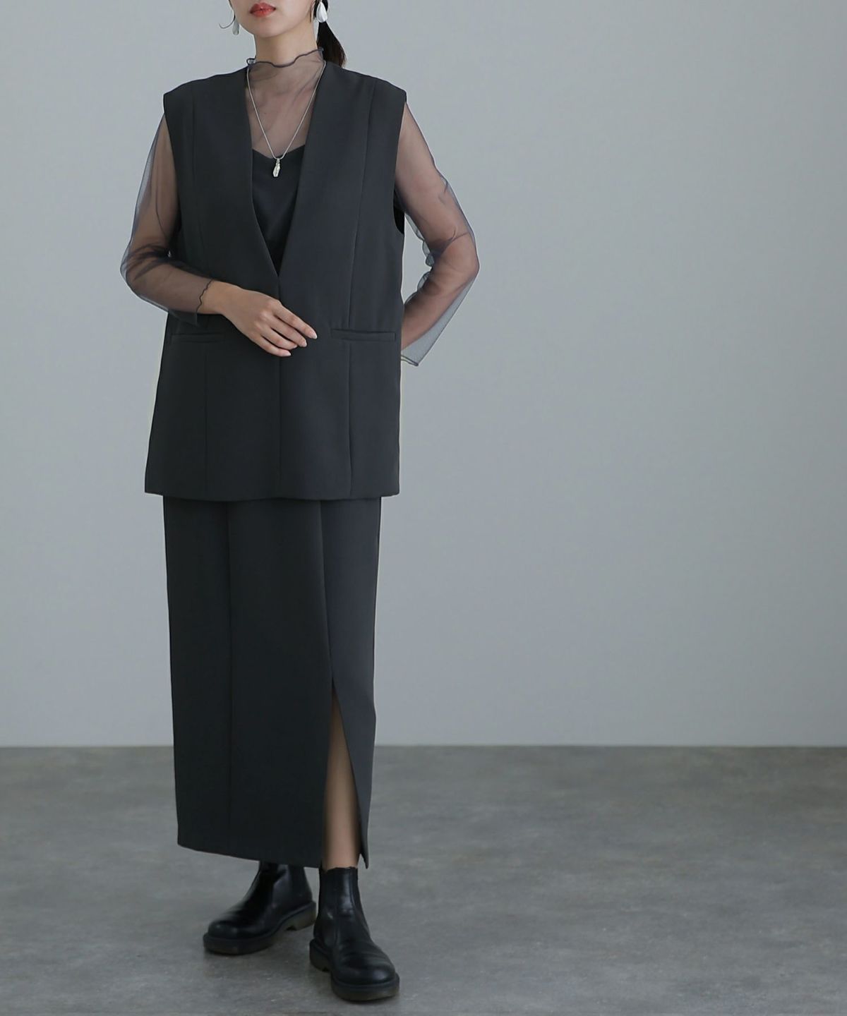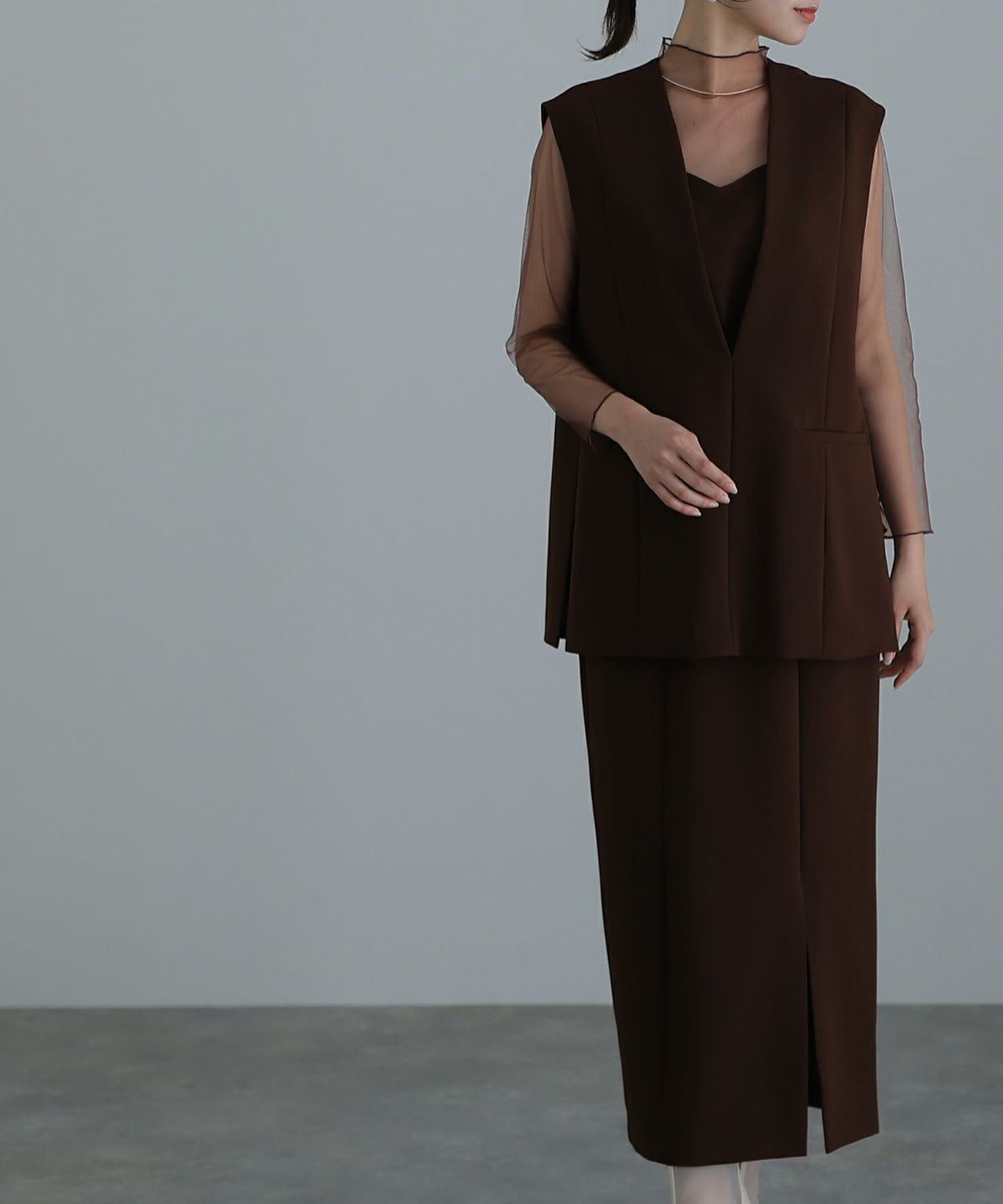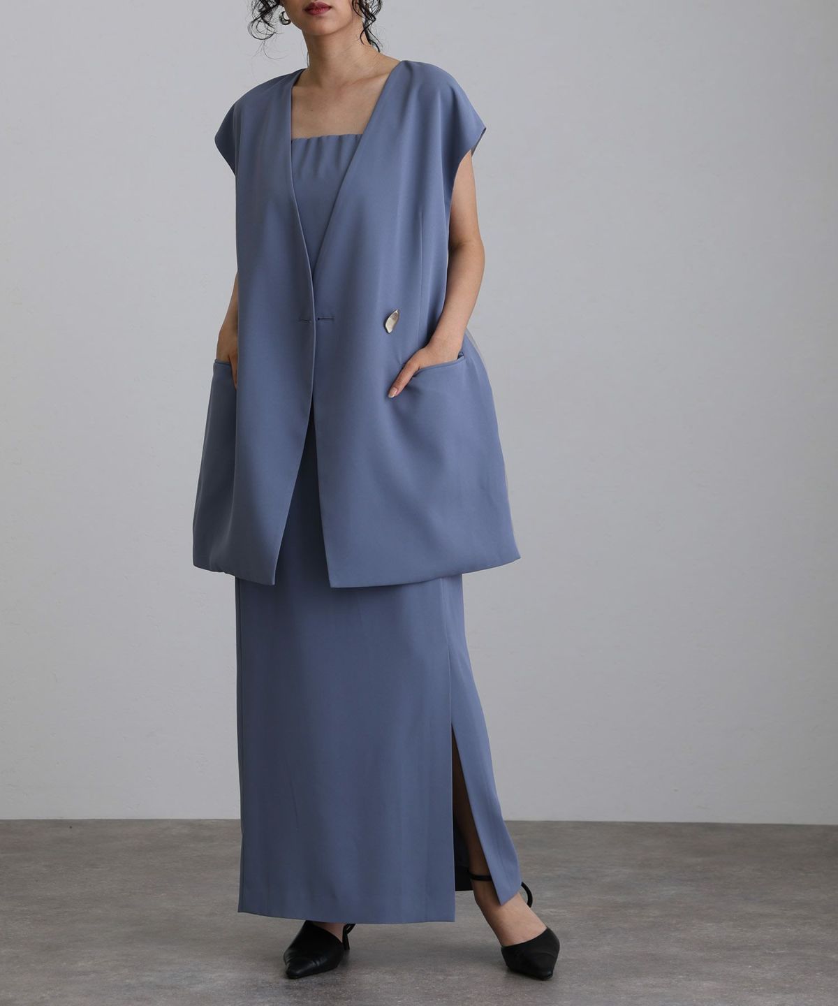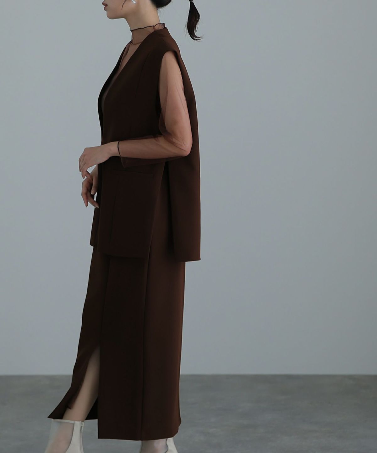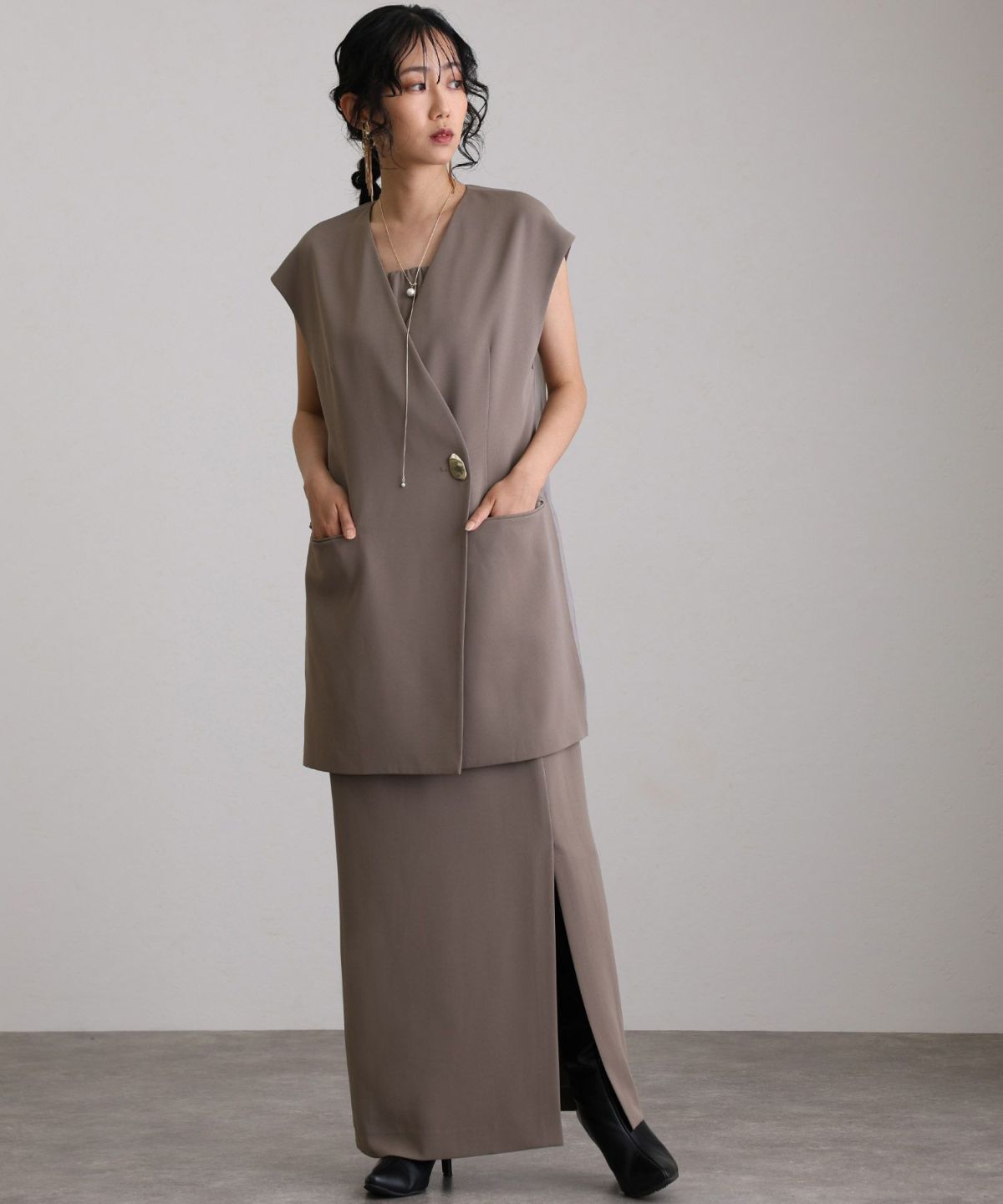 スカートのスリットによるさり気ない肌見せでこなれ感を演出 2wayジレ付きワンピース