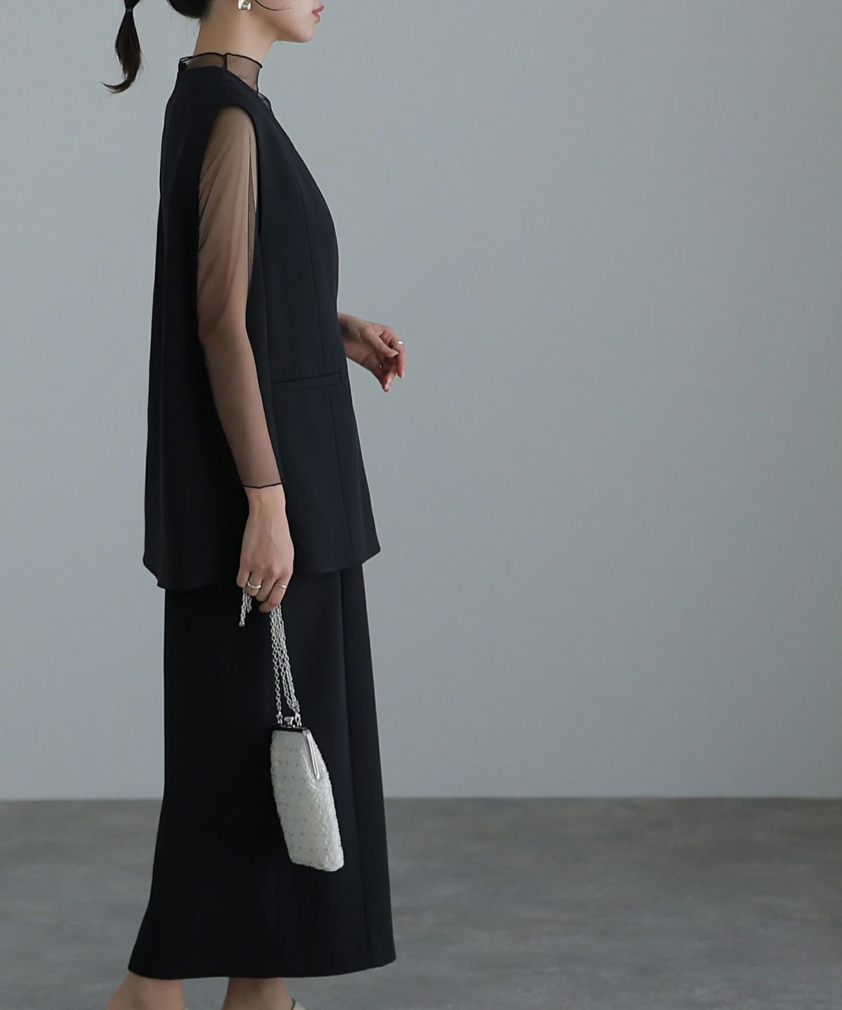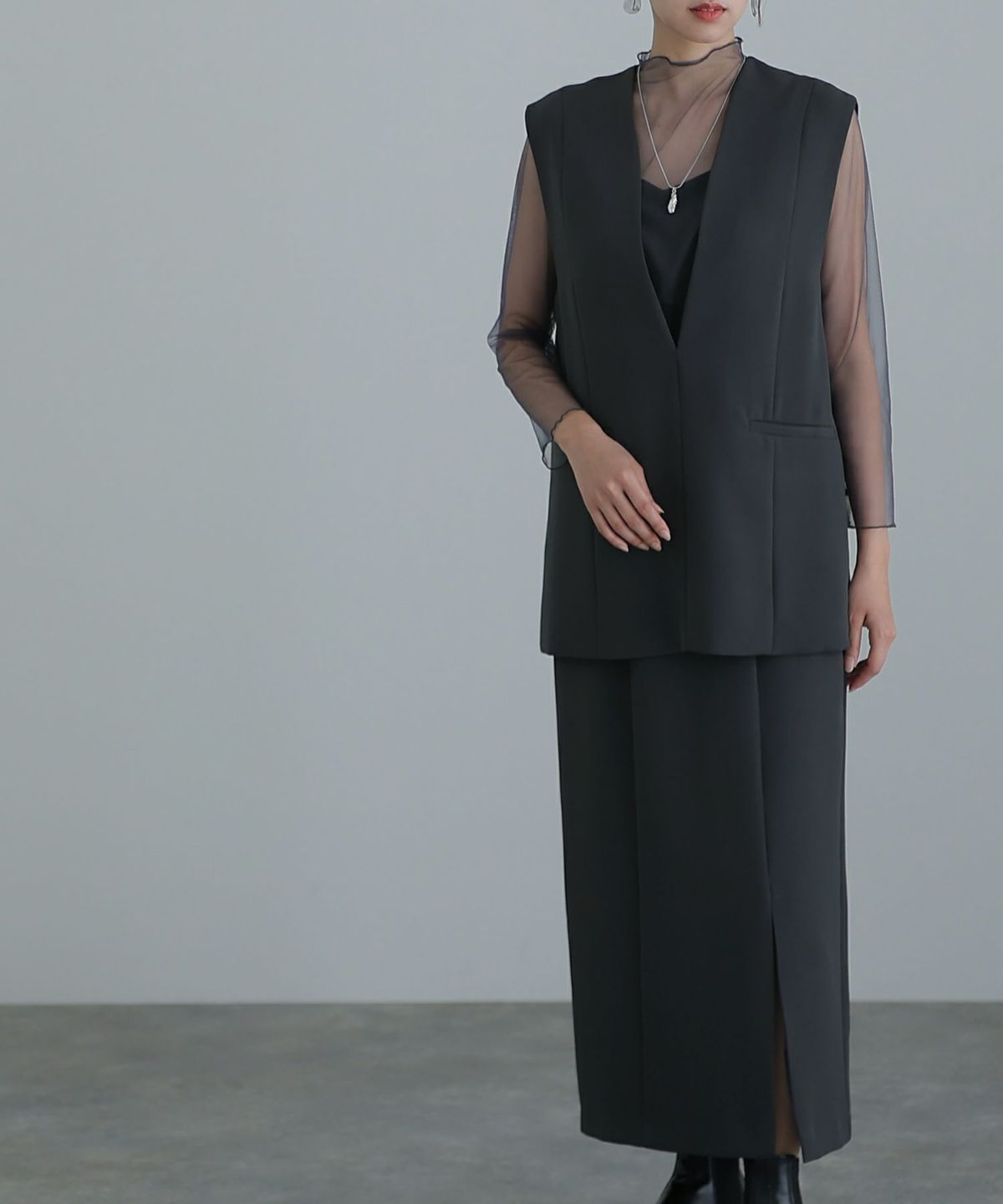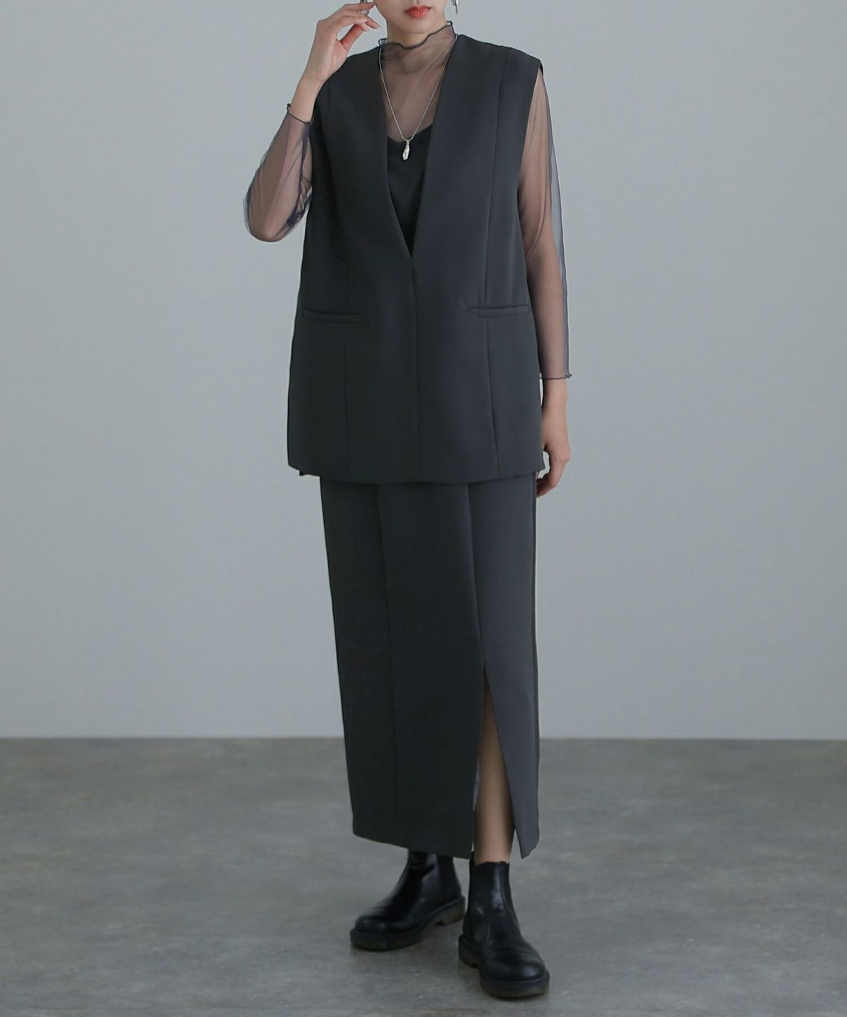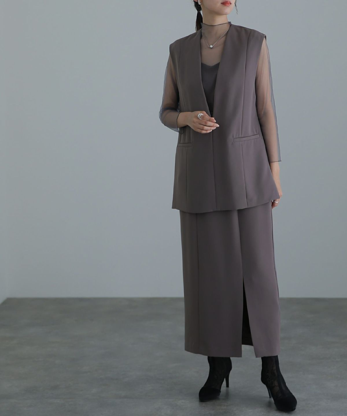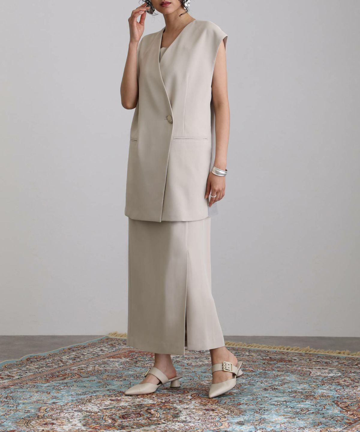 スカートのスリットによるさり気ない肌見せでこなれ感を演出 2wayジレ付きワンピース