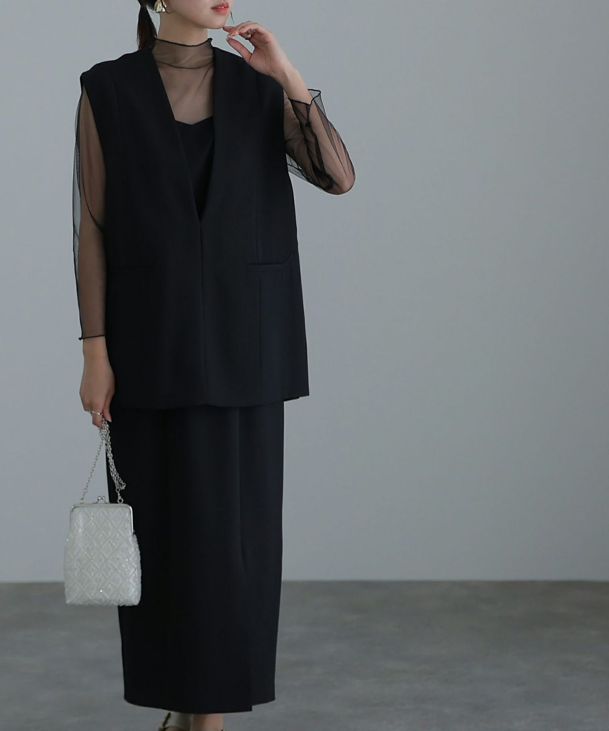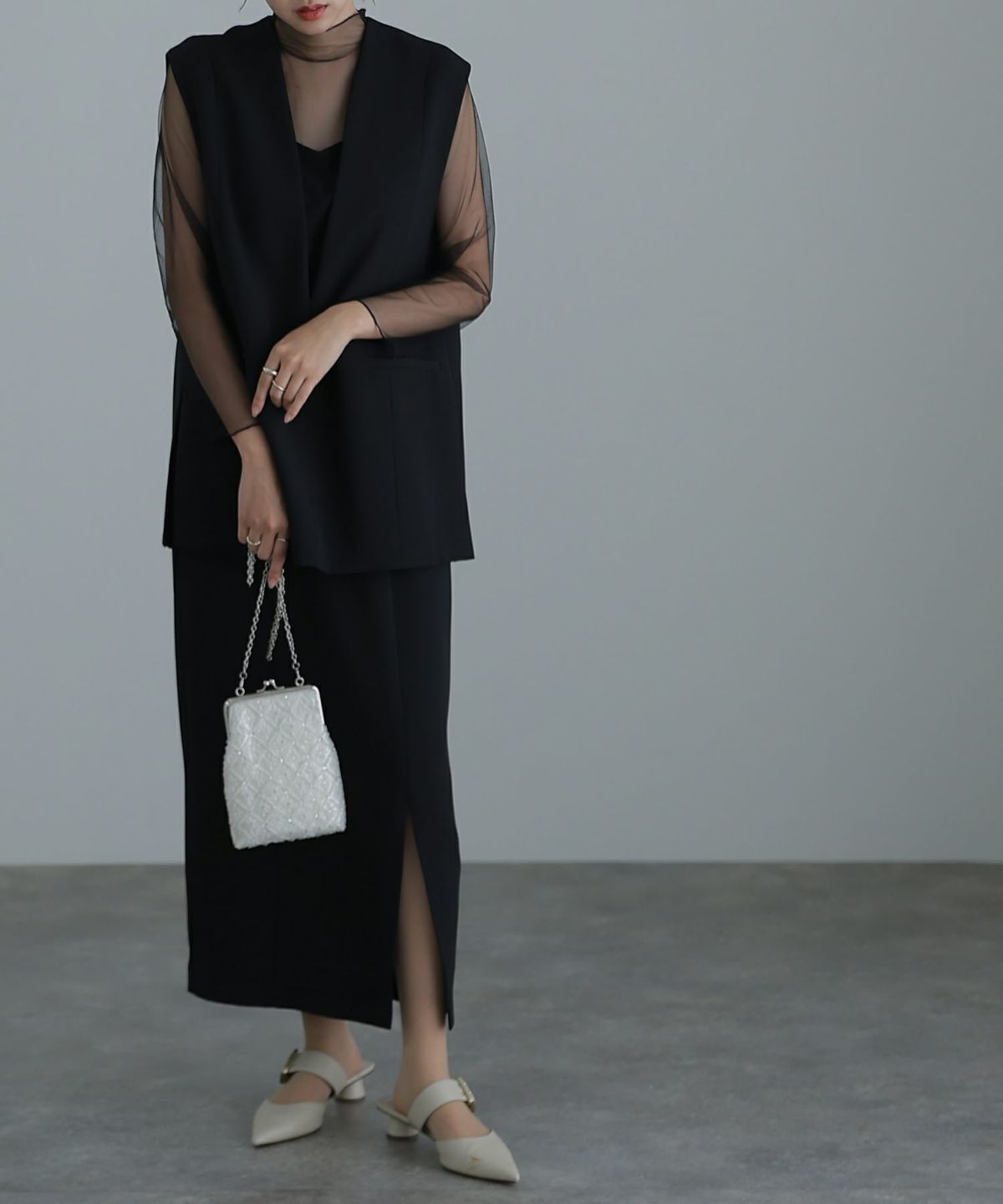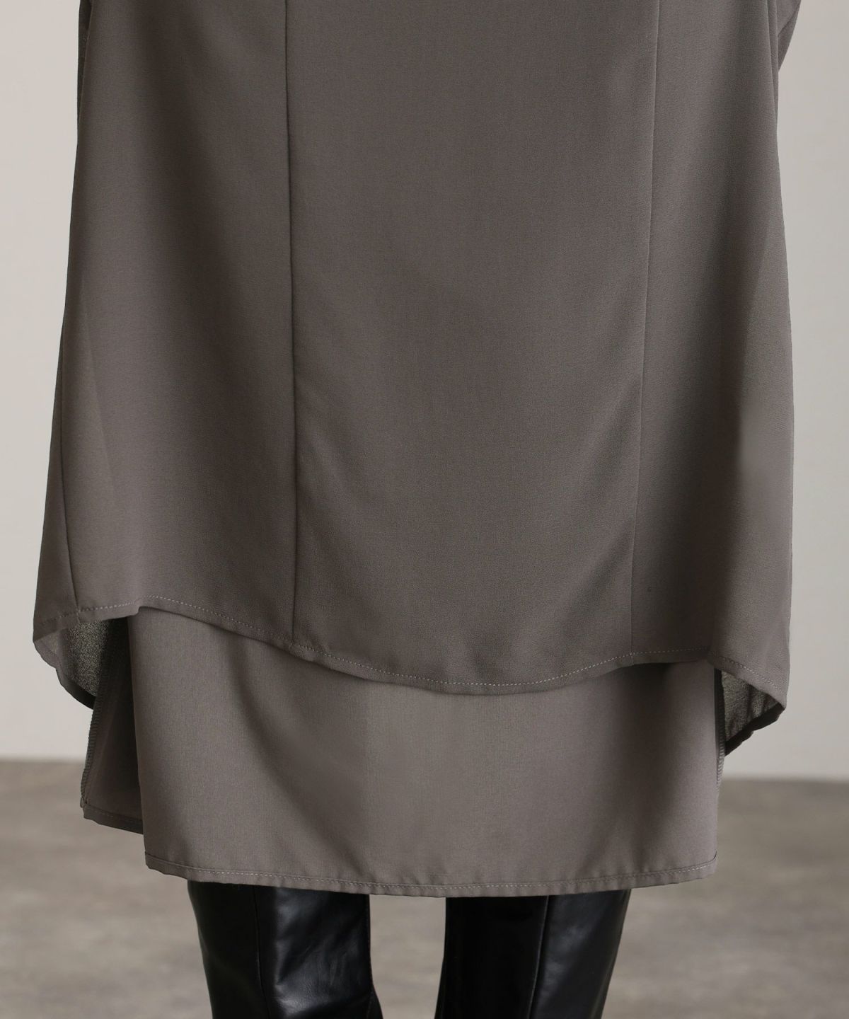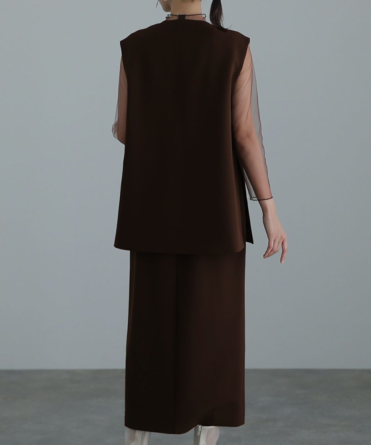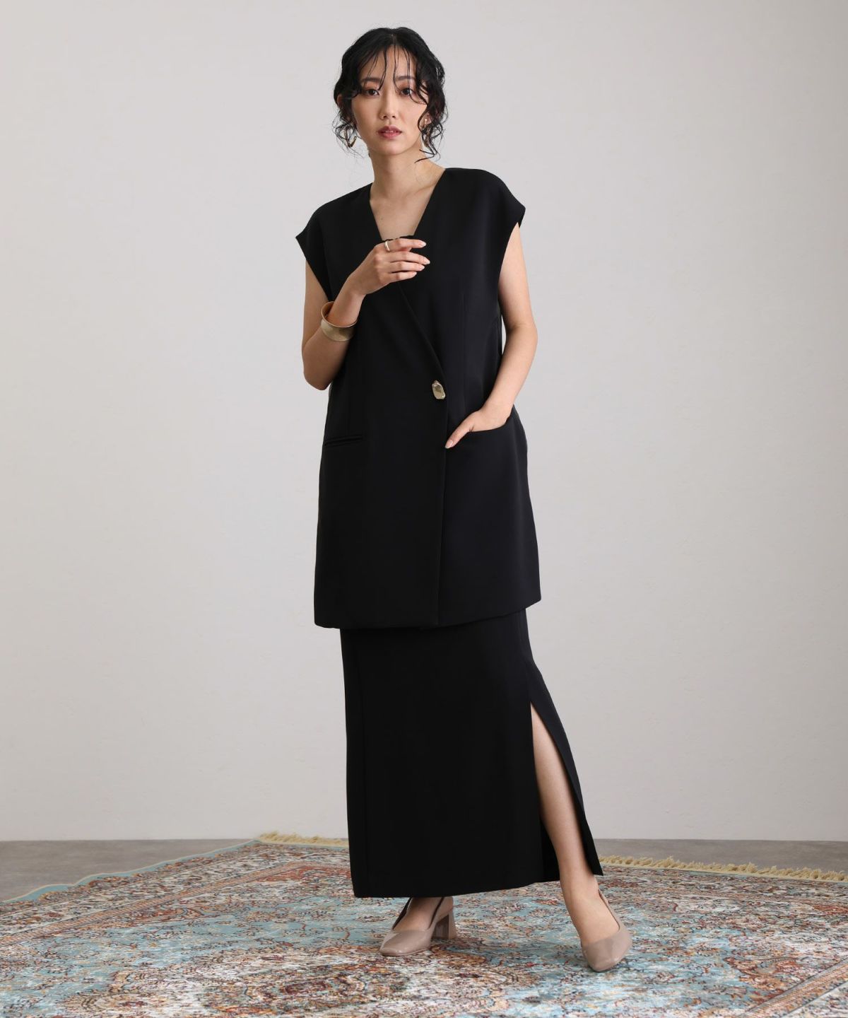 スカートのスリットによるさり気ない肌見せでこなれ感を演出 2wayジレ付きワンピース