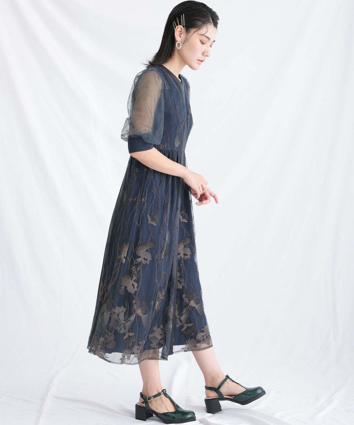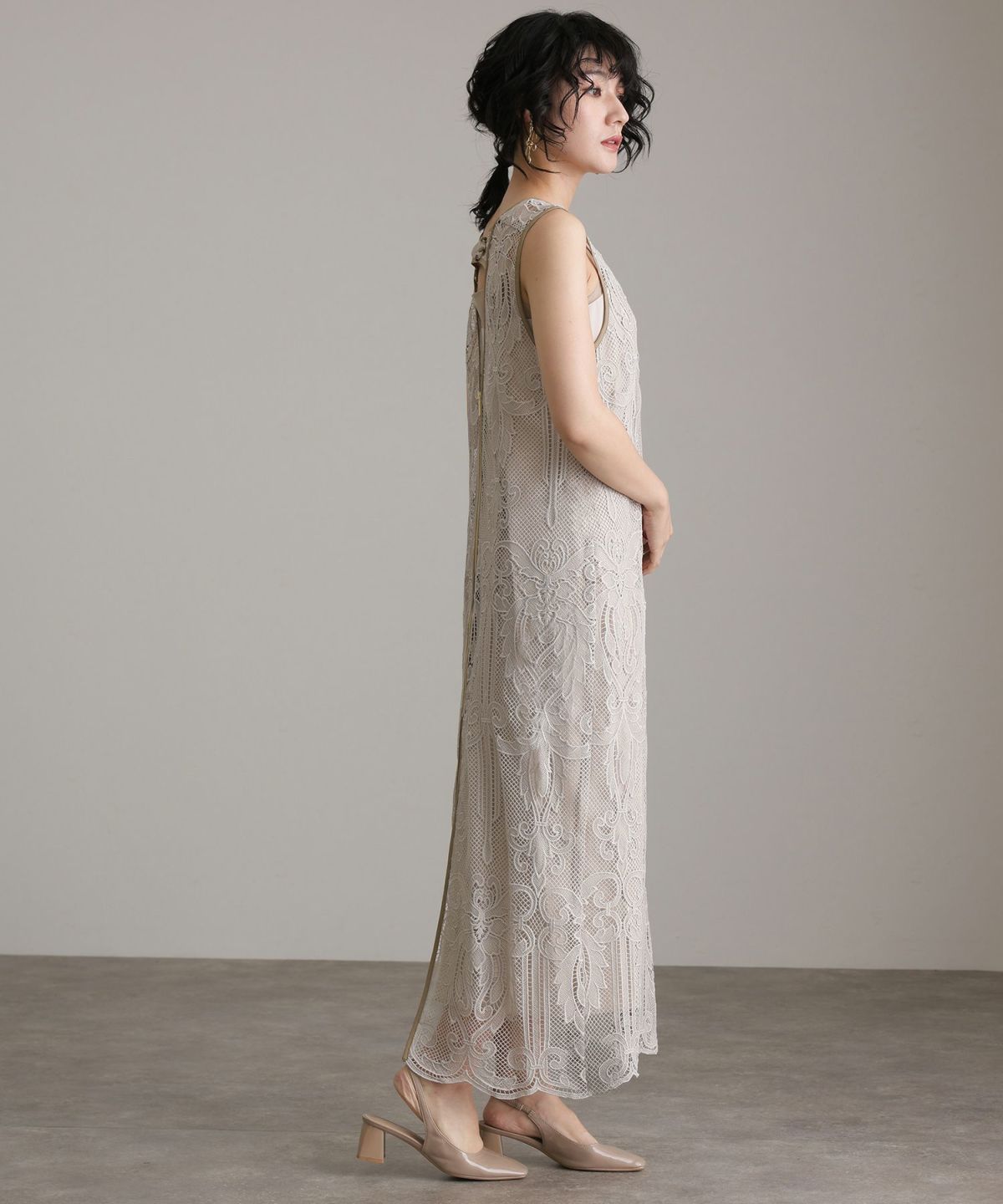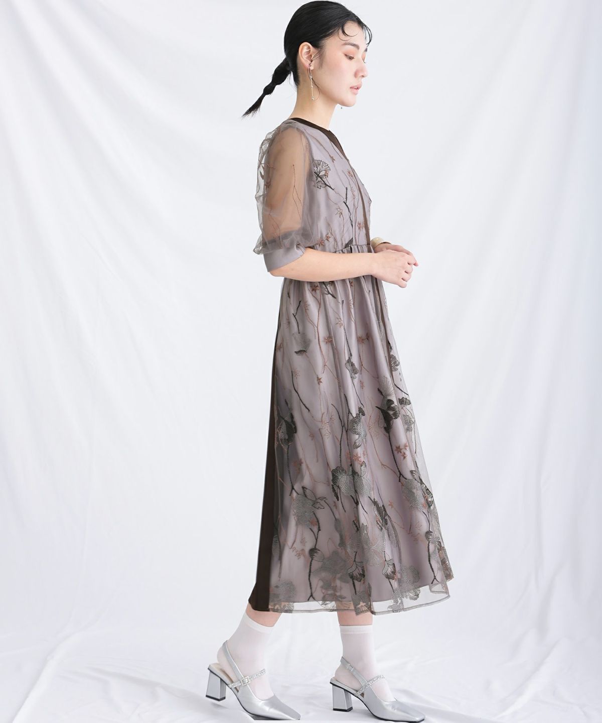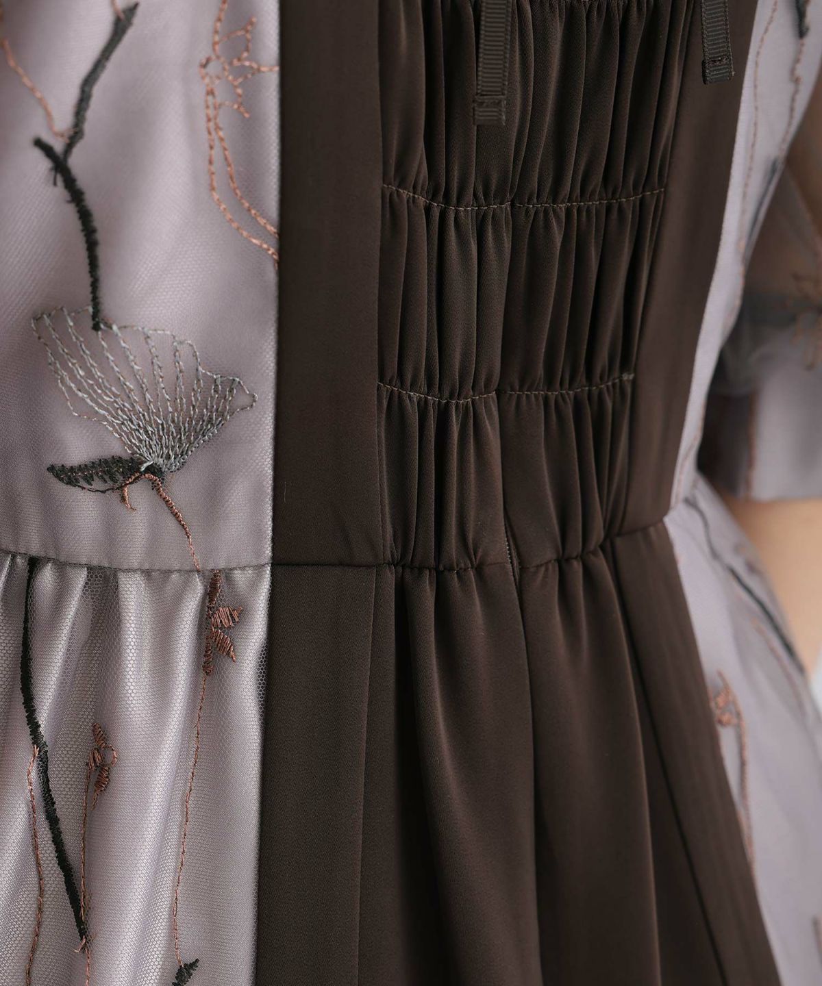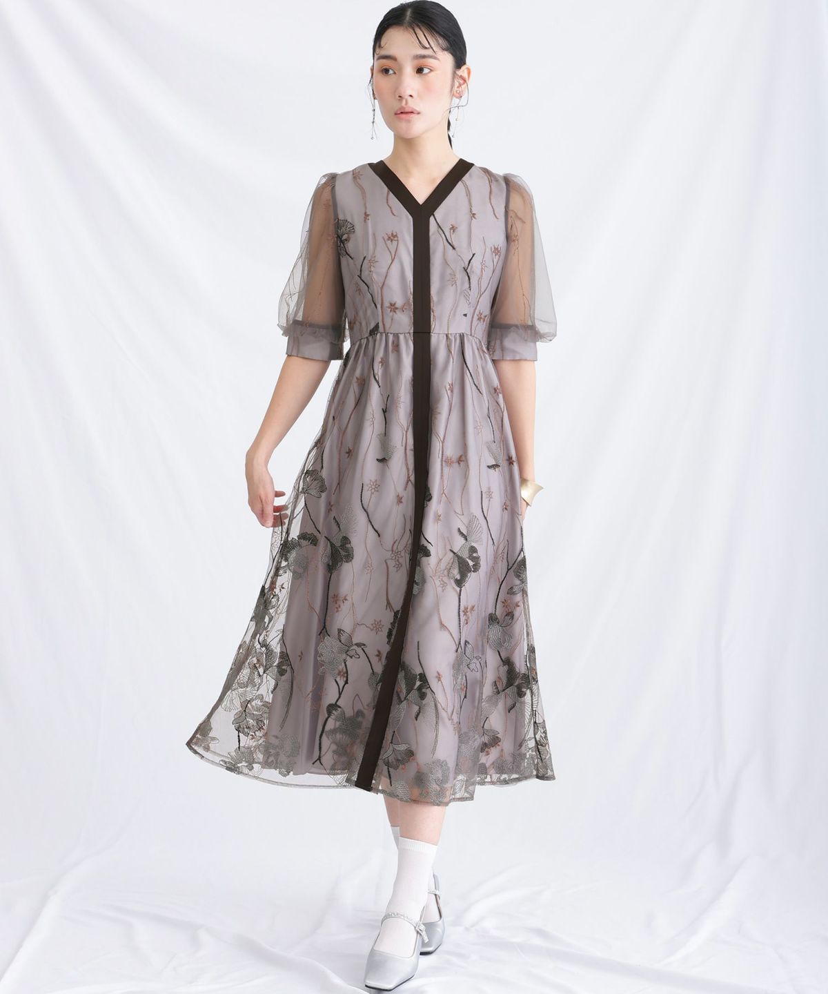 オリジナルの刺繍レースを贅沢に使用 Vネック2素材切替刺繍ドレス