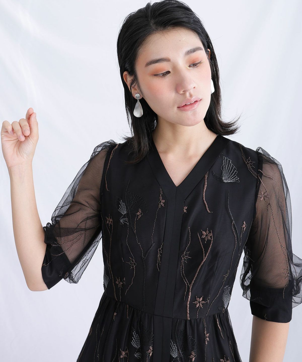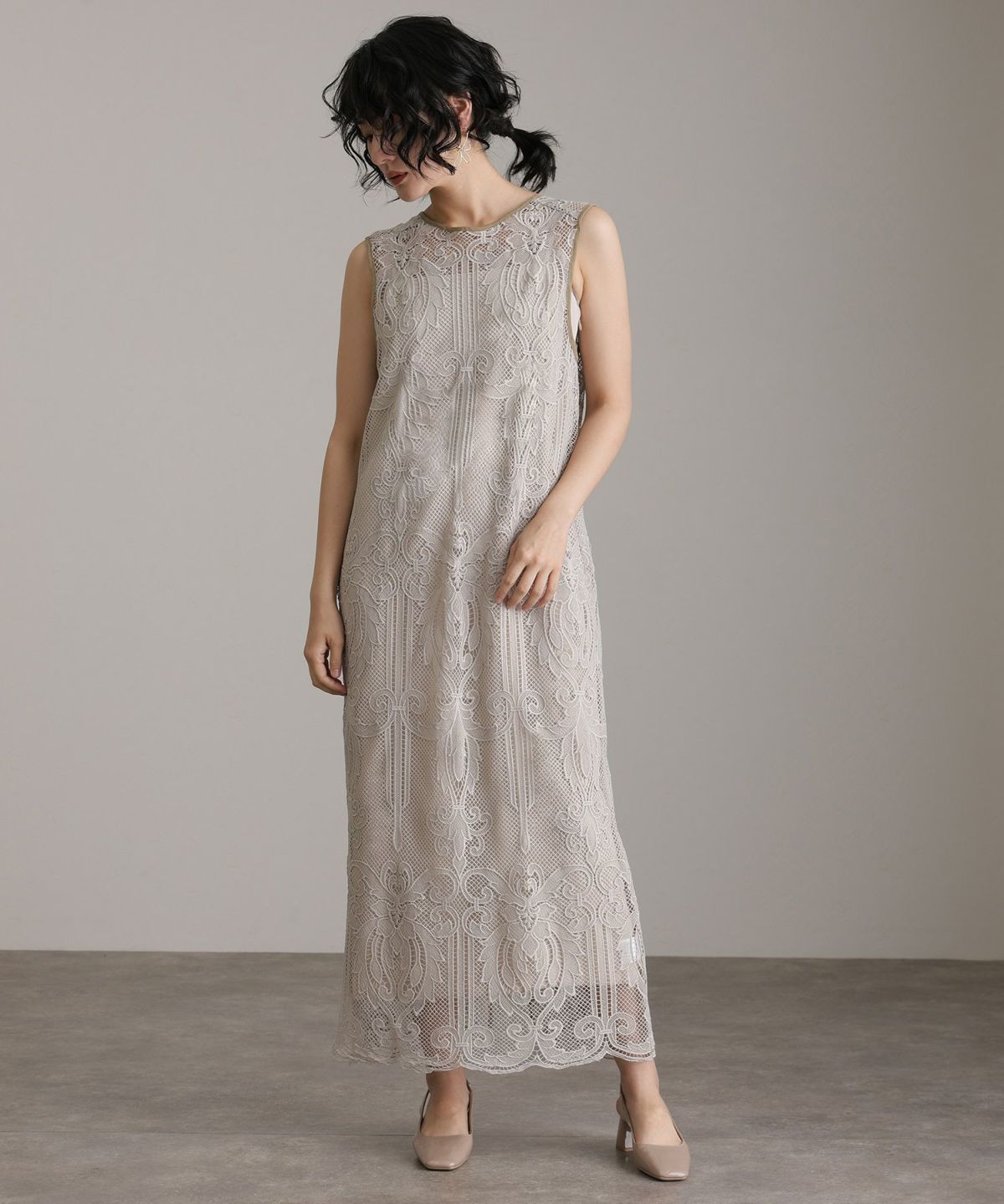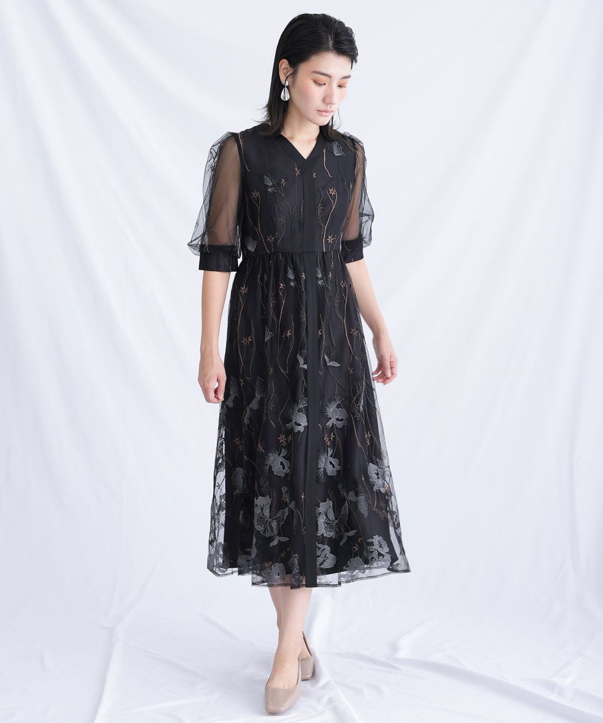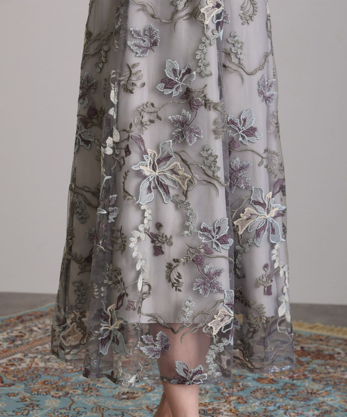 オリジナルの刺繍レースを贅沢に使用 Vネック2素材切替刺繍ドレス