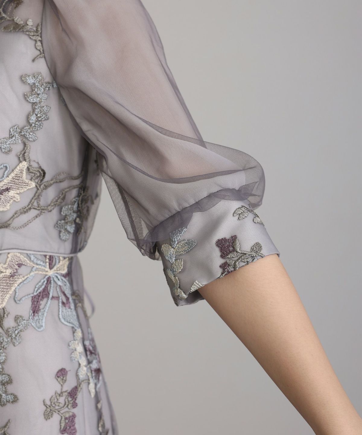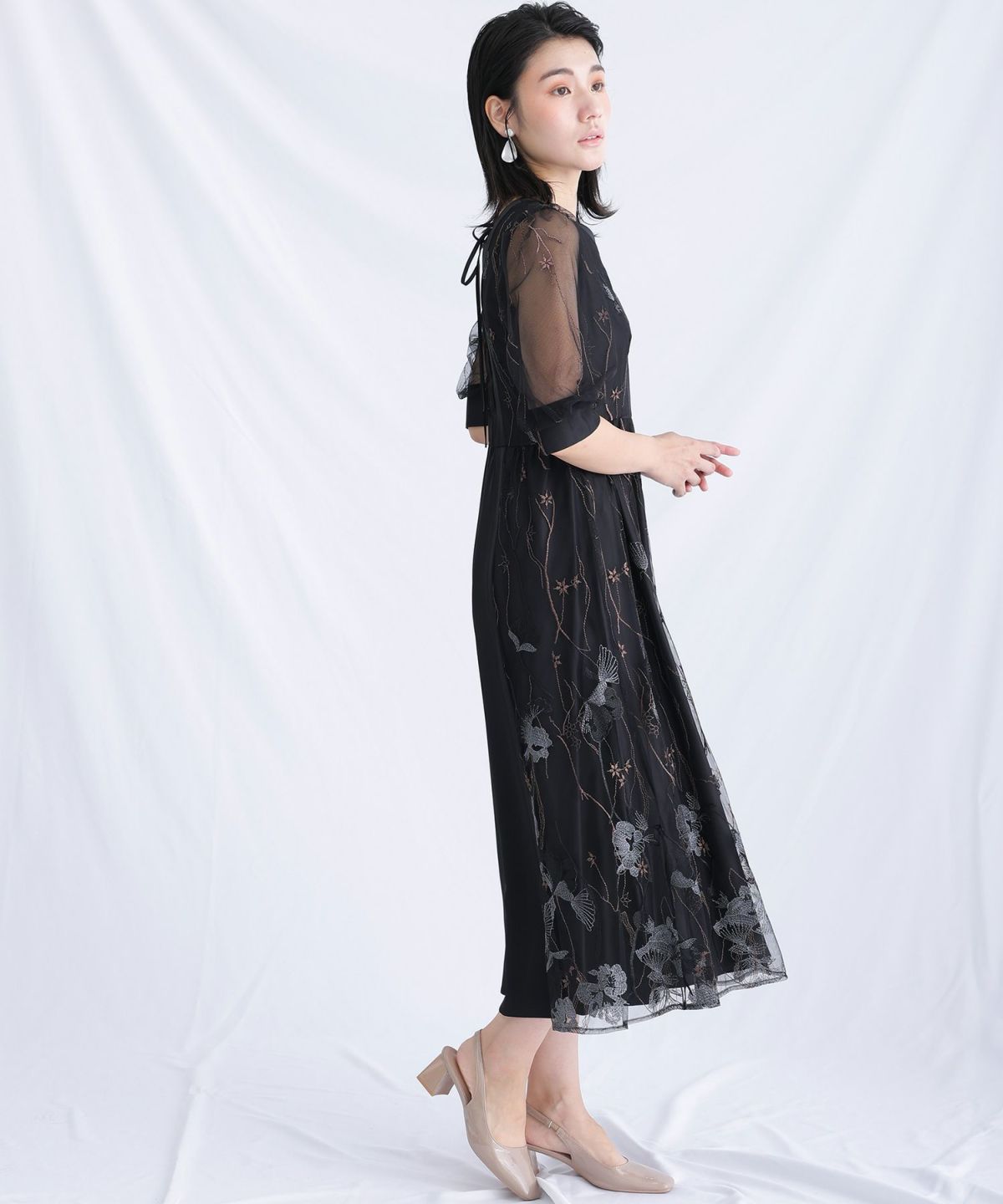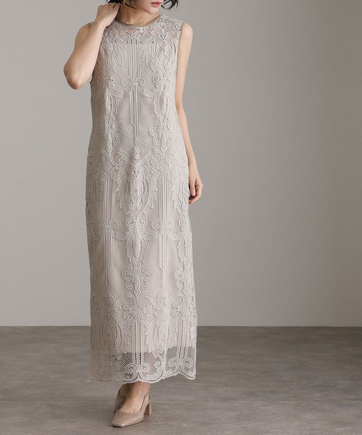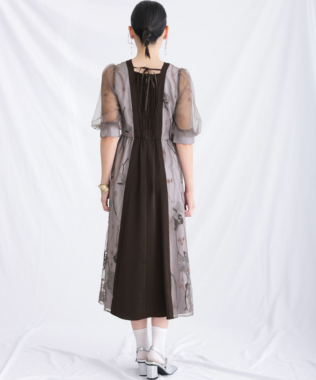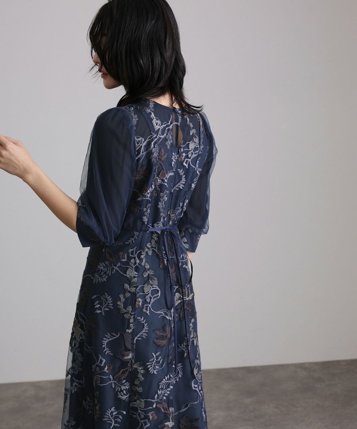 オリジナルの刺繍レースを贅沢に使用 Vネック2素材切替刺繍ドレス