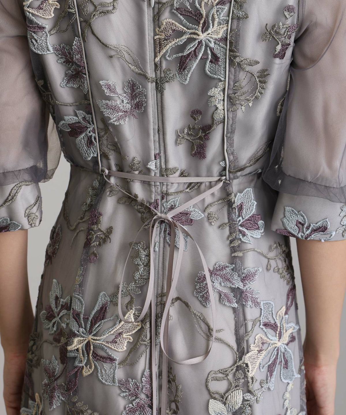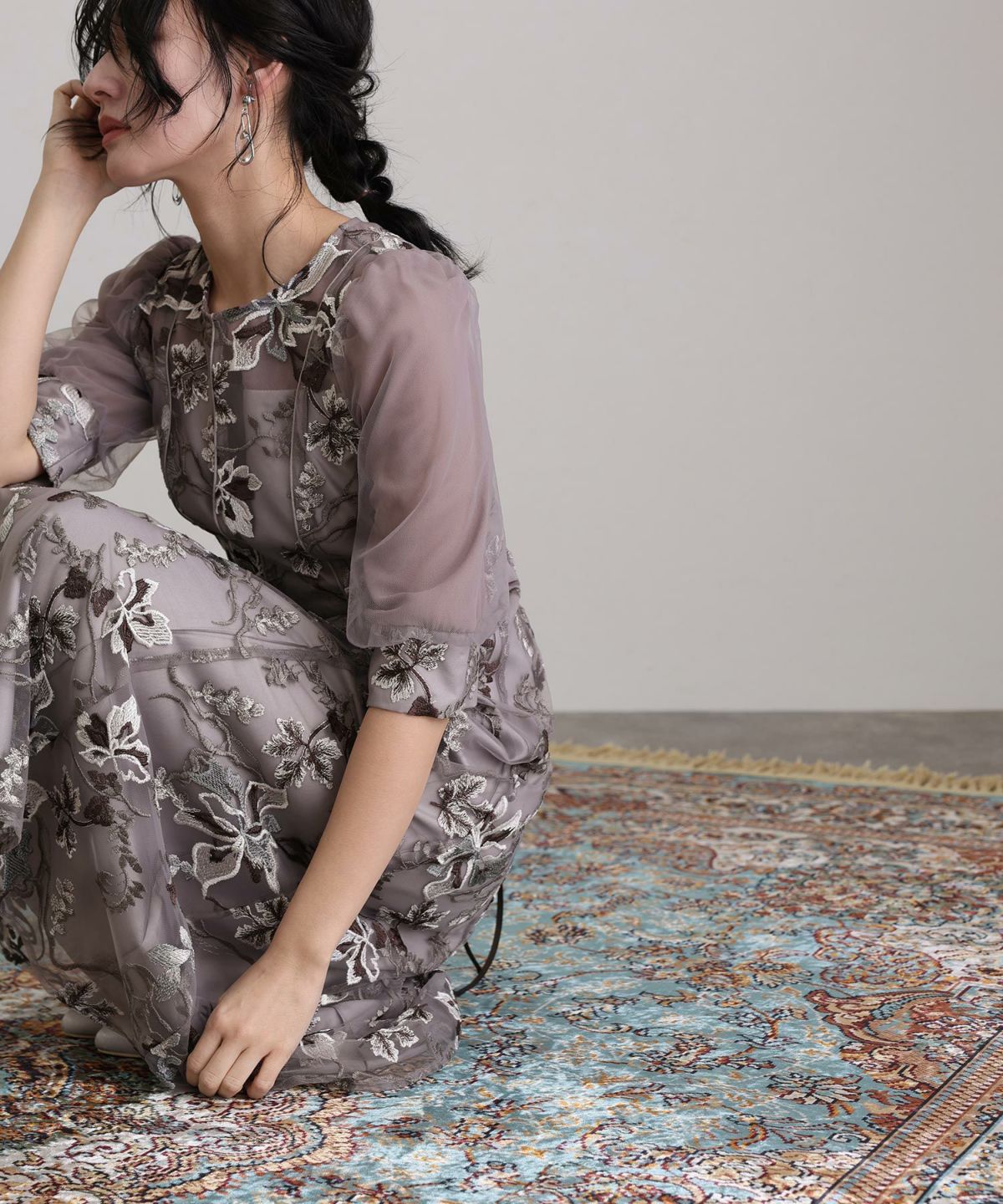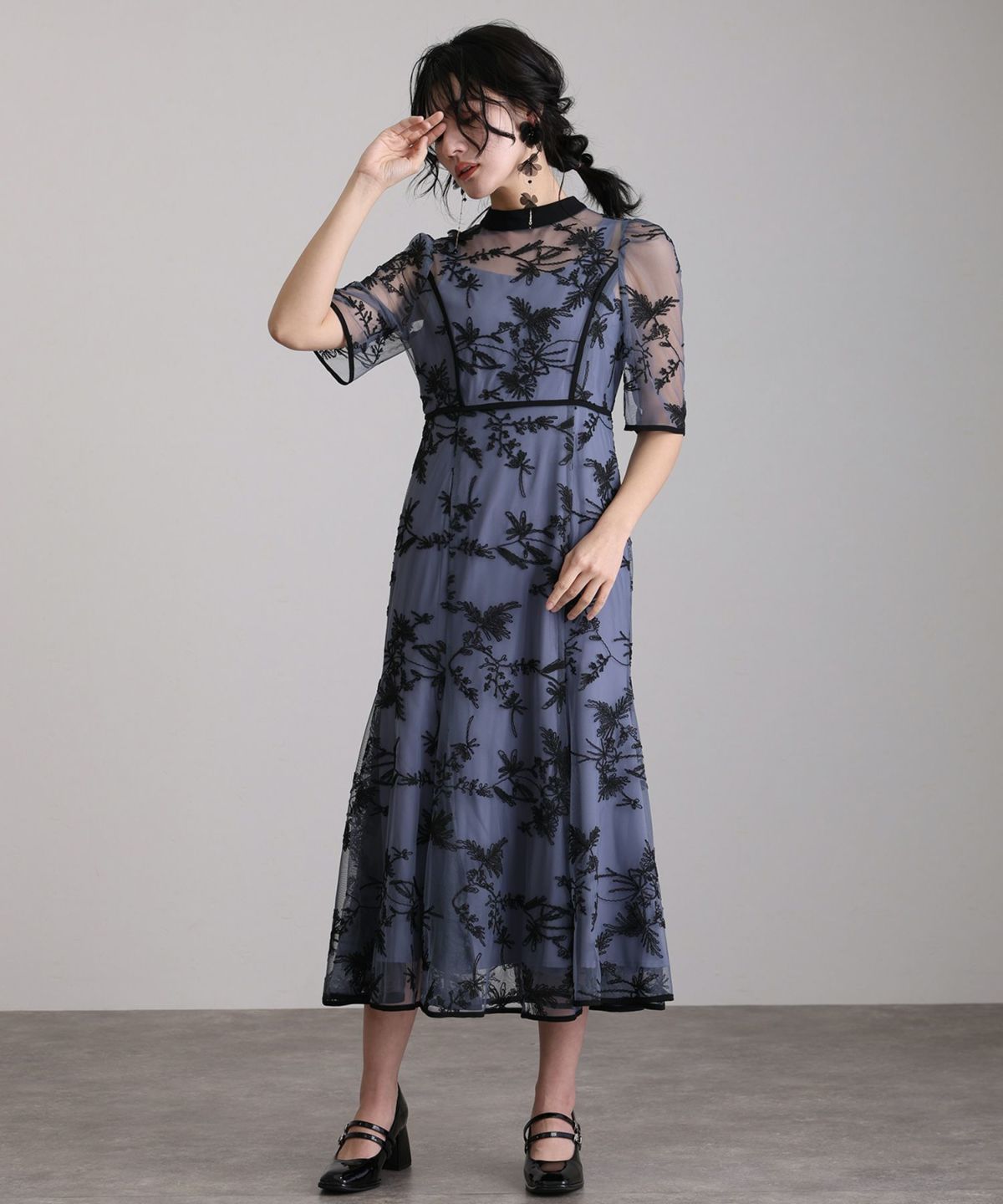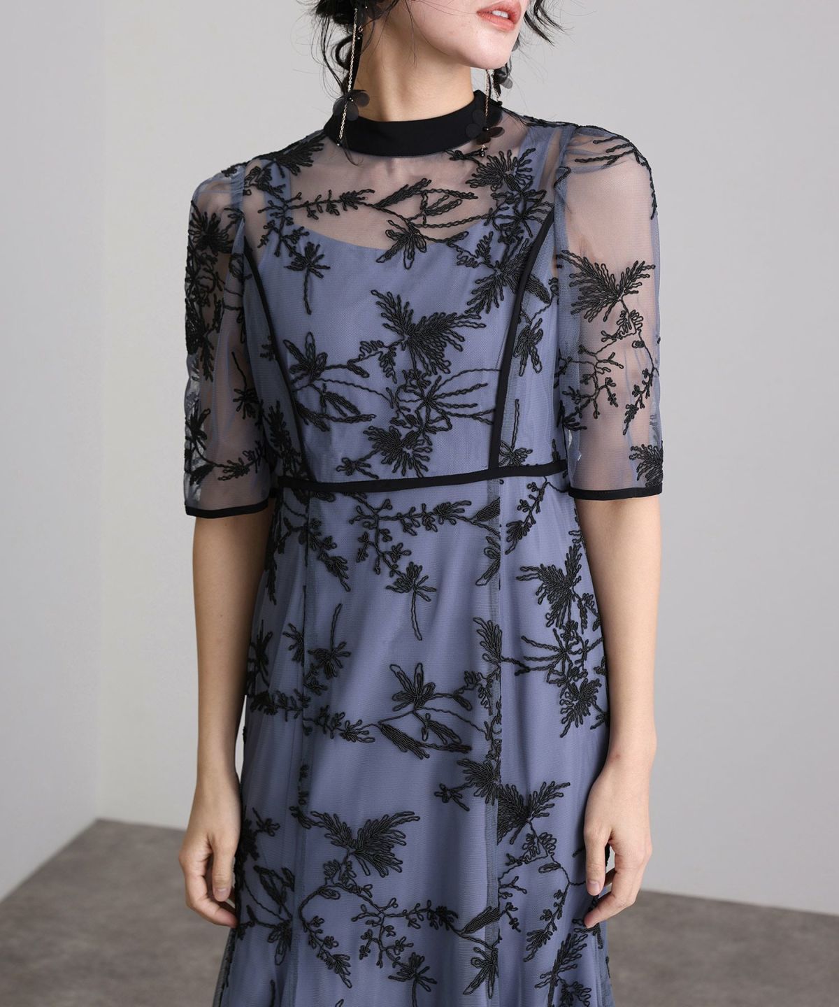 花柄の刺繍がエレガント 刺繍レースパイピングワンピース