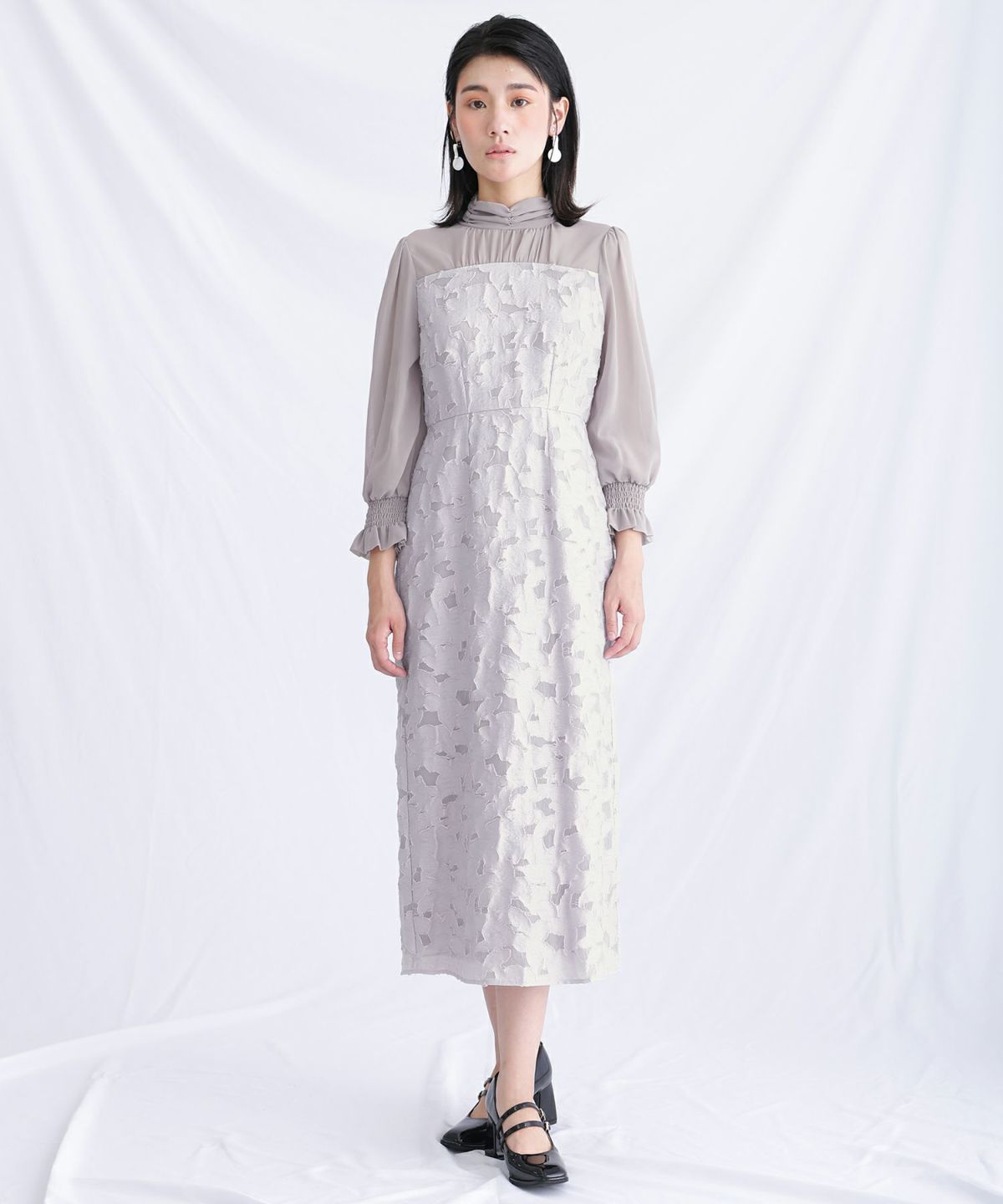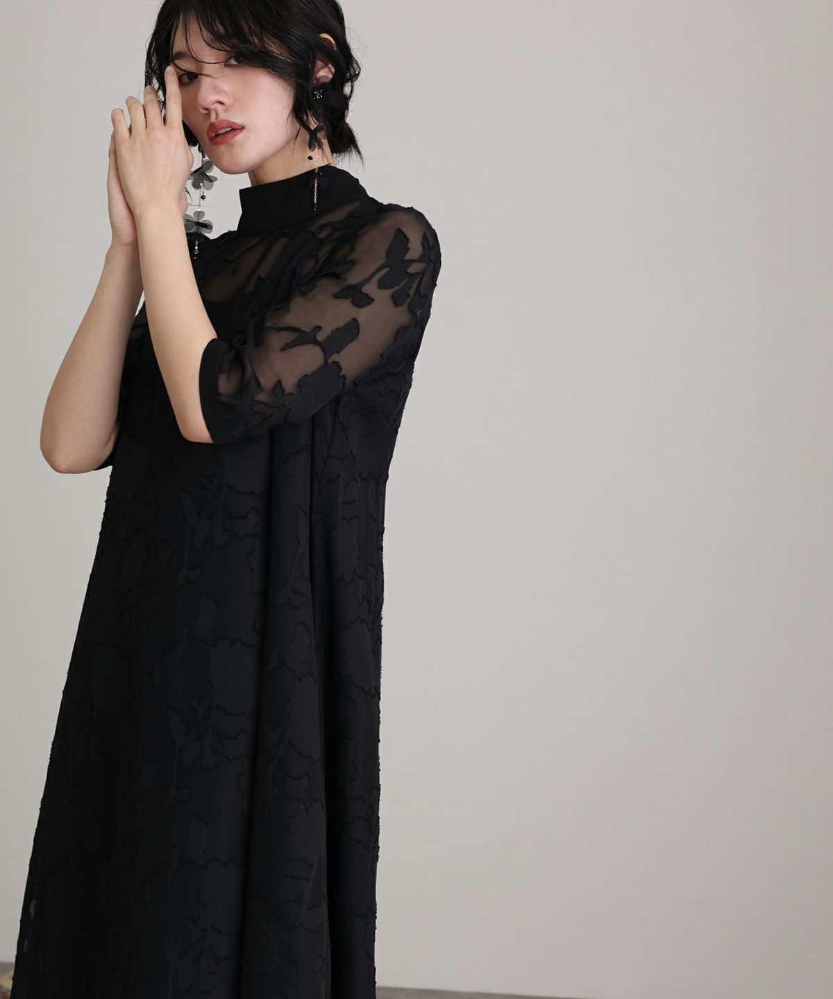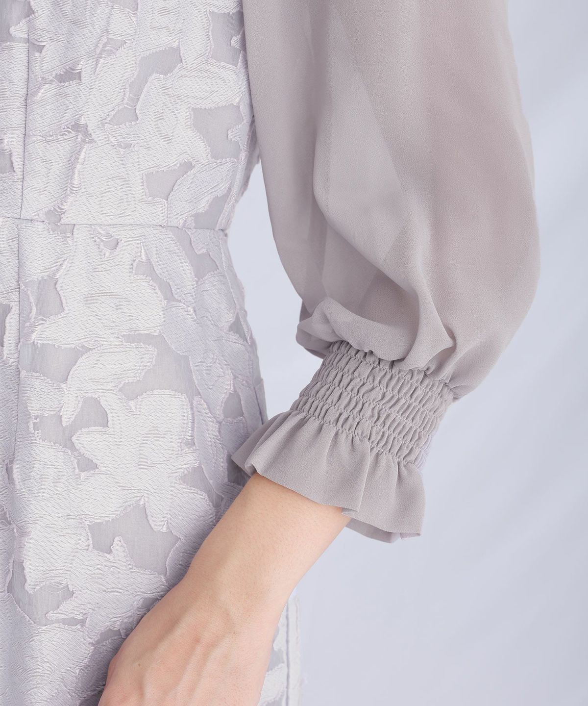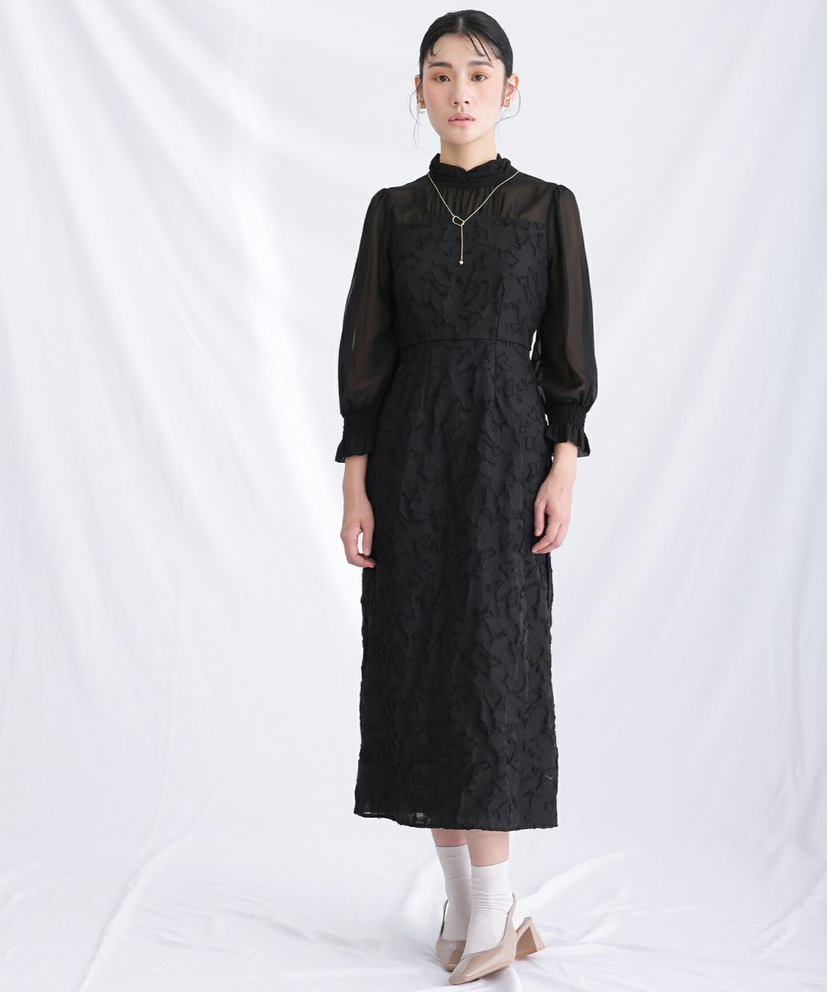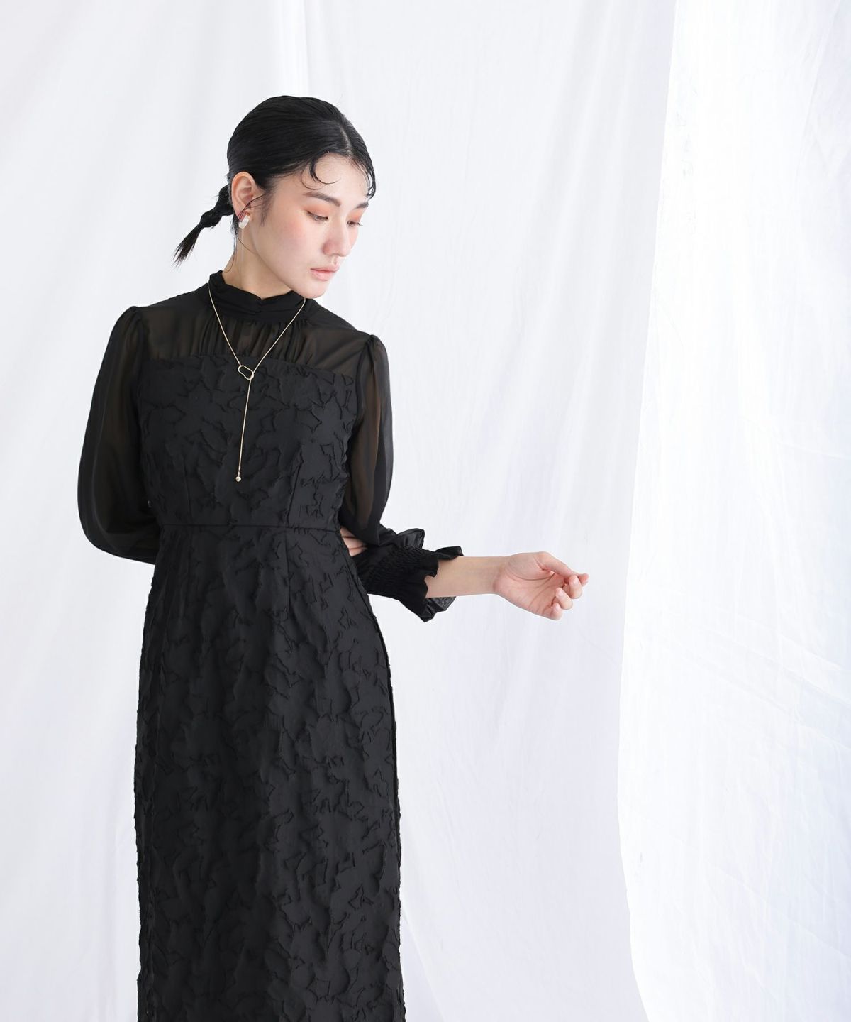 袖とデコルテの程よいシアー感が個性的 フラワージャガードワンピース