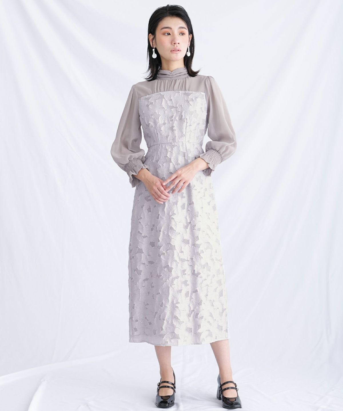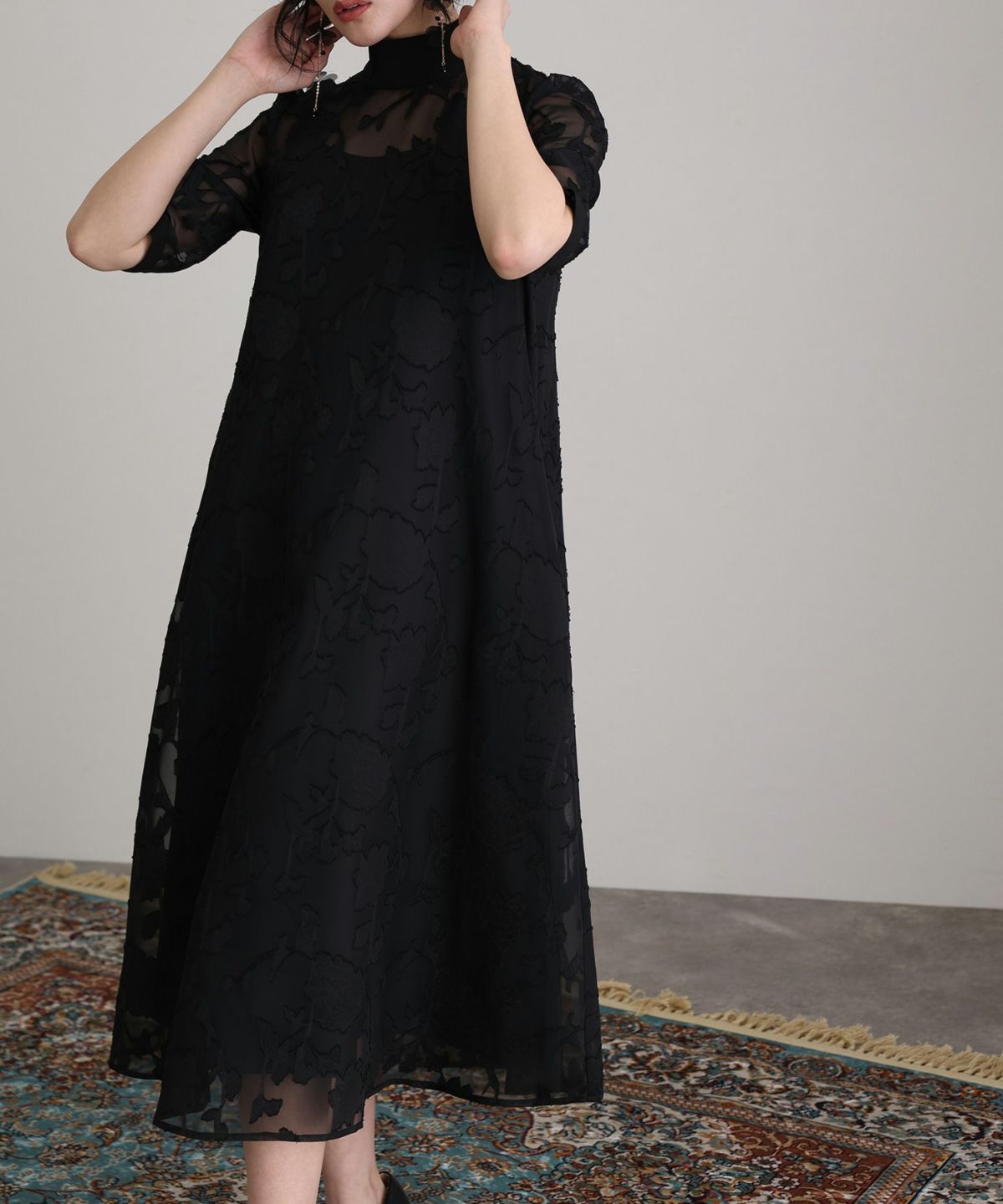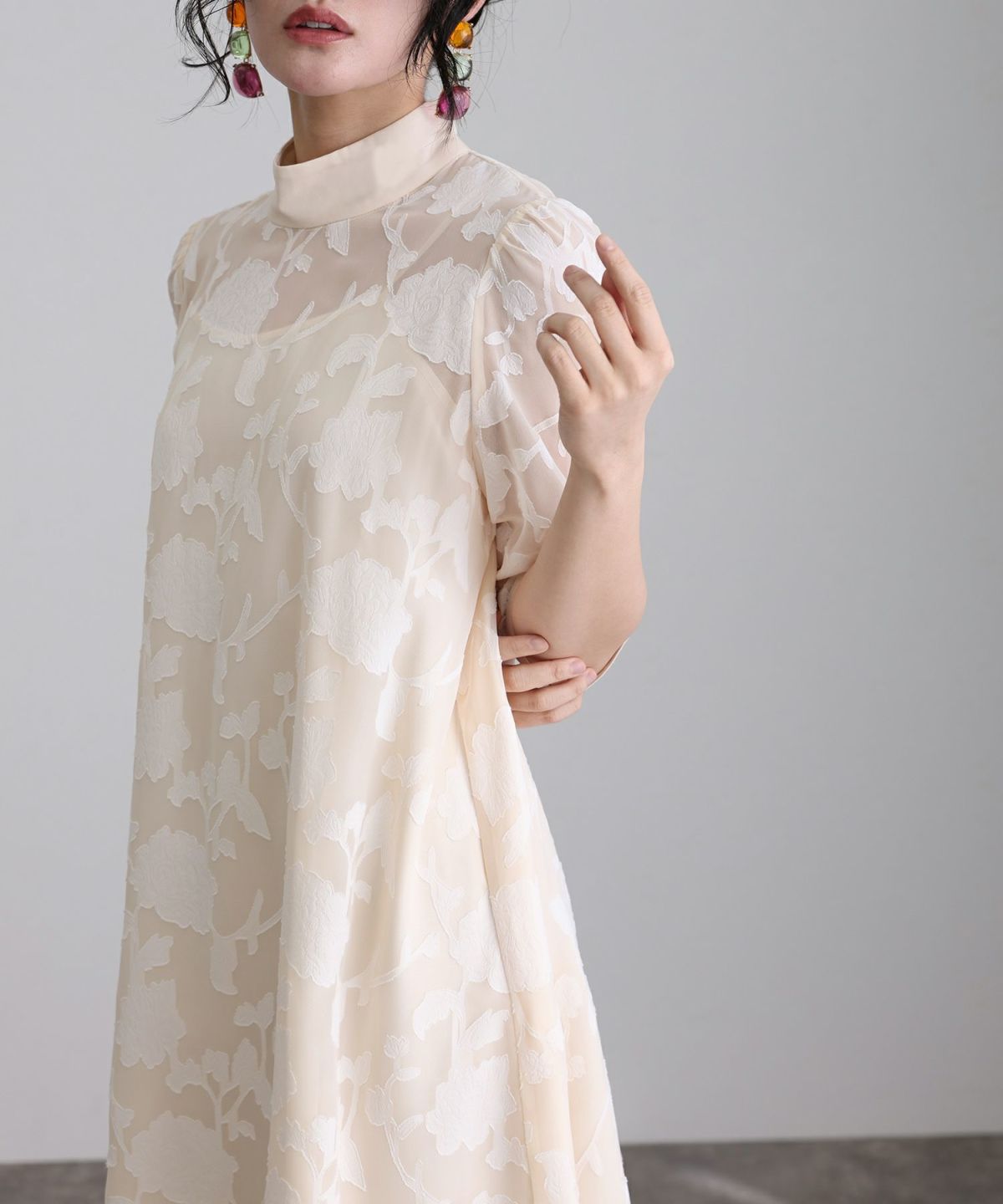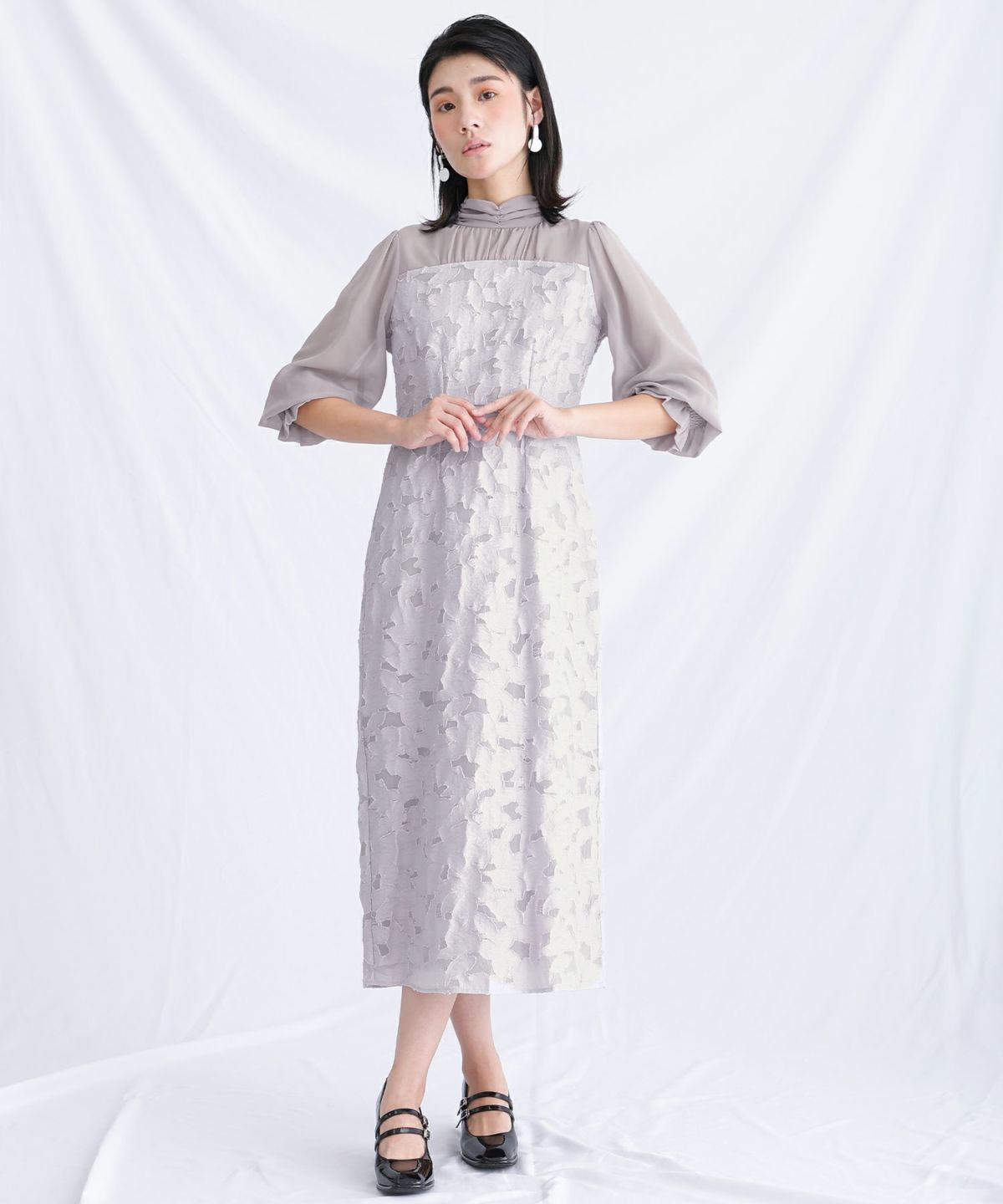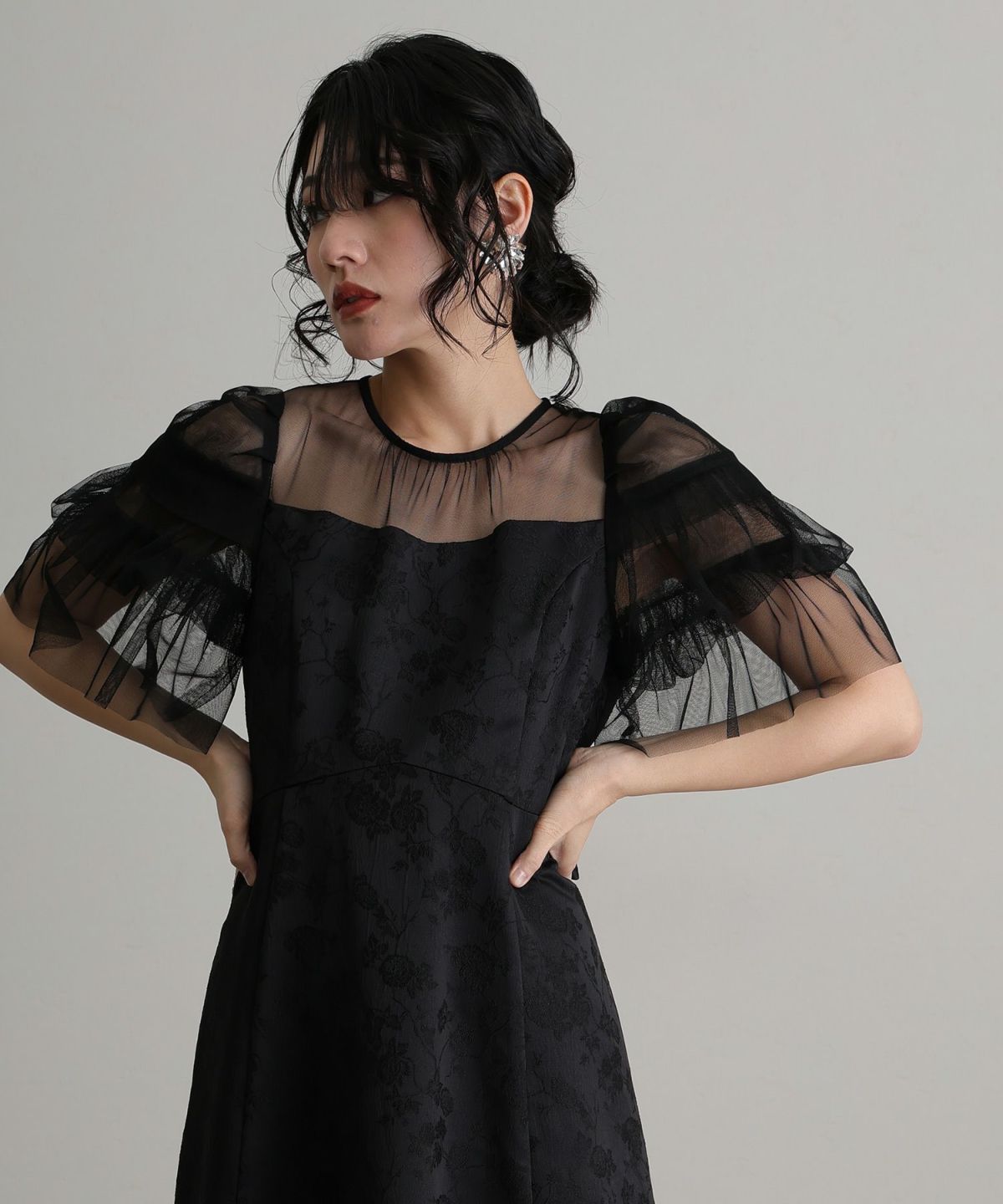 袖とデコルテの程よいシアー感が個性的 フラワージャガードワンピース