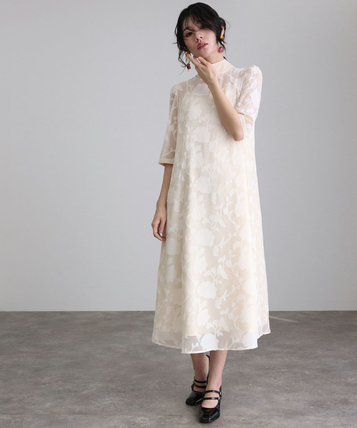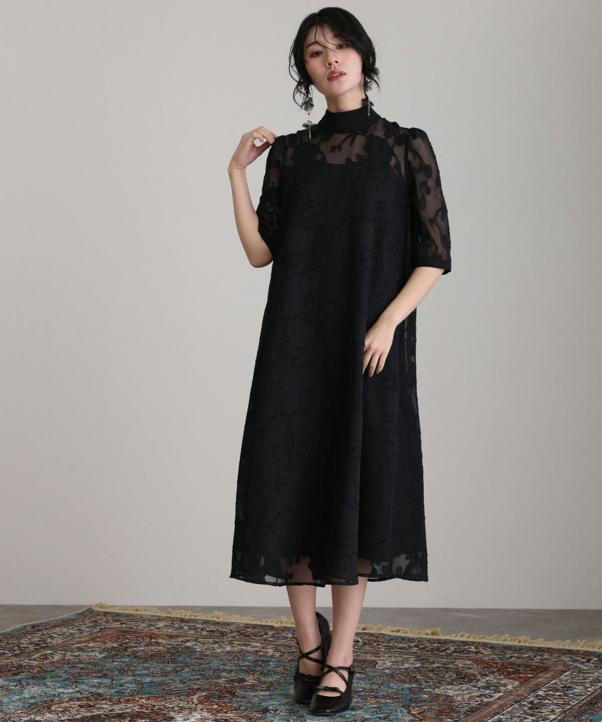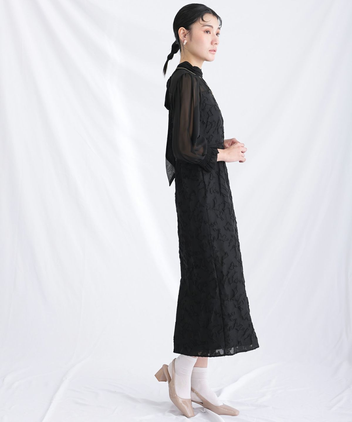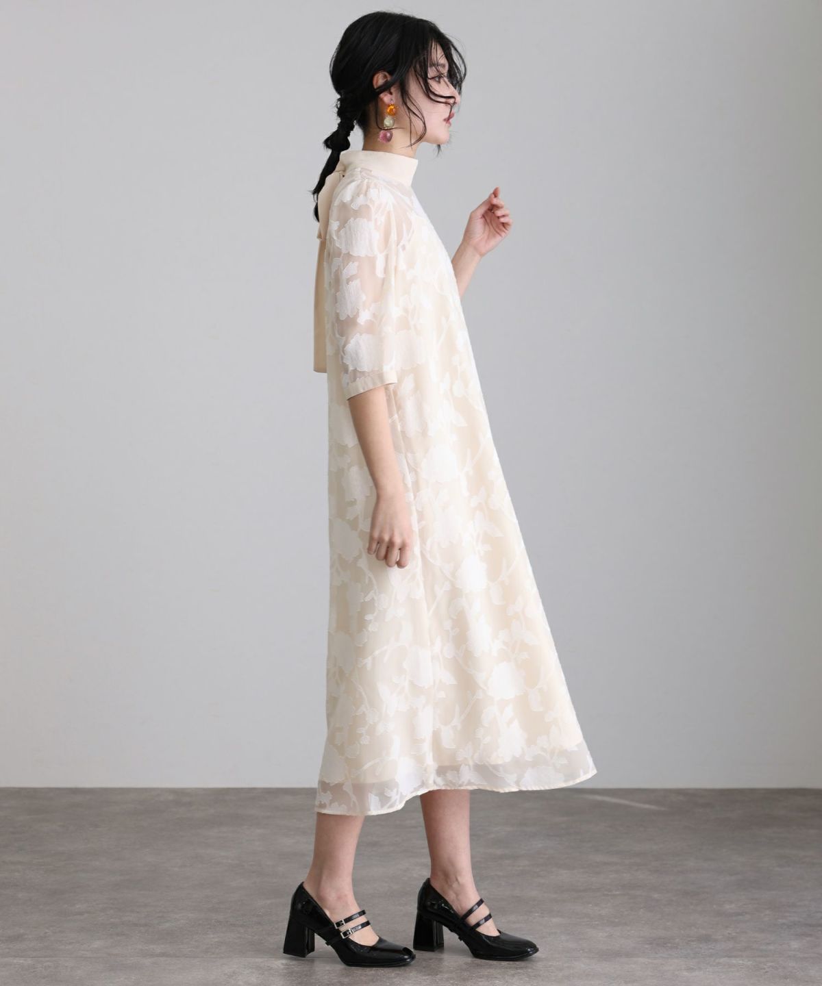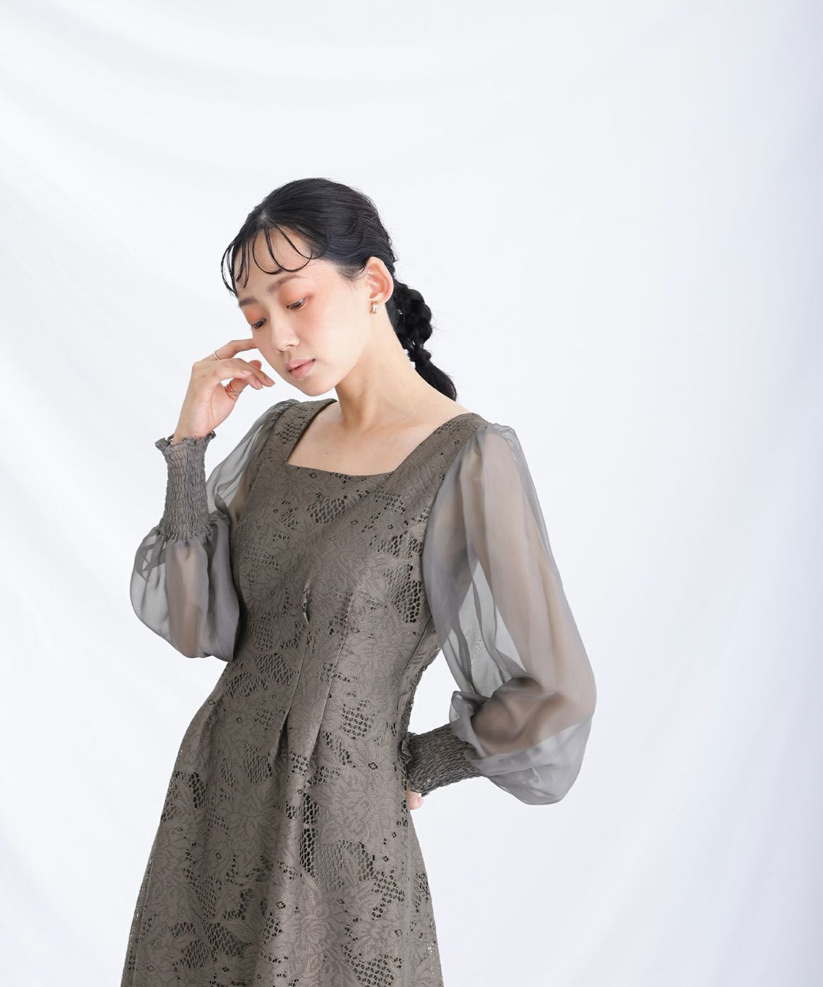 袖とデコルテの程よいシアー感が個性的 フラワージャガードワンピース