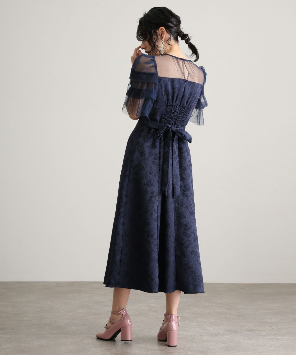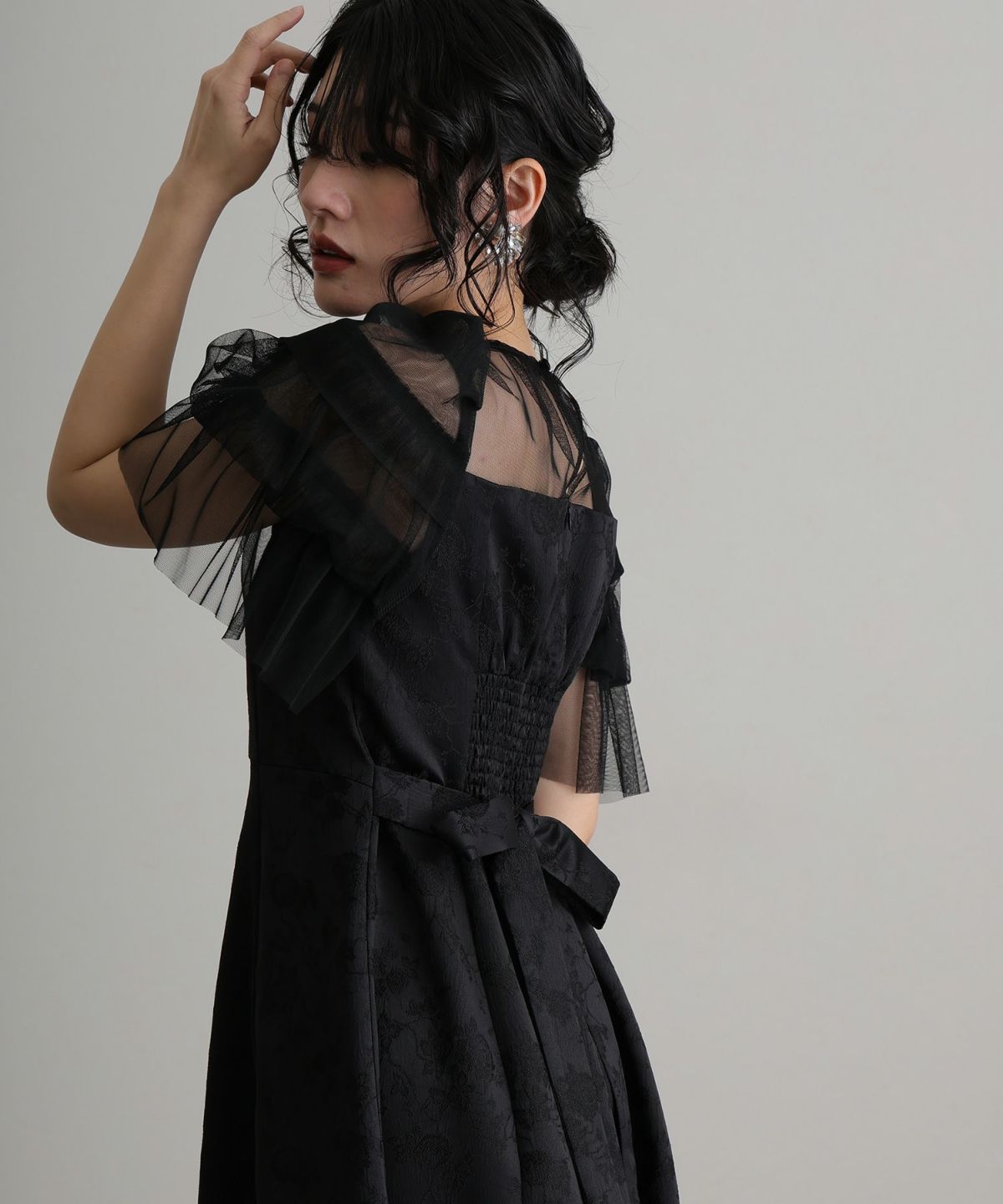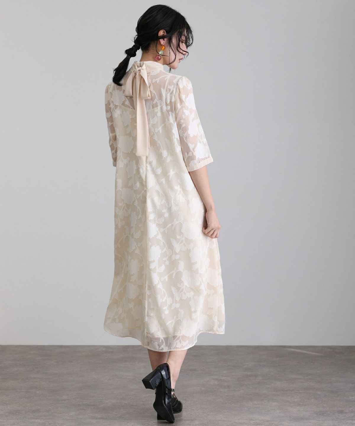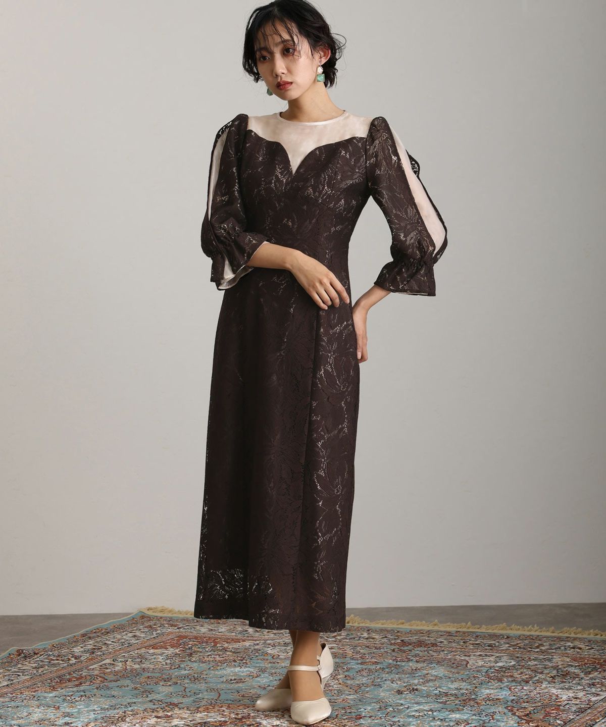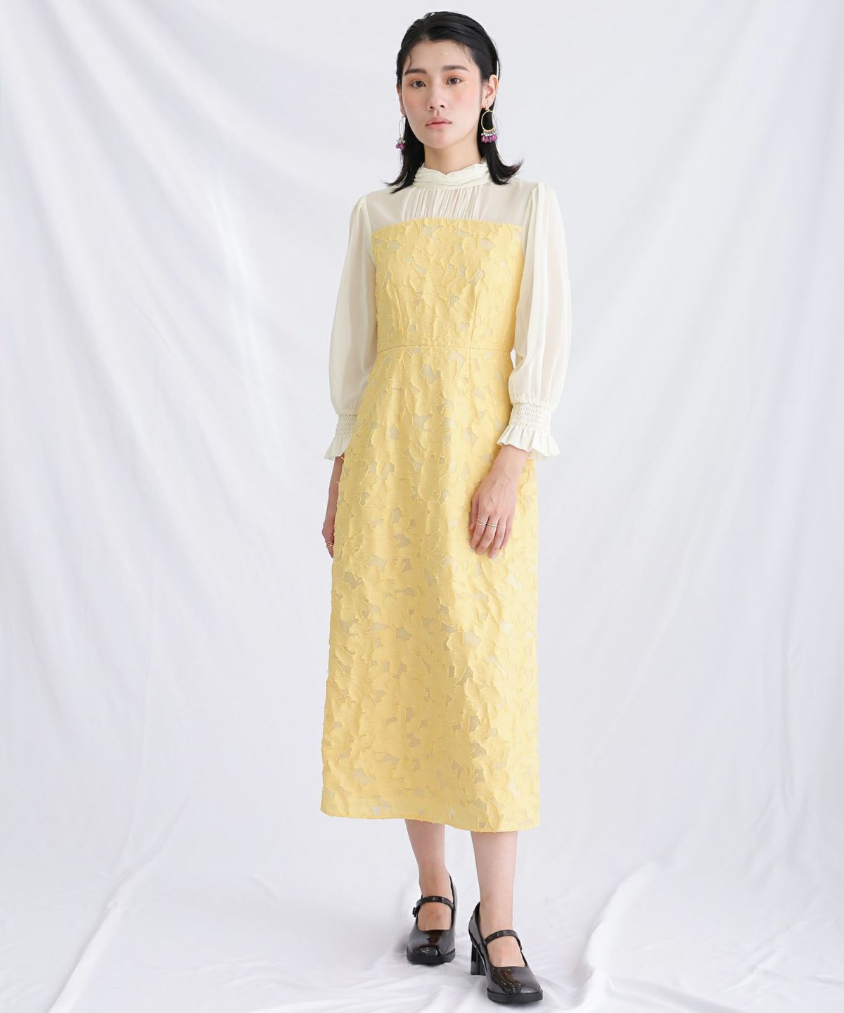 袖とデコルテの程よいシアー感が個性的 フラワージャガードワンピース