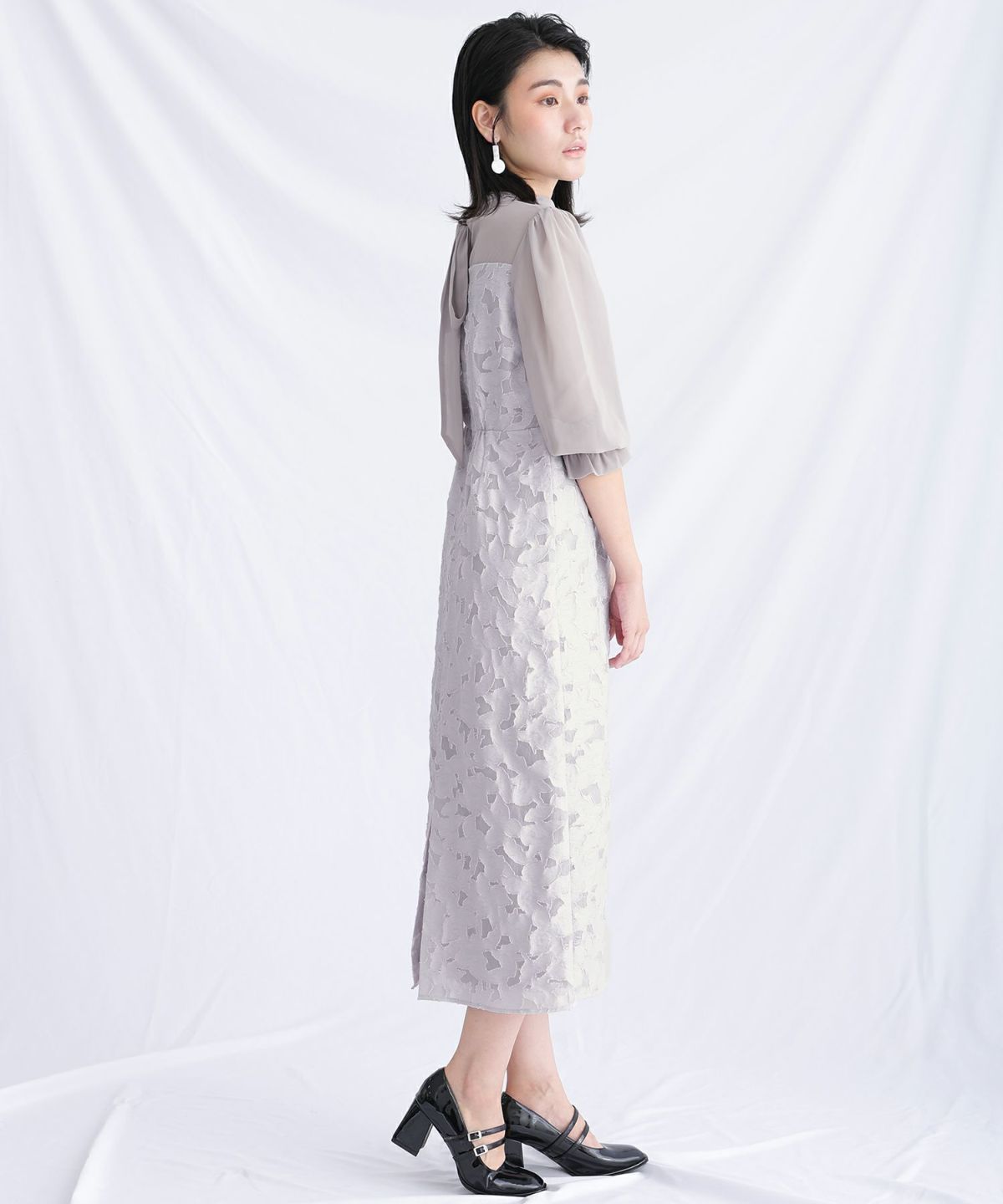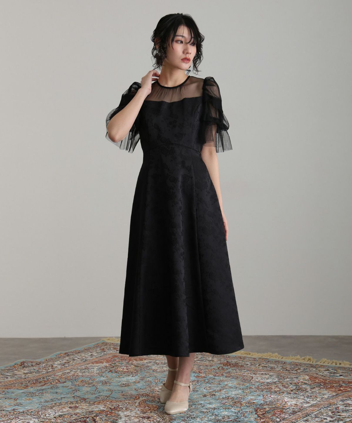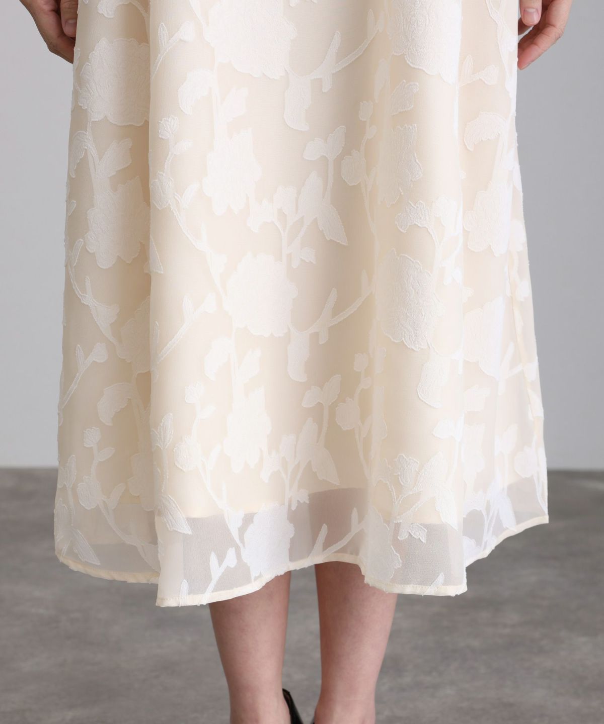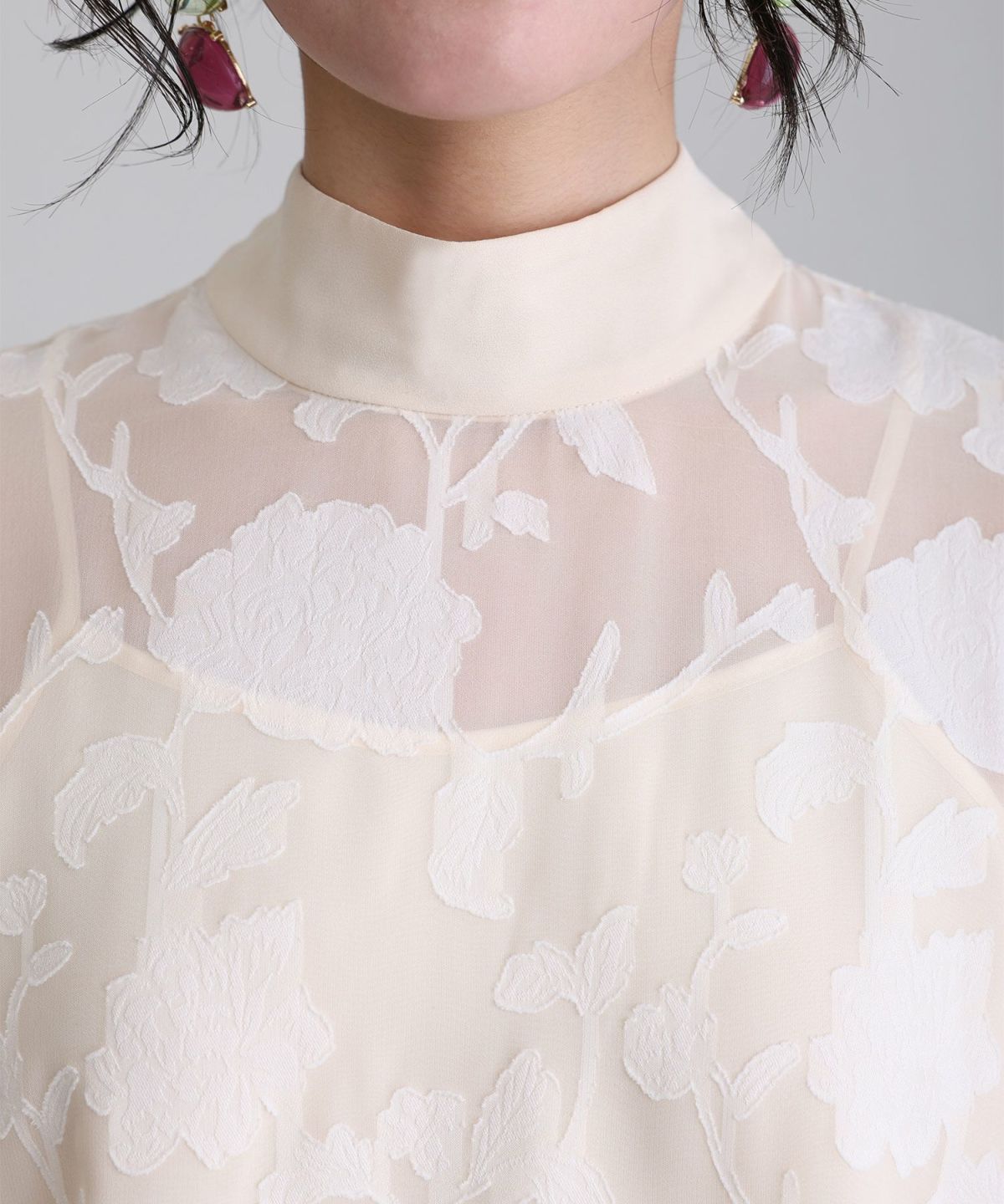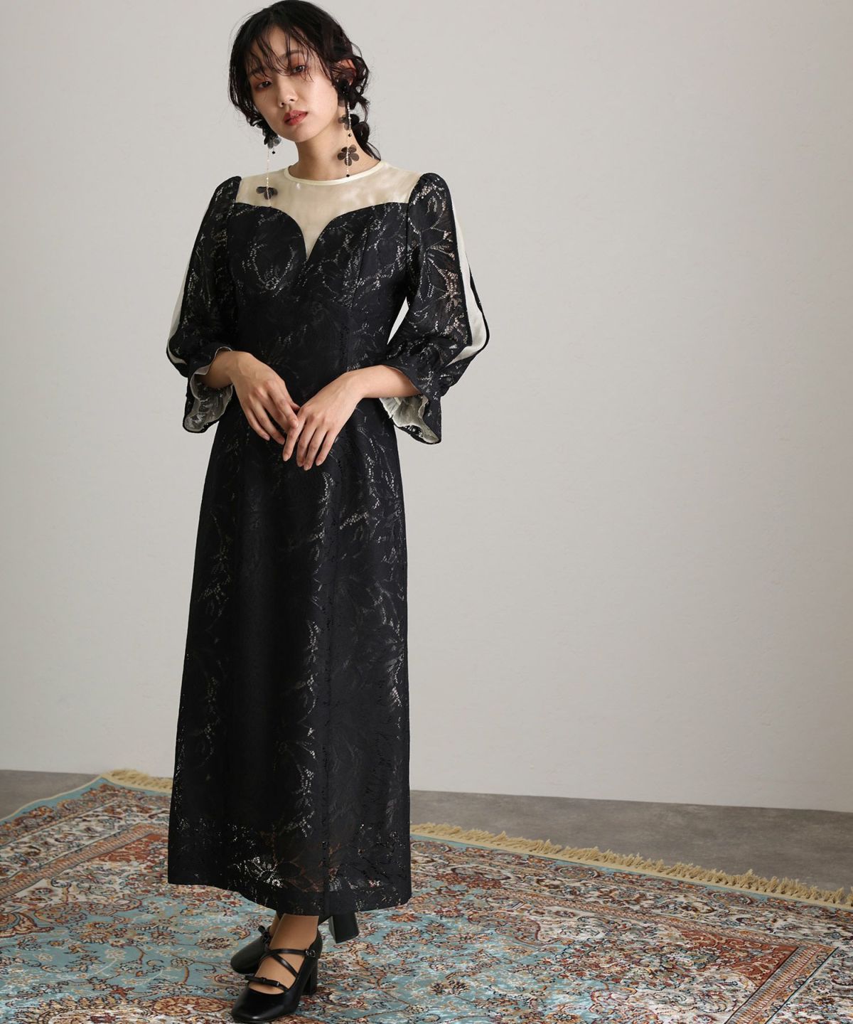 袖とデコルテの程よいシアー感が個性的 フラワージャガードワンピース