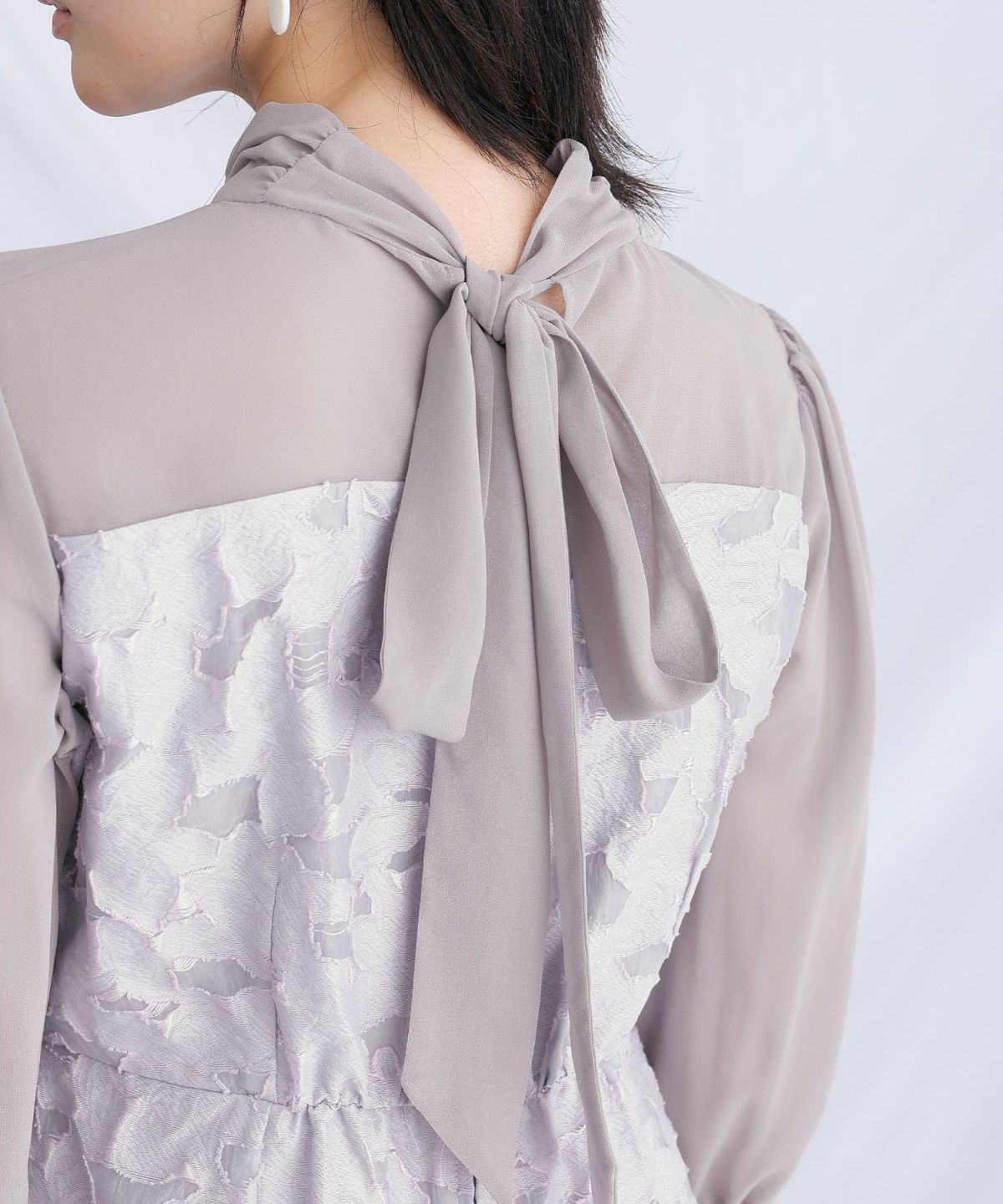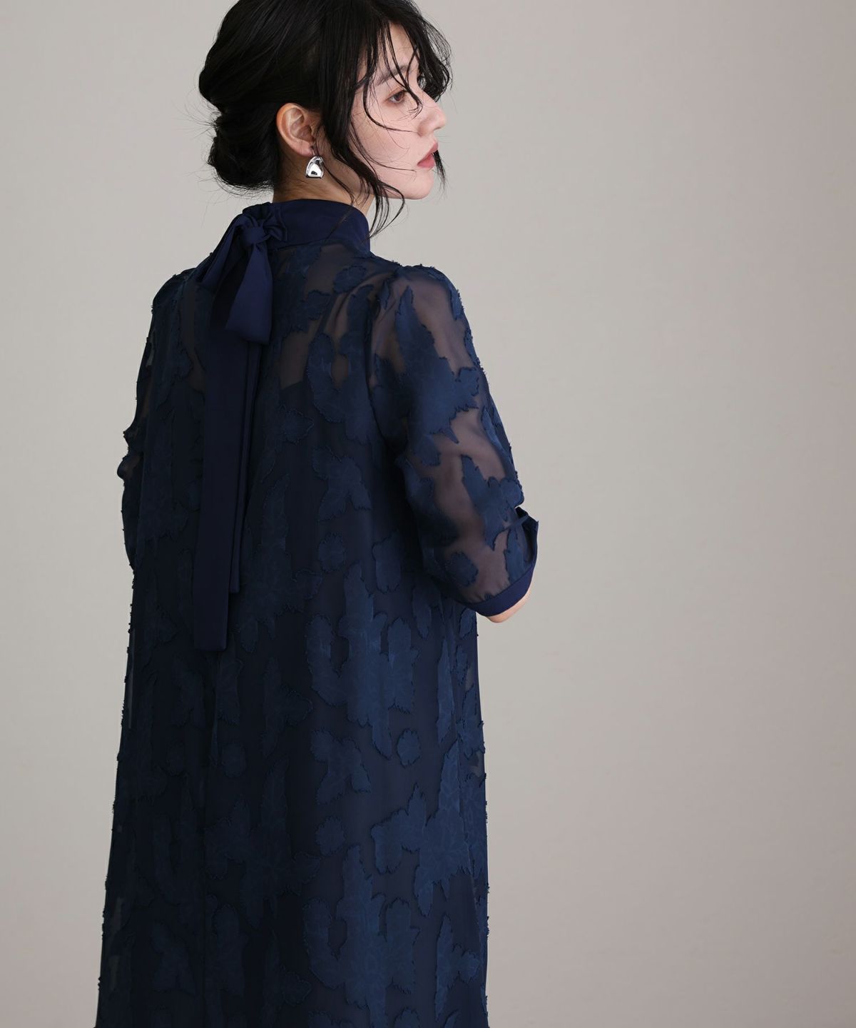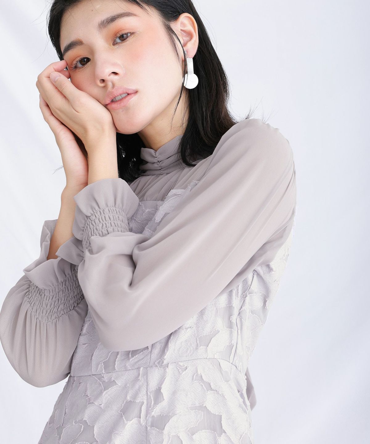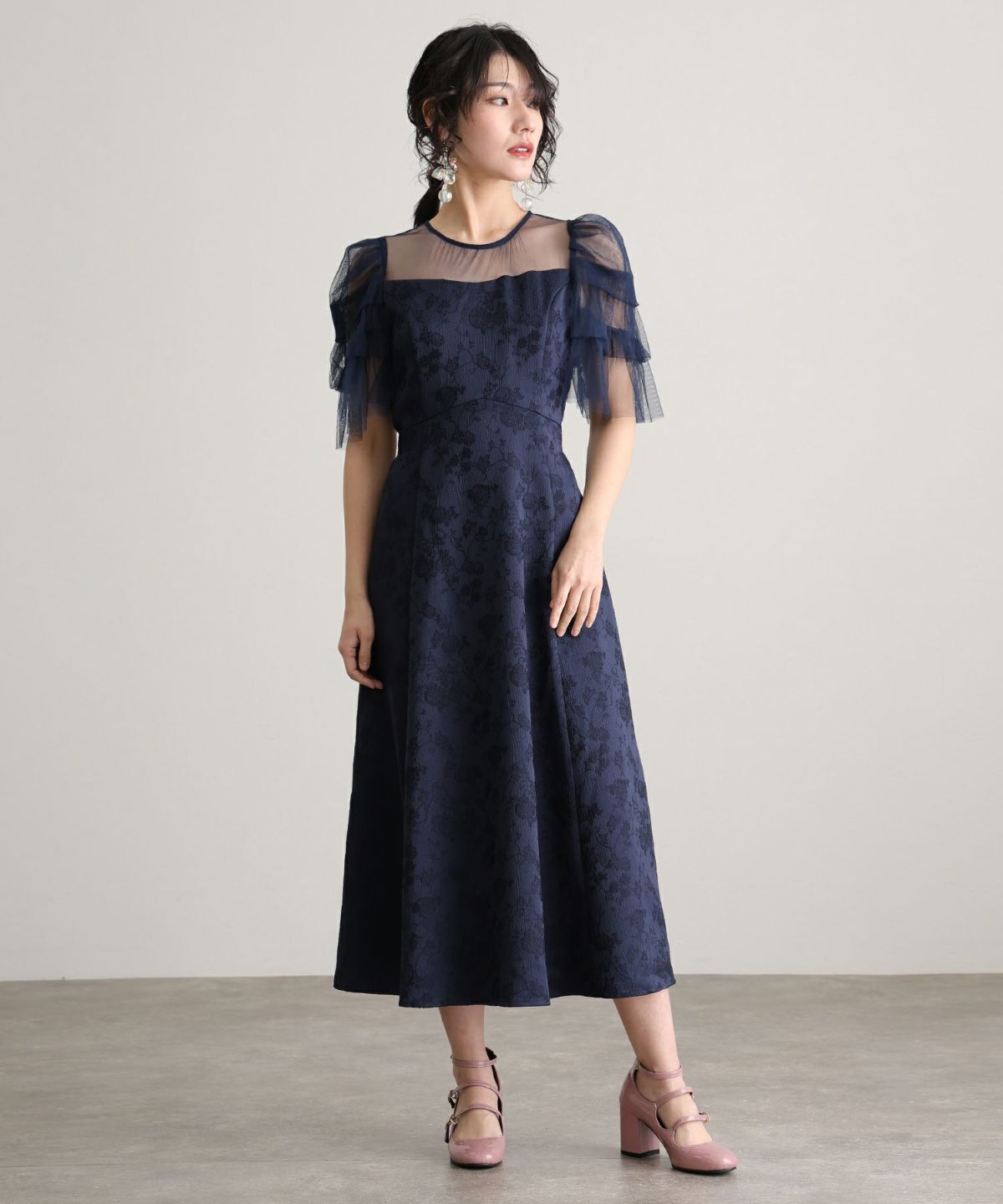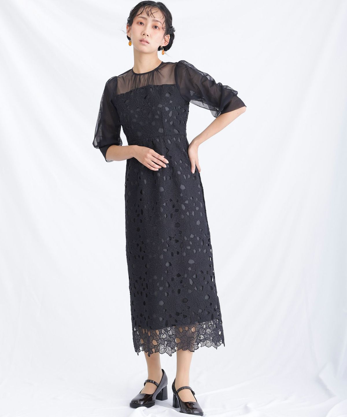 袖とデコルテの程よいシアー感が個性的 フラワージャガードワンピース