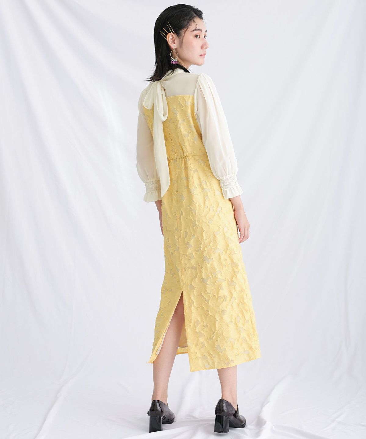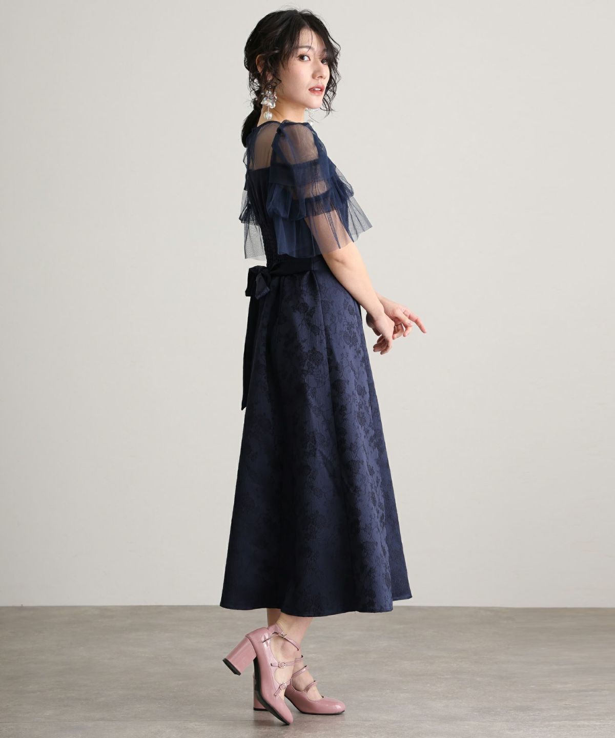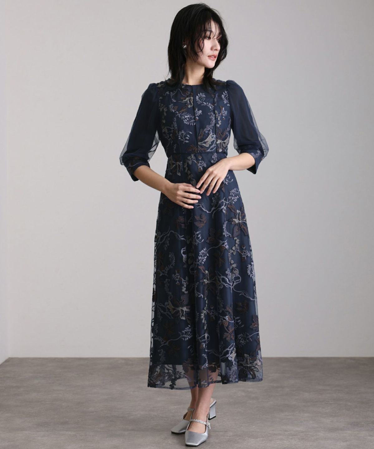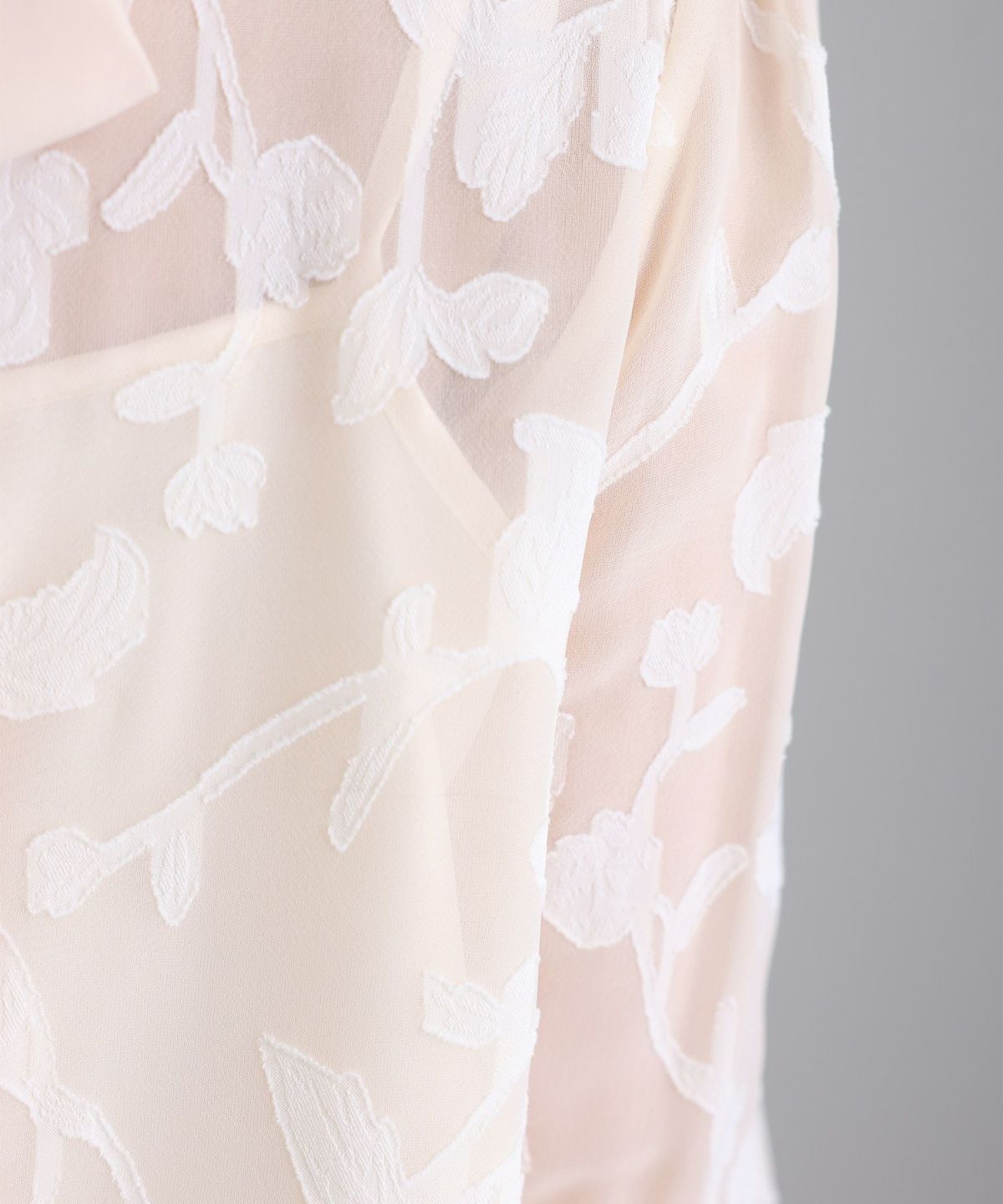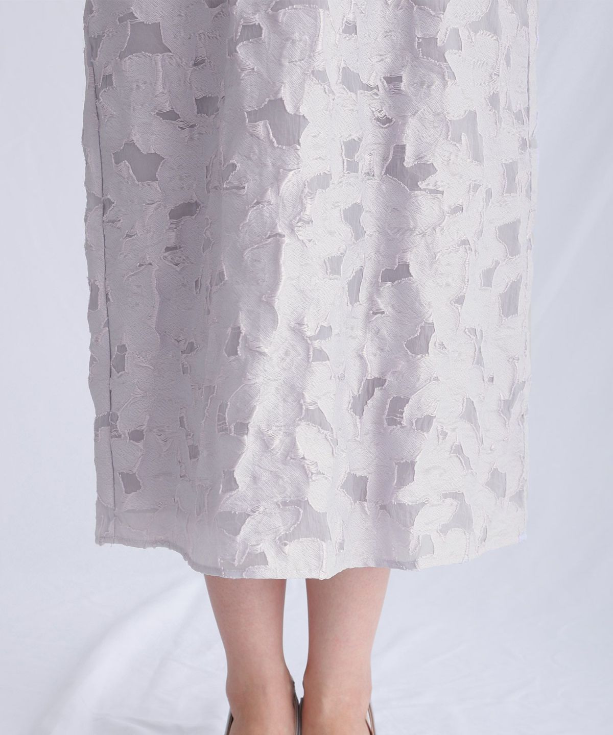 袖とデコルテの程よいシアー感が個性的 フラワージャガードワンピース