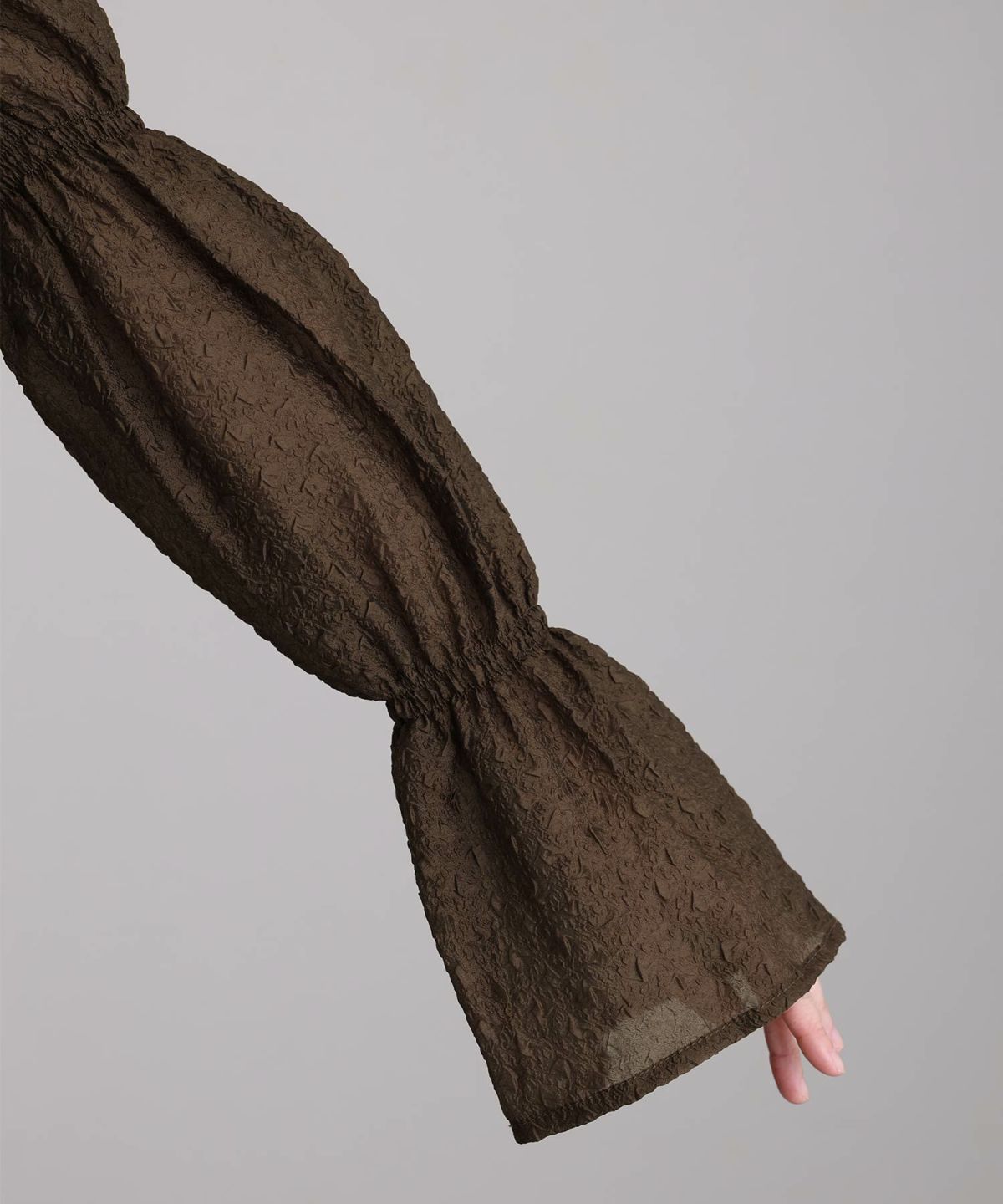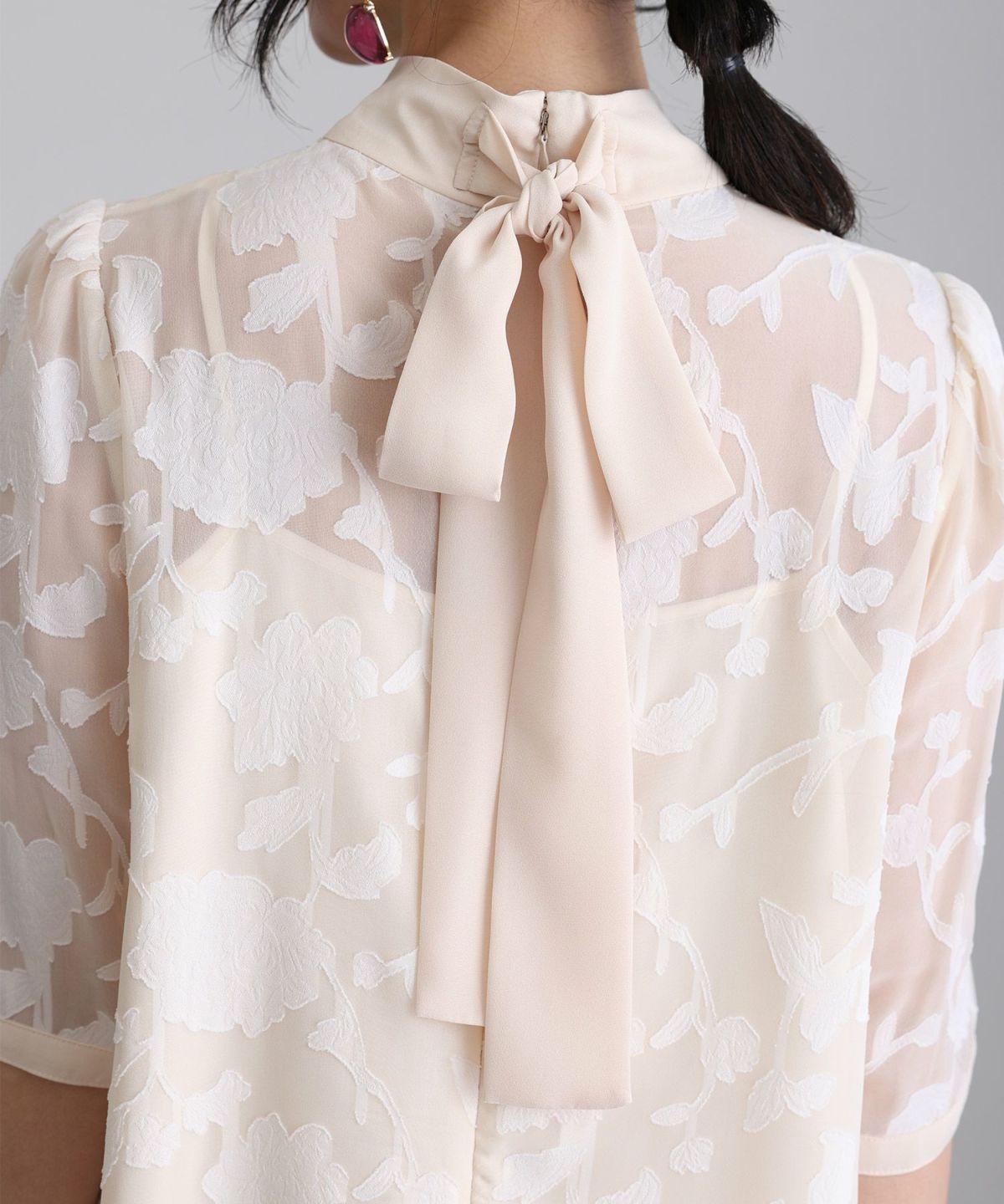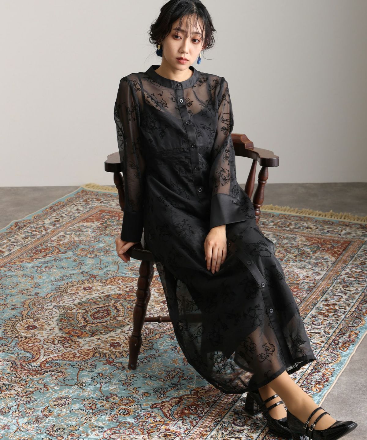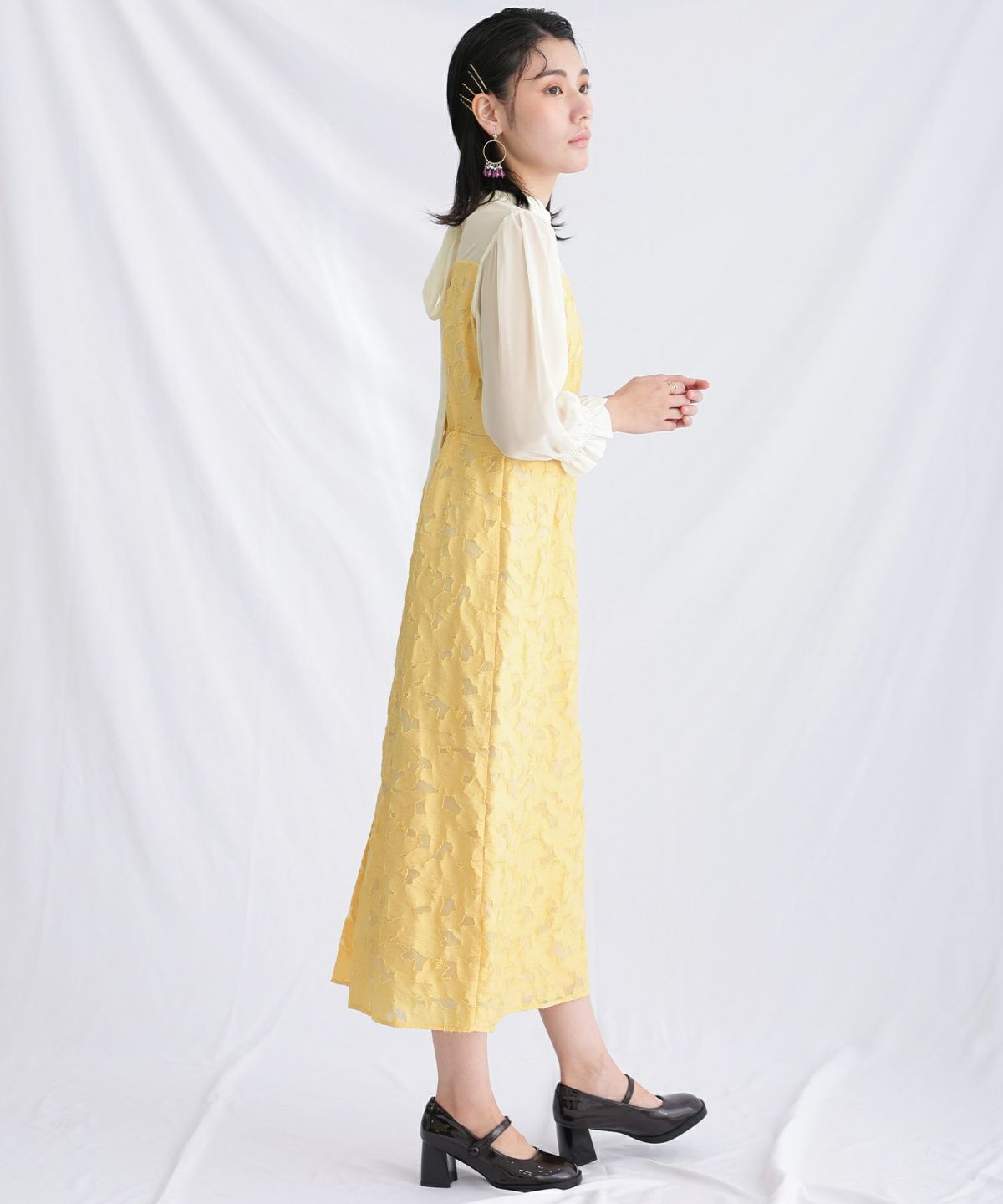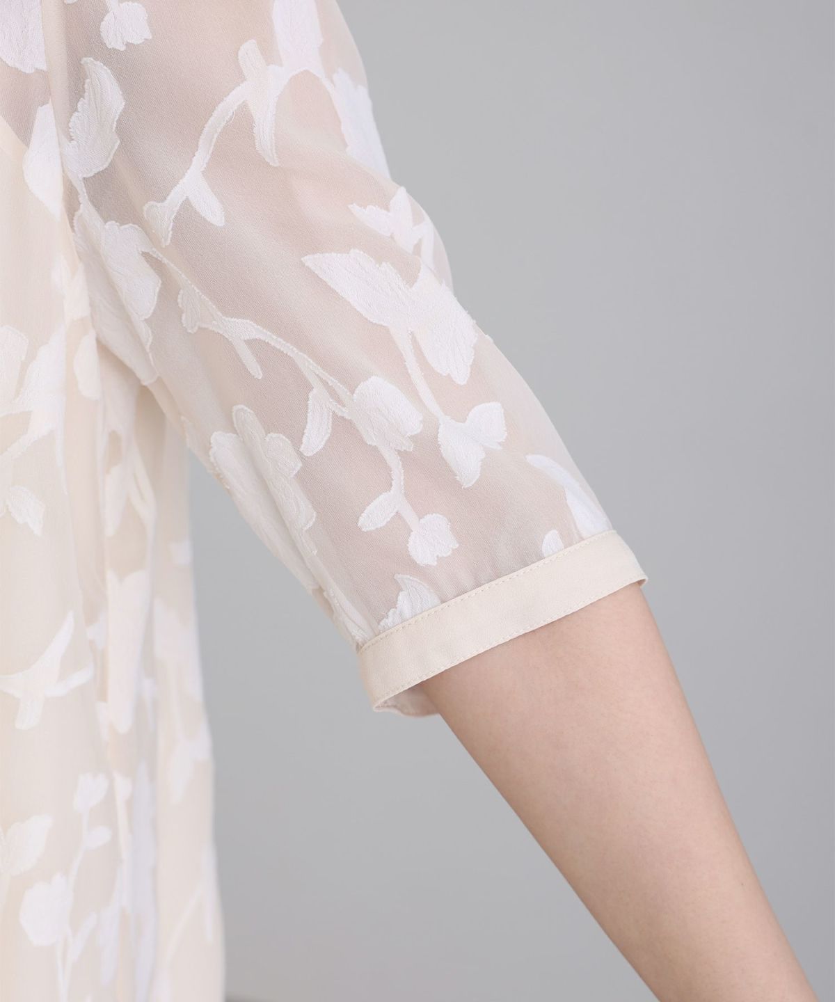 袖とデコルテの程よいシアー感が個性的 フラワージャガードワンピース